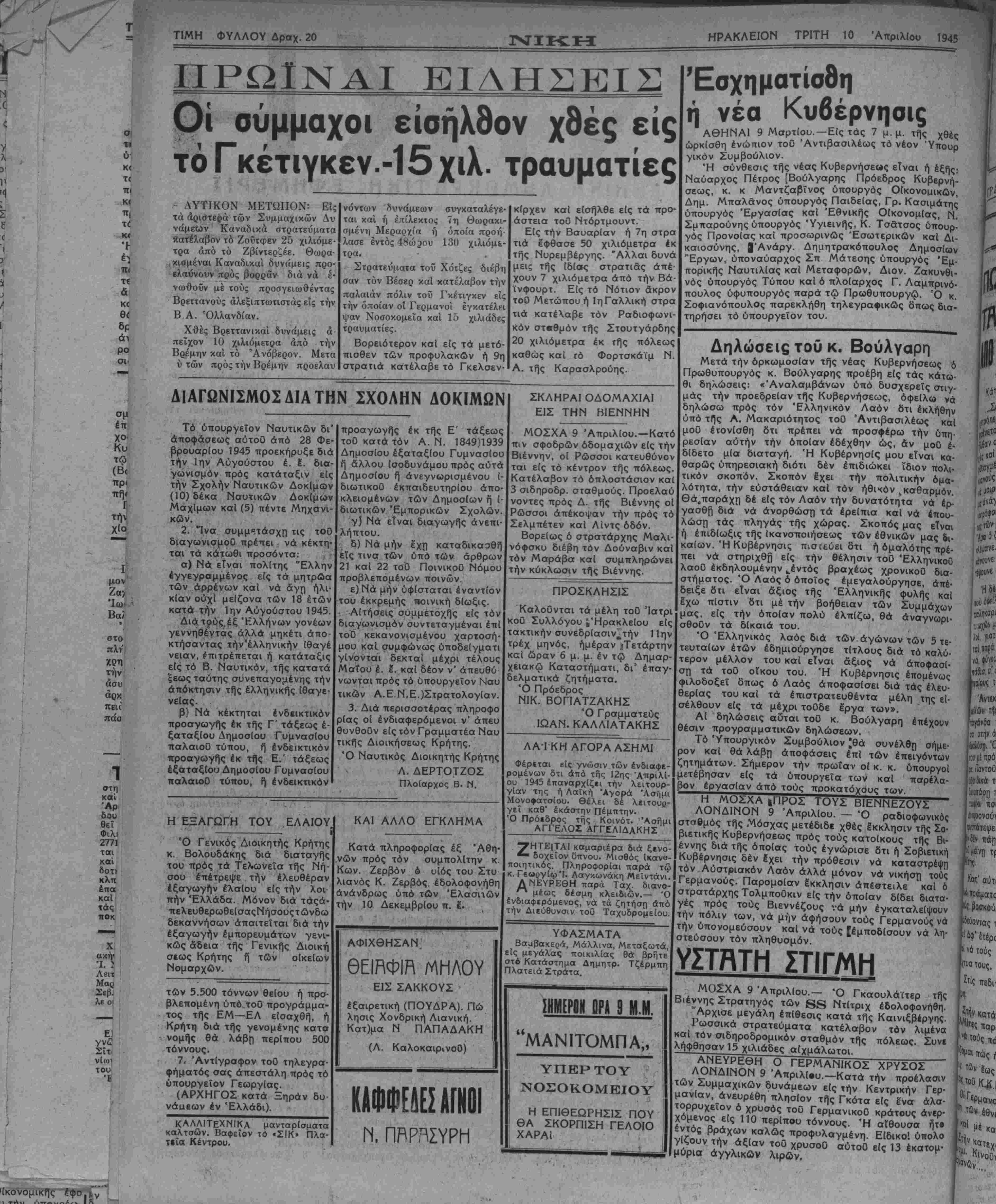 Πρωθυπουργός κ. Βούλγαρης προέβη είς τάς κάτω¬