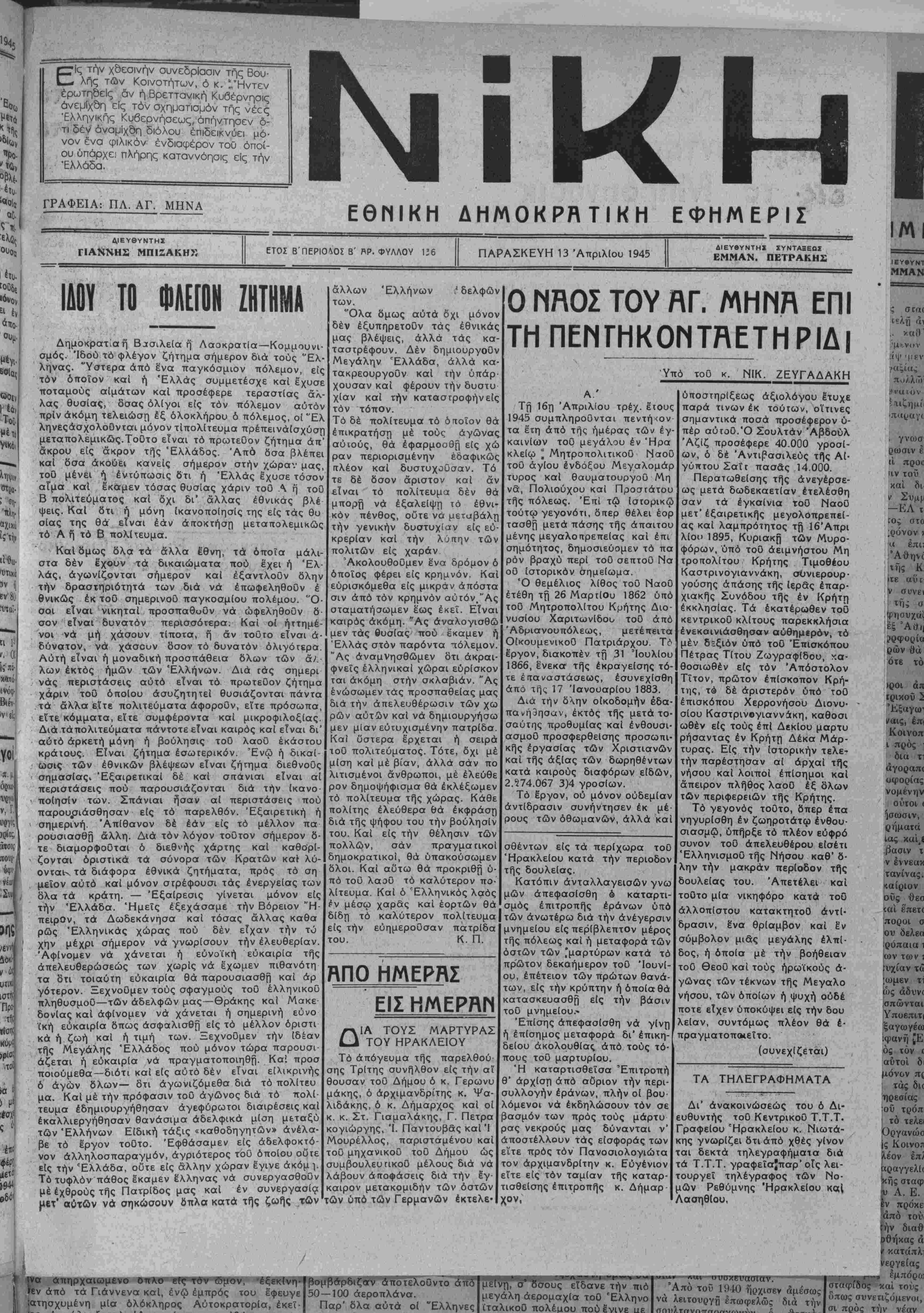 1945 συμπληροϋνται πεντή<ον τα έ'τη άπό τής ημέρας των έγ καινίων τοθ μεγάλου έν Ήρα κλείω ° ΜητροκολιτικοΟ ΝαοΟ τού άγίου ενδόξου Μεγαλομάρ τυρος καί θαυματουργοθ Μη να, Πολιούχου καί Προστάτου τής πόλεως. Επί τώ ίστορικώ τούτω γεγονότι, δηερ θέλει έορ τασθή μετά πάσης τής άπαιτου μένης μεγαλοττρεπείας καί επι σημότητος, δημοσιεύομεν τό πά ρόν βραχύ περί τοθ σεπτοϋ Να ου ιστορικόν σημείωμα. Ό θεμέλιος λίθος τοθ ΝαοΟ ετέθη τή 26 Μαρτίθυ 1862 υπό τοθ Μητροπολίτου Κρήτης Διο¬ νυσίου Χαριτωνίδου τοθ άπό Άδμιανουπόλεως, μετέπειτα Οικουμενικού Πατριάρχου Τό έργον, διακοπέν τή 31 Ιουλίου 1866, ένεκα τής έκραγείσης τό¬ τε έ παναστάσεως, εσυνεχίσθη άπό τής 17 Ίανουαρίου 1883. Διά την δλην οικοδομήν έδα πανή3ησαν, έκτός τής μετά το σαύτης προθυμίας καί ένθουσι ασμοό προσφερθεΐσης προσωπι κης εργασίας των Χριστιανών καί τής άξίας των δωρηθέντων κατά καιρούς διαφόρων είδών, 2.574.067 3)4 γροσίων. Τό έργον, ού μόνον ουδεμίαν αντίδρασιν συνήντησεν έκ μέ ρους των όθωμανών, άλλά καί ΗΠΟ ΗΜΕΡΗΣ ΕΙΣ ΗΜΕΡΗΜ ΙΑ ΤΟΥΣ ΜΑΡΤΥΡΑΣ ΤΟΥ ΗΡΑΚΛΕΙΟΥ Τό άπόγευμα τής παρελθού¬ σης Τρίτης συνήλθον είς την αί θουσαν τοθ Δήμου ό κ. Γερωνυ μάκης, ό άρχιμανδρίτης κ. Ψα¬ λιδάκης, ό κ. Δήμαρχος καί οί κ. κ. Στ. Γιαμαλάκης, Γ. Πετρα κογιώργης, Ί. Παντουβάς καί Ί Μουρέλλος, παρισταμένου καί τοθ μηχανικοΰ τοθ Δήμου ώς συμβουλευπκοθ μέλους διά νά λάβουν άποφάσεις διά την εγ- καιρόν μετακομιδήν των όστών των υπό των Γερμανών έκτελε· σθέντων είς τα περίχωρα τοθ "Ηρακλείου κατά την περίοδον τής δουλείας. Κατόπιν άνταλλαγεισών γνω μών απεφασίσθη δ καταρτι- σμός έπιτροπής έράνων υπό | των ανωτέρω διά την άνέγερσι μνημείου είς περίβλεπτθν μέρος τής πόλεως καί ή μεταφορά των όστών των "μαρτύρων κατά τό πρώτον δεκαήμερον τοθ Ίουνί- ου, επέτειον των πρώτων θανά- των, είς την κρύπτην ή όποίαθά κατασκευασθή είς την βάσιν τοθ μνημείου.- Έπίσης απεφασίσθη νά γίνη ή έπίσημος μεταφορά δι' έπικη- δεΐου άκολουθίας άπό τούς τό- πους τοϋ μαρτυρίου. Ή καταρτισθείσα Έπιτροπή θ' αρχίση άπό αυριον την περι¬ συλλογήν έράνων, πλήν οί βου¬ λόμενοι νά έκδηλώσουν τόν σε βασμόν των πρός τούς μάρτυ ρας νεκρούς μας δύνανται ν' άποστέλλουν τάς είσφοράς των είτε πρός τόν Πανοσιολογιώτα τον άρχιμανδρίτην κ. Εύγένιον είτε είς τόν ταμίαν τής καταρ- τισθείσης έπιτροπής κ. Δήμαρ χον, υποστηρίξεως άξιολόγου παρά τίνων έκ τούτων, οΐτινες σημαντικά ποσά προσεφέρον υ¬ πέρ αύτοϋ.Ό Σουλτάν Άβδούλ Άζίζ προσέφερε 40.000 γροσί¬ ων, ό δέ Άντιρασιλεύς τής Αι¬ γυπτου Σαΐτ πασάς 14.000. Περατωθείσης τής ανεγέρσε¬ ως μετά δωδεκαετίαν έτελέσθη σαν τα έγκαίνια τοθ ΝαοΟ μετ' έξαιρετικής μεγολόπρεπεί- ας καί λαμπρότητος τή 16Άπρι λίοΐ) 1895, Κυριακρ των Μυρο- φόρων, υπό τοθ αειμνήστου Μη τροπολίτου Κρήτης Τιμοθέου Καστρινογιαννάκη, σθνιερουρ· γούσης άπάσης τής ίερδς επαρ¬ χιακάς Συνόδου τής έν Κρήτη έκκλησίας. Τα εκατέρωθεν τοϋ κεντρικοθ κλίτους παρεκκλήσια ένεκαινιάσθησαν αυθημερόν, τό μέν δπξιόν υπό τοϋ Έπισκόπου Πέτρας Τίτου Ζωγραφίδου, κα· θοσιωθέν είς τόν Απόστολον Τίτον, πρώτον επίσκοπον Κρή¬ της, τώ δέ αριστεράν υπό τοθ έπισκόπου Χερρονήσου Διονυ¬ σίου Καστρινβγιαννάκη, καθοσι ωθέν είς τούς επί ΔεκΙου μαρτυ ρήσαντας έν Κρήτη Δέκα Μάρ- τυρας. Είς την ιστορικήν τελε¬ τήν παρέστησαν αί αρχαί τής νήσου καί λοιποί έπίσημοι καί άπειρον πλήθος λαοϋ έξ δλων των περιφερειών τής Κρήτης. Τό γεγονός τουτο, δπερ έπα νηγυρίσθη έν ζωηροτάτω ένθου- σιασμώ, υπήρξε τό πλέ
