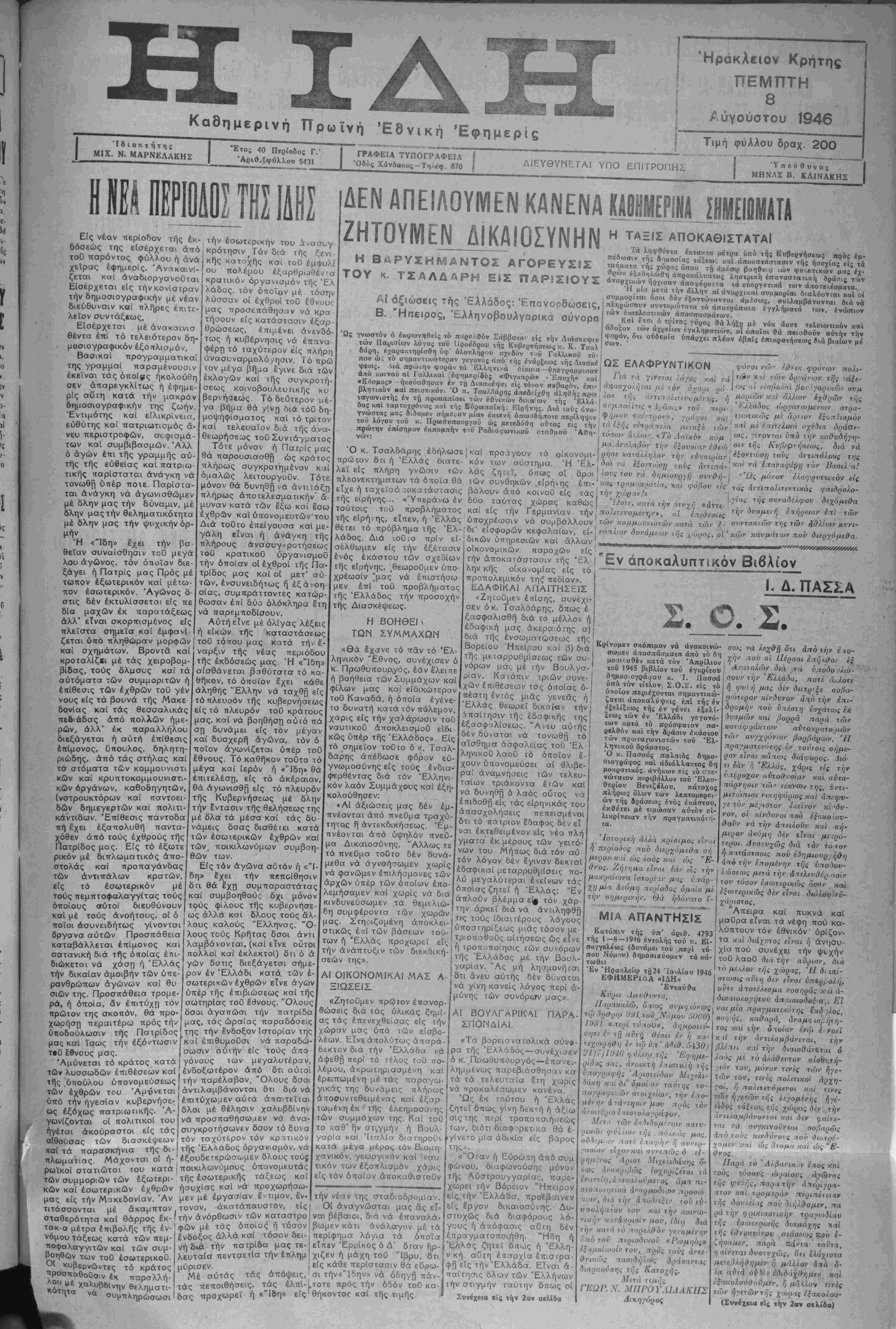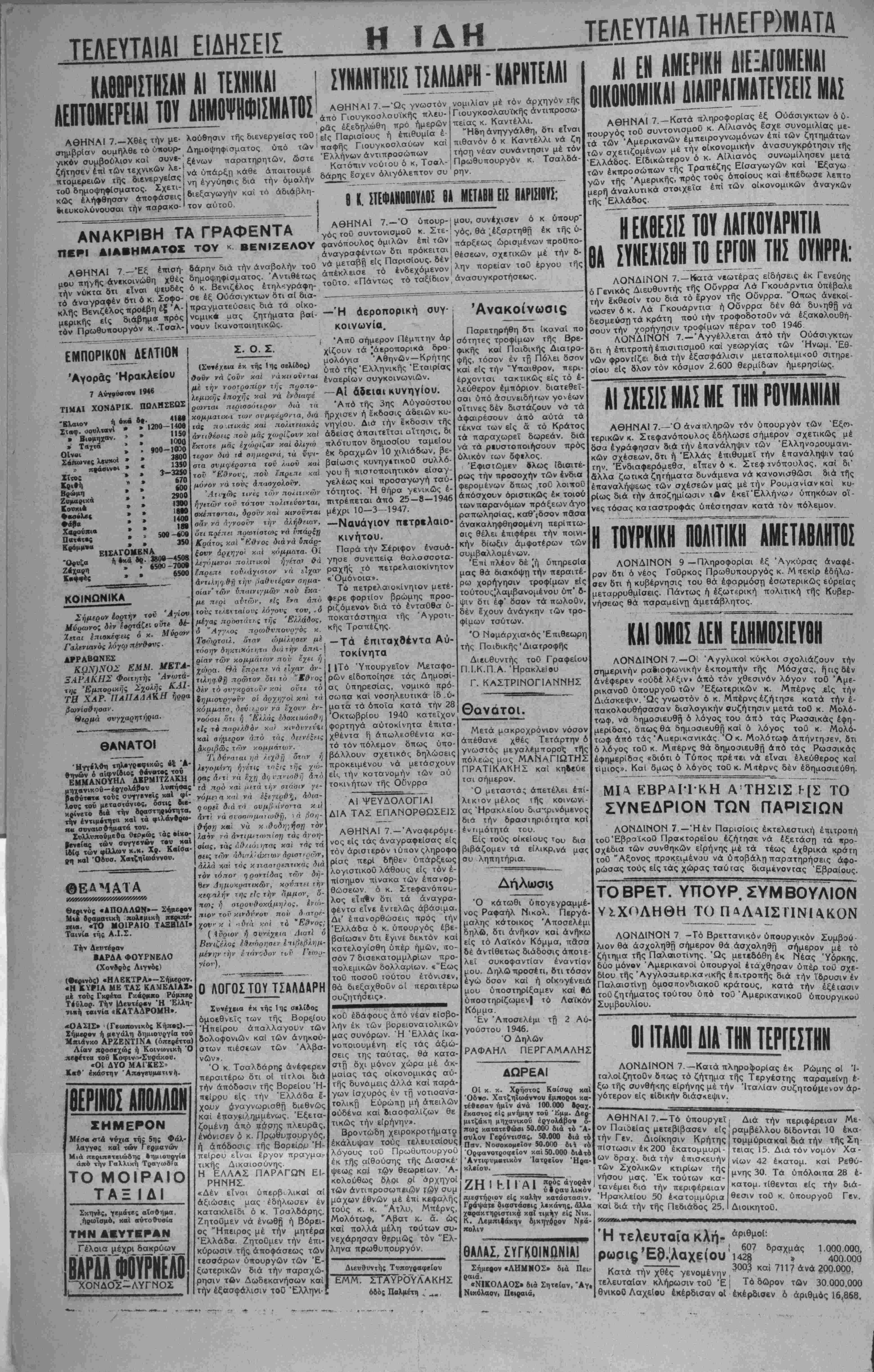 ν. ι·νη >:οΊ τό "Ε<)νος; Διατί ( Αυριον ή Οννκγζια Βινιζέλος Ι ν/οι·), έλος οη ββημ ·'ην ίιάντδον τι.Γ1 Γιιοο- Ο ΛΟΓΟΣΤΟΥ ΤΣΑΛΔΑΡΗ Χυνέχ»ια έκ τής 1 ής σελίδος όμοεθνεΐς των τής Βορςίου Ηπείρου άπαλλαγουν των δολοφονιών καί των άνηκού- στων πιέσεων των Άλβα- νών». Ό κ Τσαλδάρης ανέφερεν περαιτέρω ότι οί τίτλοι διά Την απόδοσιν τής Βορείου Η¬ πείρου είς τήν Έλλάδα I- άναγνωριοθή δι&θνώς καί έπαν.ίΐ^.ημμένως. 'Εξετα- ζομένη άπό τιάσης πλευράς, ένόνισεν ό κ. Πρωθυπουργός, ή απόδοσις τής Βορείομ Ή- πείρβυ είναι έργον πραγμα- τικής Δικαιοσύνης. ΠΑΡΑΓΟΜ ΕΙ- καί Η ΕΛΛΑΣ ΡΗΝΗΣ. «Δέν είναι υπερβολικαί αί αξιώσεις μας εδήλωσεν έν κατακλεΐδι ό κ. Τσαλδάρης. Ζητούμεν νά ένωθτ) ή Βόρει- ος "Ηπειρος μέ την μητέρσ Έλλάδα. Ζητούμεν τήν έπι- κύρωσιν τής αποφάσεως των τεσσάρων ύπουργών των "Ε¬ ξωτερικών διά την παραχώ¬ ρησιν των Δωδεκανήσων καί ;ήν εξασφάλισιν τοϋ Έλληνι· ρ&ν εΐδοποίησε τάς Δημοσί άς υπηρεσίας, νομικα πρό σωπα καί νοσηλευτικά ίδ ,ύ· μοτα τα όποϊα κατά τήν 28 ΌκτωβρΙου 1940 κατεϊχον φορτηγά αύτοκΐνητα έπιτα· χθέντα ί^ άπωλεοθέντα κα- τό τόν πόλεμον δπως ύπο- βόλλουν σχετικός δηλώσεις προκειμένου νά μετάσχουν είς την κατανομήν των αύ τοκινήτων τής Οϋνρρα ΑΙ ΨΕΥΔΟΛΟΓΪΑΙ ΔΙΑ ΤΑΣ ΕΠΑΝΟΡΘΩΣΕ1Σ ΑΘΗΝΑΙ 7. —Άναφερόμε- νος είς τάς άναγροφείσας είς τόν αριστεράν ιύπονςληροφο ρίσς περΐ δήθεν υπάρξεως λογιστικοΰ λάθους είς τόν ε¬ πίσημον πινακα των έπανορ- θώσεων. ό κ. Στεφανόπου- λος εΙΐΛν δτι τα αναγρα¬ φέντα είνε εντελώς άβάοιμα. Δι' έπανορθώσεις πρός ιήν Έλλάδα ό κ. ύπουργός εβε¬ βαίωσεν δτι έγινε δεκτόν καί κστελογίσθη υπέρ ημών, πο¬ σόν 7 δισεκατομμλρίων προ- πολεμικών δολλαμίων. «"Εως τοϋ ποσοΰ τούτου ετόνισεν, θά διεξαχθοΰν αί περαιτέρω ουζητήόεις». Ανακοίνωσις Παρετηρήθη ότι ίκαναί πό σότητες τροφίμων τής Βρε- φικής καί Παιδικής Διαΐρο- φής, τόσον έν τή Πόλει δσον καί είς τήν "Υπαιθρον, περι- έρχονται τακτικώς είς τό ε¬ λεύθερον εμπόριον διατεθεΐ- σαι υπό άσυνειδήτων γονέων οΐτινες δέν διστάζουν νά τα άφαιρέσουν άπό αύτά τα τέκνα των είς ά τό Κράτος τα παραχωρεϊ δωρεάν. διά νά τό ρευστοποιήσουν πρός υλικόν των δφΐλος. Εφιστώμεν όλως Ιδιαιτέ¬ ρως τήν προσοχήν των ένδια φερομένων δπως ,τοΰ λοιποϋ άπόσχουν οριστικώς έκ τοιού τωνπαρανόμων πράξεωνάγο ραπωλησίας, καθ';δσον πασά άνακαληφθησομένη περίπτω¬ σις θέλει έπιφέρει την ποινι- κήν δίωξιν αμφοτέρων των συμβαλλομένων. 'Ετιι πλέον δέ |ή ύπηρεσΐα μας θά διακόψη την περαιτέ¬ ρω χορήγησιν τροφίμων είς τούτους|λαμβανομένου ύπ' δ- ψιν δτι έφ' δσον τα πωλούν, δέν ίίχουν ανάγκην των τρο¬ φίμων τούτων. Ό Νομάρχιακός 'Επιθεωρη τής Παιδικής'Διατροφής Διεϋθυντής τοθ ΓραφεΙου Π.Ι.Κ.Π Α. Ηρακλείου Γ. ΚΑΣΤΡΙΝΟΠΑΝΝΗΣ ____ ΊΓΚΒΕΣΙΣΤΟΥΛΑΓΚΟΥΑΡΪΤΙΑ Βλ ΣΥΝΕΧΙΣΒΗΤΟ ΕΡΓΟΝ ΤΗΣ ΟΥΝΡΡΑ: ΛΟΝΔΙΝΟΝ 7. —Γίατά νεωτέρας είδήσεις έκ Γενέυης ό Γενικάς Διευθυντής τής Οΰνρρα Λά Γκουάρντια υπέβαλε την έκθεσιν τού διά τό έργον τής Οΰνρρα. Οπως ανεκοί¬ νωσεν ό κ. Λά Γκουάρντια ή Οΰνρρα δέν θά δυνήθη νά οεσμεύσητά κράτη πού την τροφοδοτοθν να εξακολουθή, σουντήν χορήγησιν τροφίμων πέραν τού 946 ΛΟΝΔΙΝΟΝ 7.-Άγγέλλεται άπό την Ούάσιγκτων δτι Λ επιτραπή έπισιτισμοθ καΐ γεωργίας των Ήνωμ. Εθ¬ νών φρονίίζει διά τήν εξασφάλισιν μεταπολεμικοθ σιτηρε- σΐου είς δλον τόν κόσμον 2.600 θερμίδων ημερησίως. ΑΐΤΧΕΣΙΣΜΑΣΜΕ ΤΗΝ ΡΟΥΜΑΝΙΑΝ ΑΘΗΝΑΙ 7.—Ό άναπληρών τόν υπουργόν των Έξοο- τερικών κ. Στεφανόπουλος εδήλωσε σήμερον σχετικώς μέ δσα εγράφησαν διά τήν επανάληψιν των Έ