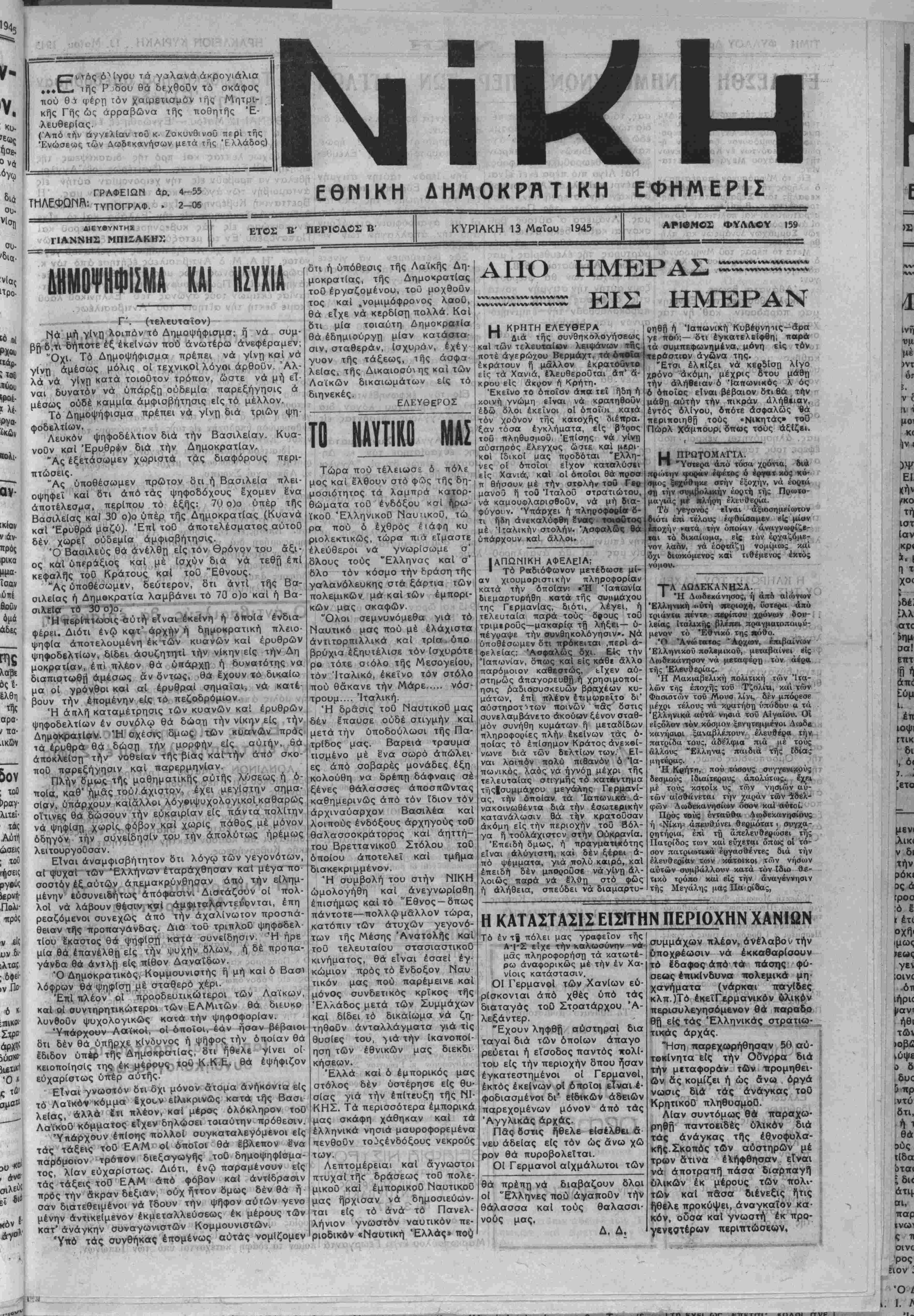 κειοποΐησΐς της- έκ μέρρν·^ *<$;£.Κ-Ε^ ^θα έΨή*ιζον ευχαρίστως υπέρ αυτής.1 Είναι γνωστόν δτι όχι μόνον δτομα ανήκοντα. είς τό Λαϊκόν κόμμα δχοον ειλικρινώς κατά τής Βασι λεΐας, άλλά έτι πλέον, καί μέρος ολόκληρον τοθ ΛαϊκοΟ κόμματος είχεν δηλώσει τοιαύτην πρόθεσιν. 'Υτιάρχουν έπΐοης πολλοί συγκαταλεγόμενοι είς τάς τάξεις τοθ ΕΑΜ οί όποϊοι θά έβλεπον Ενα •παρόμοιον τρόπον διεξαγωγής τοϋ δημοψηφίσμα- τος, λίαν ευχαρίστως. Διότι, ένώ παραμένουν είς τάς τάξεις τοθ ΕΑΜ άπό φόβον καί αντίδρασιν πρός την άκραν δεξιάν, οόχ ήττον δμως δέν θά ή σσν διατεθειμένοι νά ίδουν την ψήφον αυτών γενο μένην αντικείμενον εκμεταλλεύσεως έκ μέρους των κατ' ανάγκην συναγωνιστών Κομμουνιστών. Υπό τάς συνθήκας έπομένως αύτάς νομίζομεν δτι ή υπόθεσις τής Λαϊκής Δη¬ μοκρατίας, τής Δημοκρατίας τοθ έργσζομένου, τοΰ μοχθοΰν τος καί ,νομιμόφρονος λαοΰ, θά εΐχε νά κερδίση πολλά. Κοί δτι μία τοιαύτη Δημοκραΐία θά έδημιούργη μίαν κατάστα¬ σιν, σταθεράν, ισχυράν, έχέγ γυον τής τάξεως, ι ής ασφα¬ λείας, τής Δικαιοσύνης καί των Λαίκών δικαιωμάτων είς τό διηνεκές. ΕΛΕΥΘΕΡΟΣ ΤΟ ΝΑΥΤΙΚΟΐΓΣ Τώρα πού τέλειωσ= ό πόλε μος καί Ιλθουν στό φ&ς τής δη- μοσιότητος τα λαμπρά κατορ- θώματα τοθ ενδόξου κσί ήρω- ϊκοΟ ΈλληνικοΟ ΝαυηκοΟ, τώ ρα πού ό έχθρός έιάφίΐ κυ ριολεκτικώς, τώρα πιά εΐμαστε έλεύθεροι νά γνωρίσωμε σ δλους τούς Έλληνας καί σ' δλο τόν κόσμο την δράοη τής γαλανόλευκης σία ξάρτια των πολεμικον μά καί των έμπορι- κών μας σκαφών. Όλοι σεμνυνόμεθα γιά τό Ναυτικό μας πού μέ έλάχιστα άντιτορπιλλικά καί τρία . υπο βρύχια έξηυτέλισε τόν (σχυρότε ρο τότε σιόλο τής Μεσογείου, τόν Ίταλικό, έκεΐνο τόν στόλο πού θάκανε την Μάρε..... νόσ τρουμ.... Ίταλική. Ή δράσις τοθ ΝαυτικοΟ μας 6έν έπαυσε ουδέ στιγμήν καί μετά την ύποδούλωσι τής Πά τρίδος μας. Βαρεία τραυμα τισμένο μέ έ'να σωρό άπώλει- ες άπό σοβαρές μονάδες έξη κολούθη να δρέπη δάφναις σέ ξένες θάλασσες άποσπώντας καθημερινώς άπό τόν ίδιον τόν άρχιναύαρχον Βασιλέα καί λοιπούς ένδόξους άρχηγούς τοϋ θαλασσοκράτορος καί άηττή- του ΒρεττανικοΟ Στόλου τοϋ όποΐου αποτελεί καί τμήμα διακεκριμμένον. Ή συμβολή τού στήν ΝΙΚΗ ώμολογήθη καί άνεγνωρίοθη επισήμως καί τό "Εθνος —δπως πάντοτε—πολλώ μάλλον τώρα, κατόπιν των άτυχών γεγονό¬ των τής Μέσης Άνατολής καί τοΰ τελευταίου στασιαστικοθ κινήματος, θά είναι έσαεί εγ¬ κώμιον πρός τό ένδοξον Ναυ τικόν μας πού παρέμεινε καί μόνθς συνδετικός κρΐκος τής Ελλάδος μετά των Συμμάχων καί δίδει τό δικαίωμα νά ζη- τηθοθν άνταλλάγματα γιά τίς θυσίες τού, >ιά την ίκανοποί-