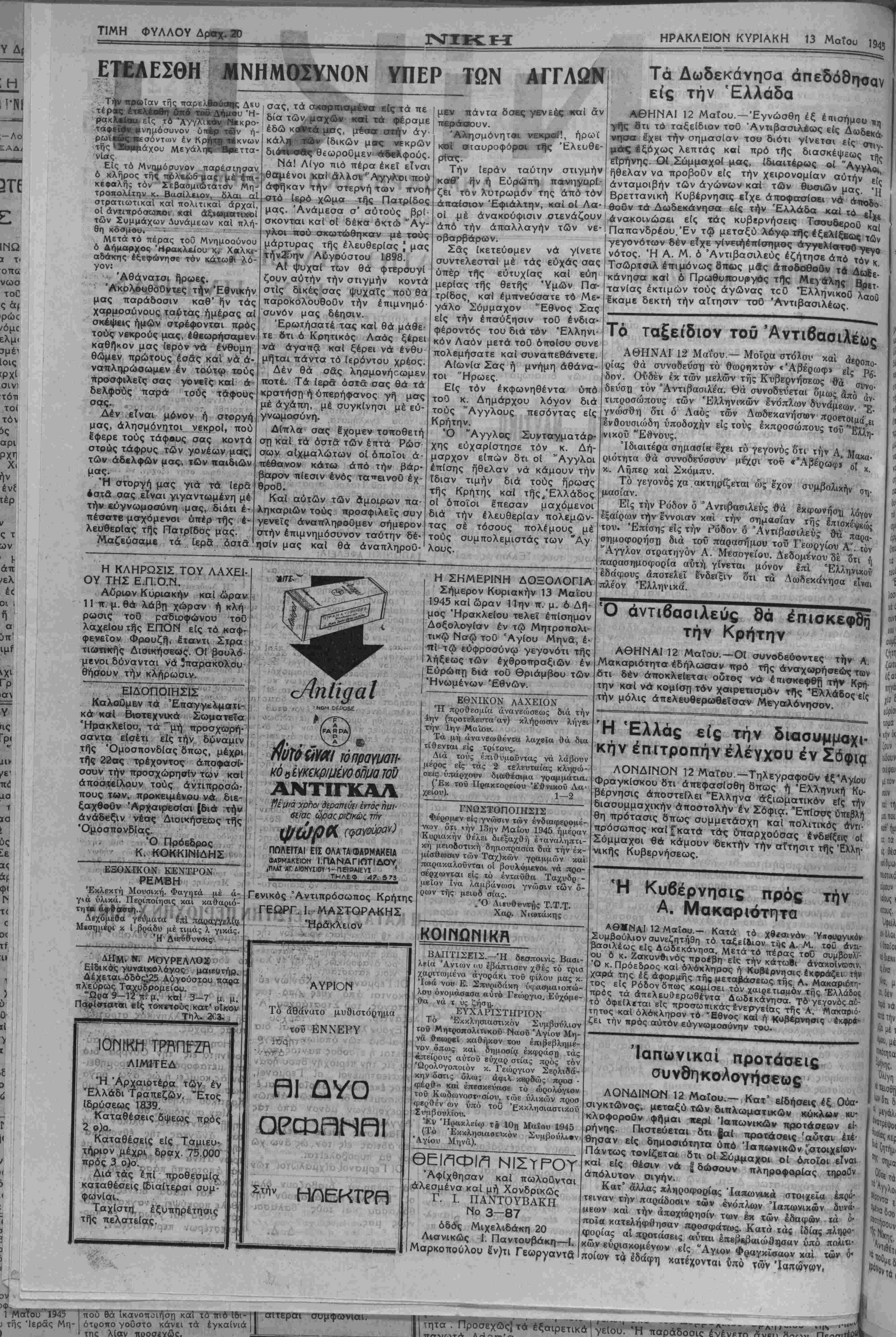 *Η Δ«Ρ6θυν<Μς * . ΔΗΜ. «Π ΜΟΥΡΕΛΛΟΝ Ειδικώς γυναακολόγος μαιευτήρ. Δέχεται-όδός^25 Αύγούστου παρα πλεύρως Τσχυδρομείθυ. "ί? 5—12 π? μ, καί 3—7 μ μ. 1^ τοκ8Τ«ύς κατ' οίκον '_______τηλ» 20 Λ..}ΟΜΙΚΗ ΤΡΡΠΓΖΑ ΛΙΜ3ΤΕΔ Ή Άρχαιοτέρα των έν Ελλάδι Τραπεζών. Έτος Ιδρύσεως 1839. Καταθέρ-,εις δψεω,ς πρός 2 ο)α. Καταθέσεις είς Ταμιευ¬ τηριον μέχρχ δραχ. 75.000 πρός 3 ο)ο. Διά τάς επί προθεσμΐσ. καΐαθέ-σεις Ιδιαίτεραι συμ¬ φωνίαι, ΤαχΙστ4. εξυπηρέτησις τής πελατείας. ήπραγυακ κό ο ίνκίκριμίνο οημα τού ΑΝΤΙΓΚΑΛ Μέμια χρηοι όιρατηύιι ίντός ήμι- ώ ή τήτ ΠΟΛΕΓΓΑΙ ΕΙΣ ΟΛΑ ΤΑ ΦΑΡΜΑΚΕΗΑ φαρμακείον Ι ΠΑΝΑΓΙΟΤΙΔΟΥ ,ΤΙΛΑΤ ΑΓ ΛΓΟΝνΐΙΟΥ 1- ΠεΐΡΛΙΕΥΙ ΤΗΛΕ» 47.3 73 Γενικάς Άντιπρόσωπος Κρήτης ΓΕΩΡΓ. Ι. ■ ΜΑΣΤΟΡΑΚΗΣ Ηράκλειον ΑΥΡΙΟΝ αΌάνατο μυθιστόρημα 0ΰ ΕΝΝΕΡΥ ΟΙ ΩΥΟ ΗΓ)ΕΚΤΡγ] Η ΣΗΜΕΡΙΝΗ ΔΟΞΟΛΟΓΙΑ Σήμερον Κυριακήν 13 Μαίου 1945 καΐ ώραν Ιΐην π. μ. ό Δή- μος Ηρακλείου τέλει επίσημον Δοξολογίαν έν τώ Μητροπολι¬ τικώ Ναώ τού Άγίου Μηνδ, ε¬ πί τώ εύφροσύνω γεγονότι τής λήξεως των έχθροπραξιών έν ΕύρώπΓ| διά τοϋ Θριάμβου των Ήνωμένων Εθνών. ΕΘΝΙΚΟΝ λΑΧΕΙΟΝ Ή προθεσμία άνανεαισεως διά την 4ην (προτελεπτα αγ) κλήοωσιτ λήγει την Ιην Μαιου. Τα μή άνανεωθένϊα λαχεία θά δια τίθενται εις τριτους. Διά τονις επιθυμούντας νά λάβοκν μέροο είς τάς 2 τελευταίας κληρώ- οεις ύπάρχουν διαθίσιμα γραμμάτια. (Έκ τού Πρακτορειον 'ΚθνΐΜθΰ Λα· χει'ου). 1—2 ΓΝΩΣΤΟΠΟΙΗΣΙΣ Φέρομεν είς γνώσιν των ενδιαφερομέ¬ νων δΐι «ην 13ην Μθίου 194δ ημέραν Κυριακήν θέλει διεξαχθή έταναληπτι- κή μειοβοτική δημοίτρασία διά την έχ- μίσθωσιν των Τ«χ)κών γραμμών και παρακαλοϋνται οί βουλόμενοι νά προ¬ σέρχωνται είς τό ενταύθα Ταχυδρ - ιιεΐον ίνα λαμβάνωσι γνώσιν των δ- ρων τής μειοδ σίας. .Ό Δΐίυθ«ντί|ς Τ.Τ.Τ· Χαρ. Νιωτάκης ΚΟΙιΊΟιΊΙΚΒ ΒΑΠΤΙΣΕΙΣ.—Ή δεσποινις Βασι- λβία Άνΐων (·υ εβάπτισεν χθές τό τρισ χαρττωμίνο άγοράκι τού φίλου μας κ. Ίωά νού Ε. Σπυριδάκη ύφασμαιοπώ- λου ονομάσασα αύτό Γεωργιο. Ευχόμε¬ θα να τ νς ζήστ]. ΕΥΧΑΡΙΣΤΗΡΙΟΝ Τό "Εκκλησιαστικήν Συμβουλιον τοϋ (Μητροπολιτιχοϋ Ναοΰ Άγίου Μη- να θεωρεϊ καθήκον τού επιβεβλημέ¬ νον όπως καί δημοσία εκφράση τάς Απείρους αΰτοΰ εϋχαρ στίας πρός τόν Ώρολογοποιόν κ. Γεώργιον Σερλιδά- κην όστις όλω; άφι κβρδώς προσ - φέρθ» καί έπεσκεϋασε το ωρολόγιον τοΰ Κωδωνοσνσίου, τώε υλικών προσ φερθέν ών υπό τοϋ Έκκλησιαστικοΰ Σν<μβοτ)λίου. '*ν Ήρακλείφ τή 10χ| Μαΐου 1945 (Το 'Εκ^λησιαοτΐκον Συμβούλιον Άγίου Μηνα). ΘΕΙγΙΦΙγϊ ΝΙΣΤΡΟΤ Αφίχθησαν καί πωλοϋνται άλεσμένα καί μή Χονδρικώς Γ. Ι ΠΑΝΤΟΥΒΑΚΗ Νο 3-87 όδσ'ς Μιχελιδάκη 20 Λιανικώς Ι. Παντουβάκη—Ι, Μαρκοπούλου έν)τι Γεωρναντδ Τα Δωδεκάνησα είς την Έλλάδα ΑΘΗΝΑΙ 12 ΜαΤου. —"Εγνώσθη έξ επισήμου —« βτι τό ταξείδιον τοθ Άντιβασιλέως είς Δωδεκα! τντρσα εχει την σημασίαν τού διότι γίνεται είς στιγ- •μ&ς ^ξόχως λεπτάς καί πρό τής διασκέψεως Τ«ς είρήνης. Οί.Σώμμ«χοί μα<, Ιδιαιτέρως οί Άγγλοι ήθελαν να προβοθν είς την χειρονομίαν αυτήν ε(ς ανταμοιβήν των άγώνων καί των θυσιών μας. Βρεττανική Κυβέρνησις εΤχε άττοφσσίοει νά * θοΰν τα Δωδεκώνησα είς την Έλλάδα καί τ£ ^Ιω ώνακοινώσει είς τάς κυβϊρνήσεις Τσουδερου καί Παπανδρέου.Έν τώ μετσξύ λόγω ΐη"ς εξελίξεως των γεγονότων &έν εΤχε γίνίΐήέπί^ηρος άγγ€λ^«τβ6 γεγ0 νότος. Ή Α. Μ. ό Άντιβασιλεύς εζήτησε άπό τόν κ Τσώρτσιλ έπιμόνως δπως μ«ς άτΐοδοθοβν τα Δωίε^ κάνησα καί ό Πρωθυπουργόν τί)ς Μεγάλης Βρϊτ. τανίας έκτιμών τούς αγώνας τςθ ΈλληνικοΟ λαοθ Ικαμε δεκτή την αΓτησιν τσθ Άντιβασιλέως. Τό ταξείδιον τού Άντιβασιλέως ΑΘΗΝΑΙ 12 Μαΐου — Μοΐρ