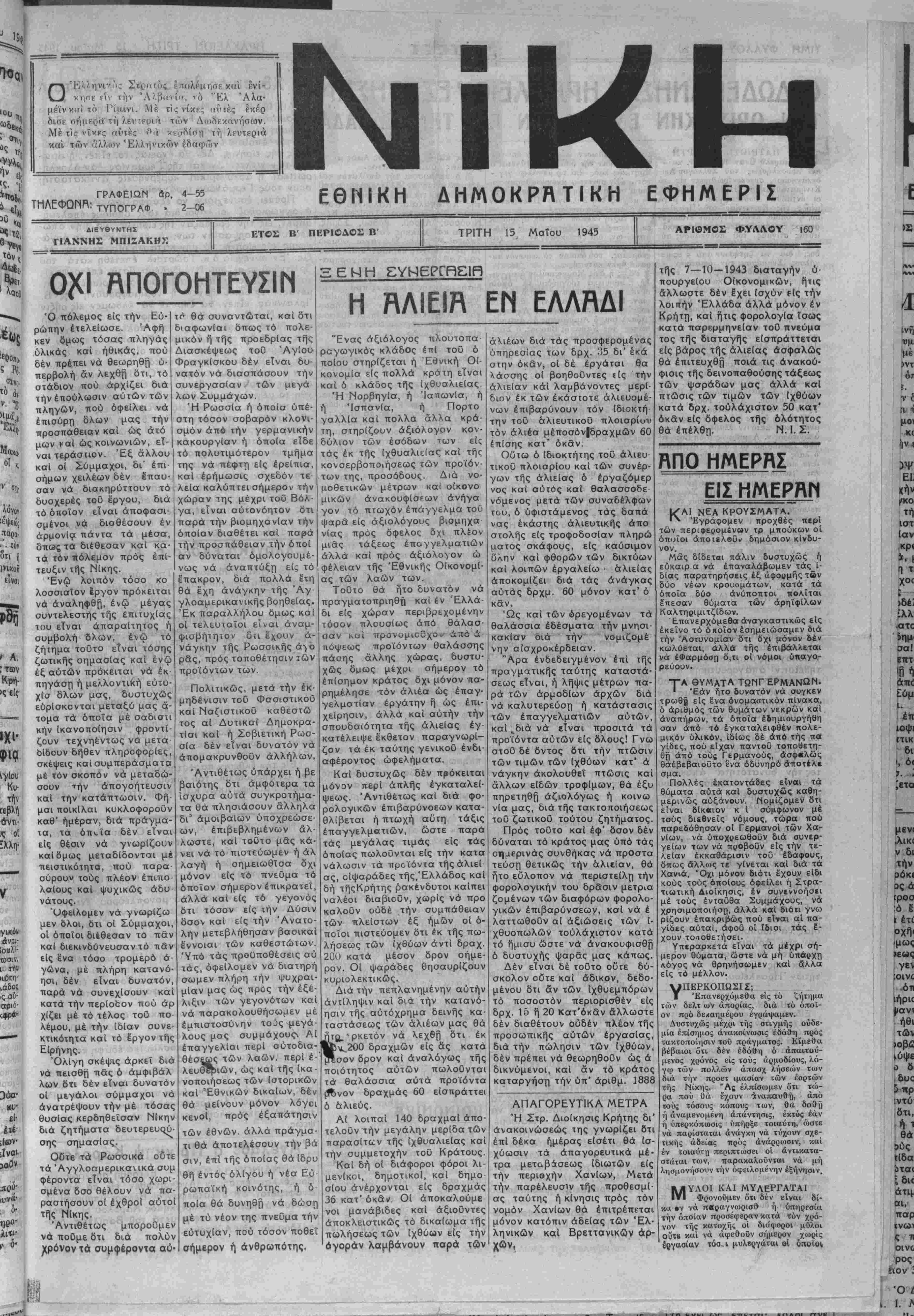 καί των <'/λ/ων Έ/ ληνικών εδαφών ΓΡΑΦΕΙΩΝ δρ. 4-55 ΤΗΛΕΦΩΜγΑ: χυπογραφ · 2-06 ΕΘΗΙΚΗ ΔΗΜΟΚΡΗΤΙΚΗ ΕΦΗΜΕΡΙΣ ΔΙΕΥβΥΝΤΗΣ ΓΙΑΝΝΗΣ ΜΠΙΖΑΚΗΧ ΕΤΟΣ Β' ΠΕΡΙΟΔΟΣ Β ΤΡΙΤΗ 15 Μαΐου 1945 ΑΡΙ©ΜΟΣ Φ.ΥΛΛΟΥ 160 ΟΧ.1 ΑΠΟΓΟΗΤΕΥΣΙΝ Ό πόλεμος είς την Ευ¬ ρώπην έτελεΐωσε. Άφή κεν δμως τόσας πληγάς υλικάς καί ηθικάς, πού δέν πρέπει νά θεωρηθή ύ· περβολή άν λεχθή δτι, τό στάδιον πού άρχίζει διά την έτιούλωσιν αυτών των πληγών, πού όφεΐλει νά έπισϋρη δλων μας την προσπάθειαν καΐ ώς άτό μων καί ώς κοινωνιών, εΐ- ^ ναι τεράσΐιον. Έξ άλλου » καί οί Σύμμαχοι, δι' επι σήμων χειλέων δέν επαυ- °1 σαν νά διακηρύττουν τό δυσχερές τοϋ έργου, διά τό οποίον είναι άποφασι- σμένοι νά διαθέσουν έν άρμονία πάντα τα μέσα, "ν δπως τα διέθεσαν καί κα- τά τόν πόλεμον πρός επί¬ τευξιν τής Νίκης. 'Ενώ λοιπόν τόοο κο λοσσιαΐον έργον πρόκειται νά άναληφθή, ένώ μέγας συντελεστής τής επιτυχίας τού είναι άπαραίτητος ή συμβολή δλων, ένώ τό ζήτημα τουτο είναι τόσης ζωτικής οημασίας καΐ ένφ έξ αυτών πρόκειται νά έκ- πηγάστ) ή μελλοντική ευτυ¬ χία δλων μας, δυστυχώς ευρίσκονται μεταξύ μας ά- τομα τα όποΐα με σαδισιι κήν Ικανοποίησιν φροντί¬ ζουν τεχνηέντως νά μετα δίδουν δήθεν πληροφορίες, σκέψεις καισυμπεράσματα μέ τόν σκοπόν νά μεταδώ- σουν τήν απογοήτευσιν καΐ τήν κατάπτωσιν. Φή μαι ποικΐλαι κυκλοφορούν καθ' ημέραν, διά πράγμα- χα, τα όπιϊα δέν είναι είς θέσιν νά γνωρΐζουν καί δμως μεταδίδονται μέ πειστικότητα, πού παρα σύρουν τούς πλέον έπιπο λαίους καί ψυχικώς άδυ νάτους. Οφείλομεν νά γνωρίζω μέν δλοι, δτι οί Σύμμαχοι, οί όποΐοι διέθεσαν τό παν καί διεκινδύνευσαν τό παν είς ε'να τόσο τρομερά ά- γώνα, μέ πλήρη κατανό- ησι, δέν είναι δυνατόν, παρά νά συνεχΐσουν καί κατά τήν περίοδον πού άρ χίζει μέ τό τέλος τοθ πό λέμου, μέ τήν Ιδίαν ουνε- κτικότητα καί τό Εργον τής Είρήνης. Όλίγη σκέψις άρκεΐ διά νά πειοθή πας ό άμφιβάλ λων δτι δέν είναι δυνατόν οί μεγάλοι σύμμαχοι νά άνατρέψουν τήν μέ τόσας θυσίας κερδηθεΐσαν Νίκην διά ζητήματα δευτερευού¬ σης σημασΐας. Ο£5τε τα Ρωσσικά οδτε τα Άγγλοαμερικαικά συμ Φέροντα είναι τόσο χωρι- σμένα δσο θέλουν νά πα- ραστήσουν οί έχθροί αύτοι τής Νίκης. Αντιθέτως μποροϋμεν νά ποθμε δτι διά πολύν χρόνον τα συμφέροντα αύ· τ<* θά συναντώται, καί δτι διαφωνίαι δπως τα πολε¬ μικόν ή τής προεδρΐας τής Διασκέψεως τού Άγίου Φραγκίσκου δέν είναι δυ¬ νατόν νά διασπάσουν τήν συνεργασίαν των μέγα λων Συμμάχων. Ή Ρωσσία ή όποία υπέ¬ στη τόσον σοβαρόν κλονι¬ σμόν άπό τήν γερμανικήν κακουργΐαν ή όποΐα εΐδε τό πολυτιμότερον τμήμα της νά πέφτη είς έρείπια, καί έρήμωσις σχεδόν τε λεία καλύπτει σήμερον τήν χώραν της μέχρι τού Βόλ- γα, εΐναι αύτονόητον ότι παρά τήν βιομηχανίαν τήν οποίαν οιαθέτει καί παρά τήν προσπάθειαν τήν όποί αν δύναται όμολογουμέ- νως νά αναπτύξη είς τό επακρον, διά πολλά ετη θά έχη ανάγκην τής Αγ γλοαμερικανικής βοηθείας. Έκ παραλλήλου δμως καί οί τελευταΐοι είναι αναμ¬ φισβήτητον δ ιι έχουν α¬ νάγκην τής Ρωσσικής άγο ράς, πρός τοποθέτησιν ΐών προϊόνιων των. Πολιτικώς, μετά τήν έκ- μηδένισιν τοθ ΦασιστικοΟ καί ΝαζιστικοΟ καθεστώ τος αί Δυτικαί Δημοκρα- τίαι καί ή Σοβιετική Ρωσ¬ σία δέν εΐναι δυνατόν νά άπομακρυνθοθν αλλήλων. Αντιθέτως ύπάρχει ή βε βαιότης δτι αμφότερα τα ίσχυρα αύτά συγκροτήμα- τα θα πλησιάσουν άλληλα δι' άμοιβαΐων υποχρεώσε¬ ων, επιβεβλημένον άλ- λωστε, καί τουτο μδς κά· νει νά τό πιστεύωμεν ή άλ λαγή ή οημειωθΐσα δχι μόνον είς τό πνεθμα τό οποίον σήμερον έπικρατεΐ, άλ