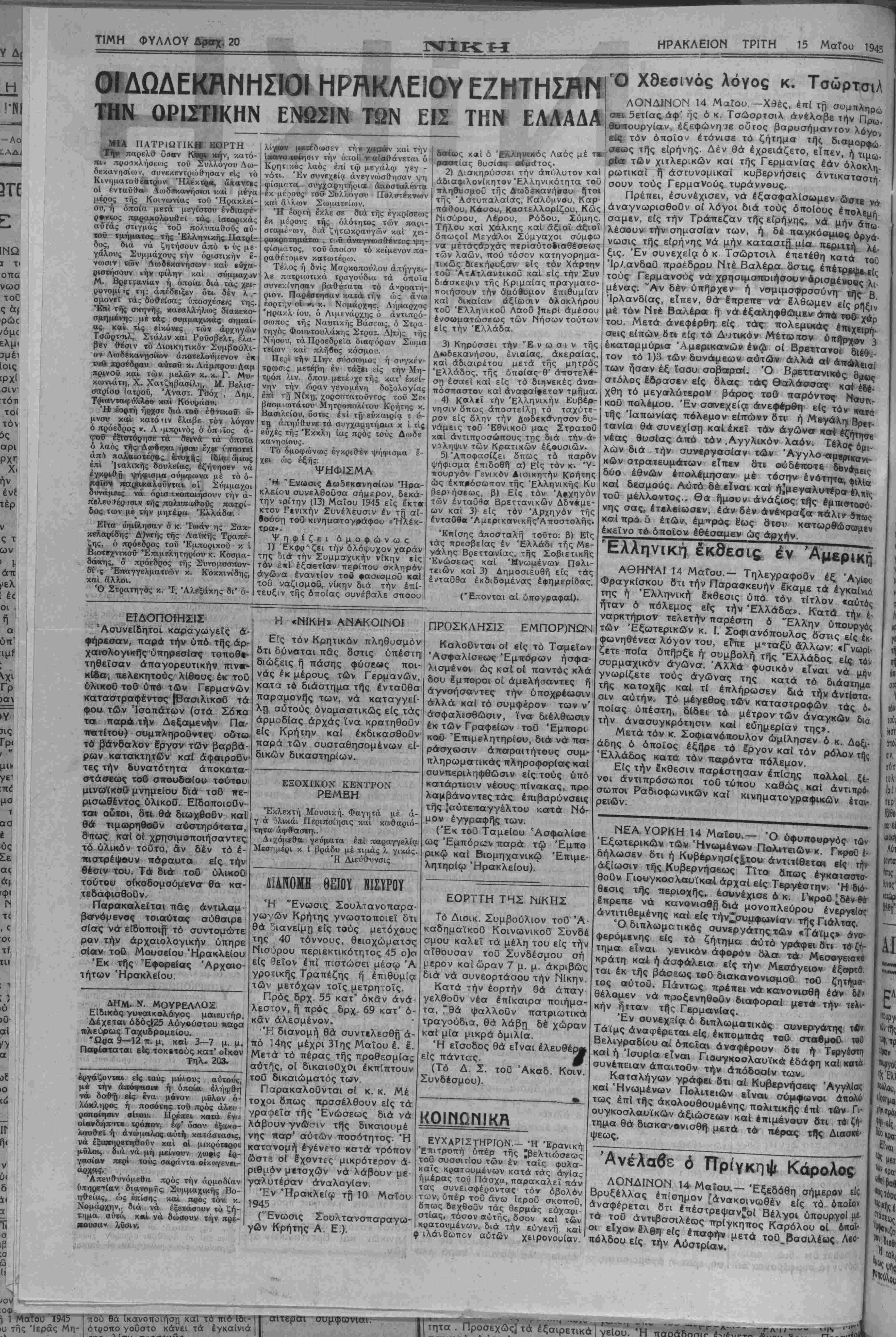 ροποίηβιν σίΐου. Πρβπει κατίϊ έ'ν<( οΐβνδήπ'ΐτβ τρόπον, έφ' όσον έξαχο- λανθεϊ ή άνώμαλας α-ύΐί| κατάστασις, νά έξυπηρβτηθυϋν καί οί μικρότεβοι. μϋλοι, διά νά μή μείινονν χωρίς ερ¬ γασίαν περί τούς σαρτίντα οΐκαγενει- άρχ«ί ΕΞΟΧΙΚΟΝ ΚΕΝΤΡΟΝ ΡΕΜΒΗ Έκλεκτή Μίουσική. Φαγητά μέ ά γ ά Ίλιχά. Πβριπσίησις και καθαριό τητα άφθαστη-.. Δίχόμεθα γεύμ«τα επί παραγγελίς Μεθι μέρι κ ί βράδυ μέ τιμάς λ γικάς Ή Διεύθυνσις ΑΙΑΓίΟΙΗ ΘΕΙΟΥ ΝΙΣΥΡΟΥ Ή Ένωσις Σουλτανοπαρα γω-/ών Κρήτης γνωστοποιεΐ δτ. θά 'ΐιανείμΓ) είς τούς μετόχους της 40 τόννους, θειοχώματος Νισΰρου περιβκτικότητος 45 ο)ο είς θείον επί πιστώσει μέσφ Ά γροοικής Τραπέζης ή έπιθυμία των μετόχων τοίς ϊ ρχ«ί· Άπευθυνομεθα πρός την αρμόδιον ύπηοβτίβ,ν διανομίς 2ιιμμαχικής Βο¬ ηθείας, ώς «ΐίοης καί. πςος τόν κ. Νομάρχην, διά νά. έξβΐάαουν τό ζή- τημα αιΗό, κ«ώ νά δώαουν την πρε- ηουοα- λύσιν. των μετόχων τοίς μετρη',Όΐς. Πρός δρχ. 55 κατ' οκάν άνά λεσΐον, ή πρός δρχ. 69 κατ' ό κάν άλεσμένον. Ή διανομή θά συντελεσθή ά¬ πό 14ης μέχρι 31ης Μαΐου έ. έ". Μετά τό πέρας τής προθεσμίας αυτής, οί δικαιοθχθι έκπίπτουν τοϋ δικαιώματός των. ΠαρακαλοΟνται οί κ. κ. Μέ τοχοι δπως προσέλθουν είς τά τής Ενώσεως διά νά λάβουν γνώσιν τής δικαιοομέ νης παρ' αυτών ποσότητος. Ή κατσνομή εγένετο κατά τρόπον ώστ* οί έχοντες μικρότεοον α¬ ριθμόν μετοχών νά λάβουν με γαλυτέραν αναλογίαν. Έν Ήρακλείφ τή 10 Μσΐου 1945 (Ένωσις Σουλτανοπαραγω γών Κρήτης Α. Ε ). ΠΡΟΣΚΛΗΣΙΣ ΕΜΠΟΡ)ΝΩΝ Καλοϋνται οί είς τό Ταμείον Άσφαλίσεω^ Έμπόρων ήσφα- λισμ·ένοι ώς καί οί παντός κλά δου έίμποροι οί άμελήσαντες άγνσήσαντες την υποχρέωσιν άλλά καί γο συμφέρον των ν' άσφαλισθώσιν, ίνα διέλθωσιν έκ των Γραφείων τοθ Έμπορι καθ Έπιμβλητηρίου, διά νά πα- ρά-σχωσιν άπσραιτήτους συμ- πληρωμαπκάς πληροφορίας καΐ συνπεριληφθώσιν είς τούς υπό κατάρτιοιν νέους πίνακας, προ λαμβάνοντες τάς έπιβαρύνσεις τής ίαύτειταγγέλτου κατά Νό¬ μον έγγραφή,ς των. (Έκ τοΰ Ταμείου Άσφαλίσε ως Έμπορον παρά τώ Έμπο ρικώ καί Βιομηχανικώ Επιμε¬ λητηρίω Ηρακλείου). Ό Χθεσινάς λόγος κ. Τσώρτσιλ ΛΟΝΔΙΝΟΝ 14 Μς,ΐου -Χθές, επί τή συμπληοώ αβ. δετίαςάφ' ής ό κ. Τσώσρτσιλ ανέλαβε την Πό θ&Ίΐουργίαν, εξεφώνησε ούτος βαρυσήμαντον λόνο είς τόν οποίον ετόνισε τό ζήτημα τής δισμοο*Αν β*ως τής είρήνης. Δέν θά έχρειάζετο, είπεν Α τΤό ρίατ τ&ν χιτλερικών καί τής Γερμανίας εάν όλοκλη' ρωτικαί ή αστυνομικαί κυβερνήσει άντικαταστή σουν τούς Γερμανούς τυράννους. ^° Πρέπει, εσυνέχισεν, νά εξασφαλίσωμεν ώστε νΛ άναγνωρισθοϋν οί λόγοι διά τούς όποίους έπολευ' σαμεν, είς την Τράπεζαν τής είρήνης, να μήν - μη λέσουν την σημασίαν των, ήν δέ παγκόομως ( νωσις τής είρήνης νά μήν καταστήμία π«ρητή ξις. Έν συνεχϋα ό κ Τσώρτσιλ επετέθη Ίρ/.ανδαΟ προεδρου Ντέ Βαλέρα δστχς. τούς Γερμανσύς νά χρησιμο—οιήσουνάμ.ν,μ, μένας. "Αν δέν ύπήρχίν ή νσμιμσφρσσύνη Ίρλανδίας, είπεν, θά Ιπρεπε νά έλθωμεν μέ τόν Ντέ Βαλέρα ή νά έξαληφθώμεν ά~ώ τού. Μετά άνεφέρθη είς τάς πολέμικάς σεις είπών ότι είς τό Δυτικόν Μέτωπον ύ,ιΠ έκατομμύρια Άμερικανών ένώ οί Βρβττανοι οί**· τον τό 1)3 των δυνάψεων αυτών άλλά αί ά-<^., ," των ήσαν έξ ίσσυ σοβαραί. Ό ΒρεττανικώοΤ στόλος έβρασεν είς δλας τάς Θαλάσσας καί· χθη τό μεγαλύτερον βάρος τοθ παρόντος κου πολέμου. Έν σστνεχείο: άνεφ*ρβη είς τόν τής Ίαπωνίας πόλεμον είπώνν δτι ή Μβγά-ληι τανία θά συνβχίσπ καί έκεΐ τόν ά,γώνσ κα* 4/ νέας θυσίας άπό τόν .Αγγλικόν λαόν. Τέλσ λών διά την συνβργσσί,αν των Άγγλσ- κών στρατευμάτων εΤπεν 8τι» ουδέποτε