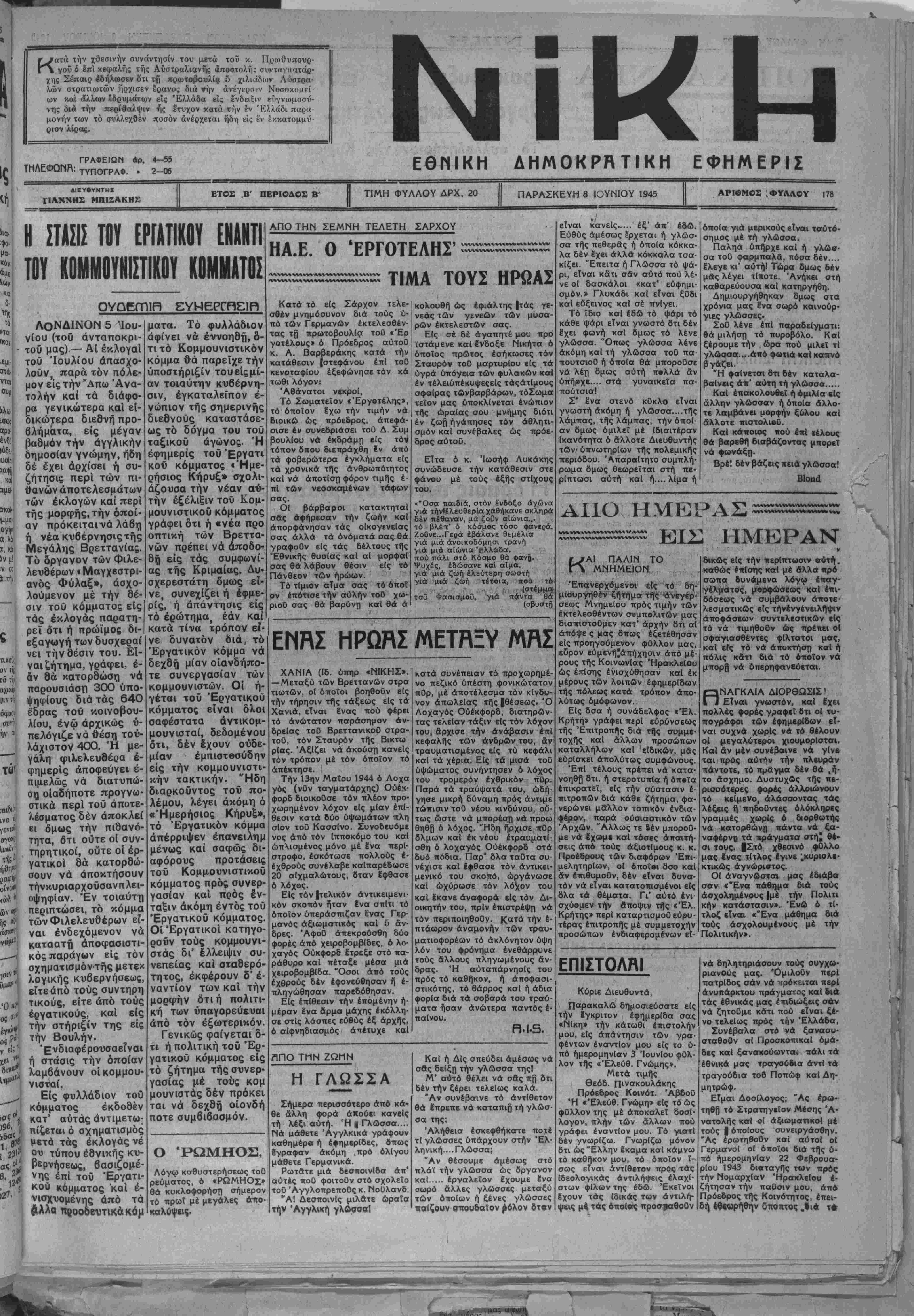νης διά την περίθαλψιν ής έτυχον κατά την ?ν Ελλάδι παρ<* μονήν των τό συλλΕχθέν ποσόν άνέρχεται ήδη είς εν έκκατομμύ- ριον λίρας. ΓΡΑΦΕΙΩΝ άρ. 4—55 ΤΗΛΕΦΩΝΚ: τυπογραφ. » 2-06 ΕΘΜΙΚΗ ΔΗΜΟΚΡΗΤΙΚΗ ΕΦΗΜΕΡΙΣ ΔΙΕΥβΥΝΤΗΕ ΓΙΑΝΝΗΣ ΜΠΙΖΑΚΗΕ ΕΤΟΣ Β ΠΕΡΙΟΛΟ- Β' ΤΙΜΗ ΦΥΛΛΟΥ ΔΡΧ. 20 ΠΑΡΑΣΚΕΥΗ 8 ΙΟΥΝΙΟΥ 1945 Η ΣΤΑΣΙΣ ΤΟΥ ΕΡΓΑΤΙΚΟΥ ΕΝΑΝΤΙ ΤΟΥ ΚΟΜΜΟΥΝΙΣΤΙΚΟΥ ΚΟΜΜΑΤΟΣ ΟΥΟΕΓΠΙΡ, λονδινον 5 ου νίου (τού άνταποκρι- τοϋ μας)·— ΑΙ εκλογαί τού Ιουλίου άπασχο- λούν, παρά τόν πόλε¬ μον είς την Άπω Ανα¬ τολήν καΐ τα διάφο- ρα γενικώτερα καΐ εί- δικώτερα διεδνή προ- βλήματα, είς μέγαν βαθμόν την αγγλικήν δημοσίαν γνώμην, ήδη δέ έχει άρχίσει ή συ¬ ζήτησις περΐ των πι- θανών άποτελεσμάτων των έκλογών καΐ περί τής μορφής, την οποί¬ αν πρόκειταινά λάβη ή νέα κυβέρνησις τής Μεγάλης Βρεττανίας. Τό όργανον των Φιλε- λευθέρων «Μαγχεστρι- ανός Φύλαξ», ασχο¬ λούμενον μέ την Θέ¬ σιν τού κόμματος είς τάς εκλογάς παρατη- ρεΐ ότι ή πρώϊμος δι- εξαγωγή των δυσχεραί νει την Θέσιν τού. Εί¬ ναι ζήτημα, γράφει, ε¬ άν Θά κατορθώση νά παρουσιάση 300 ύπο- ψηφίους διά τάς 640 έδρας τοΰ κοινοβου- λίου, ένψ αρχικώς ύ- πελόγιζε ν ά θέση του¬ λάχιστον 400. Ή με- γάλη φιλελευδέρα ε¬ φημερίς άποφεύγει ε¬ πιμελώς νά διατυπώ¬ ση οιαδήποτε προγνω· στικά περί τού άποτε- λέσματος δέν άποκλεί εί δμως την πιθανό- τητα, ότι οΰτε οί συν- τηρητικοί, οΰτε οί έρ- γατικοι θά κατορθώ- σουν νά άποκτήσουν τήνκυριαρχοϋσανπλει- οψηφΐαν. Έν τοιαύτη περιπτώσει, τό κόμμα των Φιλελευθέρων εί¬ ναι ενδεχόμενον νά καταστή άποφασιστι- κόςπαράγων είς τόν σχηματισμόντής μετεκ λογικής κυβερνήσεως, εϊτεάπό τούς συντηρη τικούς, είτε άπό τούς έργατικούς, καΐ είς την στήριξίν της είς την Βουλήν. ΈνδιαφέρουσαεΓναι ή στάσις την οποίαν λαμβάνουν οί κομμου¬ νισταί. Είς φυλλάδιον τού κόμματος εκδοθέν κατ' αύτάς άντιμετω- πίζεται ό σχηματισμός' μετά τάς εκλογάς νέ ου τύπου έθνικής κυ¬ βερνήσεως, βασιζομέ¬ νη^ επί τού Έργατι- κού κόμματος "καΐ έ- νισχυομένης άπό τα £λλα ης>οοοευτικάκόμ