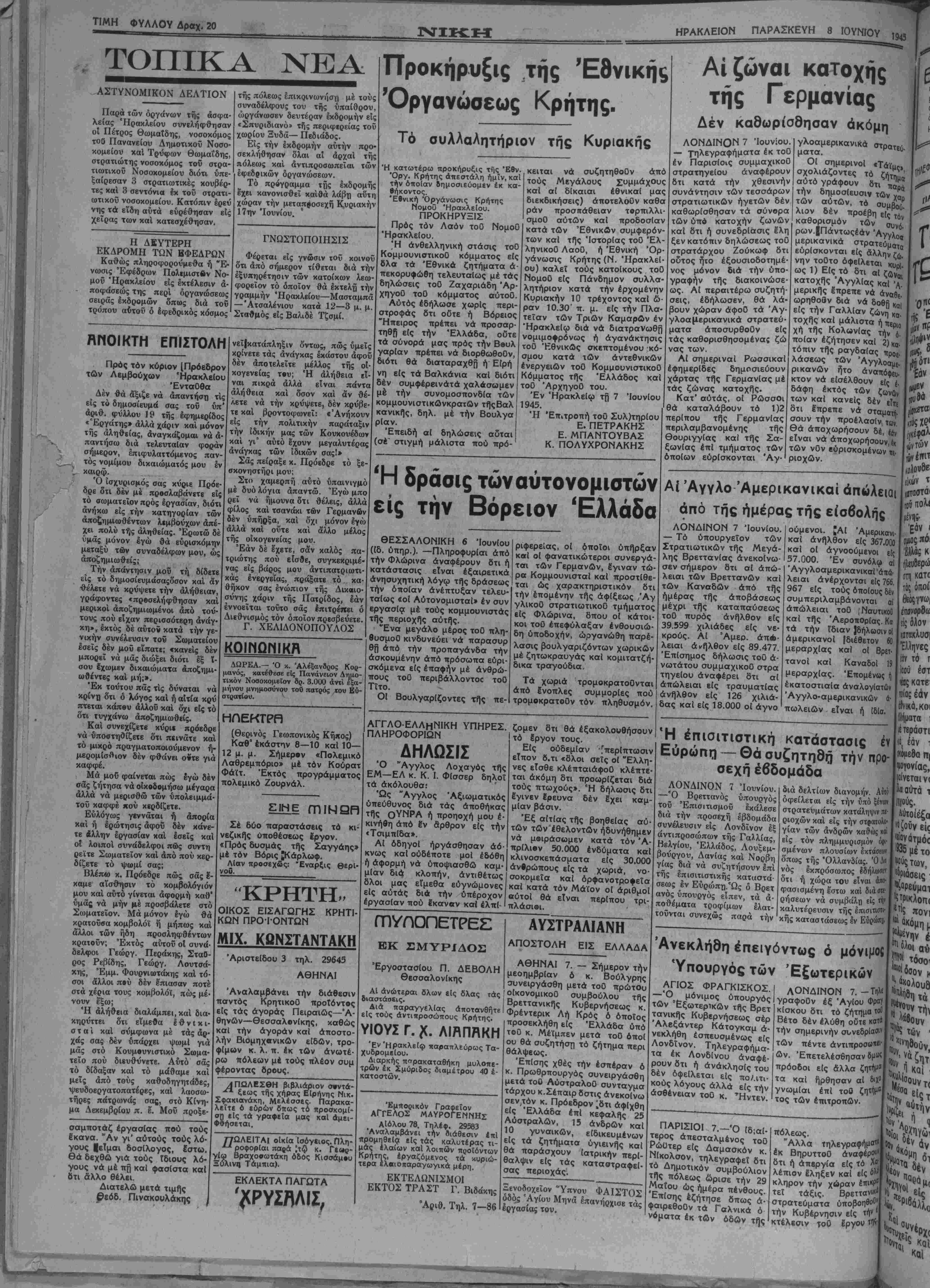 Κρήτης, έργαζόμενος τα <<υριώ- τερσ ίλαιοηαραγωγικά μέρη. ΕΚΤΕΛΩΝΙΣΜΟΙ ΕΚΤΟΣ ΤΡΑΣΤ Γ. Βιδάκης Αριθ. Τηλ. 7—86 ΑΥΣΤΡΑΛΙΑΝΗ ΑΠΟΣΤΟΛΗ ΕΙΣ ΕΛΛΑΔΑ ΑΘΗΝΑΙ 7. — Σήμερον την μεσημβρίαν ό κ. Βούλγρης συνειργάσθη μετά τοθ πρώτθυ οίκονομικοΟ συμβούλου τής Βρεττανικής Κυβερνήσεως κ. Φρέντερικ Λή Κρός ό οποίος προσεκλήθη είς Έλλάδα υπό τοΟ κ. Μέίμπεν μετά τοθ όποί ου θά συζητήση τό ζήτημα περι θάλψεως. Έπίσης χθές την εσπέραν ό κ. Πρωθρπουργός συνειργάσθη μετά τοθ ΑύστραλοΟ συνταγμα τάρχου κ.Σέπαιρ δστις άνεκοίνω σεν,τόν κ. Πρόεδρον ;δτι άφίχθη είς Έλλάδα επί κεφαλής 25 Αύστραλών, 15 άνδρών καί 10 γυναικών, είδικευμένων είς τα ζητήματα ΰγιεινής καί θά παράσχουν ιατρικήν περί¬ θαλψιν είς τάς καταστραφεί¬ σας περιοχάς. Ξενοδοχείον "Υπνου ΦΑΙΣΤΟΣ όδόδ Άγίου Μηνά" Ιπανήρχισε τάς εργασίας τού. Ή έπισιτιστική κατάστασις έν Εύρώηη — Θά συζητηθή την προ¬ σέχη έβδομάδα ΛΟΝΔΙΝΟΝ 7 Ίουνίου. —"Ο Βρεττανός ύπουργός τοΰ Έπισιτισμοΰ εκάλεσε διά την προσέχη έβδομάδα συνέλευσιν είς Λονδίνον έξ άντιπροσώπων τής Γαλλίας, Βελγίου, Ελλάδος, Λουξεμ- βούργου, Δανίας καί Νορβη γίας διά νά συζητήσουν επί τής επισιτιστικής καταστά σεως έν ΕύρώπΉ Ώς ό Βρετ ανόςΰπουργός είπεν, τα ά- ποθέματα τροφίμων έλατ· τοΰνται συνεχώς παρά την διά δελτίων διανομήν Αύτο δφείλεται είς την υπό ξέναι» στρατευμάτων κατάληψιν μ ριοχών καί εις την στρατολ· γίαν των άνδρών καίτώς χαι εις τόν πλημμυρισμόν ό{ΐ· σμένων πλουσίων εκτάσεων όπως τής Όλλανδίας. Ό Λα νός έκπρόσωπος ΙδήλωοΈΤ ότι ή χώρα τού είναι άπο- φασισμένη έστω καί διά οκ ρήσεων νά συμβάλτι είς τί|» καλυτέρευσιν τής επισιτΐίΐ'· κης καταστάσεως έν Εΰδ 'Ανεκλήδη έπειγόντως ό μόνιμον Ύπουργός των ΈξωτερικώΥ ΑΠΟΣ ΦΡΑΓΚΙΣΚΟΣ. —Ό μόνιμος ύπουργός των Εξωτερικών τής Βρετ τανικής Κυβερνήσεως σέρ Αλεξάντερ Κάτογκαμ ά· νεκλήθη έσπευσμένως είς Λονδίνον. Τηλεγραφήμα¬ τα έκ Λονδίνου άναφέ¬ ρουν δτι ή άνάκλησίς τού δέν όφείλεται είς πο/ιτι- κούς λόγους άλλά είς την ασθένειαν τοϋ κ. Ήντεν ΛΟΝΔΙΝΟΝ 7. — Τηλ£ γραφοθν έξ Άγίου Φραϊ κίσκου δτι τό ζήτημα «2 Βέτο δέν ελύθη οΰτε κατά την σημερινήν συνεδρίασιν των πέντε άντιπροσωΐ"· ών. Έπετελέσθησαν ομωί πρόοδοι είς άλλα τα καί ήρθησαν αί γνωμίαι επί τοθ τος των επιτροπών. ΠΑΡΙΣΙΟΙ 7.-Ό ίδ;αί· τερος άπεσταλμένος τοθ Ρώυτερ είς Δαμασκόν κ. Νίκολσον, τηλεγραψεΐ «τι Τό Δημοτικόν συμβούλιον τής πόλεως ώρισε την 29 Μαΐου ώς ήμέρα πένθους. Επίσης εζήτησε δπως ά· φαιρεθοθν τα Γαλνικά ό νόματα έκ των όδων τής πόλεως. Άλλα τηλεγραφήμα'· έκ ΒηρυττοΟ άναφέρί"" δτι ή άπβργία είς τό ο λέπιον έληξεν καί είς κλήρον την χώραν έ ΐ ξ Β η τεΐ τάξις. στρατεόματα η Κ ραν έπρ Βρεττανΐκ" ύποβοηθ"0: μ την Κυβέρνησιν είς κτέλεσιν τοθ Ιργου εικών