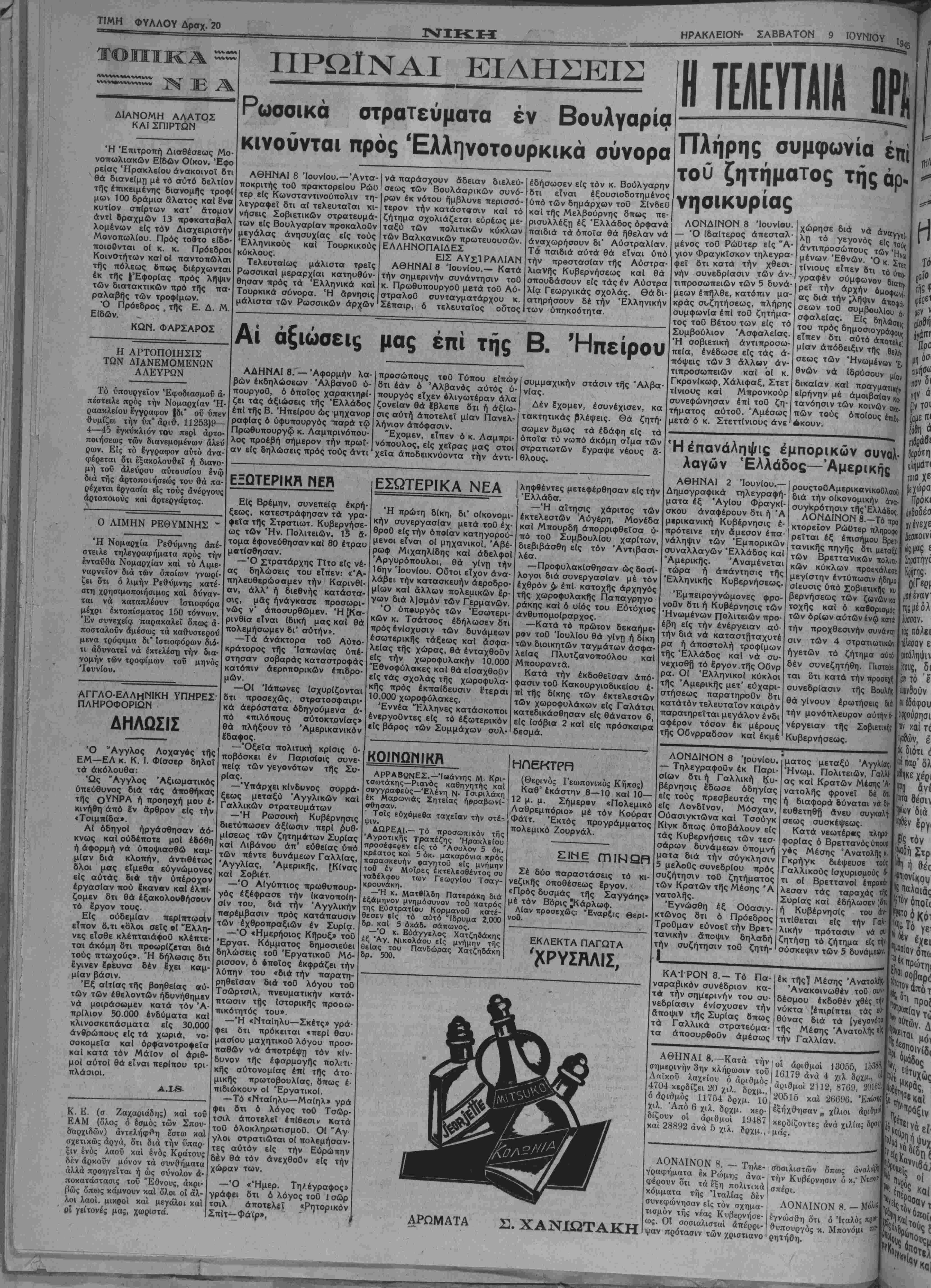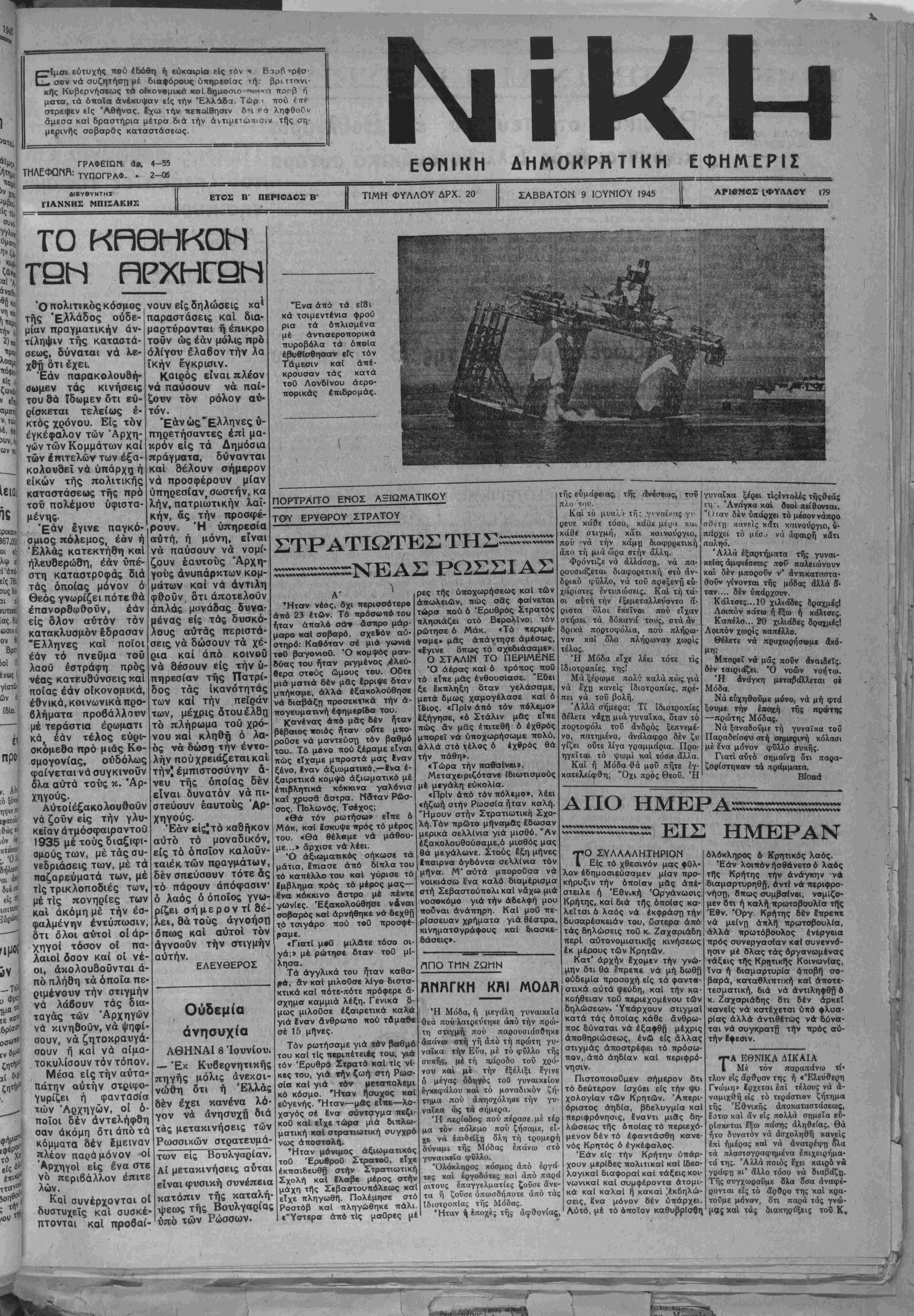 στρεψεν είς Αθήνας, Ιχω την πεποίθησιν δτι ?<ϊ ληφθοθν άμεσα καί δραστήρια μέτρα διά την αντιμετώπισιν τής ση- μερινής σοβαράς καταστάσεως. ΓΡΑΦΕΙΩΝ άρ. 4-55 ΤΗΛΕΦΩΜΒ: ΤΥΠογραφ. » 2—06 ΕΘΜΙΚΗ ΑΗΜΟΚΡΗΤΙΚΗ ΕΦΗΜΕΡΙΣ ΔΙΒΥΘΥΝΤΗΣ ΓΙΑΝΝΗΣ ΜΠΙΖΑΚΗΧ ΕΤΟΣ Β ΠΕΡΙΟΔΟΣ Β' ΤΙΜΗ ΦΥΛΛΟΥ ΔΡΧ. 20 ΣΑΒΒΑΤΟΝ 9 ΙΟΥΝΙΟΥ 1945 _ ΑΡΙΟΜΟΣ ΙΦΥΛΑΟΥ 179 αί Ά ΓΟ ΚΑΘΗΚΟΝ ΤΩΝ ΡΙΡΧΗΓΟΝ ιθβΚ(ι την 2) κ» ηροι λθαω Ό πολιτικός κόσμος νούν είς δηλωσεις τής Ελλάδος ούδε-}παραστάσεις καί μίαν πραγματικήν αν¬ ε!ζ ζωνώι ν εΐΐι ών Ιειοι ίς .ρικαν, Ϊ67.0Μ ΟΙ {|( λφ ίΙ είς 7« ούς δεί 31 ί ΐυτικο, Ιας.Κι ωσινι όν Κ Βρει >ο1 Ι1