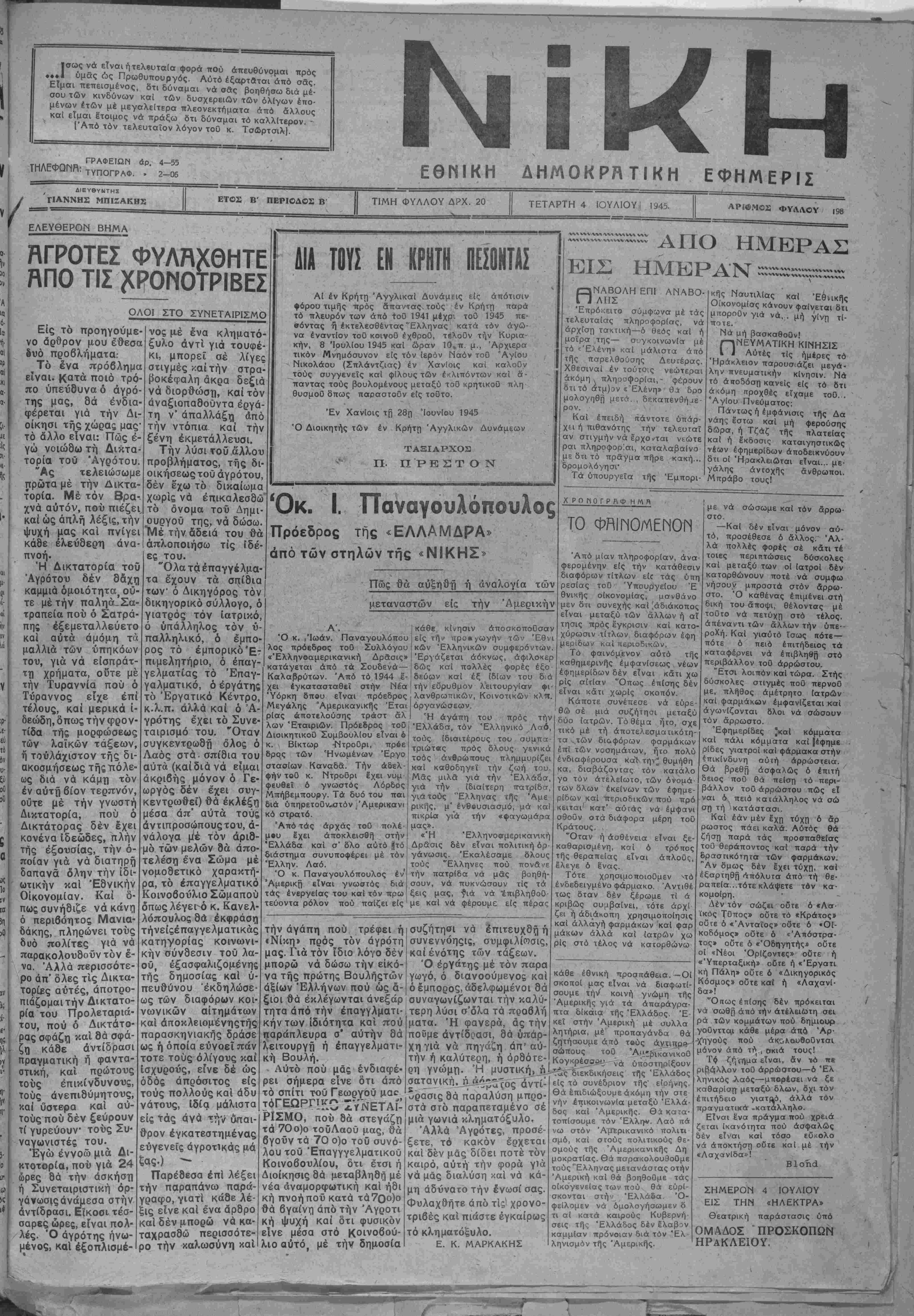 <*Ρ. 4-55 τγΠ0ΓρΑφ_ ι ΔΙΕΥΘΥΝΤΗΣ ΓΙΑΝΝΗΣ ΜΠΙΖΑΚΗΣ ΕΛΕΥΘΕΡΟΝ ΒΗΜΑ ΕΘΜΙΚΗ ΔΗΜΟΚΡλΤΙΚΗ ΕΦΗΜΕΡΙΣ ΕΤΟΣ Β' ΠΕΡΙΟΔΟΣ Β ΤΙΜΗ ΦΥΛΛΟΥ ΔΡΧ. 20 ΤΕΤΑΡΤΗ 4 ΙΟΥΛΙΟΥ, 1945. ΑΡΙ©ΜΟΣ ΦΥΛΛΟΥ 198 ΒΓΡΟΤΕΣ ΦΥΛΗΧΘΗΤΕ ΗΠΟ ΤΙΣ ^ΡΟΜΟΤΡΙΒΕΣ ΟΛΟΙ ΣΤΟ ΣΥΝΕΤΑΙΡΙΣΜΟ Είς τό προηγούμε- νο άρθρον μου έθεσα 8υό προβλήματα.· Τό ένα πρόβλημα είναι, κατά ποιό τρό- ύύδ ό ά πο ύπεύδυνα ό άγρό- της μας, 8ά ένδια- φέρεται γιά την Δι- οίκησι τής χώρας μας' τό άλλο είναι: Πώς έ- γώ νοιώθω τή Δικτα¬ τορία τοϋ Άγρότου. "Ας τελειώσωμε πρώτα μέ την Δικτα¬ τορία. Μέ τόν Βρα- χνά αυτόν, πού πιέζει,; καϊ ώς άπ,λή λέξις, την ψυχή μας καΐ πνίγει κάθε έλεύθερη άνα- πνοή. Ή Δικτατορία τού Άγρότου δέν θάχη καμμιά όμοιότητα> οθ¬