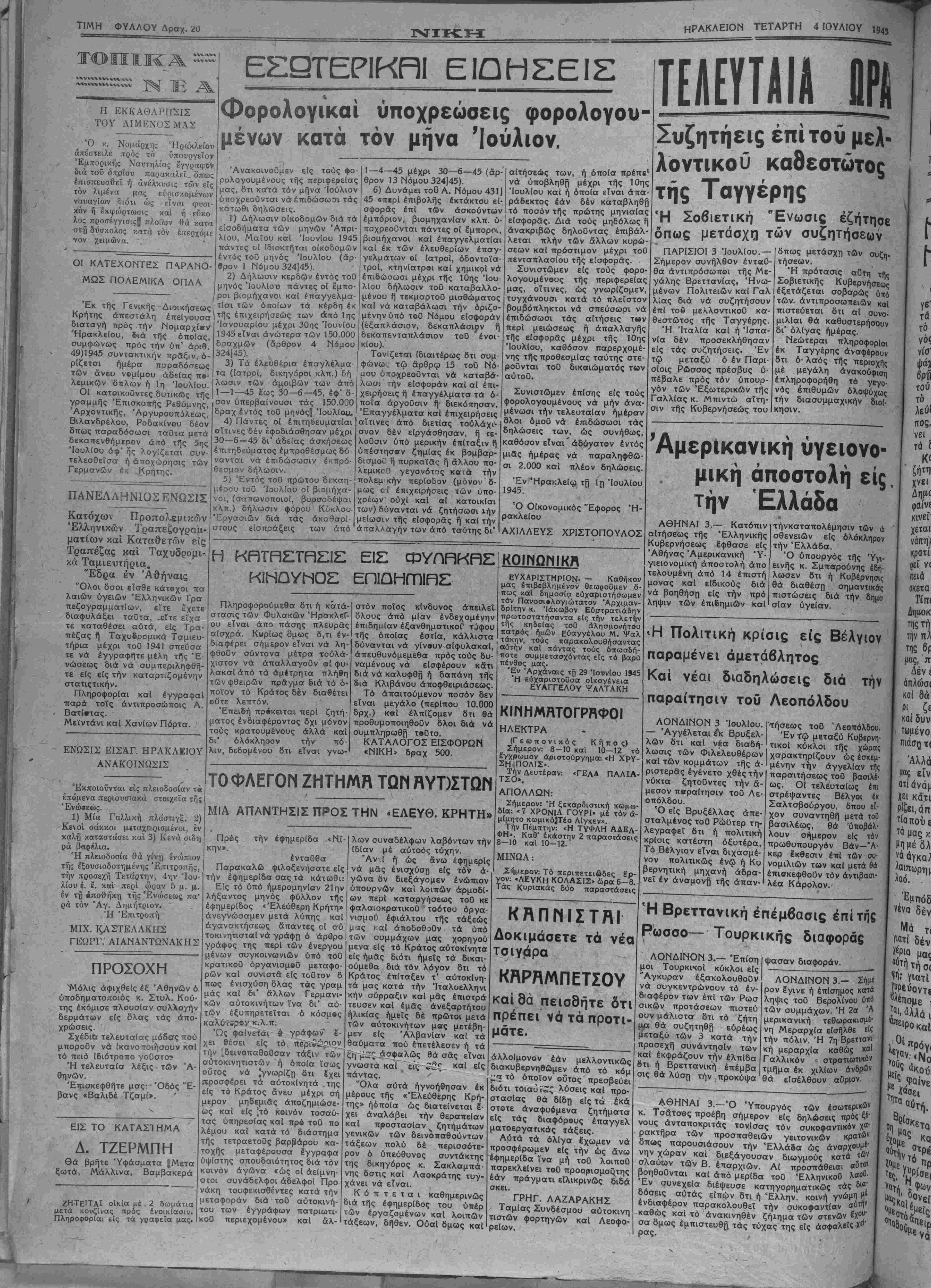 γνωστά καΊ # είς ££? κ<*1 είς πάντας. * ' Όλα αύτά ήγνοήθησαν έκ μέροος τής «Έλεύθερης Κρή¬ της» ήόποία ώς διατείνεται 8- χει άναλάβει την θεραπείαν καί προστασίαν ^ ζητημάτων γενικών τών δεινοπαθούντας τάξεων πολύ δέ περισσότε¬ ρον ό ύπεύθυνος συντάκτης της δικηγόρος κ. Σακλαμπά- νης δστις καί Λαοκράτης τυγ¬ χάνει νά είναι. Κ ό π τ ε τ α ι καθημερινώς διά τής εφημερίδος τού υπέρ τών εργαζομένων καί λοιπών τάξεων, δήθεν. Ούαί δμως καί ΕΥΧΑΡΙΣΤΗΡΙΟΝ- — Καθήκον μας επιβεβλημένον θεωρούμεν δ¬ πως καΐ δημοσία ευχαριστήσωμεν τόν Πανοσιολογιώτατον Άρχιμαν- δρΐτην κ. Ίάκωβον Εύστρατιάδην ττρωτοστοτήσαντα είς την τελετήν τής κηδείας τοϋ αλησμονήτου πατρός ημών Εύαγγέλου Μ. Ψαλ τάκην, τοθς τΐαρακολουθήσοντας αυτήν κσΐ πάντας τούς όπωσδή- ποτε συμμετασχόντας είς τό βαρύ πένθος μας. "Εν 'Αρχάναις τ[) 29 ΊουνΙου 1945 Ή εθχαριστοθσα οίκογένεια ΕΥΑΓΓΕΛΟΥ ΨαΛΤΑΚΗ ΚΙΠΗΜΗΤΟΓΡΛΦΟΙ ΗΛΕΚΤΡΑ (Γε«πονικός Κήπος) Σήμερον: 8-10 κσί 10—12 τό έΎχρωμον άριστούργημα: «Η ΧΡΥ- ΣΗ,ΠΟΛΙΣ». Την Δευτέραν: «ΓΕλΑ ΠΑΛΙΑ ΤΣΟ». ΑΠΟΛΛΩΝ: Σήμερον: Ή ξεκαρδιστική κωμω δία: « 7 ΧΡΟΝΙΑ ΓΟΥΡΙ» μέ τόν ά- μίμητο κωμικόίΤέο ΛΙγκεν». Την Πέμπτην: «Η ΤΥΦΛΗ ΑΔΕΛ- ΦΗ». Καθ* εκάστην 2 παραστάσεις 8-10 καΐ 10-12. ΜΙΝΩΑ: Σήμερον: Τό περιπετειδδες έρ¬ γον: «ΛΕΥΚη ΚΟΛΑΣΙΣ» ώρα 6-8. Τάς Κυριακάς διόο παραστάσεις ΚΗΠΜΙΣΤΗΪ7 Δοκιμάσετε τα νέα τσιγιίρα ΑΘΗΝΑΙ 3.— Κατόπιν αίτήσεως τής Έλληνικής Κυβερνήσεως έφθασε είς Αθήνας Άμερικανικη 'Υ- γιειονομική αποστόλη άπο τελουμένη άπό 14 έπιστή μονάς καί είδικούς διά νά βοηθήση είς την πρό λήψιν τών έπιδημιών καί τήνκαταπολέμησιν τών ά σθενειών είς ολόκληρον την Έλλάδα. Ό ύπουργός τής 'Υγι- εινής κ. Σμπαρούνης εδή¬ λωσεν δτι ή Κυβέρνησις θά διαθέση σημαντικάς πιστώσεις διά την δημο σίαν υγείαν. <Η Πολιτική κρίσις είς Βέλγιον παραμένει άμετάβλητος Καί νέαι διαδηλώσεις διά την παραίτησιν τού Λεοπόλδου καΐθά πεισθήτε ότι πρέπει νά τα προτι- ά μάτε. ΛΟΝΔΙΝΟΝ 3 Ιουλίου. — Αγγέλεται έ Βρυξελ- λών δτι καί νέα διαδή¬ λωσις τών Φιλελευθέρας καί των κομμάτων τής ά· ριστεράς εγένετο χθές την νύκτα ζητοθντες την ά¬ μεσον παραίτησιν τοϋ Λε· οπόλδου. Ό είς Βρυξέλλας άπε- σταλμένος τοθ Ρώυτερ τη- λεγραφεΐ δτι ή πολιτική κρίσις κατέστη οξυτέρα, Τό Βέλγιον είναι διχασμέ- νόν πολιτικώς ένώ ή Κυ βερνητική μηχανή 'άδρα- νεΐ έν άναμονή τής απαν¬ τήσεως τοθ "Λεοπόλδου Έν ΐνρ μεταξύ Κυβερνη¬ τικαί κύκλοι τής χώρας χαρακτηρίζουν ώς έσκεμ- μένην την αγγελίαν τής παραιτήσεως τοθ βασιλέ¬ ως. Οί τελευταίως επι στρέψαντες Βέλγοι έκ Σαλτσβούργου, δπου εί¬ χον συναντηθή μετά τοθ βασιλέως, θά λουν σήμερον 'ύποβάλ- είς τόν πρωθυπουργόν Βάν—Ά- κερ έκθεσιν επί τών συ· νομιλιών των καί μετά θά επισκεφθούν τόν άντιβασι- λέα Κάρολον. Ή Βρεττανική επέμβασις επί τής Ρωσσο— Τουρκικής διαφοράς ΛΟΝΔΙΝΟΝ 3.— Έπίση μοί Τουρκκοί κύκλοι είς Αγκυραν έξακολουθοθν νά συγκεντρώνουν τό εν¬ διαφέρον των επί των Ρωσ σικών προτάσεων πιστεύ ουν μάλιστα δτι τό ζήτη μ/χ θά συζητηθή εύρέως αλλοίμονον εάν μελλοντικώς διακυβερνηθώμεν άπό τό κόμ μα τό οποίον οδτος πρεσβεύει διότι τοιαϋι»^ λύσεις καί προ- θά δίδη είς τα εκά¬ στοτε άναφυόμενα ζητήματα είς τάς διαφόρους έπαγγελ ματοεργατικάς τάξεις. Αύτά τα ολίγα έχωμεν νά προσφέρωμεν είς την ώς άνω εφημερίδα ίνα μή τοθ λοιποϋ παρεκλείνει τοθ προορισμοθτης εάν πράγματι ειλικρινώς διδά σκει. ΓΡΗΓ. ΛΑΖΑΡΑΚΗΣ Ταμίας Συνδέσμου αύτοκινη τιστών φορτηγών καί Λεοφο- ρείων. την των μέταξύ τών 3 κατ
