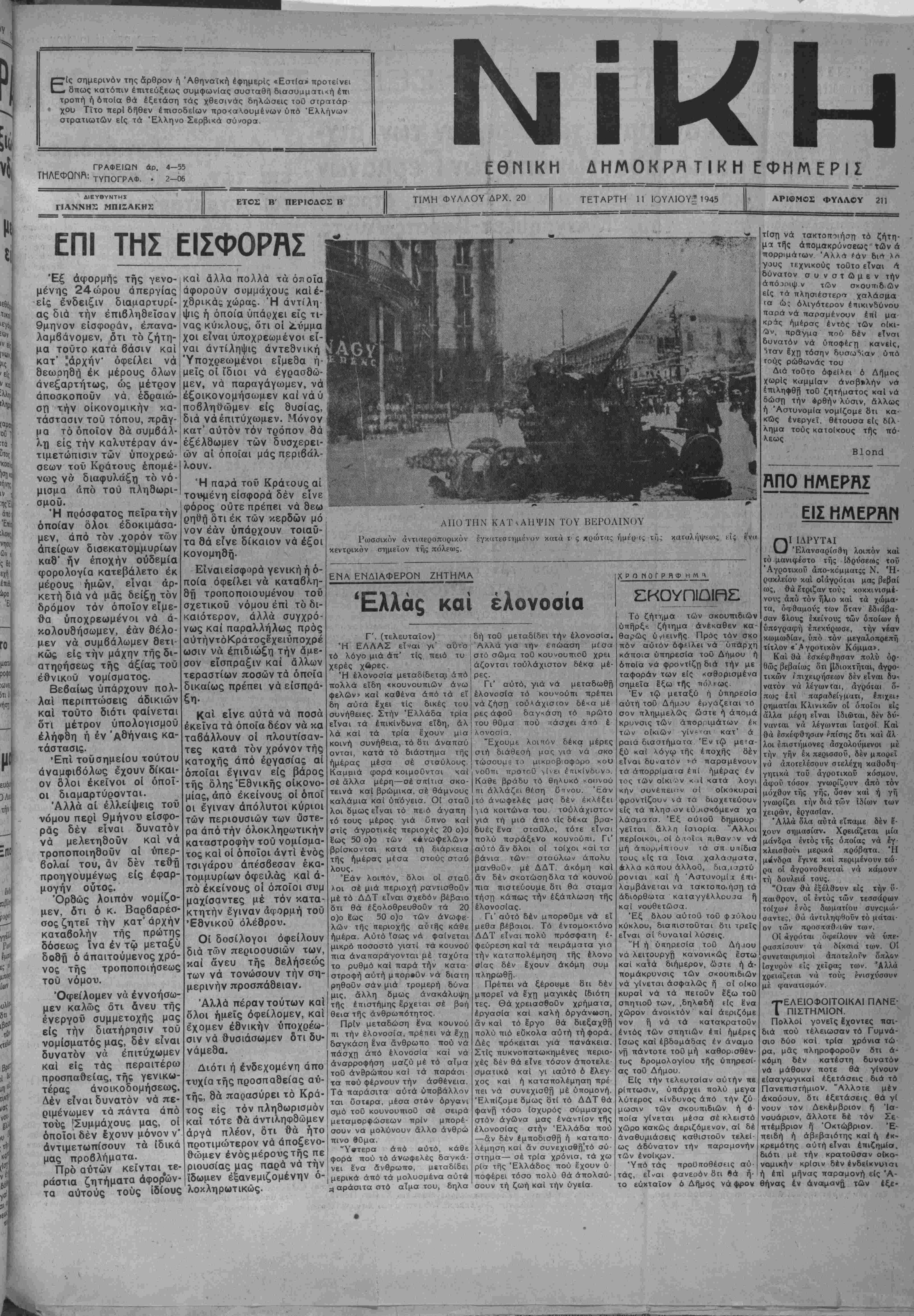 χου Τΐτο περΐ δήθεν έπισοδεΐων προ<α.ουμένων υπό 'Ελλήνων στρατιωτών είς τα Έλληνο Σερβικά ύ ΤγΙΛΕΦΩΠΚ: ΓΡΑΦΕΙΩΝ άρ. 4—55 . 2-06 ΕΘΜΙΚΗ ΔΗΜΟΚΡΗ Τ Ι Κ Η ΕΦΗΜΕΡΙΣ ΔΙΕΥΘΥΝΤΗΣ ΓΙΑΝΝΗΣ ΜΠΙΖΑΚΗΧ ΕΤΟΣ Β ΠΕΡΙΟΔΟΣ Β Τ1ΜΗ ΦΥΛΛΟΥ ΔΡΧ. 20 ΤΕΤΑΡΤΗ 11 ΙΟΥΛΙΟΥ^ 1945 ΑΡΙΦΜ02 ΦΥΛΛΟΥ 211 ΕΠΙ ΤΗΣ ΕΙΣΦΟΡΑΣ Έξ άφορμής τής γενο¬ μένης 24ώρου άπεργίας είς ένδειξιν διαμαρτυρί¬ ας διά την έπιβληθεΐσαν 9μηνον είσφοράν, επανα¬ λαμβάνομεν, ότι τό ζήτη- μα τουτο κατά βάσιν καί κατ' ϊάρχήν" όφείλει νά θεωρηθή έκ μέρους όλων ανεξαρτήτως, ώς μέτρον άποσκοπούν νά, έδραιώ- σπ χήν οικονομικήν κα¬ τάστασιν τοϋ τόπου, πράγ- μα τό οποίον 8ά συμβάλ- λη είς την καλύτερον αν¬ τιμετώπισιν των υποχρεώ¬ σεων τοΰ Κράτους έπομέ- νως νά διαφυλάξη τό νό· μισμα άπό τοΰ πληθωρι- σμοΰ. Ή πρόσφατος πεϊρατήν οποίαν όλοι έδοκιμάσα- μέν, άπό τόν .χορόν των άπείρων δισεκατομμυρίων καθ" ήν εποχήν ούδεμία φορολογία κατεβάλετο έκ μέρους ημών, είναι άρ- κετή διά νά μάς δείξη τόν δρόμον τόν οποίον είμε¬ θα ύποχρεωμένοι νά α¬ κολουθήσωμεν, εάν θέλο¬ μεν νά συμβάλωμεν θετι- κώς είς την μάχην τής δι¬ ατηρήσεως τής άξίας τού έθνικοΰ νομίσματος. Βεβαίως ύπάρχουν πολ¬ λαί περιπτώσεις άδικιών καί τουτο διότι φαίνεται ότι μέτρον ύπολογισμοϋ ελήφθη ή έν Αθήναις κα¬ τάστασις. •Επί τοϋσημείου τούτου άναμφιβόλως έ'χουν δίκαι¬ ον δλοι έκείνοι οί όποΐ- οι διαμαρτύρονται. Άλλά αί έλλείψεις τοΰ νόμου περί 9μήνου είσφο- ράς δέν είναι δυνατόν νά μελετηθοϋν ( καί νά τροποποιηθοΰν αί ύπερ- βολαί τού, άν δέν τεθή προηγουμένως είς εφαρ¬ μογήν ούτος. Όρθώς λοιπόν νομίζο¬ μεν, ότι ό κ. Βαρβαρέσ- σος ζητεί την κατ' αρχήν καταβολήν τής πρώτης δόσεως ϊνα έν τφ μεταξύ δοθή ό απαιτουμένας χρό- νος τής τροποποιήσεως τοΰ νόμου. "Οφείλομεν νά έννοήσω- μεν καλώς ότι άνευ τής ένεργοΰ συμμετοχής μας είς την διατήρησιν τοΰ νομίσματος μας, δέν είναι δυνατόν νά επιτύχωμεν καί είς τάς περαιτέρω προσπαθείας, τής γενικω¬ τέρας ανοικοδομήσεως. Δέν είναι δυνατόν νά πε¬ ριμένωμεν τα πάντα άπό τούς 'Συμμάχους μας, οί όποΐοι δέν Ιχουν μόνον ν' άντιμετωπίσουν τα ίδικά μας προβλήματα. Πρό αυτών κείνται^τε- ράστια ζητήματα αφορών¬ τα αύτούς τους ίδίους καί άλλα πολλά τα όηοΐα άφορούν συμμάχους καίέ- χθρικάς χώρας. Ή αντίλη¬ ψις ή όποία ύπάρχει εις τι¬ νάς κύκλους, δτι οί ϊ,νμμα χοι είναι ύποχρεωμένοι εί¬ ναι αντίληψις άντεθνική Ύποχρεωμένοι είμεθα η¬ μείς οί ίδιοι νά έγρασθώ- μεν, νά παραγάγωμεν, νά έξοικονομήσωμεν καΐνάύ ποβληθώμεν είς θυσίας, διά νά επιτύχωμεν. Μόνον κατ' αυτόν τόν τρόπον θά εξέλθωμεν των δυσχερει¬ ών αί οποίαι μάς περιβάλ- λουν. Ή παρά τοϋ Κράτους αί τουμένη είσφορά δέν είνε φόρος οθτε πρέπει νά θεώ ρηθή δτι έκ των κερδών μό νόν εάν ύπάρχουν τοιαΰ- τα θά είνε δίκαιον νά έξοι κονομηθή. Είναιεΐσφορά γενική ή ό¬ ποία όφείλει νά καταβλη- Π τροποποιουμένου τοϋ σχετικοϋ νόμου επί τό δι- καιότερον, άλλά συγχρό¬ νως καί παραλλήλως πρός αύτήντόΚράτοςεχειύποχρέ ώσιν νά επιδιώξη την άμε¬ σον είσπραξιν καί άλλων τεραστίων ποσών τα όποϊα δικαίως πρέπει νά είσπρά- Καί είνε αύτά νά ποσά έκεΐνα τα όποία δέον νά κα ταβάλλουν οί πλουτίσαν¬ τες κατά τόν χρόνον τής κατοχής άπό εργασίας αί οποίαι έγιναν είς βάρος τής όληςΈθνικής οίκονο- μίας, άπό έκείνους οί όποί οί έγιναν άπόλυτοι κύριοι των περιουσιών των ΰστε- ρα άπό την ολοκληρωτικήν καταστροφήν τοΰ νομίσμα¬ τος καί οί όποΐοι άντί ενός τσιγάρου άπέσβεσαν έκα- τομμυρίων οφειλάς καί ά¬ πό έκείνους οί όποΐοι συμ μαχίσαν