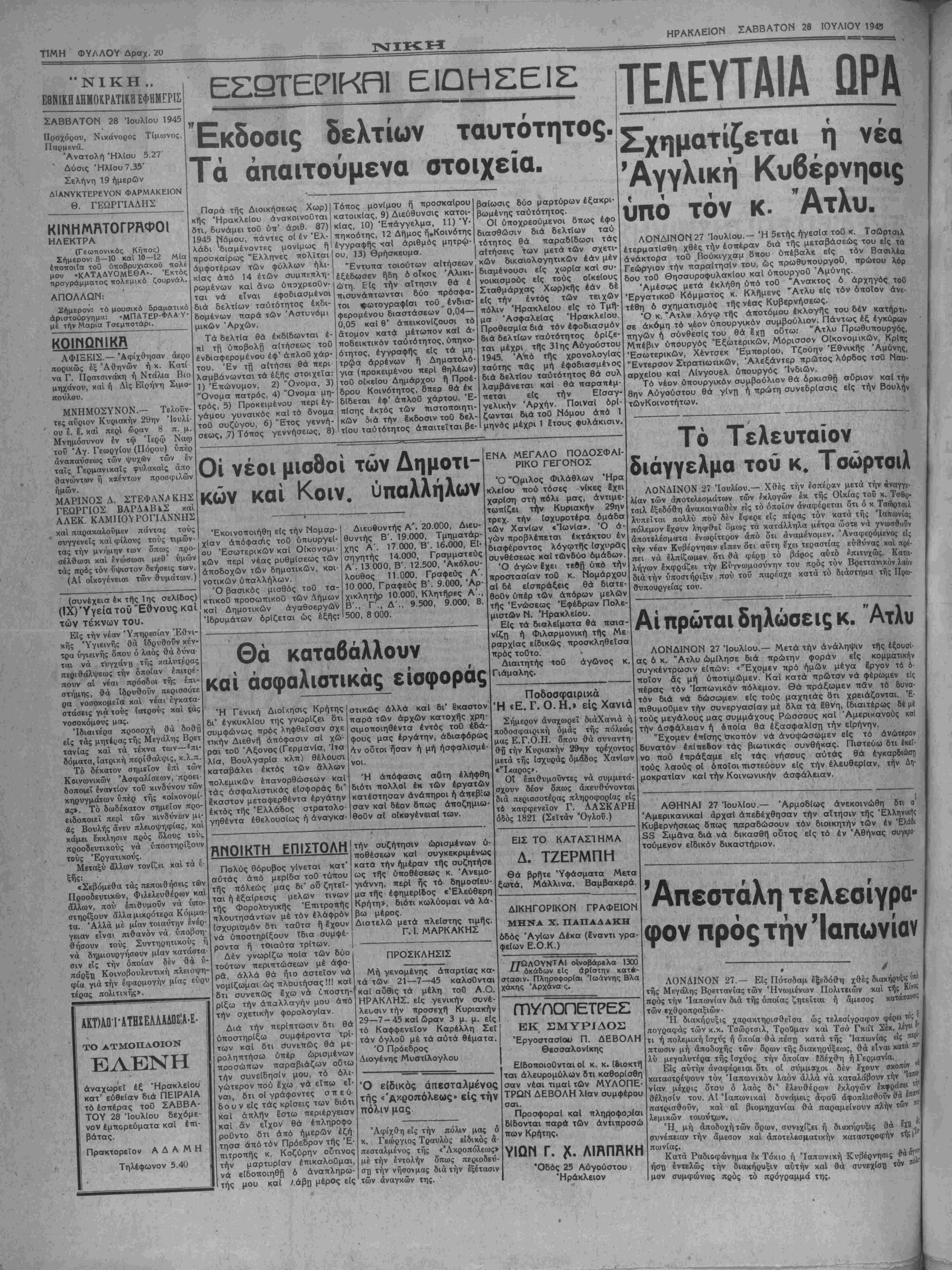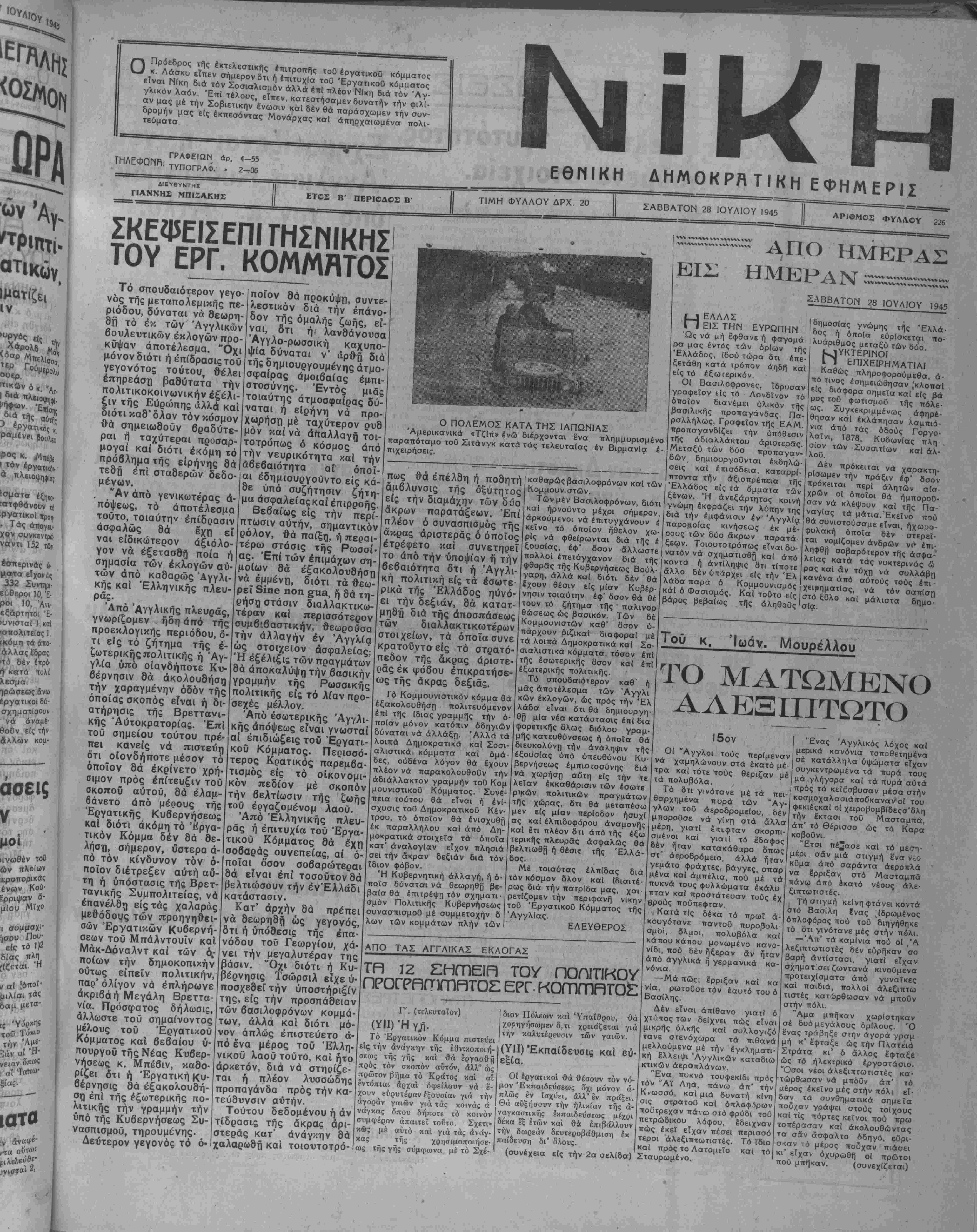 ΤΟΥ ΕΡΓ^<ΟΜΜητΟΣ ΣΑΒΒΑΤΟΝ 28 ΙΟΥΛΙΟΥ 1945 ΕΦΗΜΕΡΙΣ ΑΡΙΟΜΟΣ ΦΥΛΛΟΥ 226 ΙΜατίζε, ιν διά ό Κ. "Α ίτίίζ ° έΡΥατικός [στφθάνοον τό :ΡΥατικοί -τεροη- - Τάς άπογευ- Χθν συνκϊντρυ ναντι 152 τβν εσπερινάς 4· μστα εΐχονώς 332 Συνηρι· εύθεροι 10, Έ- Ρθι 10, Άν.· εξάρτητοι Έ· >υνισταί 1, καί