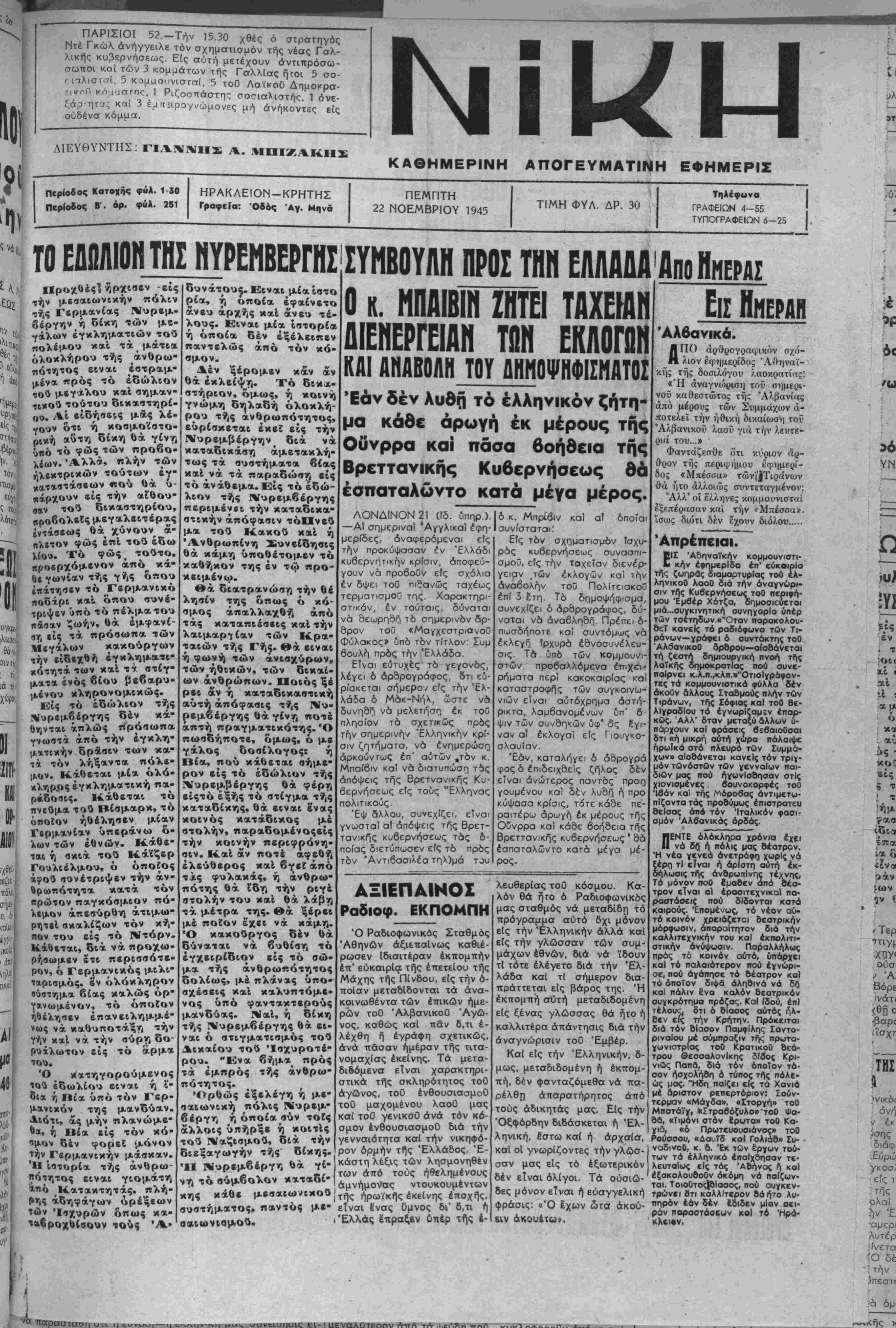 <ιη είς τα πρόσωπα των Μεγάλον κακούργων την είδεχθη έγκληματι- κότητά των καί τ·» στίγ- ματα ενός βίου βεβαρυ- μένου κληρονομικώς. Είς τό εδώλιον τής Μυρεμβέργης δέν κά- Θηνται απλώς πρόσωπα γνωστά άπό την εγκλη¬ ματικήν δράσιν των κα¬ τά τόν λήξαντα πόλε¬ μον. Κάθεται μία όλό- κλήρος έγκληματική πα¬ ράδοσις. Κάθεται τό πνεύμα τού Βίσμαρκ, τό οποίον ήθέλησεν μίαν Γερμανίαν υπεράνω ό- λων των εθνών. Κάθε- χολ ή σκιά τού Κάϊζερ Γουλιέλμου, ό οποίος άφοΰ συνέτριψεν την άν- ^ρωπότητα κατά τόν «ρώτον παγκόσμιον πό¬ λεμον απεσύρθη ατιμω¬ ρητεί σκαλίζων τόν κή¬ πον τού είς τό Ντόρν. Κάϋεται, διά νά προχω- ρήβωμεν έτι περισσότε¬ ρον, ό Γερμανικός μιλι- ταρισμός, 8ν ολόκληρον «ύοτημα βίας καλώς όρ- γανωμένον, τό οποίον ηΊίλησεν επανειλημμέ¬ νας νά καθυποτάξη την Υήν καί νά την σύρη δο- ρυχλωτον είς τό άρμα δυνάτου^. Είναι μία ίστο ρία, ή οποία εφαίνετο άνευ άρχής κ αί άνευ τέ- λους. Είναι μία ίστορία ή όποία δέν εξέλειπεν παντελώς άπό τόν κό βμον. Δέν ξέρομεν κάν άν θά εκλείψη. Τό δικα¬ στήριον, όμως, ή κοινή γνώμη οηλαδή ολοκλή¬ ρου τής ανθρωπότητος, ευρίσκεται έκεί είς την Νυρεμβέργην^ διά νά καταδικάση άμετακλή τως τα αυστήματα βίας κ αί νά τα παραδώση είς ^ χ°ατηγορουμενος ΐοωλίου είναι ή ΐ- ή Βία υπό τόν Γερ¬ μανικόν^ της μανδύαν. άς μην πλανώμε- ί) Βία είς τόν κό· δέν φορεί μόνον *ήν Γερμανικήν μασκαν. Η ίβτορία τής ανθρω¬ πότητος είναι γιομάτη *«ό ,Κατακτητάς, πλή- αδηφάγων όρέξεων Ίσχυρών όπως κα- θί τού, Ά· τό άνάθεμα. Είς τό εδώ¬ λιον τής Νυρεμβέργης περιμένιι την καταδικα1 στικην απόφασιν τόΠνεύ μα τού Κακοΰ καί ή Ανθρωπίνη Συν είδησις θά κάμη υποθέτομεν τό καθήκον της έν τώ προ- κβιμένω Θά διατρανώση την θε λησίν της όπως ό κό- σμος άπαλλαχθή άπό τάς καταπιέσεις καί την λαιμαργίαν των Κρα- ταιών τής Γής. Θά είναι ή φωνή των άνισχύρων, τώνήθικών, των δικαί- ων άνθρώπων. Ποίος ξέ ρει άν ή καταδικαστική αυτή απόφασις τής Νυ¬ ρεμβέργης θά γίνη ποτέ απτή πραγματικότης. Ό πωσδήποτε, όμως, ό με γάλος δοσίλογος: ή Βία, π ού κάθεται σήμε¬ ρον είς τό εδώλιον τής Νυρεμβέργης θά φέρη είςτό εξής τό στίγμα τής καταδίκης, θά είναι έν άς κοινός κατάδικος μέ στολήν, παραδομένοςείς την κοινήν περιφρόνη¬ σιν. Καί άν ποτέ αφεθή έλεύθερος χαΐ βγεϊ άπό τάς φυλακάς, ή ανθρω¬ πότης θά ίδη την ριγέ στολήν τού χαί θά λάβη τα μέτρα της. Θά ξέρει μέ ποίον έχει ν ά κάμη. Ό κακούργος δέν θά δύναται νά βυθίαη τό έγχειρίδιον είς τό σώ- μα τής ανθρωπότητος δόλιος, μέ πλάνας υπο- σχέσεις καί καλυπτόμε- νος υπό φαντακτερούς μανδύας. Ναί, ή δίκη τής Νυρεμβέργης θά εί¬ ναι ό στιγματισμός τού Δικαίου τού Ίαχυροτέ- ρου. Ένα βήμα^ πρός τα έμπρός τής ανθρω¬ πότητος. Ορθώς εξελέγη η με· σαιωνική πόλις Νυρεμ- βίργη ή όποία συν τοίς άλλοις υπήρξε ή κοιτίς τού Ναζισμού, διά την διβξαγωγήν τής δίκης. Ή Νυρεμβέργη Θά γί¬ νη τό σύμβολον καταδί- Ο κ. ΜΠΑΙΒΓΝ ΖΗΤΕΙ ΤΑΧΕΙΑΝ ΔΙΕΝΕΡΓΕΙΑΝ ΤΩΝ ΕΚΛΟΓΟΝ ΚΑΙ ΑΗΑΒΟΑΗ ΤΟΥ ΰΗΜΟΨΗΦΙΙΜΑΤΟΣ Εάν δέν λυθή τό ελληνικόν ζήτη· μα κάδε άρωγή έκ μέρους τής Οϋνρρα καί πάσα βοηθεία τής Βρεττανικής Κυβερνήσεως θά έσπαταλώντο κατά μέγα μέρος. ΛΟΝΔΙΝΟΝ 21 (ίδ. ΰπηρ.).|δκ. Μπρίβιν καΐ αί —ΑΙ σημεριναί "Αγγλικαί έφη-Ισυνι'σταται: όποΤαι μερίδες, άναφερόμεναι είς προκυψασαν έν Ελλάδι κυβερνητικήν κρίσιν, όποφεύ- γουν νά προβούν είς σχόλια έν δψει τού πιθανώς ταχέως τερματισμθΰ της. Χαρακτηρι- στικόν, έν τούτοις, δύναται νά Θεωρηθή τό σημερινόν αρ¬ θρον τού «Μαγχεστριανοΰ Φύλακος> υπό τόν τίτλον: Συμ