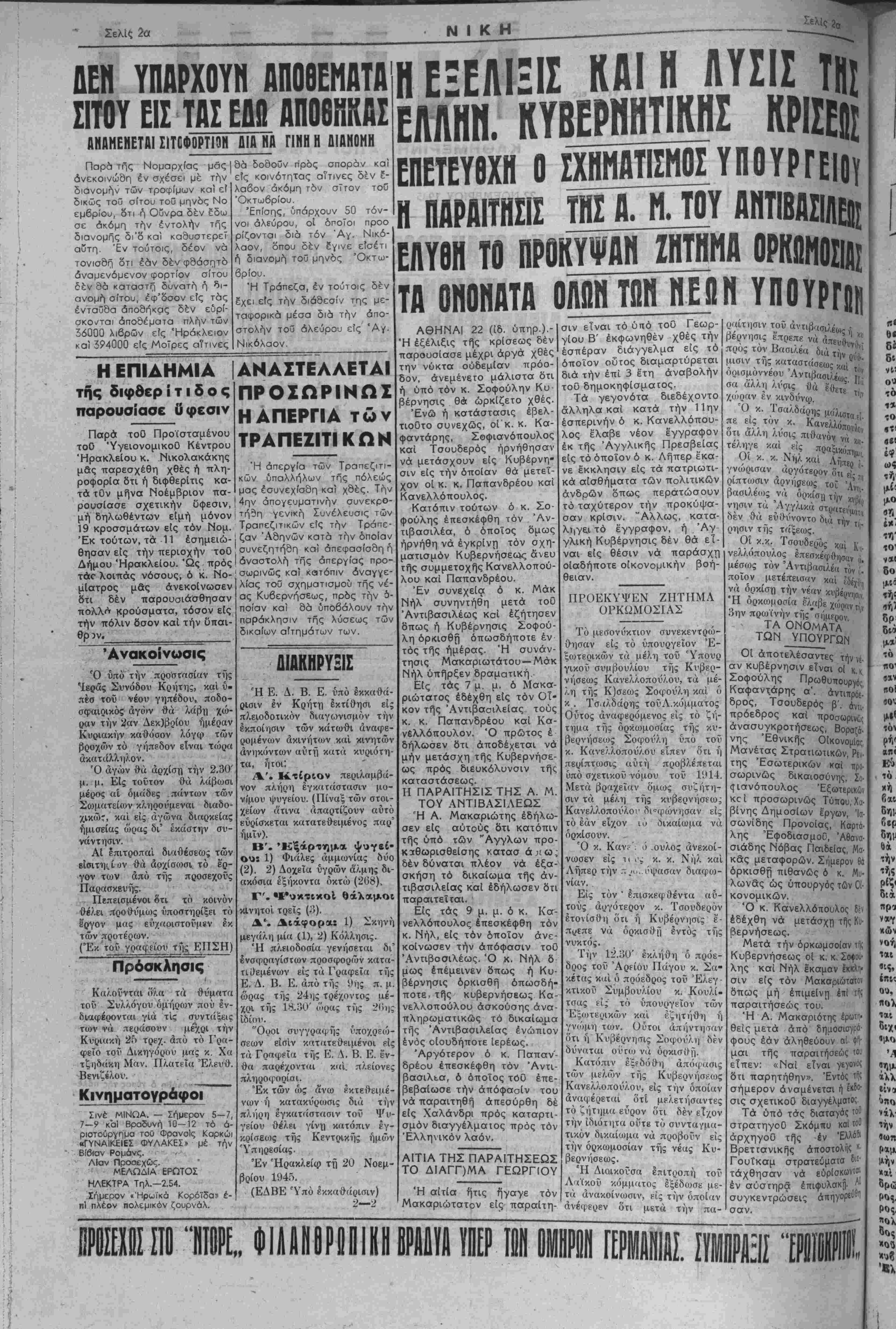 <δεν δΥι εύθύνοντο διά την ΤΓ ρήσιν τής τάξεως. '" Οί χ.χ Τσουδερός καί χ,, νελ/.οπουλος επεσκέφθησαν ,1 μέσως τόν Άντιβασιλέ« τόν ί! ποίον μετέπεισαν καί ;8|,{ι νά δρχίση την νέαν χνβίρν^ Η ορχωμοιπα έλ«|38 χώραγ „» .ίην πρωϊνην τής σι'|με0ον ' ΤΑ ΟΝΟΜΑΤΑ ' ΤΩΝ ΥΠΟΥΡΓΟΝ ΟΙ άποτελέσαντες την ;ε αν κυβέρνησιν είναι οί κ κ Σοφούλης Πρωθυπουργόν Καφαντάρης α'. άντιπρόε^ δρος, Τσουδερός β'. 4νη. πρόεδρος καί προσωρινάς ανασυγκροτήσεως, Βοραζά- νης Έθνικής Οίκονομίσς Μανέτας Στρατιωτικών, Ρέν¬ της Εσωτερικόν καί προ¬ σωρινώς δικαιοσύνης, Σο· ίΐανόπουλος Εξωτερικών κοί προσωρινώς Τύπου,Χα- βΐνης Δημοσίων έργων, Ίο· σωνίδης Προνοίας, Κσρτά- λης Έφοδιασμοΰ, Αθανα¬ σιάδης Νόβας Παιδείας, Μα· κάς μεταφορών. Σημερον 8ά όρκισθή πιθανώς 6 κ. Μυ· λωνδς ώς ύπουργός των ΟΙ- κονομικών. Ό κ. Κανελλόπουλος δέ» εδέχθη νά μετάσχη τής Κυ¬ βερνήσεως. Μετά τήν όρκωμσοίσν ιΙ)ί Κυβερνήσεως οί κ. κ. Σο*οο· λης καΐ Νήλ έ'κσμσν Ικκλη· σιν είς τόν Μακαρΐώτατον δπως μή επιμείνη ^ί της παραιτήσεως τού.' Ή Α. Μακαριότης ερωτη¬ θείς μετά άπό δημοσισγρσ- φους εάν άληθεύουν οί ^ μαι τής παραιτήσεως ^^ είπεν: «Ναί είναι γεγονος | δτι παρητήθην». Ένΐός ^5 σήμερον άναμένετσι ή £κ&°' σις σχετικοΰ διαγγέλματος Τα υπό τάς διαταγάς τοθ στρατηγοθ Σκόμπυ και «υ άρχηγοϋ τής έν Ελλάδι Βρεττανίας άποστολης κ Γουΐκαμ στρατεύμστα διε¬ τάχθησαν νά ευρίσκωνται έν αΰστηρδ έπιφυλσκϋ. συγκεντρώσεις ί σαν. ιι #· ί :Ιί II Ι)!