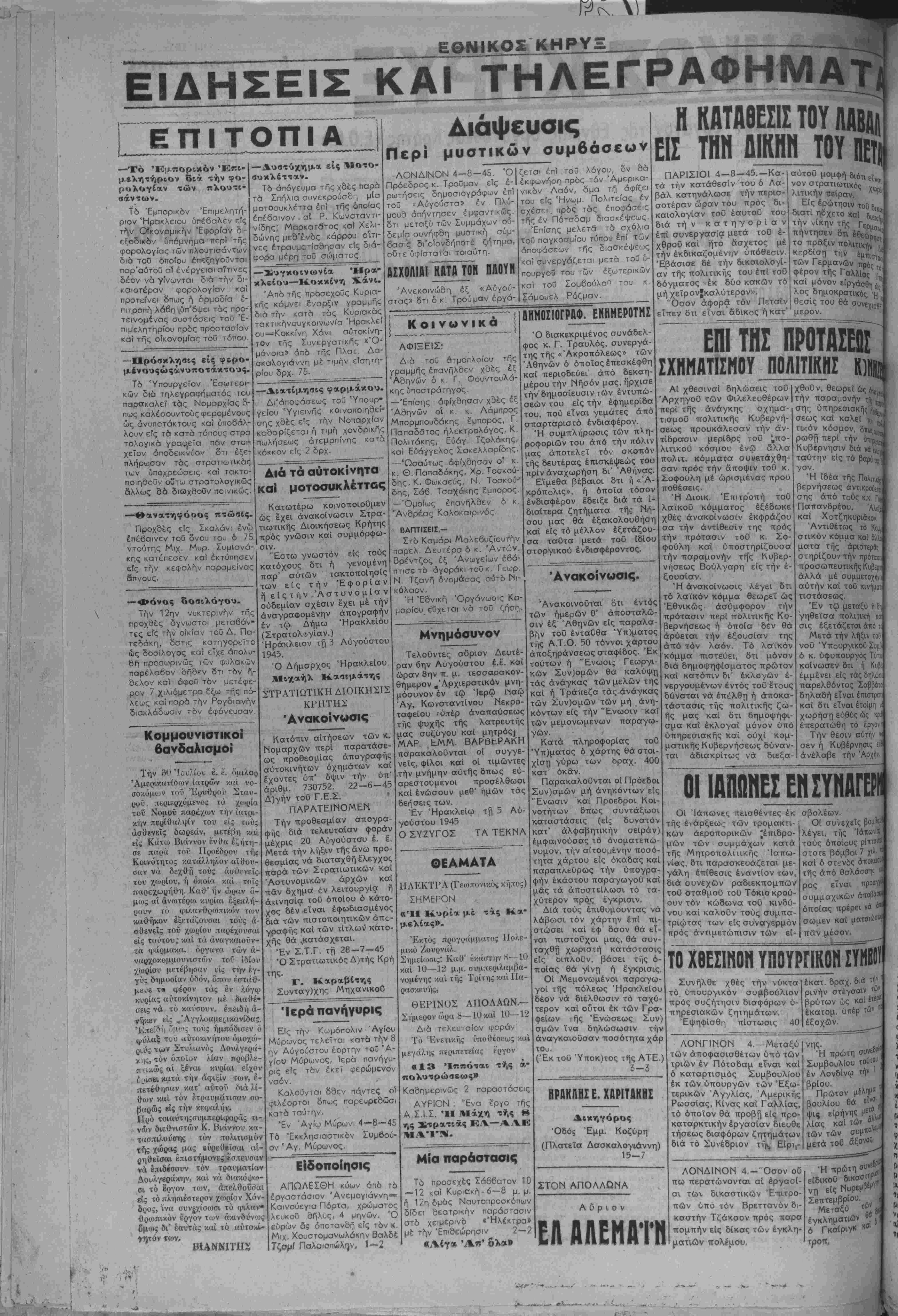 συμμαχικών άποβά«< οποίας πρέρει νά '" σωμεν κσί μστσιώ^ παν μέσον. Μία παράστασις Τ5 προσεχές Σάββατον 10 — 12 καΐ Κυρισκή-ό—8 μ.μ, ή 12η ομάς Ναυτοπροσκόπων δίδει δεατρικήν παράστασιν στδ χειμερινδ «Ήλέκτρα» μέ την Επιθεώρησιν 2—2 ΤΟ ΧΘΕΣΙΝΟΝ ΥΠΟΥΡΓΙΚΟΝ ΣΥ Συνήλθε χθές την νύκτα τό υπουργικόν συμβούλιον πρός συζήτησιν διαφόρων 0- πηρεσιακών ζητημάτων. "Εψηφίσθη πίστωσις 40 έκατ. δραχ. διά την ρινήν στέγααιν ^ Ρρύτων ώς κσί έΐεΡ' έκατομ. υπέρ τδν ' έξοχών. ΗΡΑΚΛΗΣ Ε. ΧΑΡΙΤΑΚΗ! Δικηγόρος Όδός Έμμ. Κοζύρη (Πλατεΐα Δασκαλογιάννη) 15-7 ΣΤΟΝ ΑΠΟΛΛΟΝΑ ΛΟΝΠΝΟΝ 4.-Μβταξύ των άποφασισθέτων υπό των τριών έν Πότσδαμ είναι καί ό καταρτισμός Συμβουλίου έκ των ύπουργών των Εξω¬ τερικών Αγγλίας, Άμερικής Ρωσσίας, Κίνας καί Γαλλίας, τό οποίον θά προβή είς προ- καταρκτικήν εργασίαν διευθε τήσεως διαφόρων ζητημάτων διά τό Συνέδριον τή, ΕΙ ς ιΑ Ή πρώτη σι»ν»η Συμβουλίου έν Λονδίνφ την βρίου. Πρώτον μέλημσ βουλίου θά 'αι ψι« είρήνης λίας καΐ των των των μετά τοθ Αυριον ΕΛ ΑΛΕπΑΊΊΙ ΛΟΝΔΙΝΟΝ 4.—"Οσον ου πω περατώνονται αί εργασί¬ αι των δικαστικών Επιτρο¬ πών υπο τόν Βρεττανόν δι- καστήν Τζακσον πρός παρα πομπήν είς δίκας των έγκλη- ματιών πολέμου, Ή πρώτη είδικοϋ δ νη είς Νυρει πμβρ Μεταξύ έγκληματιών » ό ΓκαίριγΧ «* χρο% Μ 4