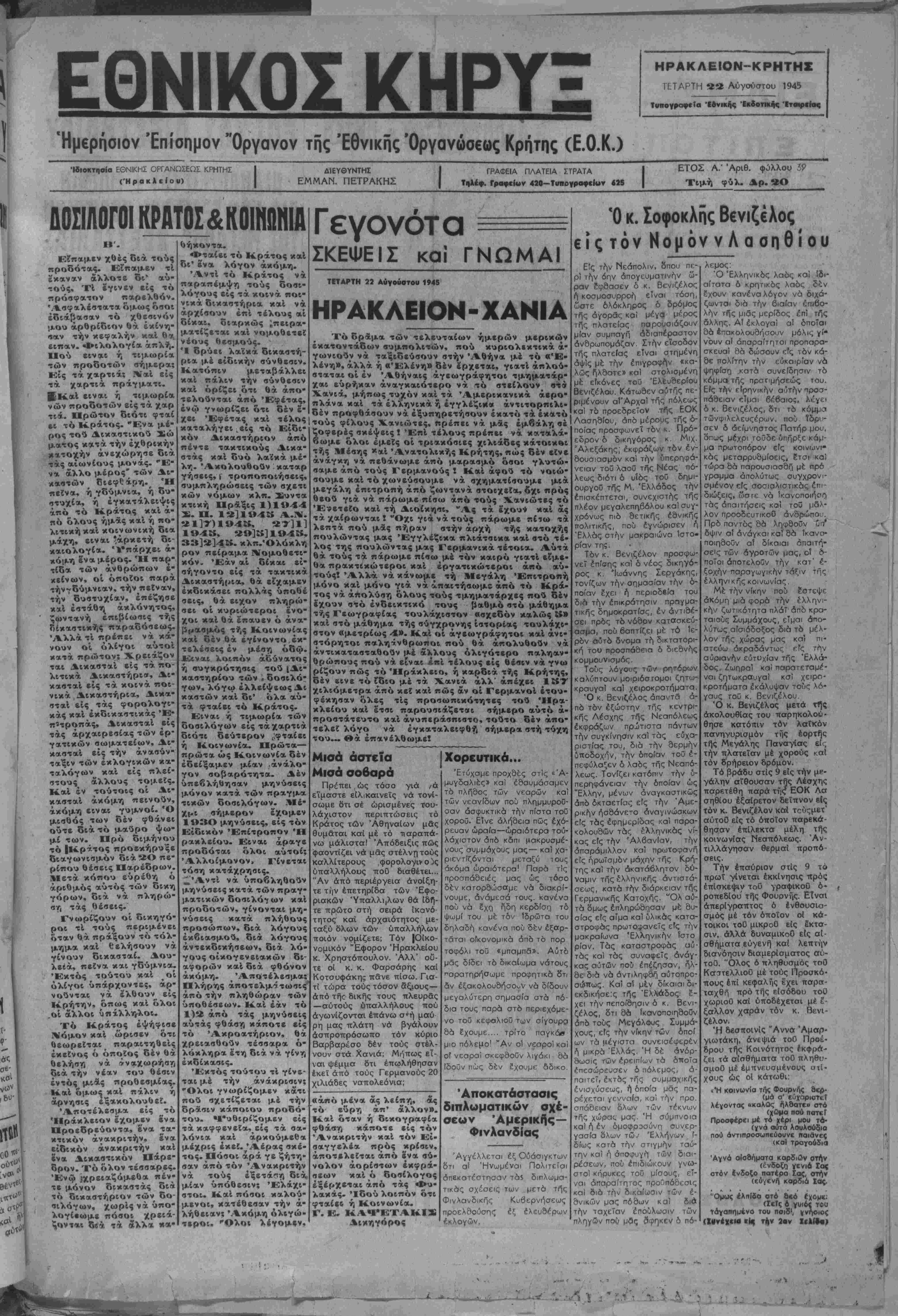 Έμερήσ.ον Επίσημον "Οργανον της Έθνικης Όργανώσεως Κριίτης (Ε.Ο.Κ.)