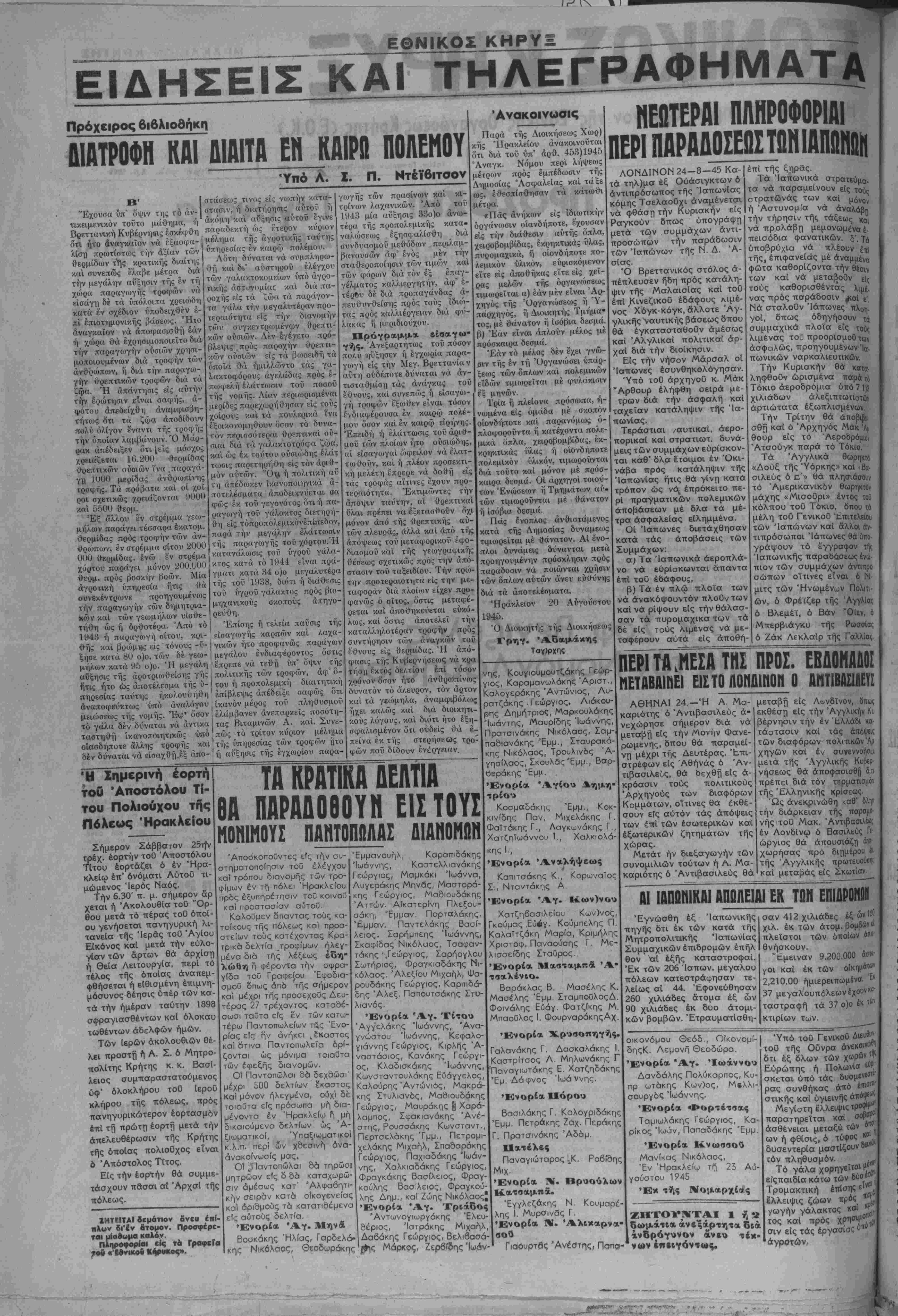 Γιαθυρτ<5ς Άνέστης, Παπα- έπί τής ξηρας Τα Ίαπωνικά στρατεύμα- τα νά παραμείνουν είς τοθς στρατώνας των καί μόνον ή Άστυνομία νά αναλάβη την τήρησιν τής τάξεως Κα νά προλάβη μεμονωμένο έ- πεισόδια φανατικών. §', γ^ ύποβρύχΐα νά τιλέουν εΐι τής, επιφανείας μέ άναμμένσ φώτα καθορίζοντα την θέσιν των καί νά μεταβοθν βΙς τούς καθορισθέντος λιμ*, νας πρός παράδοσιν |ςαΙ ϊ" Νά σταλοθν Ίαπωνες τιλ0^ γοί, δπως όδηγήσουν τα συμμαχικά πλοΐα είς τοθτ λιμένας τού προορισμοθ των ασφαλώς, προηγουμένων Ίο- πωνικών ναρκαλιευτικών. Την Κυριακήν θά κατα- ληφθοθν ωρισμένα παρά το Τόκιο άεροδρόμια υπό 7 1)2 χιλιάδων άλεξιπτοτΐστθν άρτιώτατα έξωπλισμενων Την Τρίτην θά άποβιβο σθή καί ό Άρχηγός Μάκ Ά; θουρ είς το Αεροδρόμιον Άτσούγκ παρά τό Τόκιο. Τα Άγγλικά θωρηκτο «Δούξ τής Υόρκης» καί <Βα σιλεύς ό £'» θά πλησιάσουν τό Αμερικανικόν θωρηκτόν μάχης «Μισοθρι» έντΰς τοθ κόλπου τού Τόκιο, δπου χά μέλη τού ΓενικοΟ '_πιτελείου των Ίαπώνων καί όλλοι άν τιπρόσωποι Ίαπωνες θά υπο- γράψουν τό έγγραφον τ<|ς Ίαπωνικής παραδόσεως ίνα πιον των συμμάχων ώντιπρο σώπων οΐτινες είναι ό Μι μιτς των Ήνωμένων Πολιΐι- ών, ό Φρέίζερ τής Αγγλίας ό Βλεμέί, ό Βάν Όίεν, 6 Μπερβιάγκυ τής Ρωσσίσς ό Ζάκ Λεκλαίρ τής Γαλλίσς ΠΕΡΙΤΑ,ΜΕΣΑ ΤΗΣ ΠΡΟΣ. ΕΒΔΟΜΑΔΟΣ ΗΕΤΑΒΑΙΗΕΙ ΕΙΣΤΟ ΛΟΝΔΙΝΟη Ο ΑΜΤΙΒΑΙΙΙ1ΕΪΙ ΑΘΗΝΑΙ 24.-Ή Α. Μα- καριότης ό Άντιβασιλεύς α¬ νεχώρησε σήμερον διά νά μεταβή είς την Μονην Φανε- ρωμενης, δπου θά παραμεί¬ νη ΗέχΡ1 τ"Ίς Δευτέρας. Έπι- στρέφων είς Αθήνας ό Άν- τιβασιλεΰς, θά δεχθή είς α¬ κρόασιν τούς πολΐτικούς Άρχηγούς των διαφόρων Κομμάτων, οΐτινες θα έκθέ- σουν είς αυτόν τας άπόψεις των επί των έσωτερικών καί εξωτερικών ζητημάτων τής χώρας. Μετάτ ήν διεξαγωγήν των συνομιλιών τούτων ή Α. Μα- καριότης ό Άντιβασιλεύς θά μεταβή είς Λονδίνον, δπως εκθέση είς την Αγγλικήν Κο βέρνηοιν την έν Ελλάδι κσ τάστασιν καί τάς άπόψεις των διαφόρων πολιτικών Άρ χηγών καί έν συνεννοήοα μετά τής Άγγλικής Κυβερ νήσεως θά αποφασισθή δ,ΐι πρέπει διά τόν τερματισμόν τής Έλληνικής κρίσεως. Ώς ανεκοινώθη καθ1 δλην την διάρκειαν τής παρσμο νής τοΰ Μακ. Άντιβασιλέ»; έν Λονδίνω ό Βασιλεύς Γί ώργιος θά άπουσιάζη ά«· χωρήσας πρό διημέρου ίκ τής Άγγλικής πρωτευούοΐ- καί μεταβάς είς Σκωτίσν ΑΙ ΙΑΠΩΗΙΚΑΙ ΑΠΩΛΕΙΑΙ ΕΚ ΤΩΝ ΕΠΙ&ΡΟπΙΊΙ Εγνώσθη έξ Ίαπωνικής πηγής δτι έκ των κατά τής Μητροπολιτικής Ίαπωνίας Συμμαχικών έπιδρομών έπήλ θον αί εξής καταστροφαί. Έκ των 206 Ιαπων, μεγαλου πόλεων κατεστράφησαν τε¬ λείως αί 44. Εφονεύθησαν 260 χιλιάδες άτομα έξ ών 90 χιλιάδες έκ δυο άτομι- κών βομβών. Ετραυματίσθη¬ σαν 412 χιλιάδες έξ ών 1^ χιλ. έκ των άτομ. βομβών« πλεΐστοι των οποίων ά"0 θνήσκουν. "Έμειναν 9.200.000 άο«· γοι καί έκ των οίκημα* 2,210.00 ήμιερειπωμένο. Έκ 37 μεγαλουπόλεωνέ'χουνκα- ταστραφή τα 37 ο)ο έκ ^ κτιρίων των. οικονόμου Θεοδ , Οίκονομί- δηςΚ. Λεμονή Θεοδώρα. Ένορία Αγ. Ιωάννου Δανδάλης Πολύκαρπος, Κυ- πρ ωτάκης Κων)ος, Μελλι- σουργ6ζ Ιωάννης. Ένορία 4>ορτέταας