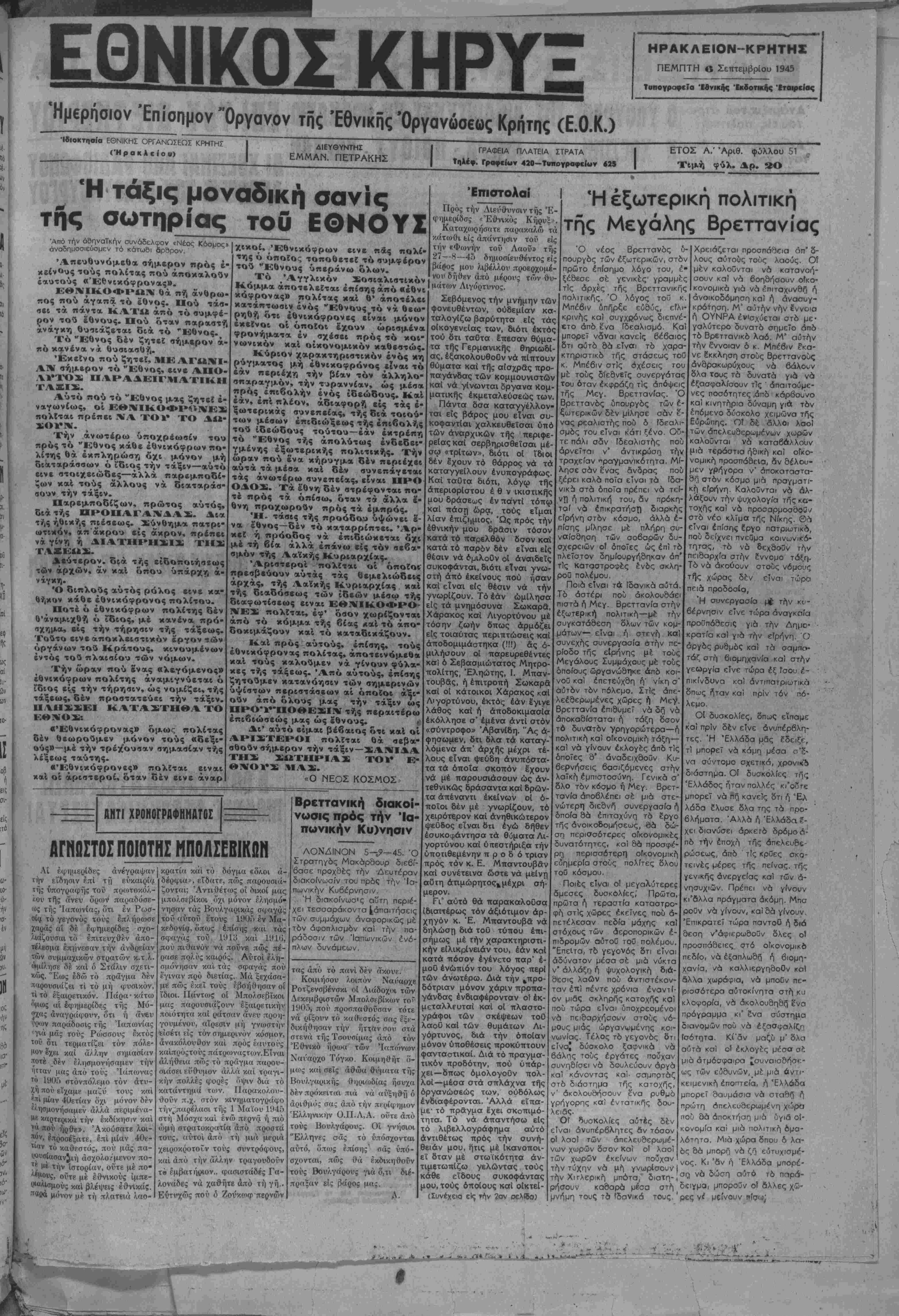 τος τής Κυβερνήσεως καί τής δλης κυβερνητικής προσπ< θείας διά την οικονομ, άνασυγκρότησιν καί την νομισμι τικήν έξυγίανσιν. Τό ύπέρτατον οικονομ, συμφέρον κατά τάς παρούσΓ. στιγμάς, είπεν, επιβάλλει είς την Κυβέρνησιν τό καθηκς νά συνεχίση την δλην κυβερνητ. προσπάθειαν. Διερχόμεθα κρισίμους στιγμάς καί δλοι οφείλομεν ΐφοσιωθώμεν είς την εθνικήν υπόθεσιν. Μολονότι αί δι σκολίαι δέν παρήλθον ευρισκόμεθα είς καλόν δρόμον. "Ε χομεν έφόδια καί τρόφιμα απολύτως έπαρκή. Ούδεμία ( νησυχία δικαιολογεΓται όπωσδήποτε. Αί συμμαχικαί άπ( στολαί συνεχίζονται καί καθημερινώς αύξάνονται. 'Υη τάς προϋποθέσεις αύτάς ή οίκονομική προσπαθεία τής κ.( βερνήσεως θά έξβτκολουθήση επί των βασικών κατευθύι σεων. Ή Κυβέρνησις θά κρατήση σταθεράτό νόμισμα κο πρός τόν σκοπόν αυτόν θά ζητήση την συνδρομήν κο |τάς θυσίας δλων. "Οσον είναι δυνατόν 'ή φορολογία θι αυξηθή. Ή πολιτική τοθ έλέγχου των τιμών θά εΤναι ά παραίτητος καί αποτελεί τό μόνον μέσον ανορθώσεως κο έξυνιάνσεως. Συνεχίζων, είπεν, δτι ή Κυβέρνησις έτοιμάζει τόν 6ρ γανισμόν μιας ειληκρινοΰς συνεργασίας Κράτους, ΒιομΓ χανίας καί έργαζομένου λαοΰ διά την οικονομικήν άνο συγκρότησιν. Έτοιμάζει έπίσης σχέδιον τής πλήρους (. νορθώσεως μέ βάσιν τοος Έλληνικούς πόρους την έργο σίαν καί την συμμαχ. βοήθειαν. Έν τέλει ό κ. Πρωθυπουργός εκάλεσεν δλους τοι "Ελληνας είς την κοινήν προσπάθειαν διά την Έθνικτ άνασυγκρότησιν. κο Έπαναδιορισμοί Ταμειακ. ύπαλλήλων Τδ ί εν Λογιστήριον ένέκρι νέ τδν πίνακα έπανοδιοριζομέ νων ώς άπολυθέντων δυνάμει τής ύπ'άρι·^59 Συντακτικ. πρά¬ ξεως Ταμειακών. Έντός τής εβδομάδος δα έξετασδοΰν οί φάκε,'λλοι των διορισδέντων καΐ προαχδέντων |έπΐ 4ης Αύ- γούστου μεδ'δ δα έπακολουδή σουν αί ένστάσεις καΐ πρόαγω γα) των ύποβιδασδέντων. Συντάξεις είς φυμα- τικ. στρατιωτικούς Κατά, πληροφορίας έξ 'Αδη νών βάσει τοΰ νόμου οί δπλϊ- ται καΐ ναΰται παδόντες έν είρηνιΚΓΪ περιόδω έκ φυματιώ¬ σεως |δικαιοΰνται αυξήσεως συντάξεως έξομοιούμενοι πρός αναπήρους. Ή αύξησις γίνε- ται άναδρομικώς άπό 12)12)43 Πρόσκλησις Καλοΰμεν άπαντες τούς έκ των κατοίκων τής πόλεως Ηρακλείου καί προαστείων ύποστάντας υλικάς ζημίας συνεπεία των έπιχειρήσεων καί βομβαρδισμών είς τάς άκινήτους ίδιοκτησίας των δπως προσήλθωσι είς την γεννησομένην κατά την προ σεχή Κυριακήν 9ην Σεπτεμ- βρίοη 1945 καί ώραν 9 30 π μ. συγκέντρωσιν είς τα γραφεϊα τοΰ έπαγγελματο- βιοτεχνικοΰ ^Έπιμελλητηρί- ου προκειμένου νά ένωθώ- μεν είς σύλλογον. Θέματα: "Εγκρισις κατα- στατικοθ. Εγγραφαί καί πληροφο¬ ρίαι παρά τώ δικηγόρφ Μη- νδ Χ. Παπαδάκη έναντι γρα φεΐων ΕΟΚ. (Ή Διοικοΰαα 'Επιτροπή) _____________1—2 ΘΕΑΜΑΤΑ ΑΠΟΛΑΩΝ.-Ζήμερον ένα άρι- στούργημα μέ δυνατη ύπόσεσι καΐ γεματο μέ άγωνιωδες οκηνές «τό ΠΛΟΙΟ ΦΑΝΤΑΣΜΑ» δγνιοοτες σε λΐδες άπό τόν λήξαντα πόλεμον. ΗΛΙΚΤΡΑ (Γεαηονκος κήπος). Σήμερον τό άριστούργη «Η ΘΥ>
