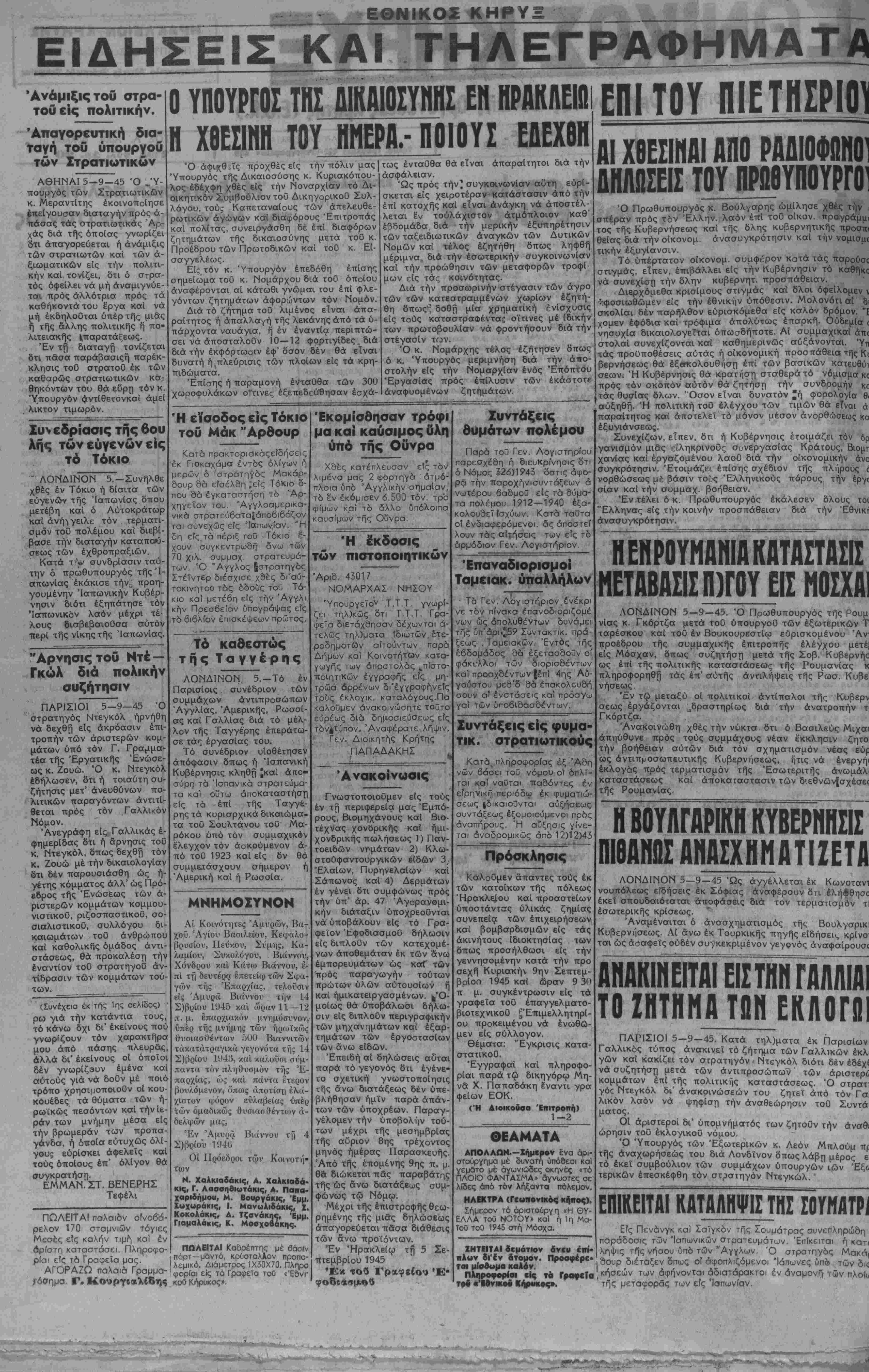 ΠΑΡΙΣΙΟΙ 5-9-45. Κατά τηλ)ματα έκ Παρισίων