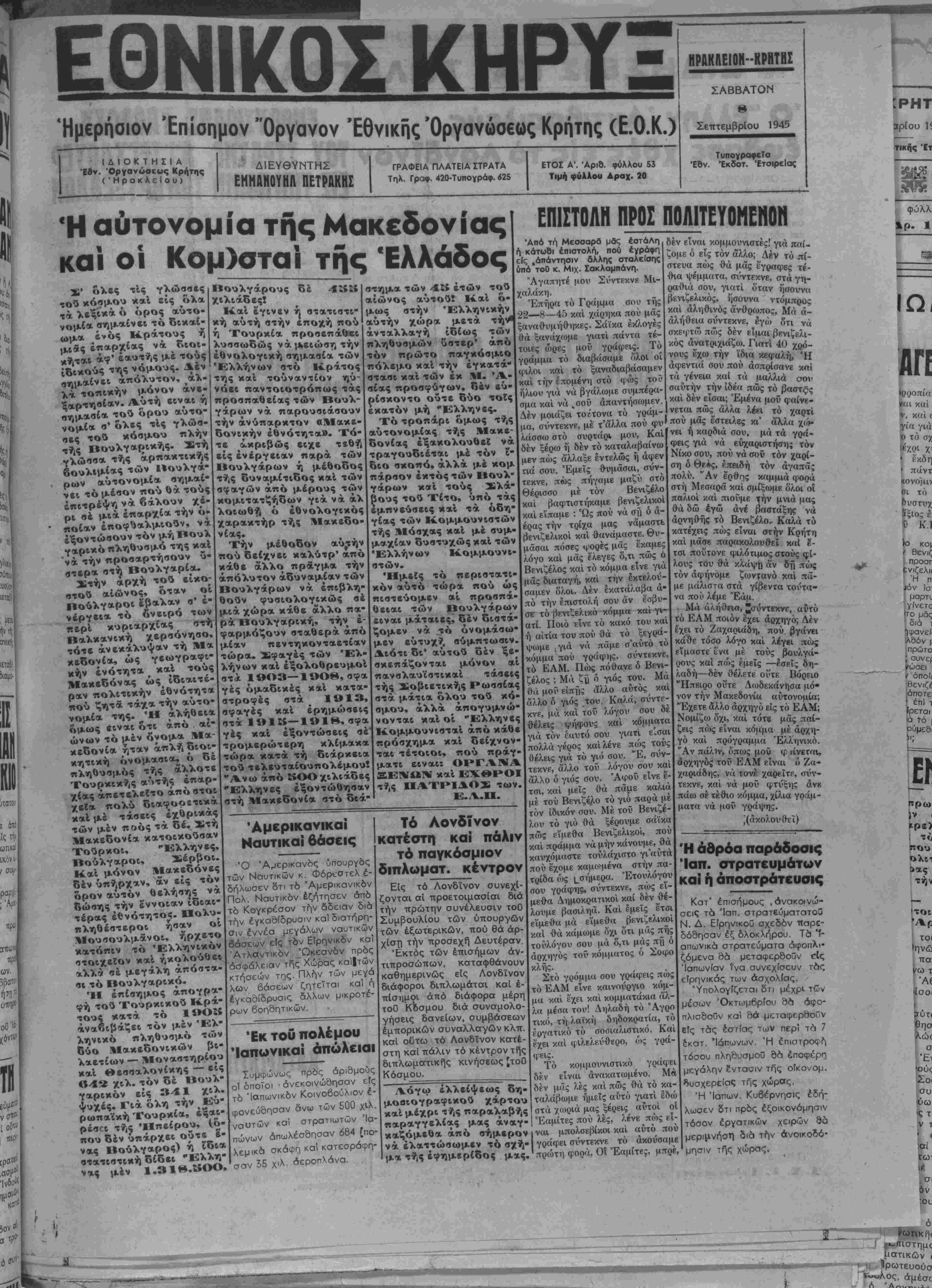 Ήμερηοιον Επίσημον "Οργανον Έθνικης Όργανύσεος Κρήτης (Ε.Ο.Κ.)