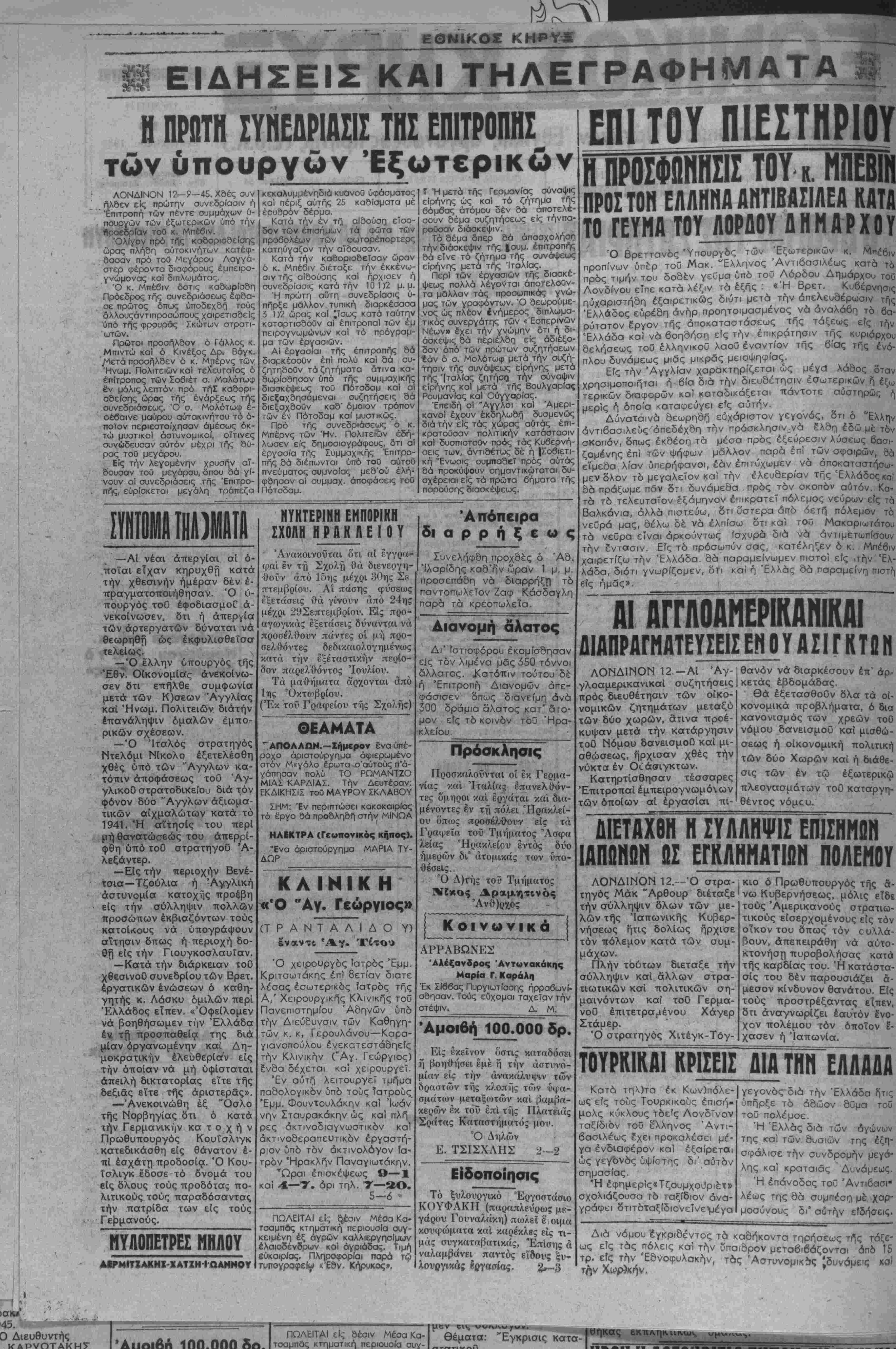 διαρρήξεω< Συνελήφδη προχδές ό Άδ Ίλαρίδης καδ'ήν ώραν 1 μ. μ προσεπάδη νά δΐαρρήξη τδ παντοπωλεϊον Ζαφ Κάσδαγλη παρα τα κρεοπωλεΐα. Διανομή άλατος ΔΓ ίστιοφόρου έκομίσδησαν ε]ς τδν λιμένα μδς 350 τόννοι αλλατος. Κατόπιν τούτου δέ ή Έπιτροπή Διανομων απε¬ φάσισεν όπως διανείμη άνά 300 δράμια άλατος κατ'άτο¬ μον είς τδ κοινόν τοϋ Ηρα¬ κλείου. Πρόσκλησις ΙΙροσκαλοΰνται οί έκ Γερμα¬ νίας καί Ίταλία§ επανελθόν¬ τες όμηοοι καί εργάται κα'ι δια- μένοντες έν τή πόλει Ηρακλεί¬ ου όπως προσέλθουν είς τα Γραψρΐα τοϋ Τμήματος Άσφα λείας Ηρακλείου έντός δύο ημερών δι' ατομικάς των υπο- θέσεις. Ό Δ)τής τοθ Τμήματος Νϊκος Δραμητινός Άνθ)ρχος ΛΟΝΔΙΝΟΝ 12-Αί Άγ- γλοαμερικανικαΐ συζητήσεις πρός διευθέτησιν των οίκο- νομικών ζητημάτων μεταξύ των δύο χωρών, άτινα προέ- κυψαν μετά την κατάργησιν τοΰ Νόμου δανεισμοθ καΐ μι- σθώσεως, ήρχισαν χθές την νύκτα έν Οίάσιγκτων. Κατήρτισθησαν τέσσαρες 'Επιτροπαί έμπειρογνωμόνων των οποίων αί εργασίαι πι- Κοινωνικά ΑΡΡΑΒΩΝΚΣ Άλέ<ξανδρος Αντωνακάκης Μαρία Γ Καράλη Έκ ΣΙ66ας Πυργιωτίσσης ηρραβωνί¬ σθησαν. Τούς εΰχομαι ταχείαν την στέψιν. δ. Μ. 'Αμοιβή 100.000 δρ. Εί; εκείνον ^ όστις καταδόσει [ίοηθήσει εμέ ή την αστυνο¬ μίαν είς την ανακάλυψιν των δραστών τής κλοπής των υφα- σμάτων μεταξοοτων καί βαμβα¬ κερών ?κ τοϋ επί τής Ιΐλατηιίς Σράτας Καταστήμ«τός μοί». Ό Δηλών Ε. ΤΣΙΣΧΛΗΣ 1—2 Εΐδοποίησις Τό ξυλουργιχό Έργοστάσιο ΚΟΥΦΑΚΗ (παραπλεύρως μΚ- γάρου Γουναλάκη) πωλεΐ έ' οιμα κουφώματα καί καρβκλβς είς τι¬ μάς συγκαταβατικάς, Έπίσης ά ναλαμβάνει παντός εϊδονς Ηυ- λουργιχάς Ιργασίας. 2—-ίϊ Η ΠΡΟΣΦΩΜΜΣΙΣ ΤΟΥ κ ΜΠΕΒΙΜ ΠΡΟΣ ΤΟΠ ΕΛΛΗΝΑ ΑΝΤΙΒΑΣΙΛΕΑ ΚΑΤΑ ΤΟ ΓΕΥΜΑ ΤΟΥ ΛΟΡΰΟΥ ΛΗΜΑΡΧΟΥ Ό Βρεττανδς Ύπουργδς των Εξωτερικών κ. Μπέβιν προπίνων υπέρ τού Μακ. "Ελληνος 'Αντιβασιλέως κατά τό πρός τιμήν τού δοδέν γεϋμα ύπδ τοΰ Λόρδθυ Δημάρχου τού Λονδίνου εΤπε κατά λέξιν τα εξής · «Ή Βρετ. Κυβέρνησις ηυχαριστήθη έξαιρετικώς διότι μετά την άπελευδέρωσιν τής Ελλάδος ευρέδη άνήρ προητοιμασμένος νά αναλάβη τδ βα¬ ρύτατον £ργον της άποκαταστάσεως της τάξεως είς την Έλλάδα καί νά βοηθήση είς την επικράτησιν της κυριάρχου δεήσεως τού έλληνικοΰ λαοϋ εναντίον τής βίας τής ένο. πλου δυνάμεως μιάς μικράς μειοψηφίας. Είς την Αγγλίαν χαρακτηρίζεται ώς μέγα" λάδος δταν χρησιμοποιήται ή δία διά την διευδέτησιν έσωτερικών ή έξω τερικών δ-ταφορών κα) καταδικάξεται πάντοτε αυστηρώς ή μερίς ή όποία καταφεύγει είς αύτην. Δύναταινά δεωρηδή ευχάριστον γεγονός, δτι 6 "Ελλην άντιβασιλευς άπεδέχδη τήιν πρόσκλησιν νά ελδη έδώ μέ τόν σκοπόν, όπως έκδέοη τα μέσα πρός εξεύρεσιν λύσεως βασι- ζομένης επί των ψήφων μάλλον παρά επί των σφαιρών, 8ά εΐμεδα λίαν ύπερήφανοι, εάν επιτύχωμεν νά άποκαταστήσω- μεν όλον τδ μεγαλείον καΐ την έλευδερίαν τής Ελλάδος καί 8ά πράξωμε πάν δτι δυνάμεδα πρός τδν σκοπόν αυτόν. Κα¬ τά τδ τελευταίον εξάμηνον έπικρατεΐ πόλεμος νεύρων είς τα Βαλκάνια, όλλά πιστεύω, δτι υστερα άπδ 6ετή πόλεμον τα νεΰρά μας, δέλω δέ νά έλπίσω δτι καί τθΰ Μακαριώτατου τα νεΰρα είναι αρκούντως ίσχυρά διά νά άντιμετωπίσουν την έντασιν. Είς τδ πρόσωτύν σας, κατέληξεν ό κ. Μπέβιν χαιρετίζω την Έλλάδα. 86 παραμένωμεν πιστοί είς ,τήν Έλ¬ λάδα, διότι γνωρίζομεν, δτι καί ή Ελλάς δα παραμείνη πιστη είς ημάς». ΑΙ ΑΓΓΛΟΑΗΕΡΙΚΑΝΙΚΑΙ ΔΙΑΠΡΑΓΜΑΤΕΥΣΕΙΣΕΝΟΥΑΣΙΓΚΤαΗ θανόν νά διαρκέσοϋν έπ' αρ¬ κετάς έβδομάδας. Θά έξετασθοϋν δλα τα οί- κονομικά προβλήματα, ό δια κανονισμός των χρεών τοϋ νόμου 