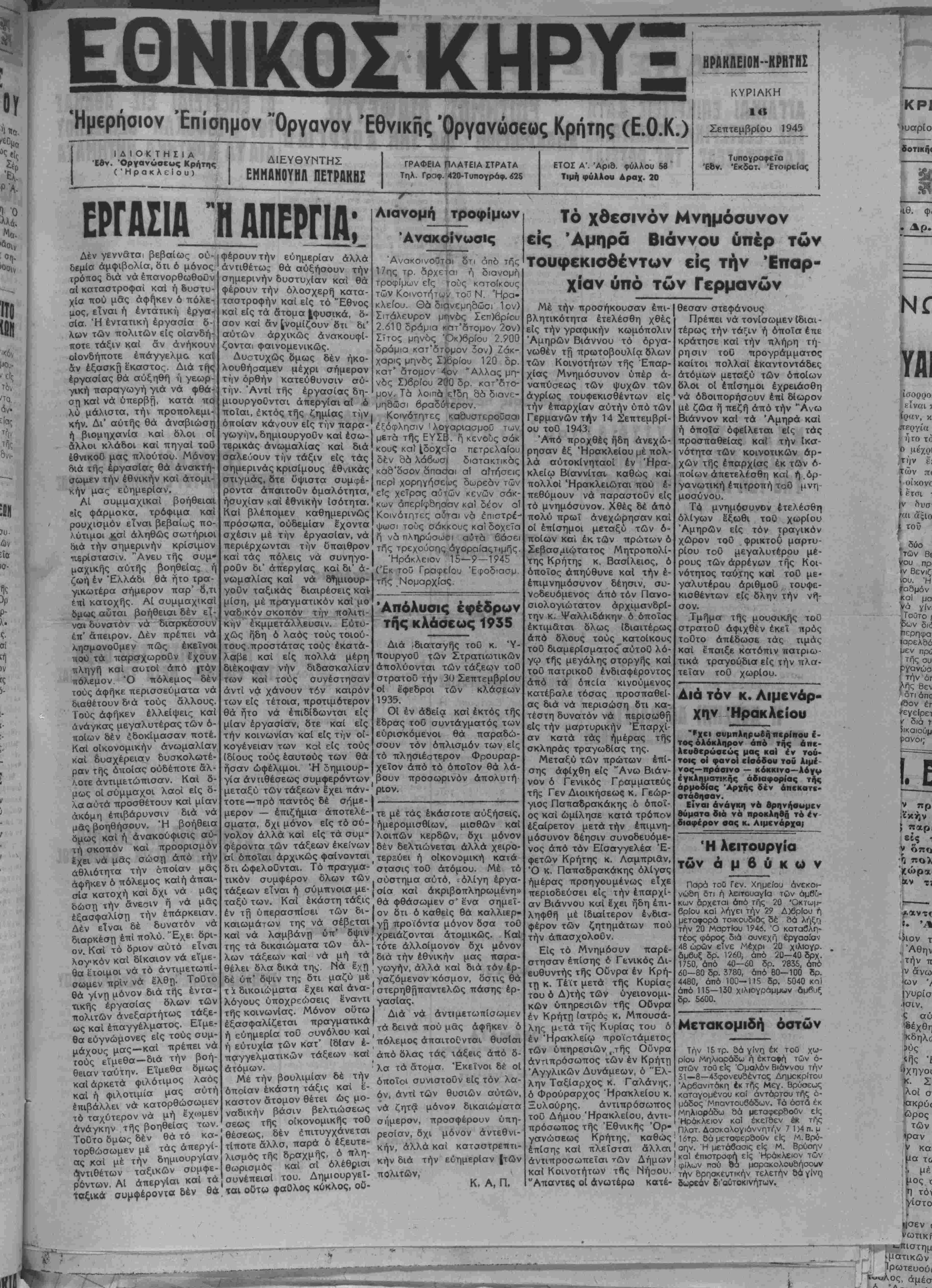 Ήμερήσιον Επίσημον Όργανον Έθνικής "Οργανώσεως Κρήτης (Ε.Ο.Κ.)