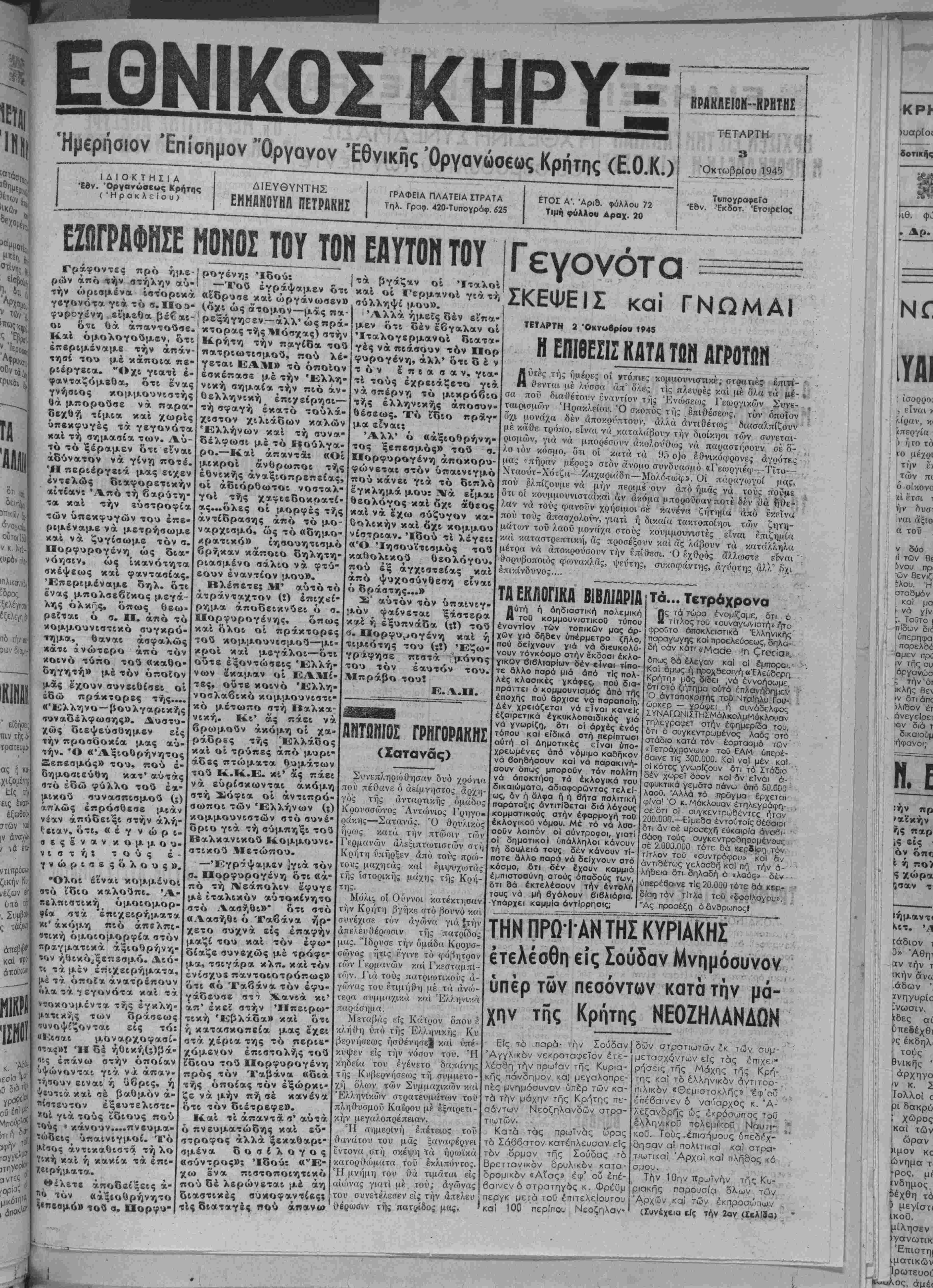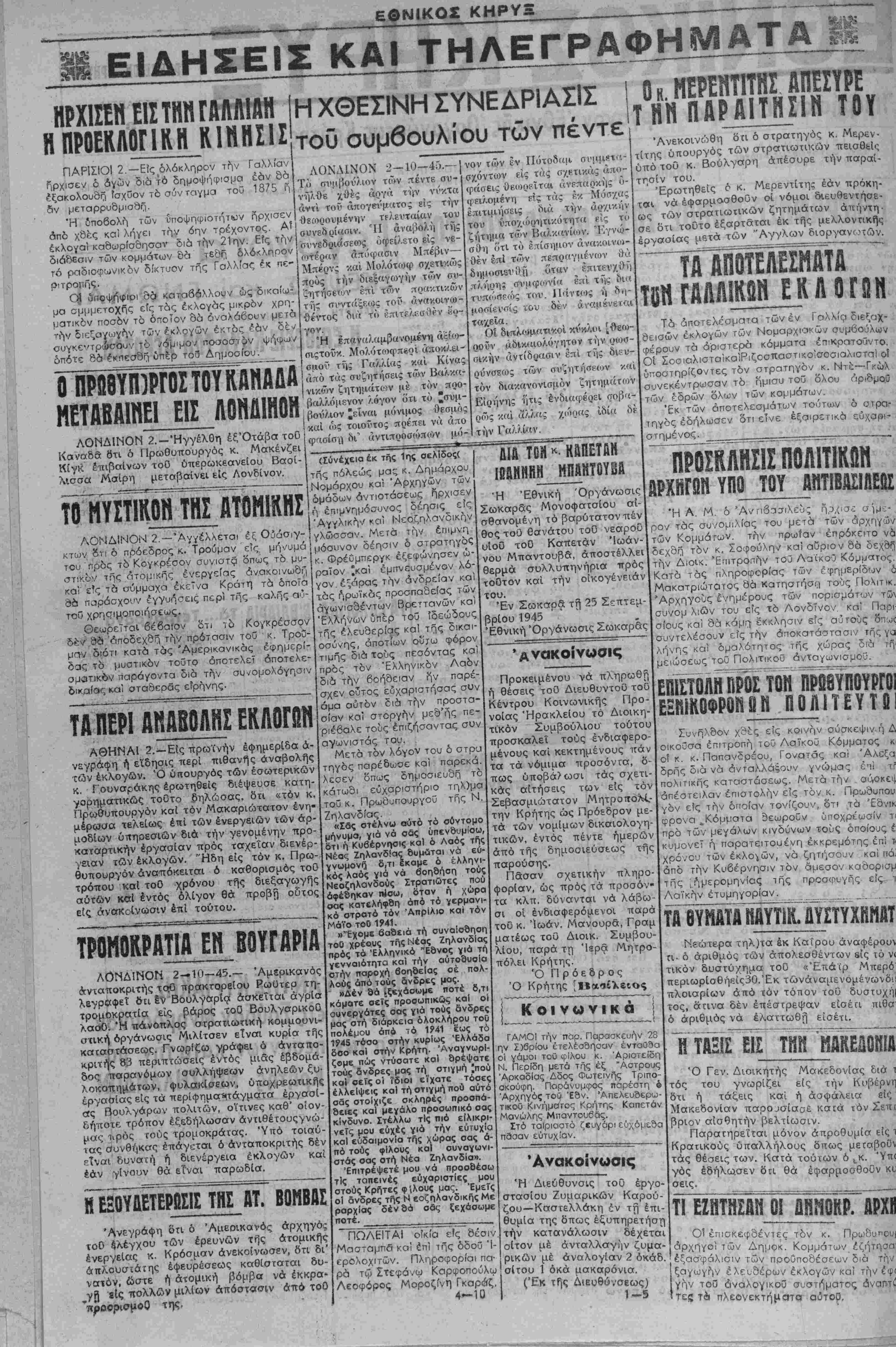 <Ιύνέχεια έκ τής 1ης σελΐδος( τής πόλεώς μας κ. Δημάρχου Νομάρχου καΐ 'Αρχηγών των δμάδων όντιοτάσεως ήρχισεν ή έπιμνημόσυνος δέησις είς Αγγλικήν καΐ Νεοζηλανδικήν γλώσσαν. Μετά την έπιμνη μόσυνον δέησιν δ στρατηγός κ. Φρέυμπεργκ εξεφώνησεν ώ- ραΤον "και έμπνευσμένον1 λό¬ γον Ι^άρας την άνδρείαν και τάς ηρωϊκάς προσπαθείας των αγωνισθέντων Βρεττανών καί |Έλλήνων όπερ τοΰ ΐδεώδους τής ελευθερίας κα! τής δικαι- άποτίων οΰχω ·'-Α^^^ σ^τηΛν παράγοντα δ,ά την συ/ δικαίας καΐ σταδερδς ειρηνης· πρός τόν "Ελληνικόν δια την βοήδειαν ^ν ΰαρ φόρον καΐ Λαό παρέ ΤΑΠΕΜΑΝΑΒΟΑΗΣΕΚΑΟΠ1Η ΑΘΗΝΑΙ 2.—Είς πρωϊνήν εφημερίδα α¬ νεγράφη ή είδησις περί πιθανής άναβολής των έκλογών. Ό ύπουργός των έσωτερικών κ. Γουναράκης ερωτηθείς διέψευσε κατη- γορηματικώζ τοθτο ί&ηλώσας, δτι «τόν κ. Προθυπουργον καί τόν Μακαριώτατον ένη- ' — τελείως επί των ένεργειών των άρ- ύτιηρεσιών διά την γενομένην προ- ..κήν εργασίαν πρός ταχείαν δ των έκλογών. "Ηδη είς τόν κ. ΔΙΑ ΤΟΗ κ Κ1ΠΕΤΑΝ ΙΜΝΝΗΝ ΜΠΑΗΤ0ΥΟ& δια την βοήδειαν ^ σχεν ούτος εΰχαριστήσας συν όμα αυτόν διά την προστα¬ σίαν και στοργήν μεδ'ής πε- ριέβαλε τοϋς έπιζήσαντας συν αγωνιστάς τού. Μά ό λό Ή Έθνική "Οργάνωσις Σωκαράς Μονοφατσίου αί- σθανομένη τό βαρύτατον πέν θος τού Οανάτου τοΟ νεαροΰ υίοθ τοϋ Καπετάν Ιωάν¬ νου Μπαντουβά, άποστέλλει θερμά συλλυπηνήρια ττρός τοθτον καί την οικογένειαν τού. Έν Σωκαρδ τή 25 Σεπτεμ- βρίου 1945 Έθνική "Οργάνωσις Σωκαρθς Ανακοίνωσις Προκειμένου νά τΐληρωθή ή θέσεις τοΟ ΔιευθυντοΟ τοϋ Κέντρου Κοινωνικής Προ- τηθεΚ ό κ. Μερεντίτης εάν πρόκη- φαρμοσθοθν οΓνδμοι βκυβεντήσβ- Σατιωτικών ζητημάτων άπ,,ντη- ΤΑ ΑΠΟΤΕΛΕΣΜΑΤΑ" Τ8Ν ΓΑΛΛ1Κ9Ν_ΕΚ ΛΟΓΩΝ Τα άποΐελέσμστα των έν Γολλίςι διεξαχ- θεισών έκλογών των Νομαρχιακόν συμβουλιον φέρουν τα όριστερά κόμματα έπ,κρπτο.ντο ΟΙΣοσ.αλ.σταΙκαΙΡ.ζοσπαστ.κο.σοσιαλ.στπ.οΙ υποστηρίζοντες τόν στρατηγόν κ. Ντ,-Γ,ωλ συνεκέντρωσαν τ ό ήμισυ τού ολοιο ηρέμου των εδρών δλων των κομμάτων Έκ των άποτελεσμάτων τούτων ο στρα- τηγός εδήλωσεν δτι είνε έξαιρε,ικό εύχαρι- στημένος. __ ______————---------------- ΠΡΟΪΚΛΗΣΪΙΠΟΛΙΤΙΚΟΪΙ ΑΡΧΒΤΩΝ ΥΠΟ ΤΟΥ ^«ΤΙΒΑΕΙΒΕΟΙ Ή Α Μ δ Άνπδτυιλεο; Γρχυ:σίμ-- πον τάς συνομιλίας τού με-ά των άρχηγών των Κομμάτων, την πρωίαν έπρόκε.το νά δεχθή τόν κ. Σοφούλη·/ κα! αυριον δα δεχθή την Διοικ. Επιτροπήν τού Λαΐκο" Κόμμστος. Κατά τάς πληροφορίας των ί-ρημερίδων δ Μακατριώτατος θά κατηστήση τούς ΓκΛιτικ. Άρχηγοος ένημέρους των πορισματων τω συνομ λ.ών τού εις τό Λονδίνον κα! Παρι σίους κα! θά κάμη έκκλησιν είς αυτους οτλ>< συντελέσουν είς την αποκατάστασιν της να λή%ης κα! ομαλότητος τής χώρας διά τη μειώσεως τού Πολιτικού άνταγωνισμοά. ωνιστάς τού. Μετά τόν λόγον τού ό στρυ τηγός παρέδωσε καΐ παρεκά. λεσεν δπως δημοσιευθή τό κάτωδι εύχαριστήριο τηλ)μα τού κ. Πρωθυπουργόν τής Ν. Ζηλανδίας. Ιδς στέλνω βύτό τό σύντομο γαν των έκλογώ η είς τόν κ. ρ θυπουργόν άναπόκειται ό κοθορισμός τού τρόπου καίτοθ χρόνου τής διεξαγωΥής αυτών κβΐ έντός ολίγον θά προβή ούτος είς ανακοίνωσιν επί τούτου.__________^ ΛΟΝΔΙΝΟΝ 2-10-45.- Άμερικανός λνταποκριτής χφ πρακτορβίου Ρώυτερ τη- λεγρνφεΐ 6ιι 6* Βουλγαρία άσκβιται αγρία τρομόκρατΐα είς βάρος τοΟ ΒοολγσρικοΟ λαοθ. Ή πάνοπλος στρατιωηκή κομμουνι- στική οργάνωσις Μιλίτσεν είναι κυρία της καίαοτασεως. Γνωρίζω γράφει ό άντσπο- κραΐ|ς83 περιπτώσει έντός μιας εβδομά¬ δος ίαρανόμων 'συλλήψεων άνηλεών ξυ· Λοκοΐτημάτων, φυλακίση ύποχρεωτικής /ονασίας είς τα περίφημ