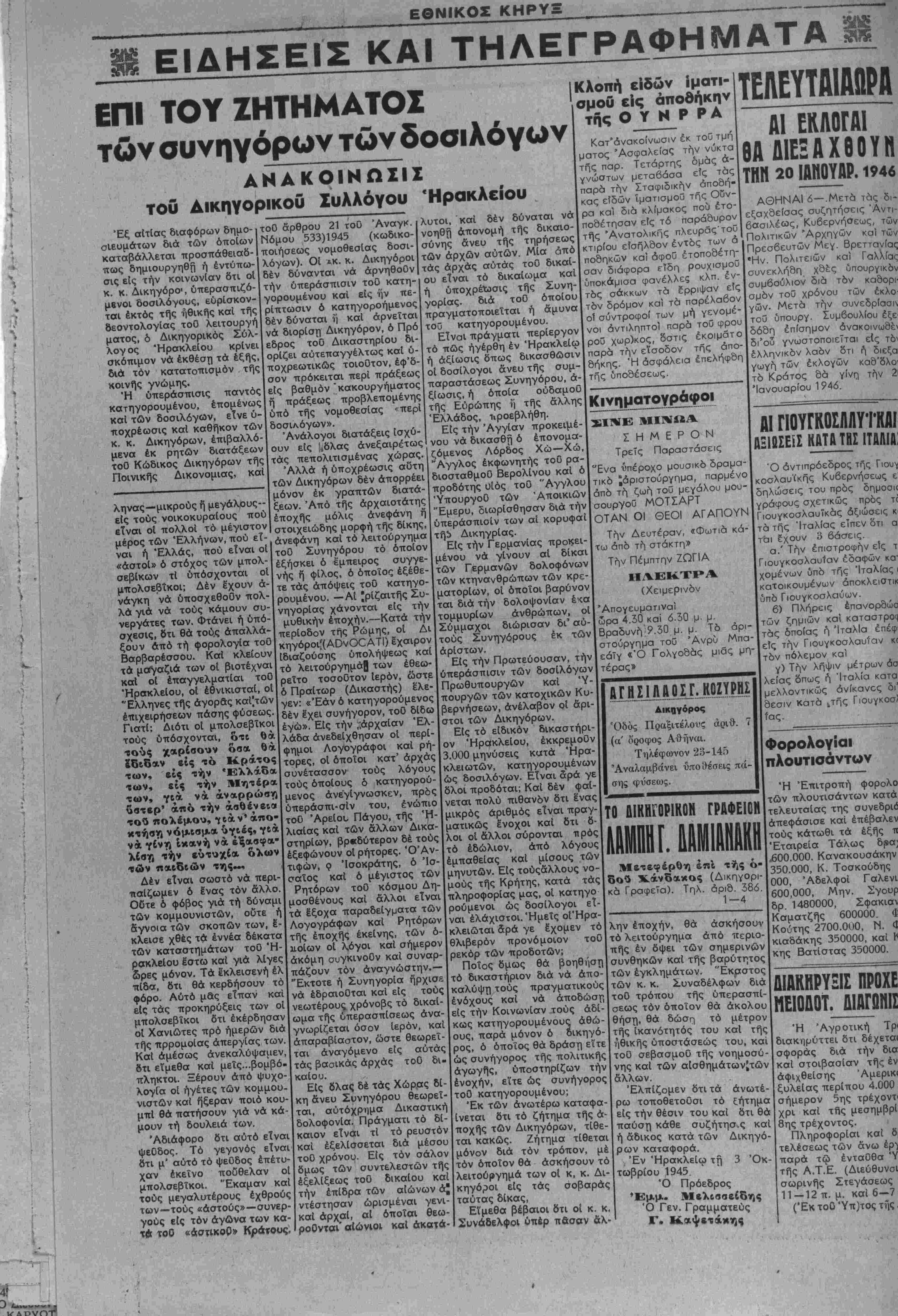 υπό τής νομοθεσίας <περί δοσΐλόγων». Άνάλογοι διατάξεις ίσχύ- ουν είς ί^δλας άνεξαιρέτως τάς πεπολιτισμένας χώρας. Άλλά ή ύποχρέωσις αυτή των Δικηγόρων δέν άπορρέει μόνον έκ γραπτών διατά¬ ξεων. Άπό τής άρχαιοτάτης έποχής μόλις ανεφάνη ή στοιχειώδης μορφή τής δΐκης, ανεφάνη καί τό λειτούργημα τοϋ Συνηγόρου τό Οποίον έξήσκει ό εμπειρος συγγε- νής ή φΐλος, ό οποίος εξέθε¬ τε τάς άπόψεις τοθ κατηγο¬ ρουμένου. —ΑΙ ίρίζαιτής Συ- νηγορΐας χάνονται είς την μυθικήν εποχήν.—Κατά την περίοδον τής Ρώμης, οί Δι κηγόροι^ΑΟνΟΟΑΤΙ) εχαιρον ίδιαζούσης υπολήψεως καί τό λειτούργημά| των εθεω¬ ρείτο τοσούτον Ιερόν, ώστε ό Πραίτωρ (Δικαστής) έλε¬ γεν: «Εάν ό κατηγορούμενος δέν Μχει συνήγορον, τοθ δίδω έγώ». Είς την -αρχαίαν Έλ- λάδα άνεδεΐχθησαν οί περί- φημοι Λογογράφοι καί ρή¬ τορες, οί όποΐοι κατ' αρχάς συνέτασσον τούς λόγους τούς όποίους ό κατηγορού¬ μενος άνε'γίγνωσκεν, πρός ύπεράσπι-σΐν τού, ένώπιο τοθ Άρείου Πάγου, τής 'Η- λιαίας καί των αλλων Δικα- στηρίων, βραδύτερον δέ τούς έξεφώνουν οί ρήτορες. ΌΑν- τιφών, 9 Ίσοκράτης, ό Ίσ- σαΐος καί ό μέγιστος των Ρητόρων τοϋ κόσμου Δη- μοσθένους καί άλλοι είναι τα Ιξοχα παραδείγματα των Λογογράφων καί Ρητόρων τής έποχής έκείνης, των ο¬ ποίων οί λ,όγοι καί σήμερον άκόμη συγκινοθν καί συναρ- πάζουν τόν άναγνώστην.— Έκτοτε ή Συνηγορΐα ήρχισε νά έδραιοθται καί είς τούς νεωτέρους χρόνοβς τό δικαί- ωμα τής ύπερασπίαεως άνα- γνωρΐζεται όσον Ιερόν, καί απαραβίαστον, ώστε θεωρεΐ- ται άναγόμενο είς αύτάς τάς βασικάς αρχάς τοθ δι. καί ο υ. Είς δλας δέ τάς Χώρας δί- κη άνευ Συνηγόρου θεωρεΐ- ται, αύτόχρημα Δικαστική δολοφονία. Πράγματι τό δί¬ καιον είναι τί τό ρευστόν καί έξελίσσεται διά μέσου τοθ χρόνου. Είς τόν σαλον δμως των συντελεστών τής εξελίξεως τοθ δικαίου καί την έπΐδρα των αίώνων ά][ λυτοι, καί δέν δύναται νά νοηθή άπονομή τής δικαιο¬ σύνην άνευ τής τηρήσεως των άρχών αυτών. Μία άπό ΙΚλοπή ε.δών Ίματι- ομού είς αποθήκην της Ο Υ Ν Ρ Ρ Α Κατ'άνακοίνωσιν έκ τού τμή ματος Ασφαλείας την νύκτα τής παρ. Τετάρτης δμάς ά- γνώστων μεταβάσα είς τάς παρά την Σταφιδικήν αποθή¬ κας είδών ίματισμοΰ τής Οΰν- ρα καί διά κλίμακος πού ετο¬ ποθέτησαν είς τό παράθυρον τής 'Ανατολικής πλευράς'τοθ κτιρίου εισήλθον έντός των ά τάς αρχάς αύτάς τοθ δικαί- ου είναι τό δικαΐωμα καί ή ύποχρέτοσις τής Συνη- γορίας. διά τοϋ όποίου πραγματοποιεΐται ή άμυνα τού κατηγορουμένου. Είναι πράγματι περίεργον τό πώς ηγέρθη έν Ηρακλείω ή άξΐωσις όπως δικασθώσιν οί δοσίλογοι άνευ τής συμ- παραστάσεως Συνηγόρου, ά- ξΐωσις, ή όποία ούδαμοΰ τής Εύρώπης ι] τής άλλης Ελλάδος, ΐιροεβλήθη. Είς την Άγγίαν προκειμέ- ντέστησαν καί αρχαί, ωρισμέναι αί οποίαι γενι- θεω- ροθνται' αΐώνιοι καί άκατά- νου νά δικασθή ό ζόμενος Λόρδος έπονομα- Χώ—Χώ, "Αγγλος έκφωνητής τοϋ ρα- διοσταθμοϋ Βερολίνου καί ό προδότης υιός τοϋ "Αγγλου ΎπουργοΟ των 'Αποικιών "Εμερυ, διωρίσθησαν διά την υπεράσπισιν των αί κορυφοί τή5 Δικηγρίας. Είς την Γερμανίας προκει- μένου νά γίνουν αί δίκαι των Γερμανών δολοφόνων των κτηνανθρώπων των κρε- ματορίων, οί όποΐοι βαρύνον ται διά την τομμυρίων Σύμμαχοι δολοψονίαν άνθρώπων, οί διώρισαν δι' αύ- Είς τό είδικόν όν Ηρακλείου, τούς Συνηγόρους έκ των άρίστων. Είς την Πρωτεύουσαν, την υπεράσπισιν των δοσίλόγων Πρωθυπουργών καί 'Υ- πουργών των κατοχικών Κυ βερνήσεων, ανέλαβον οί άρι- στοι των Δικηγόρων. ~ δικαστήρι- έκκρεμοθν 3.000 μηνύσεις κατά Ηρα¬ κλειωτών, κατηγορουμένων ώς δ