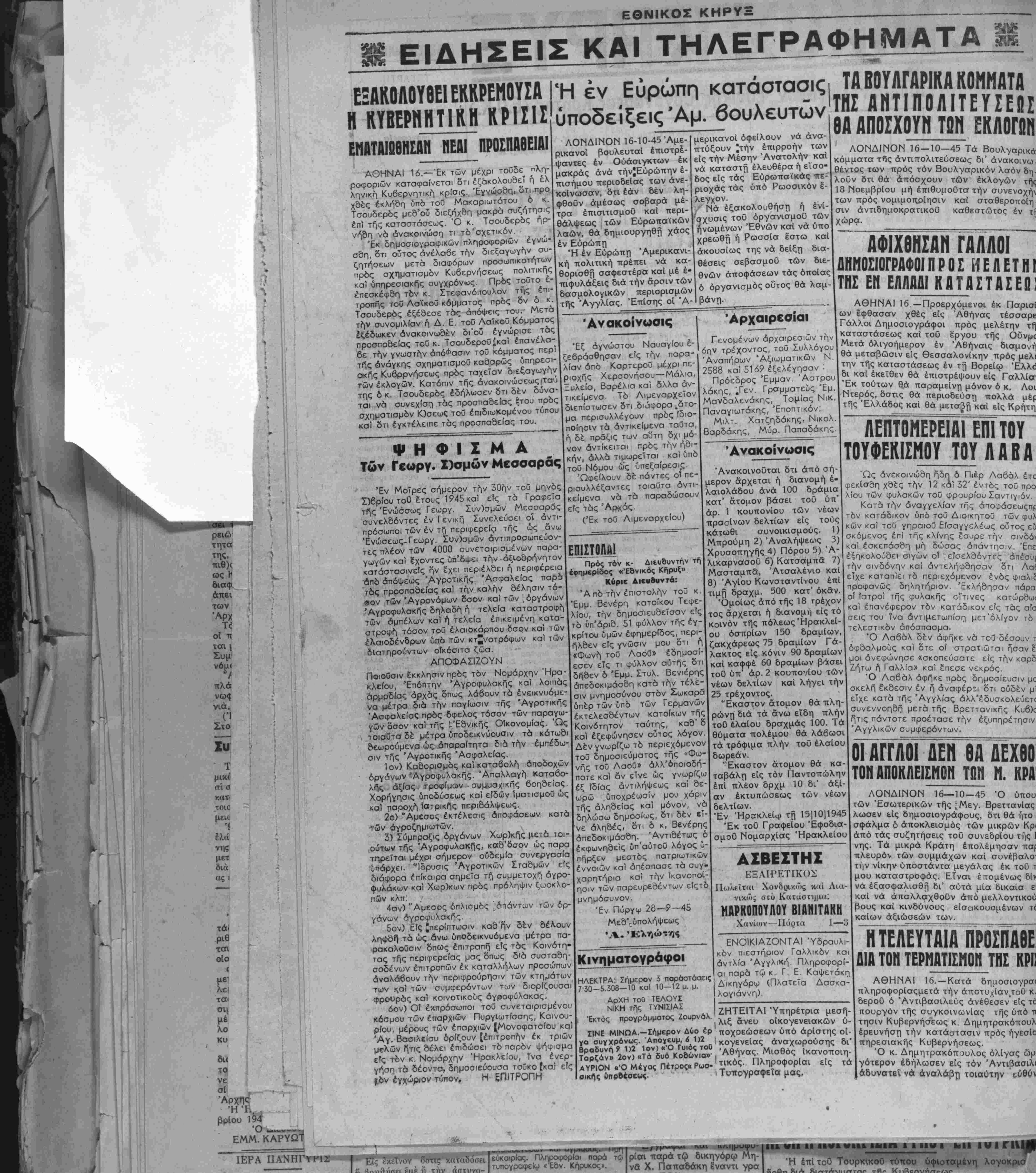ΙΙωλεΐται Χονδρικώς καϊ Λι<ί- νικώ, στυ Καταστΐ)μαΙ ΜΑΡΚΟΠΟΥΛΟΥ ΒΙΑΝΙΤΑΚΗ Χανίιον Πόρτα 1—;3 ΕΝΟΙΚΙΑΖΟΝΤΑΙ Ύδραυλι- όν πιεστήριον Γαλλικόν και άντλία "Αγγλικη Πληροφορί¬ αι παρά τώ κ. Γ. Ε Καψετάκη Δικηγόρω (Πλατεϊα Δασκα¬ λογιάννη) γήση τα δέοντα, δημοσιεύουσα τοΰκο Ικα) είς 0ν έγχώρίθν τύπον, Η ΕΠΙΤΡΟΠΗ ΣΙΝΕ ΜΙΝΩΑ.—Σήμερον Δύο έρ γα συγχρόνως. Άπογευμ, 6 1)2 Βραδύνη 9 1)2 1ον)«Ό Γυιός τοθ Ταρζάν» 2ον) «Τά δυό ΚοΒώνια»· ΑΥΡΙΟΝ «Ό Μέγας Πέτρος* Ρωο- οικής ύπρδεσεως. ΖΗΤΕΙΤΑΙ Ύπηρέτρια μεσή- λιξ άνευ οίκογενειακών ΰ- ποχοεώσεων υπό αρίστης ο[- κογενείας άναχωρούσης δι' Αθήνας. Μισθός Ικανοποιη¬ τικάς. Πληροφορίαι είς τα μας. ΤΑ ΒΟΥΛΓΑΡΊΑ ΚΟΜΜΑΤΑ ΤΗΣ ΑΝΤΙΠΟΛΙΤΕΥΣΕΩΣ 8Α ΑΠΟΣΧΟΥΗ ΤΩΝ ΕΚΛΟΓΩΝ ΛΟΝΔΙΝΟΝ 16-10-45 Τα Βουλγαρικά κόμματα τ^ΐς αντιπολιτεύσεως δι' άνακοινω θέντος των πρός τόν Βουλγαρικόν λαόν δή- λοθν δτι θά άπόσχουν των έκλογών τής 18 Νοεμβριού μή έπιθυμοΰτα την συνενοχή των πρός νομιμοτζρίησιν καί σταθεροποίη σιν άντιδημοκρατικοϋ καθεστώτος έν τί χώρα. ΑΦΙΧΘΗΣΑΝ ΓΑΛΛΟΙ ΟΗΜΟΣΙΟΓΡΛΦΟΙΠΡΟΣ ΗΕΑΕΤΗϊ ΤΗΣ ΕΗ ΕΛΛΛΛΙ ΚΑΤΑΣΤΑΣΕη: ΑΘΗΝΑΙ 16 —Προερχόμενοι έκ Παρισ! ών έφθασαν χθές είς Αθήνας τέσσαρε Γάλλοι Δημοσιογράφοι πρός μελέτην τή καταστάσεως καΐ τού έ'ργου τής Οϋνμ< Μετά ολιγοήμερον έν Αθήναις διαμονή θά μεταβώσιν είς Θεσσαλονίκην πρός μελι την τής καταστάσεως έν τή Βορείω Έλλ<ί δι καΐ εκείθεν θά έπιστρέψουν είς Γαλλία Έκ τούτων θά παραμείνη μόνον ό κ. Λοι Ντερός, δστις θά περιοδεύση πολλά μέρ τής Ελλάδος καί θά μεταβή 'καΐ είς Κρήτη λεπτϊμερεϊαΓεπιτοΤ τουφεκ1σμου τουλαβα Ώς ανεκοινώθη ήδη δ Πιέρ Λαβάλ έτ^ φεκΐσθη χθές την 12 καΐ 32' έντός τού προ λίου των φυλακών τού φρουρίου Σαντιγιόν Κατά την άναγγελίαν τής άποφάσεωςπι: τόν κατάδικον υπό τοΰ Διοικητοΰ των φυλ κων καί τού γηραιοΰ Είσαγγελέως ούτος εΰ σκόμενος επί τής κλίνης εσιιρ; την σινδό και έσκεπάσδη μή δώσας απάντησιν. Έπε εξηκολουθεί σιγών οί είσελθόντες άπέσυ) την σινδόνην καϊ άντελήφθησαν δτι Λα( εΤχε καταπίει τό περιεχόμενον ενός φιαλιί προφανώς δηλητήριον Εκλήθησαν πάρα οί ίατροΐ τής φυλακής οΐτινες κατώρΒωι καΐ έπανέφερον τόν κατάδικον είς τάς αίσ σεις τού ϊνα αντιμετωπίση μετ "ολίγον τό τελεστικόν άπόσπασμα. Ό Λαβάλ δέν αφήκε νά τού δέσουν τ οφθαλμούς καΐ ότε οί στρατιώται ήσαν ε μοί ανεφώνησε «σκοπεύσατε είς την καρδ Ζήτω ή Γαλλία» καΐ επεσε νεκρός. Ό Λαβάλ αφήκε πρός δημοσίευσιν μο σκελή έκθεσιν έν ή άναφέρ;! δτι ουδέν μΐ εΤχε κατά τής Αγγλίας άλλ'έδυσκολεύετ< συνεννοήθη μετά τής Βρεττανικής Κυβ^ ήτις πάντοτε προέτασε την εξυπηρέτησιν Αγγλικών συμφερόντων. ΟΪΑΓΓΐΐΐΕΐΓβΐΔΕΧβΟ ΤΟΙΪ ΑΠΟΚΛΕΙΣΜΟΗ ΤΟΝ Μ. ΚΡΑ ΛΟΝΔΙΝΟΝ 16—10—45 Ό ύπου των Έσωτερικών τής -Μεγ. Βρεττανίας λωσεν είς δημοσιογράφους, δτι Θά ήτο σφάλμα δ άποκλεισμός των μικρών Κρι άπό τάς συζητήσεις τού συνεδρίου τής Ι νης. Τα μικρά Κράτη επολέμησαν πα( πλευρόν των συμμάχων καί συνέβαλο· την νίκην ύποστάντα μεγάλας έκ τοθ λ μου καταστροφάς. Είναι έΐτομένως δΐν να εξασφαλισθή δι' αύτά μία δικαία εί καΐ νά άπαλλαχθοΰν άπό μελλοντικού βους καί κινδύνους είσακουομένων χί καίων άξιώσεών των. __ ΪΤΕΛΕΥΤΜΙθΣΠΑβΕ ΔΙΑ ΤΟΝ ΤΕΡΜΑΤΙΣΜΟΝ ΤΗΣ ΚΡΙ! ΑΘΗΝΑΙ 16. —Κατά δημοσιογρα< πληροφορίαςμετά την άποτυχίανφτοϋ κ. δεροϋ ό Άντιβασιλεϋς ανέθεσεν είς τέ πουργόν τής συγκοινωνίας τής υπό τι τησιν Κυβερνήσεως κ. Δημητρακόπουλ έρευνήση την κατάστασιν πρός ήγεσίο πηρεσιακής Κυβερνήσεως. Ό κ. Δημητρακόπουλος ολίγας ώμ γότερον εδήλωσεν είς τόν Άντιβσσι