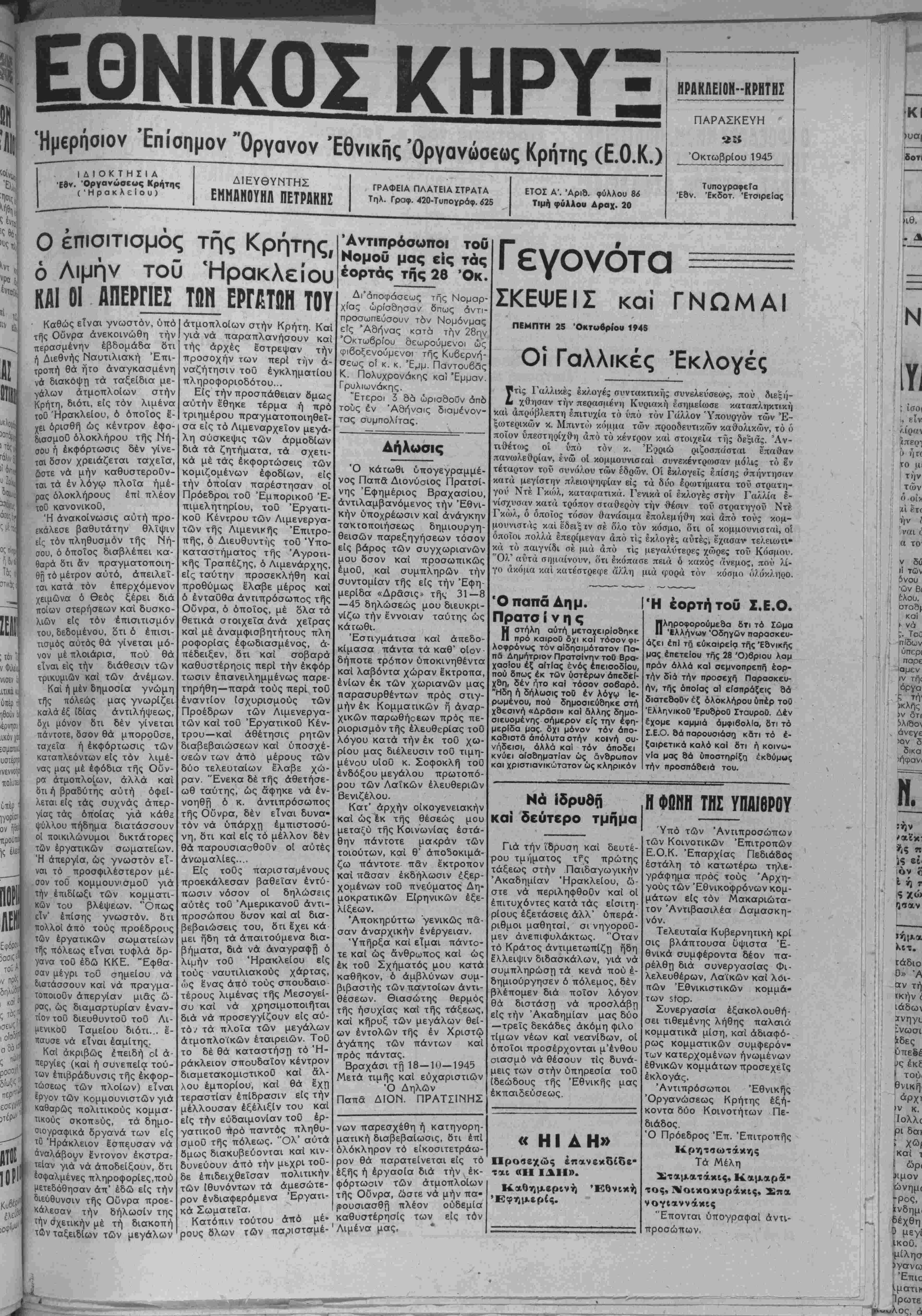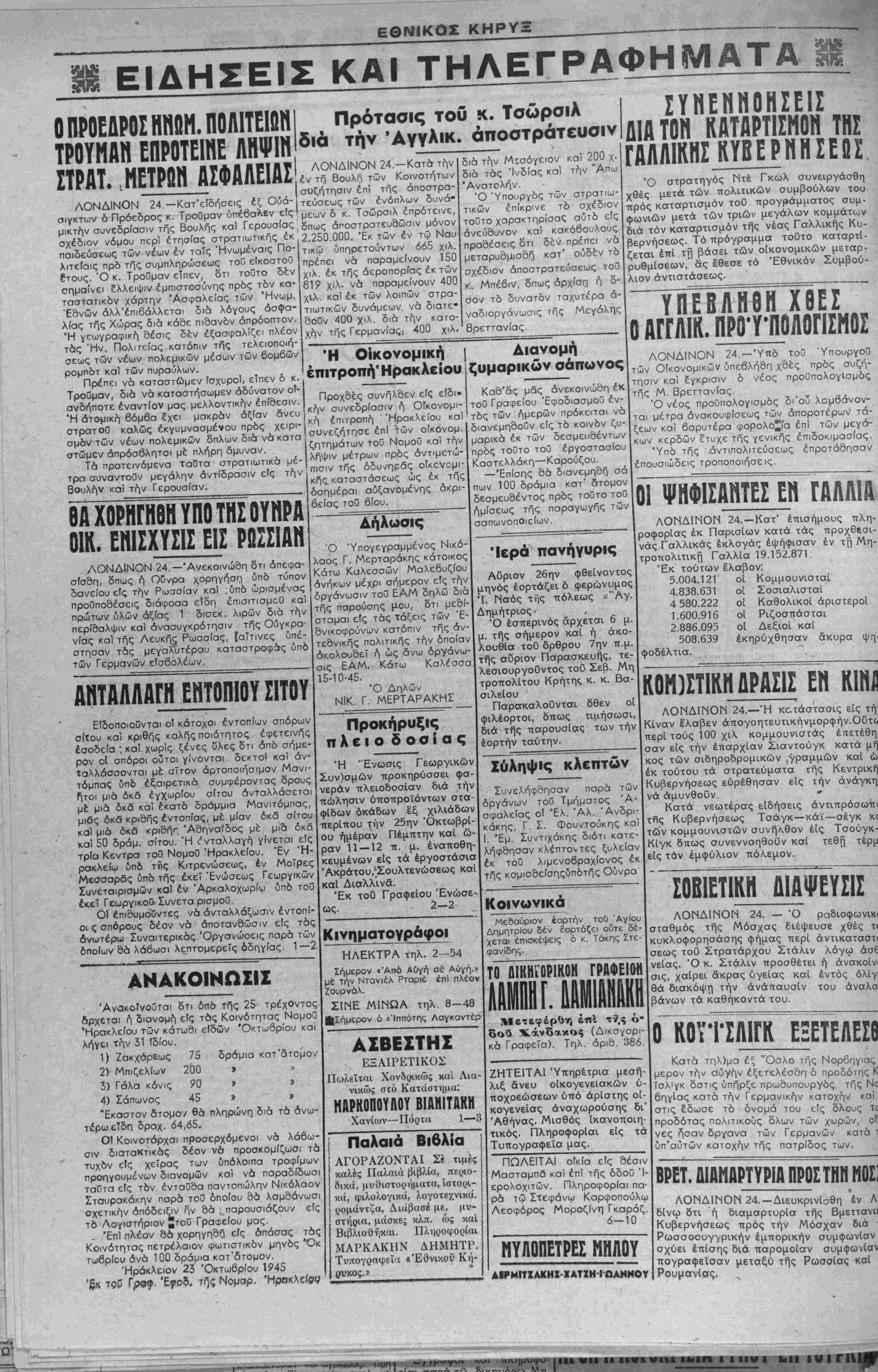 <ων κερδών ετυχε τής γενικής έπιδοκιμασίας. "Υπό τής αντιπολιτεύσεως έπροτάθησαν έπουσιώδεις τροποποιήσεις. Ίερά πανήγυρις Αυριον 26ην ψθείνοντος μηνός έορτάζει ό φερώνυμος Μ. Ναός τής πόλεως «'Άγ Δημήτριος* Ό έσπερινός άρχεται 6 μ μ. τής σήμερον καί ή άκο- λουθΐα τοϋ δρθρου 7ην π.μ τής αυριον Παρασκευής, τε- λεσιουργοθντος τοΰ Σεβ. Μη τροπολΐτου Κρήτης κ. κ. Βα- σιλεΐου Παρακαλοθνται δθεν ο φιλέορτοι, δπως τιμήσωσι διά τής παρουσίσς των την εορτήν ταύτην. Σύληψΐς κλεπτών Συνελήφθησαν παρά των δργάνων τοΰ Τμήματος "Α¬ σφαλείας ο? Έλ. Άλ. 'Ανδρι κάκης, Γ. Σ. Φουντούκης κα Ι. Έμ. Συντιχάκης διότι κατε λήφθησαν κλέπτοντες ξυλεία' έκ τού λιμενοβραχίονος έκ τής κομισδείσηςυπότής Ούνρα Κοινωνικά Μεθαύριον εορτήν τοθ 'Αγίου ΔημητρΙου δέν έορτάζει οΰτε δέ- χεται έπισκέψεις ό κ. Τάκης Στε φανίδης. ΤΟ ΠΙΚΗΪΟΡΙΚΟΝ ΓΡΑΦΕΙΟΝ ΑΑΙΗΓ.&11ΑΚΗ Μετεφέρθη επί τΫ,ς ό δού Χάνδακος (Δικσγορι κά Γραφεΐα). Τηλ. αριθ. ;586 ΖΗΤΕΙΤΑΙ Ύπηρέτρια μεσή λιξ άνευ οίκογενειακών ύ ποχοεώσεων υπό αρίστης οί κογενείας άναχωρούσης δι Αθήνας. Μισθός Ικανοποιη τικός. Πληροφορίαι είς τα Τυπογραψεΐα μας. ΠΩΛΕΪΤΑΙ οίκία είς θέσι Μασταμπά καΐ επί τής όδοϋ Ί ερολοχιτών. Πληροφορίαι πα¬ ρά τω Στεφάνω Καρφοπούλω Λεοφόρος Μοροζίνη Γκαράζ 6-10 ΜΥΑΟΠΕΤΡΕΣ ΜΗΠΟΥ ▲ΙΡΜΙΤΖΑΚΗΖ-ΧΑΤΖΗ ΙΟΑΝΝΟΥ 01 ΨΗΦΙΣΑΝΤΕΣ ΕΝ ΓΑΛΛΙΑ ΛΟΝΔΙΝΟΝ 24.—Κατ' έπισήμους πλη¬ ροφορίας έκ Παρισίων κατά τάς προχθεσι¬ νάς Γαλλικάς εκλογάς εψήφισαν έν τή Μη- τροπολιτική Γαλλία 19.152.871. Έκ τούτων έλαβον: 5.004.121 οί Κομμουνισταί 4.838.631 οί Σοσιαλισταί 4 580.222 οί Καθολικοί άριστεροϊ 1.600.916 οί Ριζοσπάσται 2.886.095 οί Δεξιοΐ καί 508.639 εκηρύχθησαν άκυρα ψη· φοδέλτια. ΚΟΜ3ΣΤΙΚΗ ΔΡΑΣΙΣ ΕΝ ΚΙΗί ΛΟΝΔΙΝΟΝ 24.—Ή κοτάστασις είς τή· Κίναν έλαβεν άπογοητευτικήνμορφήν.Οΰτο περΐ τούς 100 χι κομμουνιστάς επετέθη σαν είς την επαρχίαν Σιαντούγκ κατά μή κος των σιδηροδρομικών ,γραμμών καί ώ έκ τούτου τα στρατεύματα τής Κεντρική Κυβερνήσεως ευρέθησαν είς την άνάγκη νά άμυνθοθν. * Κατά νεωτέρας είδήσεις άντιπρόσωπ» τίΐς Κυβερνήσεως Τσάγκ—κάϊ—σέγκ κ( των κομμουνιστών συνήλθον είς Τσούγκ- Κΐγκ δπως συνεννοηθοθν καΐ τεθή τέρμ είς τόν εμφύλιον πόλεμον. ΣΟΒΙΕΤΐΚΗ ΛΟΝΔΙΝΟΝ 24. — Ό ραδιοφωνικι σταθμός τής Μόσχας διέψευσε χθές τι κυκλοφορησάσης φήμας περί άντικαταστι σεως τοθ Στρατάρχου Στάλιν λόγω άσ£ νεΐας. Ό κ. Στάλιν προσθέτει ή άνακοίνι σις, χαίρει άκρας ΰγείας καί έντός όλίγ θά διακόψη την ανάπαυσίν τού άναλα βάνων τα καθήκοντά τού. Ο ΚΟΥΪΣΛΙΓΚ ΕΞΕΤΕΛΕΣ8 Κατά τηλ)μα έζ "Οσλο τής Νορδηγιας μερον την α"ϋγήν έξετελέσδη ό προδότης Κ ϊσλΐγκ όστις υπήρξε πρωθυπουργός τής Νο 6ηγΙας κατά την Γερμανικήν κατοχήν καΐ στις ϋδωσε τό όνομά τού είς δλους τί προδότας πολιτικους δλων των χωρών, οί νες ?σαν δργανα των Γερμανών κατά ι υπ'αυτων κατοχήν τής πατρίδος των. ΒΡΕΤ. ίΙΑΜΑΡΤΥΡΙΑ ΠΡΟΣ ΤΗΝ ΜΟΙ] ΛΟΝΔΙΝΟΝ 24.-ΔιευκρινΙσθη *έν Λ δΐνω δτι ή διαμαρτυρία τής Βμεττανιι Κυβερνήσεως πρός την Μόσχαν διά Ρωρσοουγγρικήν εμπορικήν συμφωνίαν σχύει έπίσης διά παρομοίαν συμφωνίαν πογραψεϊσαν μεταξύ τής Ρωσσίας καΐ Ρουμανίας,
