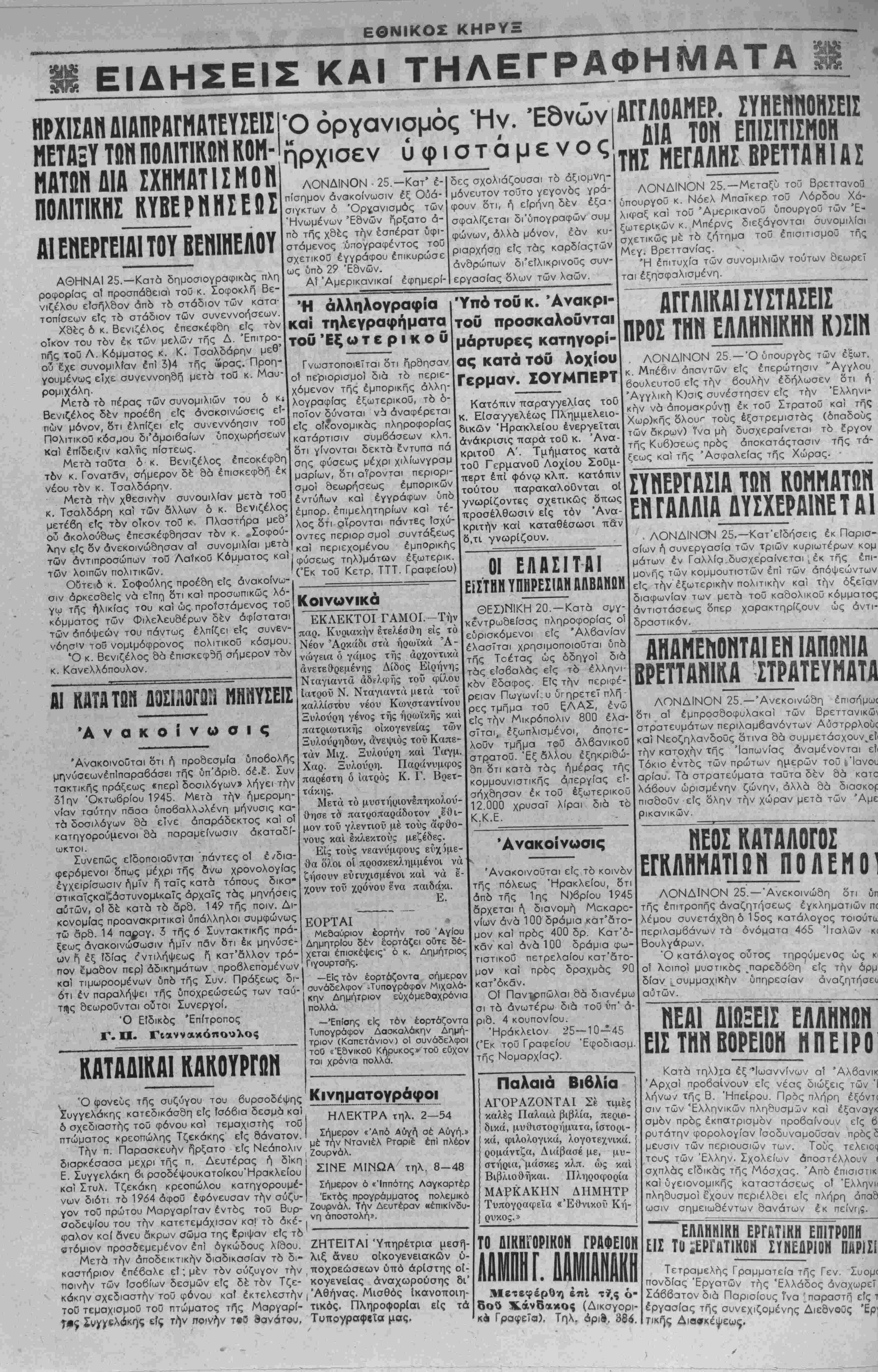 Χωρ)κής δλου<- τοΰς έξστρεμιστάς (δπαδοϋς των ακρων) ίνα μή δυσχεραίνεται τδ ?ργον τής Κυ6)σεως πρός άποκατάςτασιν τής τά¬ ξεως και τής Ασφαλείας τής Χώρας· ΣΥΝΕΡΓΑΣ1Α ΤΩΝ ΚΟΜΜΑΤΩΝ ΕΝ ΓΑΛΛΙΑ ΔΥΣΧΕΡΑΙΝΕΤΑΙ , ΛΟΝΔΙΝΟΝ 25.—Κατ'εϊδήσεις έκ Παρισ- σίων ή συνεργασια των τριών κυριωτέρων κομ μάτων έν Γαλλία δυσχεραίνεται , έκ τής έπι- μονής των κομμουτιστών επί των άπόψεώντων είς την έξωτερικήν πολιτικήν και την οξείαν διαφωνίαν των μετά τού καδολικοΰ κόμματος άντιστάσεως όπερ χαρακτηρίζουν ώς αντι¬ δραστικόν. ΑΝΑΜΕΝΟΝΤΑΙ ΕΝ ΙΑΠΩΝΙΑ ΒΡΕΤΤΑΝ1ΚΑ ΣΤΡΑΤΕΥΜΑΤΑ ΛΟΝΔΙΝΟΝ 25.—Ανεκοινώθη έπισήμω( δτι αί έμπροσθοφυλακαι των Βρεττανικώ στρατευμάτων περιλαμβανόντων Αΰστρρλοϋς κα) Νεοζηλανδοΰς άτινα θά συμμετάσχουν.είι την κατοχήν τής Ίαπωνίας αναμένονται εϊι Τόκιο έντδς των πρώτων ημερών τοΰ ι'Ιανου αρίαυ. Τα στρατεύματα ταύτα δέν δα κατο λάβουν ωρισμένην ζώνην, άλλά θά διασκορ πισθοΰν είς όλην την χώραν μετά των Άμε ρικανικών. ΝΕΟΣ ΚΑΤΑΛΟΓΟΣ ΕΓΚΛΗΜΑΤΙΩΝ ΠΟ Λ Ε Μ ΟΙ ΛΟΝΔΙΝΟΝ 25. —Ανεκοινώθη δτι ύπ της έπιτροπής άναζητήσεως έγκληματιών π( λέμου συνετάχθηδ 15ος κατάλογος τοιούτα περιλαμβάνων τα όνόματα 465 Ίταλών κ< Βουλγάρων. Ό κατάλογος ούτος τηρρύμενος ώς κ οί λοιποί μυστικάς ^παρεδόθη είς την άρμ δίαν _συμμαχικήν υπηρεσίαν άναζητήσεο αυτών. ΝΕΑΙ ΔΙΩΞΕΙΣ ΕΛΛΗΝΩΝ ΕΙΣ ΤΗΝ ΒΟΡΕ1ΟΗ Η Π ΕΙΡ Ο Κατά τηλ)ΐα έξ Ιωαννίνων αί 'Αλβανικ "Αρχαί προβαίνουν είς νέας διώξεις των 'ί λήνω/ τής Β. Ηπείρου. Πρός πλήρη έξόντι σιν των Έλληνικών πληθυσμΐιν καί έξαναγκ σμδγ πρδς έκπατρισμδν προβαίνουν είς 6 ρυτάτην φορολογίαν ίσοδυναμοΰσαν πρδς δ μευσιν των περιουσιών των. Τους τελειοΐ] τους των Έλλην. Σχολείων άποστέλλουν ( σχπλάς είδικάς τής Μόσχας. Άπό έπισιστικ καί ύνειονομικής καταστάσεως οί Έλλην» πληθυσμοΐ εχουν περιέλθει είς πλήρη άπαδ ώσιν σημειωθέντων1 θανάτων έκ πείνης. ΕΛΛΗΝΙΚΗ ΕΡΓΑΤίΚΗ ΕΠΙΤΡΟΠΗ ΤΟ ΕΡΓΑΤΙΚΟΝ ΣΥΝΕΔΡΙΟΝ ΠΑΡ1ΣΙ Τετραμελής Γραμματεία τής Γεν. Συομ' πονδ,ας Εργατών τής Ελλάδος αναχωρεί 2-αοΰατον διά Παρισίους ίνα 'παραστή είς λ εργασίας τής συνεχιζομένης Διεσνοΰς Έρ' τΐκης Διββκέψεως.
