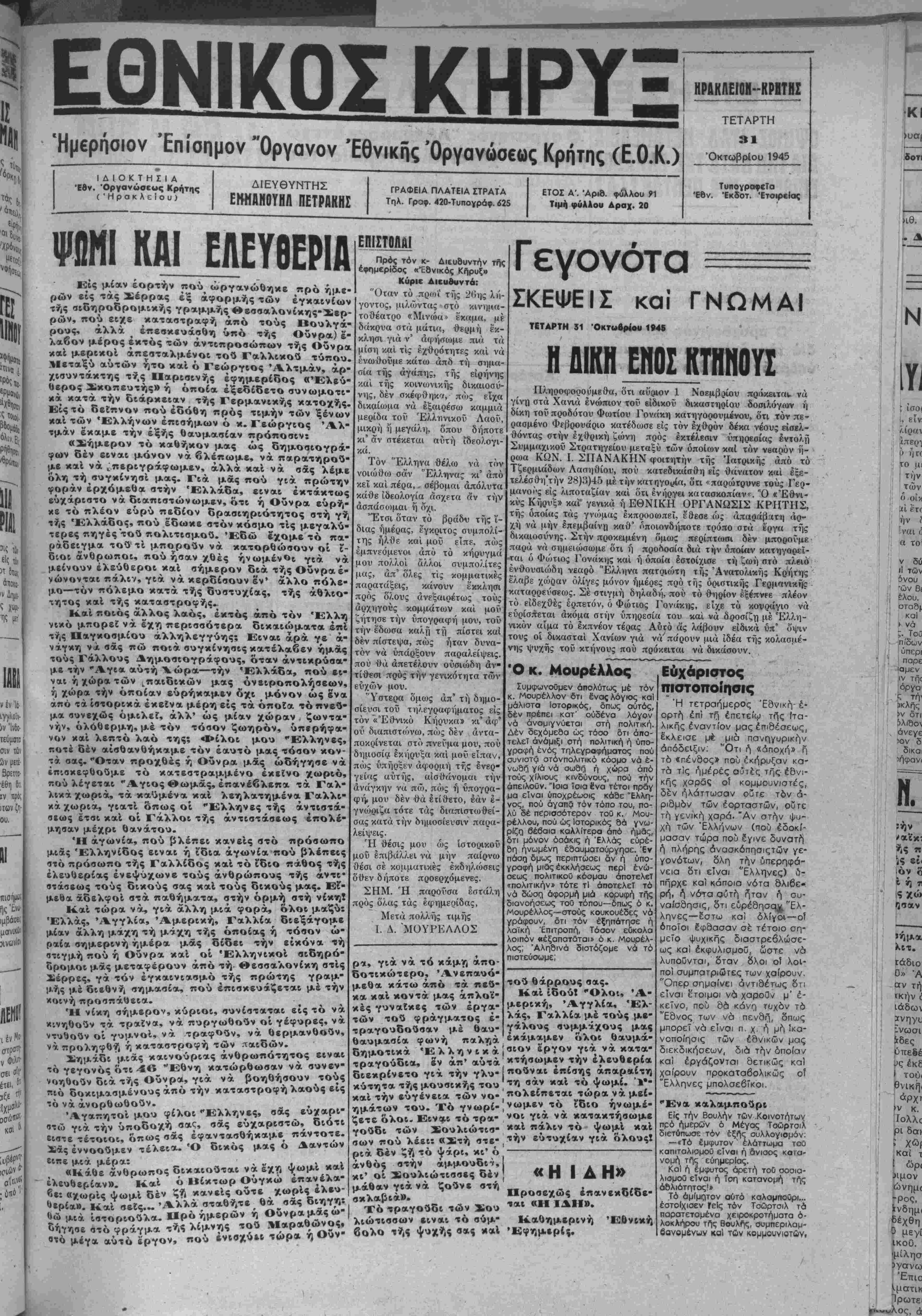 Ήμβρησιον Επίσημον Όργανον Έθνικής "Οργανώσεως Κρήτης (Ε.Ο.Κ.)