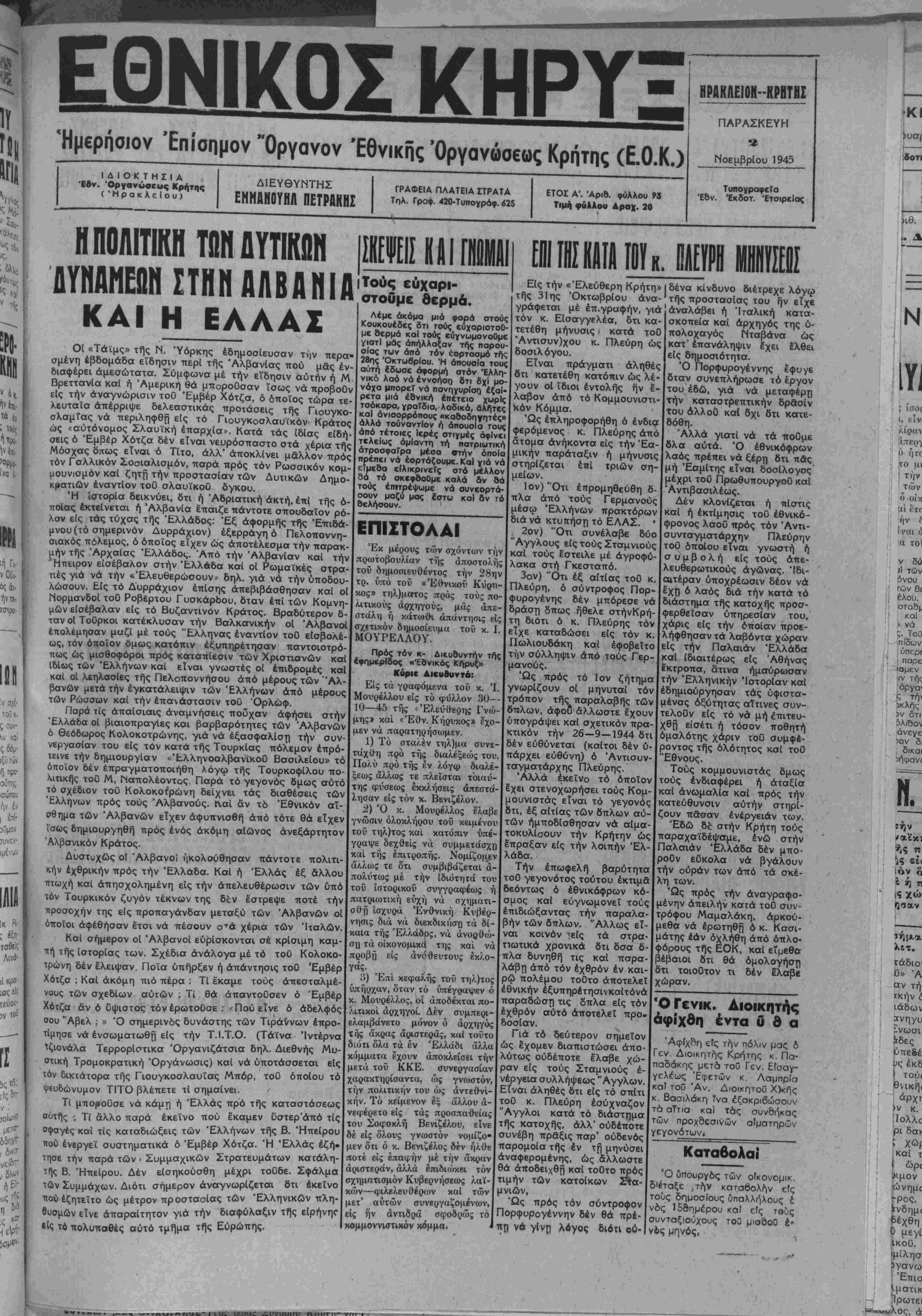 ώς <αότόνομος Σλαυϊκή έπαρχία». Κατά τάς ιδίας είδή- σεις ό Έμβέρ Χότζα δέν είναι νευρόσπαστο στά χέρια τής Μόσχας όπως είναι ό Τίτο, άλλ' άποκλίνει μάλλον πρός τόν Γαλλικόν Σοσιαλισμόν, παρά πρός τόν Ρωσσικόν κομ¬ μουνισμόν καί ζητή την προστασίαν των Δυτικών Δημο¬ κρατικήν εναντίον τού σλαυϊκοΰ δγκου. Ή ίστορία δεικνύει, δτι ή Άδριατική άκτή, επί τής ο¬ ποίας έκτείνεται ή ΆλβανΙα έπαιζε πάντοτε σπουδαίον ρό¬ λον είς τάς τύχας τής Ελλάδος: Έξ άφορμής τής Έπιδά- μνου (τό σημερινόν Δυρράχιον) έξερράγη ό Πελοποννη- σιακός πόλεμος, ό οποίος είχεν ώς άποτέλεσμα την παρακ- μήν τής Άρχαίας Ελλάδος. Άπό την Αλβανίαν καί την "Ηπειρον εϊσέβαλον στήν Έλλάδα καί οί Ρωμαϊκές στρα- τΐές γιά νά την «Έλευθερώσουν» δηλ. γιά νά την ύποδου- λώσουν. Είς τό Δυρράχιον έπίσης απεβιβάσθησαν καί οί Νορμανδοί τοθ Ροβέρτου Γυσκάρδου, δταν επί των Κομνη- μών είσέβαλαν είς τό Βυζαντινόν Κράτος. Βραδύτερον δ¬ ταν οί Τοθρκοι κατέκλυσαν την Βαλκανικήν οί Άλβανοί επολέμησαν μαζί μέ τούς Έλληνας εναντίον τοθ είσβολέ- ως, τόν οποίον όμως κατόπιν έξυπηρέτησαν παντοιοτρό- πως ώς μισθοφόροι πρός κσταπίεσιν των Χριστιανών καΐ Ιδίως των Έλλήνων καί είναι γνωστές οί έπιδρομές καί καΐ οί λεηλασίες τής Πελοποννήσου άπό μέρους των Άλ- |3ανών μετά την εγκατάλειψιν των Έλλήνων άπό μέρους των Ρώσσων καί την επανάστασιν τοΰ Όρλώφ. Παρά τίς άπαίσιαις άναμνήσεις ποδχαν άφήσει στήν Έλλάδα οί βιαιοπραγΐες και βαρβαρότητες των Άλβανών 6 θεόδωρος Κολοκοτρώνης, γιά νά εξασφαλίση την συν- νεργασίαν τού είς τόν κατά τής Τουρκίας πόλεμον έπρό- τεινε την δημιουργίαν «ΈλληνοαλβανικοΟ Βασιλείου» τό οποίον δέν επραγματοποιήθη λόγω τής Τουρκοφίλου πο¬ λιτικάς τοθ Μ, Μαπολέοντος. Παρά τό γεγονός δμως αύτό τό σχέδιον τοΰ Κολοκοΐρώνη δείχνει τάς διαθέσεις των Έλλήνων πρός τούς Άλβανούς. Ιαί άν τό Εθνικόν αΐ- σθημα των Άλβανών είχεν άφυπνισθή άπό τότε θά είχεν ί'σως δημιουργηθή πρός ενός άκόμη αίώνος ανεξάρτητον Άλβσνικόν Κράτος. Δυστυχώς οί Άλβανοί ηκολούθησαν πάντοτε πολιτι¬ κήν εχθρικήν πρός την Έλλάδα. Καί ή Ελλάς έξ άλλου πτώχή καί άπησχολημένη είς την απελευθέρωσιν των υπό τόν Τουρκικόν ζυγόν τέκνων της δέν έστρεψε ποτέ την προσοχήν της είς προπαγάνδαν μετσξύ των Άλβανών οί όιΐοίοι αφέθησαν έτσι νά πέσουν σΤά χέρια των Ίταλών. Καί σήμερον οί Άλβανοί ευρίσκονται σέ κρίσιμη καμ- πή τής ίστορίας των. Σχέδια άνάλογα μέ τό τού Κολοκο- τρώνη δέν Ιλειψαν. Ποία υπήρξεν ή απάντησις τοΰ Έμβέρ Χότζα ; Καί άκόμη πιό πέρα : ΤΙ έκαμε τούς άπεσταλμέ- νους των σχεδίων αυτών ; Τί θά άπαντοθσεν ό Έμβέρ Χότζα άν ό ΰψιστος τόνέρωτοϋσε : «Πού είνε ό άδελφός σου "Αβελ ; » Ό σημερινάς δυνάστης των Τιράννων έπρο- τΐμησε νά ένσωματωθή είς την Τ.Ι.Τ.Ο. (Τάϊνα Ίντέρνα τζιονάλα ΤερρορΙστικα Όργανιζάτσια δηλ. Διεθνής Μυ- οτική Τρομοκρατική Όργάνωσις) καί νά ύποτάσσεται είς τόν δικτάτορα τής Γιουγκοσλαυΐας Μπόρ, τοθ όποΐου τό ψευδώνυμον ΤΙΤΟ βλέπετε τί σημαίνει. Τί μποροθσε νά κάμη ή Ελλάς πρό τής καταστάσεως αυτής ; Τί άλλο παρά έκεΐνο πού έκαμεν ϋστερ'άπό τίς σφαγές καί τίς καταδιώξεις των Έλλήνων τής Β. Ηπείρου πού ένεργεΐ συστηματικά ό Έμβέρ Χότζα. Ή Ελλάς εζή¬ τησε την παρό των - Συμμαχικών Στρατευμάτων καί¬ της Β. Ηπείρου. Δέν είσηκούσθη μέχρι τοϋδε. Σφάλμα των Συμμάχων. Διότι σήμερον άναγνωρίζεται δτι έκεΐνο πούέζητεΐτο ώς μέτρον προστασίας των Έλληνικών πλη- βυσμών είνε απαραίτητον γιά την διαψύλαξιν τής είρήνηο «ίς τώ π