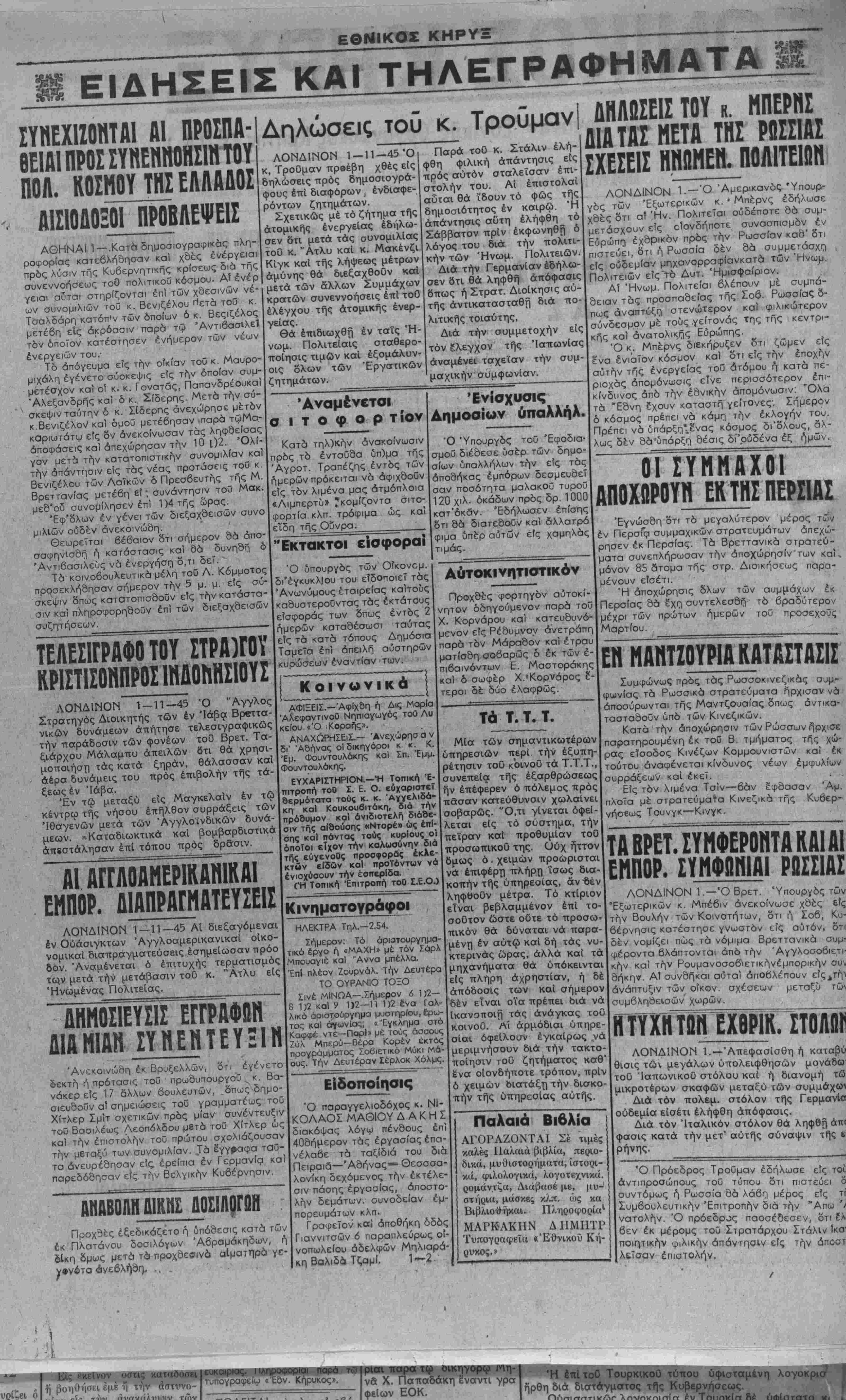 Διά τόν Ιταλικόν στόλον θά ληφθή άιτ< φασις κατά την μετ" αυτής σύναψιν τής ε [ρήνης.__________________________ Ό Πρόεδρος Τροϋμαν εδήλωσε είς τοί. άντιπροσώπους τού τύπου δτι πιστεύει δ συντόμως ή Ρωσσία δα λάβη μέρος είς τί Συμβουλευτικήν Επιτροπήν διά την "Απω '/ νατολήν. Ό πρόεδρος παοσέδεσεν, δτι ?λ βεν έκ μέρομς τοϋ Στρατάρχου Στάλΐν ίκσ ποΐΓτικήν φιλικήν απάντησιν είς την άποστ λεϊσαν επιστολήν. ■ι ν »·/- 'Τ' >ν όστις καταδοσβϊ