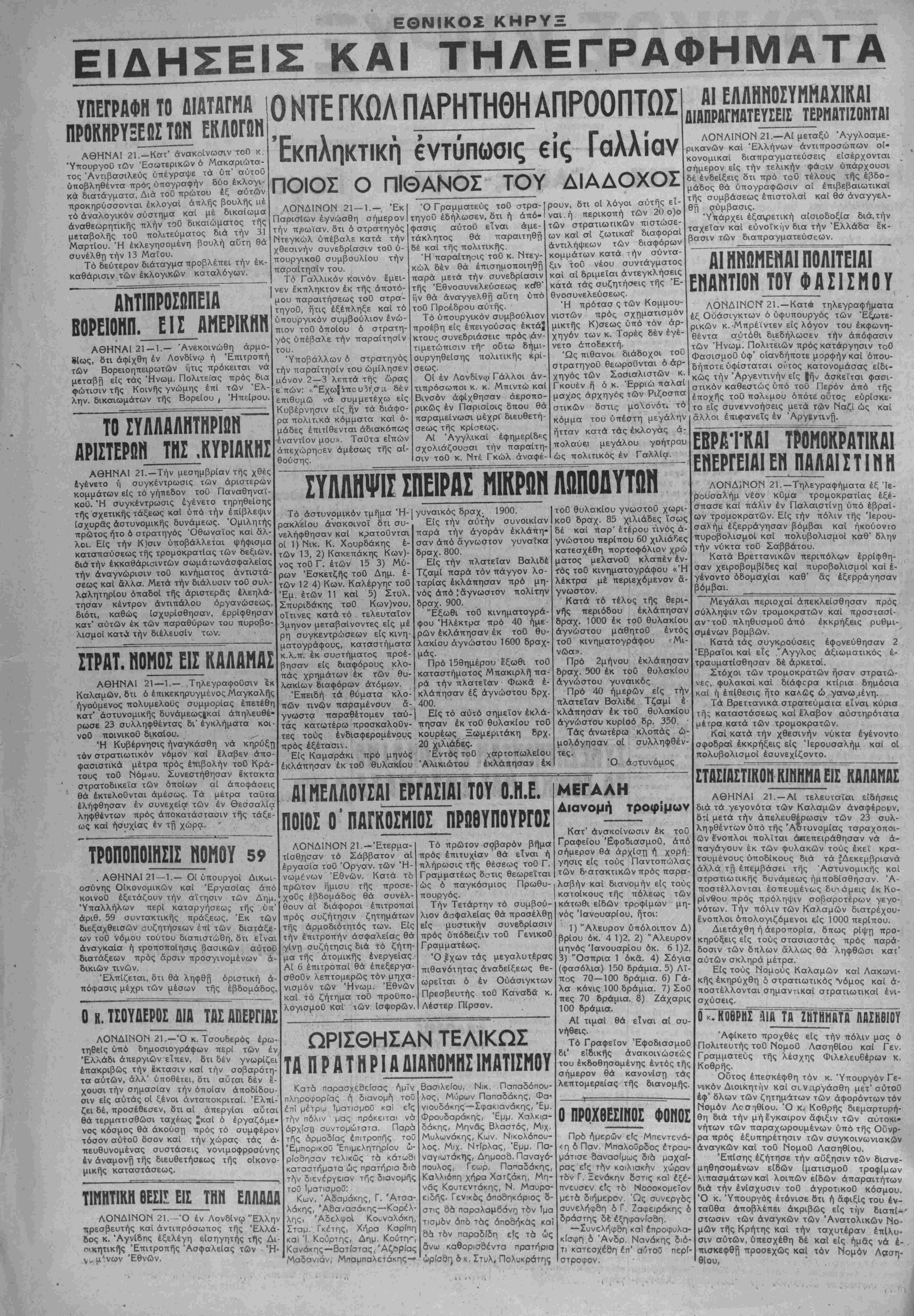 <η δ Παν. Μπαλοθρδος έτραυ- υάτισε σανασίμως διά μαχαί¬ ρας είς την κοιλιακήν χώραν τδν Γ. Ξενάκην δστις κα) έξέ- πνευσεν είς τδ Νοσοκομείον μετά διήμερον Ώς συνεργδς συνελήφθη δ Γ. Ζαφειράκης δ δράστης δέ έξηφανίσδη. —Συνελήφθη και έπροφυλα' κίσφη δ Ανδρ. Νανάκης διό τι κατεσχέση έπ' αι'τοΰ περί στροφον. Μεγάλαι περιοχαΐ όΐπεκλείσθησαν πρός σύλληψιν των τρομοκρατών καϊ προστασί- αν-τοθ πληθυσμοΰ άπό έκκρήξεις ρυθμι- σμένων βομβών. Κατά τάς συγκρούσεις εφονεύθησαν 2 Εβραϊοι καί είς 'Άγγλος άξιωματικός ε¬ τραυματίσθησαν δέ άρκετοί. Στόχοι των τρομοκρατών ήσαν στρατώ- εο, φυλακαί καί δΐάφορα κτίρια δημοσία καί ή επίθεσις ήτο καλώς ώ γανωμένη. Τα Βρεττανικά στρατεύματα είναι κύρια τής καταστάσεως καί έλαβον αύστηρότατα μέτρακατά των τρομοκρατών. Καί κατά την χθεσινήν νύκτα εγένοντο σφοδραί έκκρήξεις είς Ίερουσαλήμ καί οί πολυβολισμοί έσυνεχίζοντο. ΣΤΑΣΙΑΣΤΙΚΟΓ. ΚΙΗΓίΜα ΕΙΣ ΚΛΑΑΓ1ΑΣ ΑΘΗΝΑΙ 21. —Αί τελευταίαι είδήσεις διά τα γεγονότα των Καλαμών άναψέρορν, δτί μετά την απελευθέρωσιν των 23 συλ¬ ληφθέντων υπό τής Άστυνομίας ταραχοποι- ών έ'νοπλοι πολίται απεπειράθησαν νά ά- παγάγουν έκ των ψυλακών τούς έκεΐ κρα- τουμένους ύποδίκους διά τα ?Δεκεμβριανά άλλά τή έπεμβάσει τής Άστυνομικής καί στρατιωτικής δυνάμεως ήμποδίσθησαν. Ά- ποστέλλονται έσπευμένως δυνάμεις έκ Κο- ρίνθου πρός πρόληψιν σοβαροτέρων γεγο- νότων. Την πόλιν των Καλαμών διατρέχου- ενοπλοι όπολογιζόμενοι είς 1000 περίπου. Διετάχθη ή άερο^ορία, δπως ρΐψη προ- κηρύξεις είς τούς στασιαστάς πρός παρά¬ δοσιν των δπλων άλλως θά ληφθώσι κατ' αυτών σκληρά μέτρα. Είς τούς Νομούς Καλαμών καί Λακωνι- κής εκηρύχθη δ στρατιωτικάς *νόμος καί ά- ποστέλλονται σημαντικαί στρατιωτικαί ένι- σχύσεις. Αφίκετο προχθές είς την πόλιν μας ό Πολιτευτής τοθ ΝομοΟ Λασηθίου καί Γεν. Γραμματεύς τής λέσχης Φιλελευθέρας κ. Κοθρής. Ο5τος επεσκέφθη τόν κ. Υπουργόν Γε¬ νικόν Διοικητήν καί συνεργασθή μετ' αύτοθ έφ' δλων των ζητημάτων των αφορόντων τόν Νομόν Λοσ-]θΙου. Ό κ, Κοθρής διεμαρτυρή¬ θη διά την μή Ιγκαιρον άφιξιν των αύτοκΐ- νήτων των παραχωρουμένων υπό τής Οΰνρ- ρα πρός εξυπηρέτησιν των συγκοινωνιακών άναγκών καί τοθ Νομοΰ Λασηθίου. Έπίσης εζήτησε την αύξησιν των διανε¬ μηθησομένων είδών ίματισμοθ τροφίμων λιπασμάτωνκαί λοιπών είδών άπαραιτήτων διά την ενίσχυσιν τοθ άγροτικοθ κόσμου. Ό κ. 'Υπουργός ετόνισε δτι ή άφιξΐς τού έν- ταΰθα αποβλέπει ακριβώς είς την διαπΐ-** στωσιν των άναγκών των Άνατολικών Νο- μών τής Κρήτης καί την ταχυτέραν επίλυ¬ σιν αυτών, υπεσχέθη δέ καί είς ημάς νά έ- . τασκεφθή προσεχώς καί τόν Νομόν Λςχση- θίου.