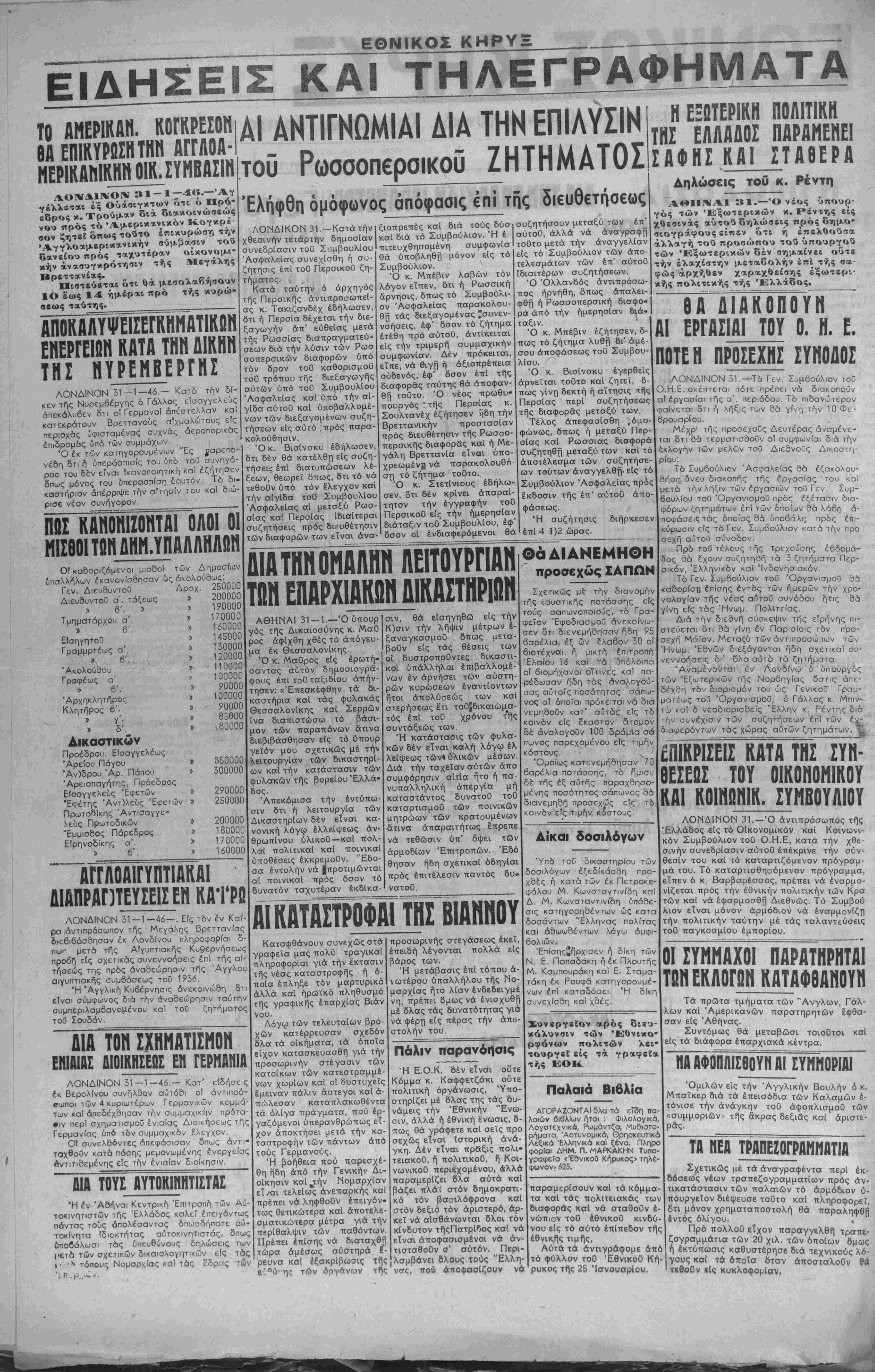 πω<- μετά τής Αίγυπτιακής Κυ9ερνήσεως προβή είς σχετικάς συνεννοήσεις έπϊ τής αί- τήσεώς της πρός άναδεώρησιν τής 'Αγγλου αίγυπτιακής συμβάσεως τοΰ 1936. Ή Αγγλικη Κυβέρνησις άνεκοινώδη δτι είναι σύμφωνος διά την άναδεώρησιν ταύτην συμπεριλαμβανομένας καΐ τού ζητήματος τοΰ Σθυδάν. ΑΘΗΝΑΙ 31—1.—Ό υπουρ γός τής Δικαιοσύνης κ. Μαΰ ρος αφιχθη χθές τό άπόγευ- μα έκ Θεσσαλονίκης. Ό κ. Μαθρος είς έρωτή- σαντας αυτόν δημοσιογρά- φους επί τοθ ταξιδϊου απήν¬ τησεν: «Έπεσκέφθην τα δι- καστήρια καί τάς φυλακάς Θεσσαλονίκης καί Σερρών ίνα διαπιστώσω τό βάσι¬ μον των παραπόνων άτινα διεβιβάσθησαν είς τό υπουρ γεΐόν μου σχετικώς μέ την λειτουργίαν των δικαστηρί- ων καί την κατάστασιν των φυλακών τής βορείου Ελλά¬ δος. Άπεκόμισα την εντύπω¬ σιν δτι ή λειτουργία των ΔικαστηρΙων δέν είναι κα- νονική λόγω ελλείψεως αν¬ θρωπίνου ύλικοθ—καί πολ¬ λαί πολιτικαί καί ποινικαί ύποθέσεις έκκρεμοθν. Έδο- σα εντολήν νά |προτιμώνται αί ποινικαί πρός δσον τό δυνατόν ταχυτέραν έκδίκα σιν, Θά εΐσηγηθώ είς την Κ)σιν την λήψιν μέτρων έ- ξαναγκασμοϋ δπως μετα- βοϋν είς τάς θέσεις των οί δυστροποϋντες δικαστι- κοί ύπάλληλοι έπιβαλλομέ- νων έν άρνήσει των αύστη- ρών κυρώσεων έναντίοντων ήτοι απολύσεως των καί στερήσεως Ιτι τοΰ|δικαιώμα- τός επί τοθ χρόνου τ*ής συντάξεως των. Ή κατάστασις των φυλα- κών δέν είναι καλή λόγω έλ λεΐψεως των» υλικών μέσων. Διά την ταχείαν αυτών άπο συμφόρησιν αίτία ήτο ή πα- νυπαλληλική άπεργΐα μή καταστάντος δυνατοθ τοθ καταρτισμοθ των ποινικών μητρώων των κρατουμένων άτινα απαραιτήτως έπρεπε νά τεθώσιν ύπ' δψει των αρμοδίων Επιτροπών. Έδό θησαν ήδη σχετικαί οδηγίαι πρός επιτέλεσιν παντός δυ- νατοθ. ΟάΔΙΑΝΕΜΗΟΗ προσεχώς ΙΑΠΩΝ Σχετικώς μέ την διανομήν τής καυστικής ποτάσσης είς τούς σαπωνοποιούς, τό Γρα¬ φείον 'Εφοδιασμοΰ ανεκοίνω¬ σεν δτι διενεμήδησαν ήδη 95 βαρέλια, έξ ών έλαβον 30 οί βιοτέχναι. ή μικτή έπιτροπή Ελαίου 16 καΐ τα ΰπόλοιπα οί βιομήχανοι οίτινες καΐ πα- ρέδωσαν ήδη τάς άναλογού- σας αυτοίς ποσότητας σάπω¬ νος αί οποίαι πρόκειται νά δια νεμηδοϋν κατ' αυτάς είς τό κοινόν είς έκαστον άτομον δέ άναλογοϋν 100 δράμια σά πωνος παρεχομένου είς τιμήν κόστους. Όμοίως κατενεμήδησαν 70 βαρέλια ποτάσσης, τό ήμισυ δέ τής έξ αυτής παραχδησο- μένης ποσότητος σάπωνος δα διανεμηδή προσεχώς είς τό κοινόν είς τιμήν κοστους. Δι'και δοσιλόγων ΑΪΚΑίΑΣΤΡΟΦΑΪ ΤΗΣ ΒΙΑΝΝΟΥ ΔΙΑ ΤΟΝ ΣΧΗΜΑΤΙΣΜΟΝ ΕΝΙΑ1ΑΣ ϋΙΟΙΚΗΙΕΟΙ ΕΝ ΓΕΡΜΑΝΙΑ ΛΟΝΔΙΝΟΝ 31-1-46.- Κατ' είδήσεις έκ Βερολίνου συνήλδον αυτόδι ο! άντιπρό- βωποι των 4 κυριωτέρων Γερμανικών κομμά¬ των κα) άπεδέχδησαν την συμμαχικήν πρότα- •ιν περΐ σχηματισμοΰ ένιαίας Διοικήσεως τής Γερμανίας υπό τόν συμμαχικόν έλεγχον. ΟΙ συνελδόντες απεφάσισαν δπως άντι- ταχθούν κατά πάσης μεμονωμένης ενεργείας Αντιτιθεμένης είς την ενιαίον διοίκησιν. ΑΙΑ ΤΟΥΣ ΑΥΤΟΚΙΝΗΤΙΣΤΑΣ Ή έν "Αθήναι Κεντρική Έπιτροπή των Αύ- τοκινητιστών τής Ελλάδος καλεϊ έπειγόντως πάντας τούς άπολέσαντας όπωσδήποτε αΰ- τοκΓνητα ιδιοκτήτας αΰτοκινητιστάς, όπως υποβάλωσι τάς ΰπευθύνουζ δηλώσεις των ρετά των σχετικών δικαιολογητικών είς τάς ι· **· τόπους Νομαρχίας καΐ τάς ϊτ'δρπς των '. Π- ρ,.ιι» ι. Καταφθάνουν συνεχώς στά γραφεΐα μας πολύ τραγικαί πληροφορίαι γιά την έκτασιν τής νέας καταστροφής ή ό- ποία έπληξε τόν μαρτυρικό άλλά καί ήρωϊκό πληθυσμό τής γραφικής επαρχίας Βίαν νού. Λόγω των τελευταίων βρο- χών κατέρρευσαν σχεδόν δλα τα οίκήματα, τα όποΐα είχον κατασκ