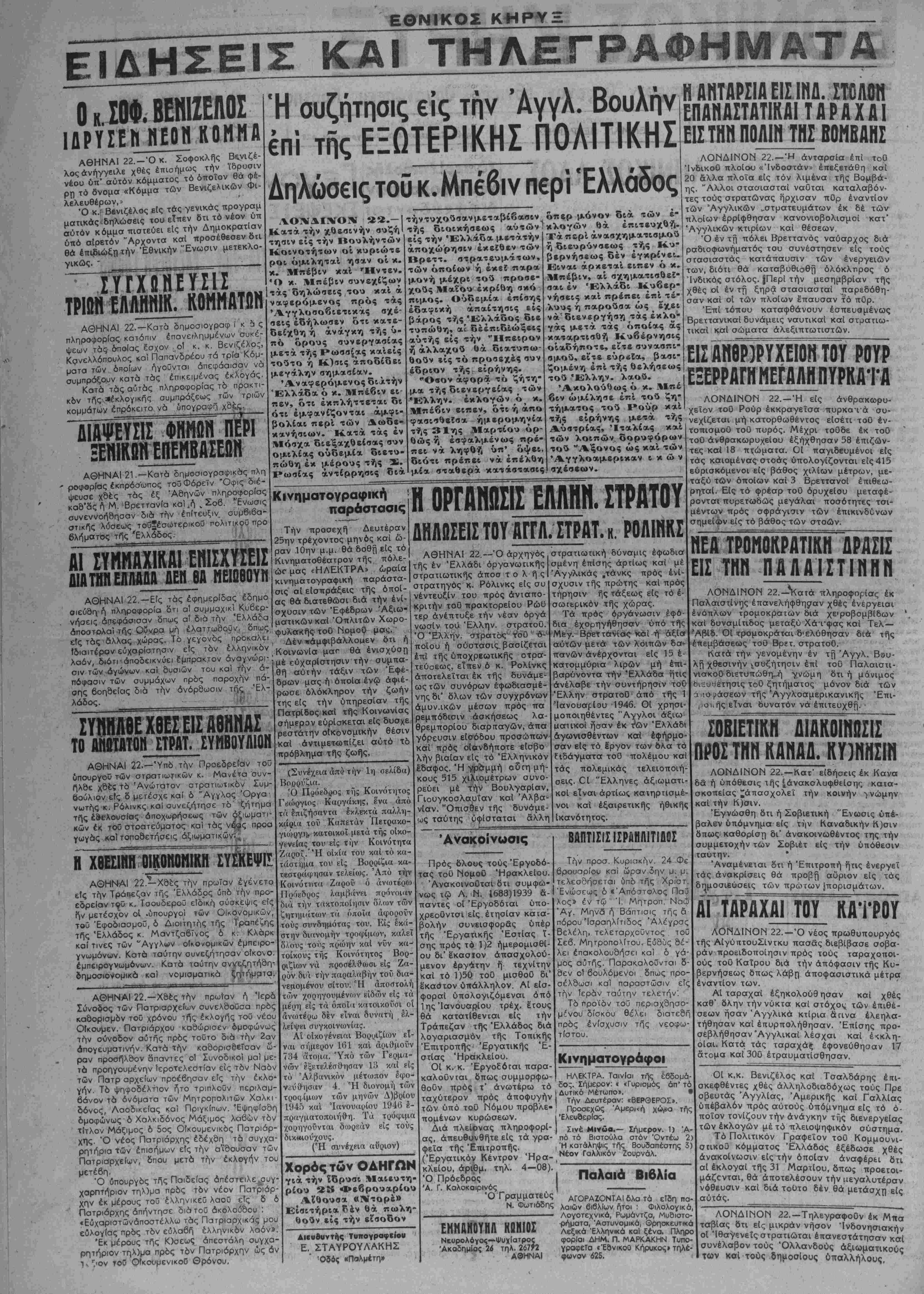 σεβλήθησαν Αγγλικαί λέσχαι καί έ<κλη- οίαι. Κατά τάς ταραχάς εφονεύθησαν 17 άτομα καί 300 ετραυματίσθησαν. Οί κ.κ. Βενιζέλος καί Τσαλδάρης έπι- σκεφθέντες χθές αλληλοδιαδόχως τούς Πρε σβευτάς Αγγλίας, Άμερικής καί Γαλλίας Τί=ίς| υπέβαλον πρός αύτούς ύπόμνημα είς τό ο¬ ποίον τονιζουντήν ανάγκην τής διενεργείας ω έκλογώ έύ λψα Σινέ Μιγ«α·— Σήμερον. 1) Ά¬ πό τό Βιστούλα στόν Όντέω 2) Ή κατάληψις τής Βουδαπέστης 3) (Εργατικόν Κέντρον Ήρσ- Νέον Γαλλικόν 2θϋΡνάλ· κλείου, άριθμ. τηλ. 4—08). Ό Πρόεδρος Ά. Γ. Καλοκαιρινός | Ό Γραμματεύς Ν. Φωτιάδης Παλαιά Βιβλία ΕΜΜΑΚ6ΥΗΛ ΚΟΝΙΟΣ Νευρολόγος—ΨυχΙατροα Άκαδημίος 26 τηλ. 2ό7?2 ΑΘΗΝΑΙ ΑΓΟΡΑΖΟΝΤΑΙ δλα τα ειδή πα¬ λαιών 6ιβλίων ήτοι Φιλολογικά, Λογοτεχνικά, Ρωμάντζα, Μυδιστο- ρήματα, Άστυνομικό, Θρησκευτικά Λεξικά Έλληνικά καΐ ξένα. Πληρο φορΐαι ΔΗΜ. Π. ΜΑΡΚΑΚΗΝ Τυπο- γραφεΤα «ΈΒνικοΟ Κήρυκος» τηλέ¬ φωνον 625. ή γη ής ιεεργείας των έκλογών μέτύ πλειοψηφίαν σύστημα. Τό Πολιτικόν Γραφείον τοΰ Κομμουνι- στικοθ κόμματος Ελλάδος έξέδωσε χθές ανακοίνωσιν είς την οποίαν άναφέρει δτι αί εκλογαί τής 31 Μαρτίου, δπως προετοι- μάζονται, θά άποτελέσουν την ιιεγαλυτέραν νόθευσιν καί διά τούτο δέν θά μετάσχη είς αύτάς. ΛΟΝΔΙΝΟΝ 22.—Τηλεγραψοΰν έκ Μτΐα ταβΐας δτι είς μικράν νήσον Ίνδονησιακήν οί Ίθαγενεΐς στρατιώται επανεστάτησαν καΐ συνέλαβον τούς Όλλανδούς άξιωματικούς των καί τούς δημοσίους Οπαλλήλους
