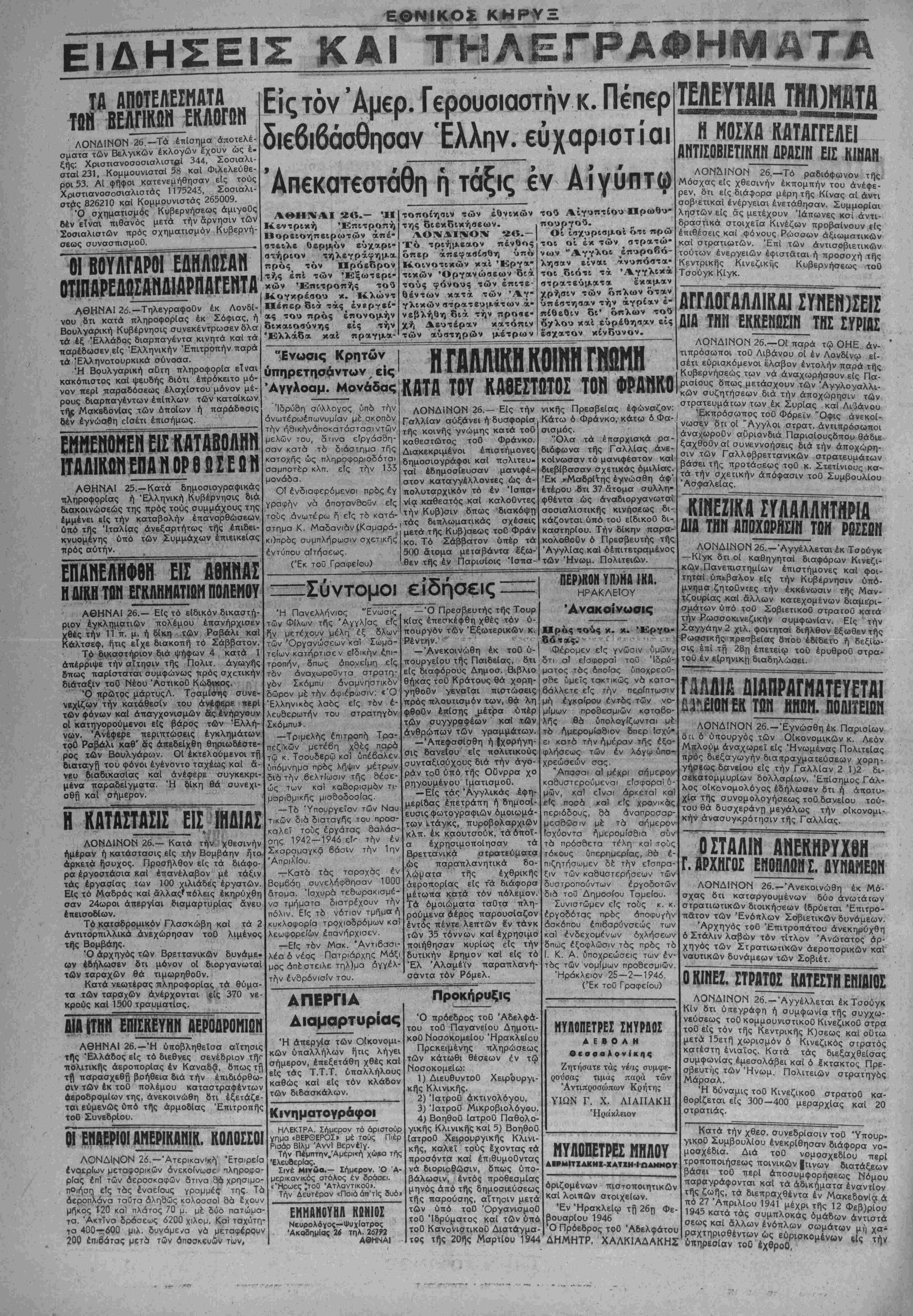τής Ελλάδος είς τό διεθνες σενέδριον τή<- πόλιτικής άεροπορΐας έν Καναδφ, δπως τή τβ παρασχεθή βοηθεία διά την έπιδιόρθω- Οιν των έκ τοθ πολέμου καταστραφέντων ΑεροδρομΙων της, ανεκοινώθη 8τι έξετάζε- ται ευμενώς υπό τής αρμοδίας Έπιτροπής τοθ ΣυνεδρΙου. (Η ΕΝΒΕΡΙΟΙΑΗΕΡΙΚΑΗΙΚ. ΚΟΑΟΣΣΟ1 ΛΟΝΔΙΝΟΝ 2ό.—"Ατερικανΐκιΐ Έταιρεία έναερίων μεταφορικών ανεκοίνωσε πληροφο¬ ρίας επί των άεροσκαφών δτινα 9ά χρησιμο- πθιήση είς τάς έναείους γραμμές της Τα αεροπλάνα ταυτα άληδώς κολοσσο) δα ϋχουν μήκος 120 καΐ πλάτος 70 μ. μέ δύο πατώμα- τα. ΆκτΤνα δράσεώς 6200 χιλομ. Καί ταχύτη- τα 400—600 μιλ. δυνάμεθα νά μεταφέρουν 200 επιβάτας μετά των άποσκευων των, ΑΘΗΝΑΙ 26.- Ή Κεντρική Έπιτροπή Βορειοηπειρωτών απέ¬ στειλε θερμόν ευχαρι¬ στηριον τηλεγράφημα πρός τόν Πρόεδρον τής επί των Εξωτερι¬ κών Έπιτροπής τού Κογκρέαου κ. Κλώντ Πέπερ διά τάς ενεργεί¬ ας τού πρός έπονομήν δικαιοαύνης είς την 'Έλλάδα καί πραγμα¬ τοποίησιν των έθνικών της διεκδικήαεων. ΛΟΝΔΙΝΟΝ 26.— Τό τριήμεαον πένθος όπερ απεφασίσθη υπό Κοινοτικών καί 'Έργα- τικών Όργανώσεων διά τούς φόνους των έπιτε- θέντων κατά των Αγ¬ γλικών στρατευμάτων α¬ νεβλήθη διά την προσέ¬ χη Δευτέραν κατόπιν των αύατηρών μέτρων τού Αίγυπτίου Ορωθυ- πουργού. Οί ίσχυριαμοί ότι πρώ τοι οί έκ των στρατώ- νων "Αγγλοι έπυροβό- ληοαν είναι άνυπόβτα- τοι διότι τα Άγγλικά ατρατεύματα έκαμαν χρήσιν των όπλων όταν ύπέστησαν την αγρίαν έ- πίθεθιν δι' όπλων τού δ/λου καί ευρέθησαν είς έσχατον κίνδυνον. ^ρ^, ΗΓΑΛΛΙΚΗΚΟΙΗΗΓΙπίΙ Αγγλοαμ. ΜονδδαςΙΚΑΤΑ ΤΟΥ ΚΑβΕΣΤΩΤΟΣ ΤΟΠ ΦΡΑΝΚΟ Ιδρύθη σύλλογος υπό την άνωτέρωέ'πωνυμίαν μέ σκοπόν την ήδικήνόποκατάστασιντών μελών τού, άτινα ειργάσθη¬ σαν κατά τό διάστημα τής κατοχης ώς πληροφοριοδόται σαμποτέρ κλπ είς ΤΓδ,ν 133 μονάδα Οί ένδιαφερόμενοι πρός έγ γραφήν νά άποτανσοϋν είς τούς ανωτέρω ή είς τό κατά- στημα Κ Μαδανιάν(Καμαρά- κθπρός συμπλήρωσιν σχετικής έντύπου αίτήσεως (Έκ τού Γραφείου) ΛΟΝΔΙΝΟΝ 26.— Είς την Γαλλίαν αύξάνει ή δυσψορία τής κοινής γνώμης κατά τοΰ καθεστώτος τοθ Φράνκο. Διακεκριμένοι έπιστήμονες δημοσιογράφοι καί πσλιτευ- ταί έδημοσίευσαν μανιφέ- στον καταγγέλλοντες ώς ά- πολυταρχικόν τό έν Ισπα¬ νία καθεστός καΐ καλούντες την Κυβ)σιν δπως διακόψη , τάς διπλωματικάς σχέσεις μετά τής Κυβ)σεως τοθ Φράν κο. Τό Σάββατον υπέρ τα 500 άτομα μεταβάντα έξω¬ θεν τής έν Παρισίοις Ίσπα- νικής Πρεσβείας έφώναζον. Κάτω ό Φράνκο, κάτω ό Φα- σισμός. 'Όλα τα έπαρχιακά ρα- διόφωνα τής ΓαλλΙας άνε- κοΐνωσαν τό μανιφέστον καΐ διεβίβασαν σχετικάς όμιλΐας. Έκ »Μαδρίτης εγνώσθη άφ' ετέρου δτι 37 άτομα συλλη¬ φθέντα ώς άναδιοργανωταί σοσιαλιστικής κινήσεως δι- κάζονται υπό τού είδικοθ δι- καστηρΐου. Την δίκην παρα- κολοθοϋν ό Πρεσβευτής τής Αγγλίας καί όέπΐτετραμένος των Ήνωμ. Πολιτειών. :Σύντομοι είδήσεις Ή Πανελλήνιος "Ενωσις των Φίλων τής "Αγγλίας είς ί^ν μετέχουν μέλη έξ δλων των Όργανώσεων καΐ Σωμα- τείων κατήρτισε ν είδικήν έ,πι- τροπήν, δπως όπονείμη είς τόν άναχωροθντα στρατη¬ γόν Σκόμπυ άναμνηστικόν δώρον μέ την άφιέρωσιν «Ό Έλληνικός λαός είς τόν έ- λευδερωτήν τού στρατηγόν Σκόμπυ» —Τριμελής έπιτροπή Τρα- πεζίκών μετέβη χθές παρά τώ κ Τσουδερώ κσ) υπέβαλεν υπόμνημα πρός λήψιν μέτρων διά την βελτίωσιν τής αέοε- ώς των καί καθορισμόν τι- μαριθμικής μισθοδοσΐας —Τό Υπουργείον των Ναυ τικών δια διαταγάς τού προσ- καλεϊ τούς εργάτας θαλάσ¬ σης 1942—1940 ε?Γ την έν Σκαραμαγκφ βάσιν την 1ην Απριλίου —Κατά τάς ταρα