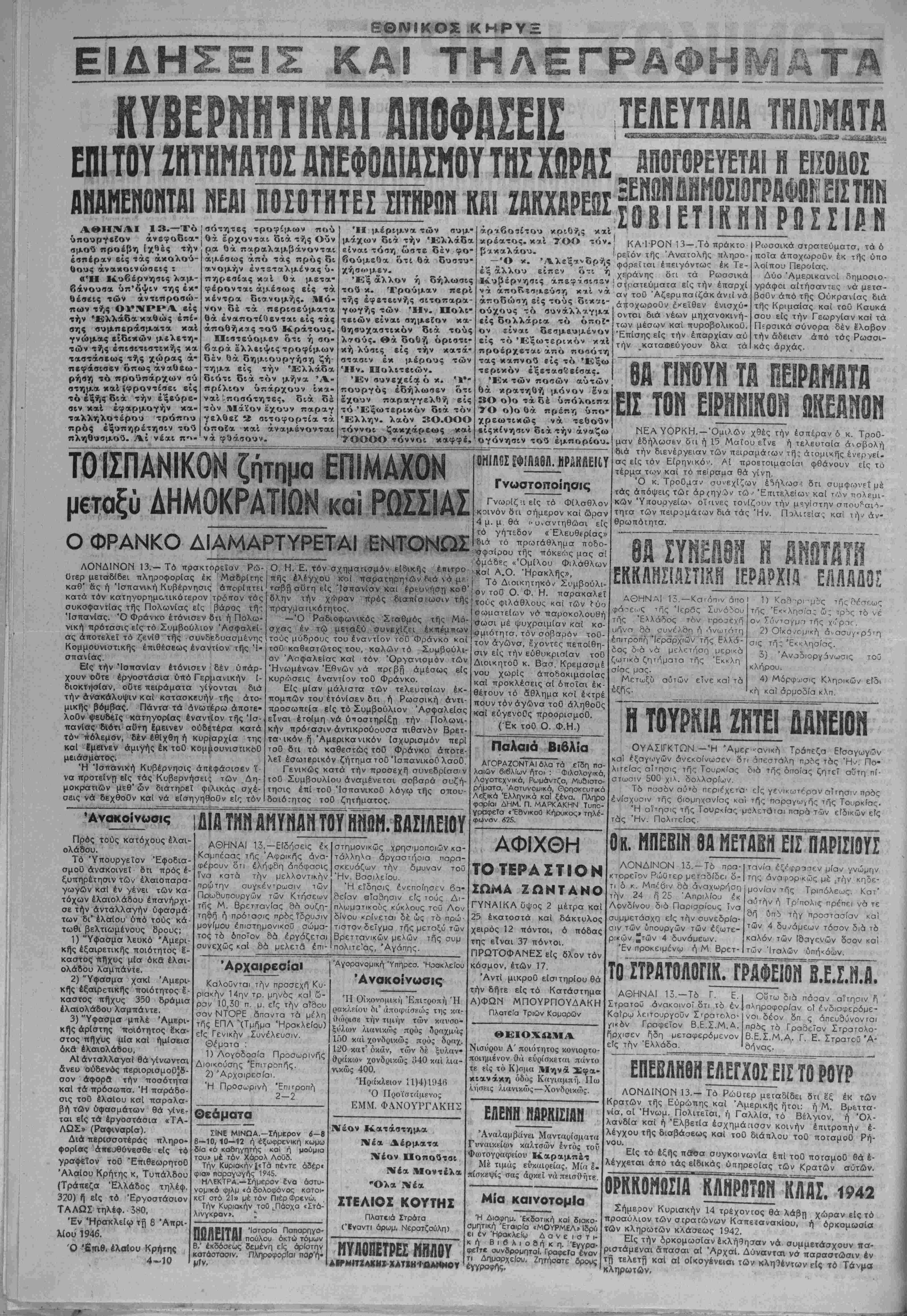 όποία κ<αί άναμένονταε νά ά Ή μέριμνα των συμ- μάχων διά την Έλλάδα είναι τόση ώστβ δέν φο- βούμεθα ότι θά δυστυ- χήσί»»μεν. Έξ άλλον ή δήλωσις τού κ. Τρούμαν περί τής έφετεινής σιτοπαρα- γωγής των Ήν. Πολι- τειών είναι σημείον κα- θηβυχαστικόν διά τούς λνούς. Θά δοθή όριατι- κή λύσις είς την κατά¬ στασιν έκ μέρους των Ήν. Πολ&τειών. Έν συνεχείαό κ. Ύ- πουργός εδήλωσεν ότι έχουν παραγγελθή είς τό Εξωτερικόν διά τόν Έλλην, λαόν ΛΟ.ΟΟΟ τόννοι ζακχάρεως καί Υ0ΟΟΟ τόννοι καφφέ, άραβοιίτου κριθής καί κρέατος. καί 7ΟΟ τόν. β-χκαιλάου. ΣΟΒΙΕΤ Ό κ. ξρής έξ άλλου είπεν ότι ή Κυβέρνησις απεφάσισεν ά ά ν ά άποΚϊΠ'ΐι,δύση καί ν ά αποδώση είς τούς δικ^ι- ούχους τό βυνάλλ-αγμα είς δολλάρια τό οποί¬ ον είναι δεσμβυμένον είς τό Εξωτερικόν καί προέρχεται από ποιότη τας καπνού είς τό Έξω τερικόν έξετααδείσας. Έκ των ποσών αυτών θά κρατηθή μόνον Ενα 3Ο ο)ο τα δέ ύπόλοιπα 7Ο ο)ο Θά πρέπη υπο- χρεωτικώς νά τεθούν είςκίνηαιν διά την άναζω ογόνησιν τού έμπορίου ΤΟΙΣΠΑΝΙΚΟΝ ζήτημα ΕΠΙΜΑΧΟΝ μ€ταξύ ΑΗΜ0ΚΡΑΤ1ΩΝ καί ΡΩΣΣΙΑΣ Ο ΦΡΑΝΚΟ ΔΙΑΜΑΡΤΥΡΕΤΑΙ ΕΝΤΟΝΩΣ ΛΟΝΔΙΝΟΝ 13.—Τό πρακτορείον Ρώ¬ υτερ μεταδίδει πληροφορίας έκ Μαδρίτης καθ* άς ή Ίσπανική Κυβέρνησις άπορΐπτει κατά τόν κατηγορηματικότερον τρόπον τάς συκοφαντίας τής Πολωνίας είς βάρσς τή·: Ίσπανίας. Ό Φράνκο ετόνισεν δτι ή Πολω- νική πρότασις είς τό Συμβούλιον Ασφαλεί¬ ας αποτελεί τό ζενίθ τής συνδεδυασμένης Κομμουνιστικής έπιθέσεως εναντίον τής Ί· σπανΐας. Είς την Ισπανίαν ετόνισεν δέν ύΐτάρ- χουν οθτε έργοστάσια υπό Γερμανικήν ί- διοκτησΐαν, ουτε πειράματα γίνονται διά την ανακάλυψιν κ αί κατασκευήν τής άτο- μικής βόμβας. Πάντα τα ανωτέρω άποτε- λοθν ψευδεΐς κατηγορίας εναντίον τής Ίσ- πανΐας· διότι αυτή έμεινεν ούδετέρα κατά τό« πόλεμον, δέν έθίχθη ή κυρίαρχΐα της καί έμεινεν άμιγής έκ τοθ κομμουνιστικαί) μειάσματος. Ή Ίσπανική Κυβέρνησις απεφάσισεν ι να προτείνη είς τάς Κυβερνήσει^ των Δη- μοκρατιών μεθ' ών διατηρβΐ φιλικάς σχέ- σβις νά δεχθοθν καΐ νά είσηγηθοθν είς τόν , Ο Η. Ε. τόν σχηματισμόν είδικής έτιιτρο ί ττή"ς έλέγχου κοί παρατηρητήν διά ν ά μ? ' τσβή αυτή είς Ίσπανίον Και ίρ^υνήοη κοθ' δλην την χώραν πρός διαπίσιωσιν τής πραγματικότητος. —Ό Ραδιοφωνικός Σταθμός τής Μά- σχας έν τώ μεταξύ συνεχίζει έκπεμπων τους μύδρους τού εναντίον γοΟ Φράνκο καί τού καθεστώτος τού, καλών τό Συμβούλι¬ ον Ασφαλείας καί τόν "Οργανισμόν των Ήνωμένων Εθνών νά πρτβή άμέσως είς κυρώσεις εναντίον τοθ Φράνκο. Είς μίαν μάλιστα των τελευταίαν έκ- πομπών τού ετόνισεν δτι ή Ρωσσική άντι- προσωπεία είς τό Συμβούλιον Ασφαλείας είναι ετοίμη νά υποστηρίξη την Πολωνι¬ κήν πρότασιν άντικρούουσα πιθανόν Βρετ- τα> ικόν γ) Αμερικανικόν ίσχυρισμόν περί