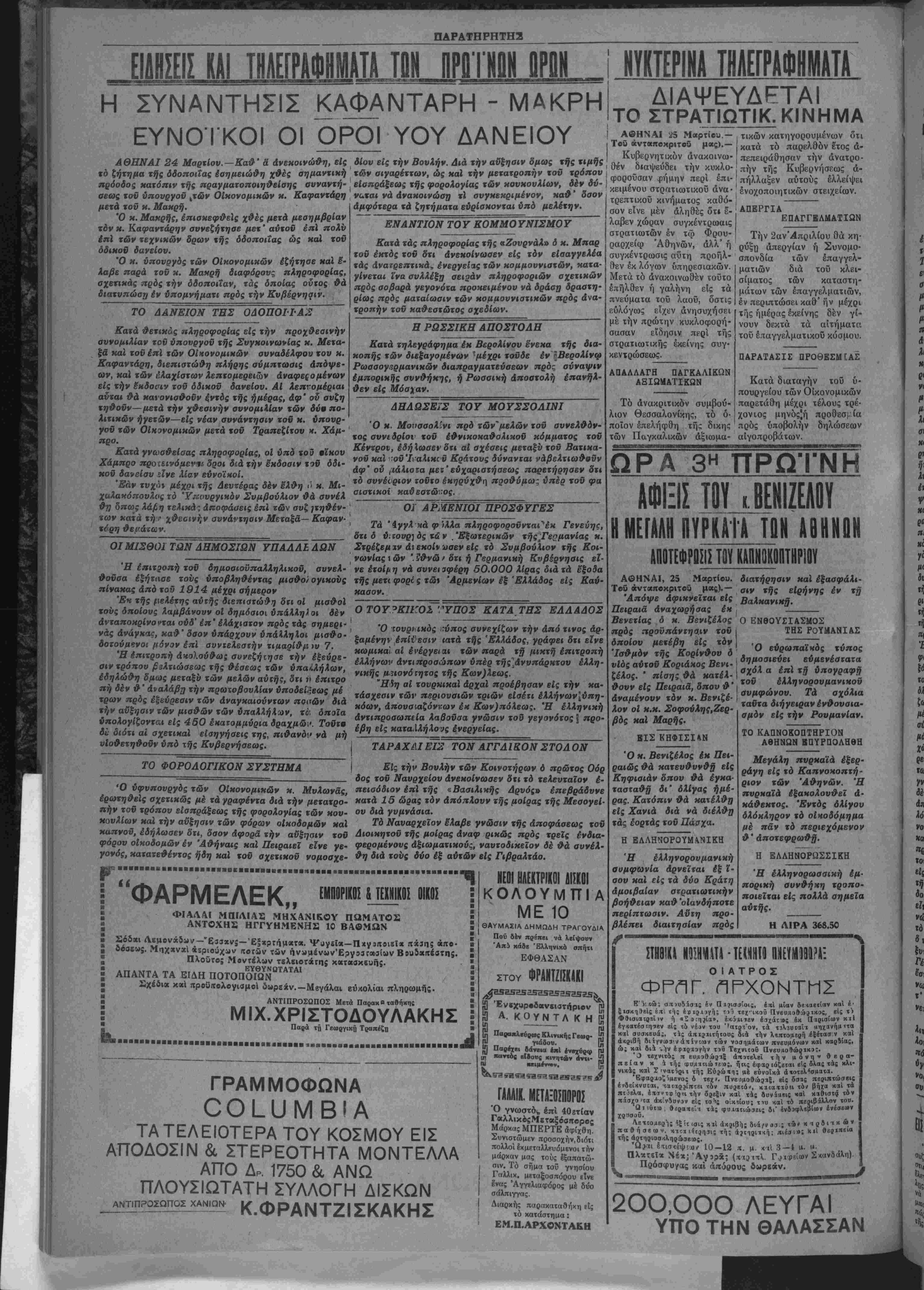 έβη είς κατα<1λήλθ'!/ς ενεργείας. ΤΑΡΑΧΑΙ ΕΙΣ ΤΟΝ ΑΓΓΛΙΚΟΝ ΣΤΟΑ ΟΝ Ό νφυπονργδς χών Οίκονομικών κ. Μυλωνας, έρωχηθεΐς αχεχικώς μέ χά γραφένχα διά χήν μεχαχρο- πήν τού χρόπου είαπράξεως της φορολογίας χών κον- κουλίων καί χήν αύξησιν χών φόρων οΐκοδομών καί καπνοΰ, εδήλωσεν δτι, δαον Αφορα χήν αύξησιν χοϋ φόρον οΐαοδομών έν Αθήναις καί Πειραιεί είνε γε- νβκ^ί·0^""* «δ·"*^·*··*·""^ "·»κ««»ίΐι/ν ι γονός, καχαχεθένχος ήδη καί χοΰ αχεχικοϋ νομοαχε- θη διά χοϋς δύο έξ αυτών είς Γιβραλτάο. Είς την Βουλήν χών Κοινοχήρων ό πρώχος Οόρ δος χοΰ Νανρχείον Ανεκοίνωσεν ότι τό τελευταίον ε¬ πεισόδιον επί τής «Βασιλικής Δρυός» έπεβράδυνε καχά 15 ώρας χον Από πλούν τής μοίρας τής Μεαογεί ου διά γυμνάσια. Τό Ναναρχεΐον έλαβε γνώσιν τής Αποφάσεως χοϋ Διοικηχοϋ τής μοίρας άναφ ρικώς πρός τρείς ένδΐ- φερομένονς Αξιωματικόν^, ναυχοδικεϊον δέ θά αυνέλ- ■■■■■■■" 1 Φ Α Ρ Μ ΕΛΕ Κ ΕΜΙΜ0Σ ~ ΦΙΑΛΑΙ ΜΠΙΛΙΑ5 ΜΗΧΑΝΙΚβΥ ΠίΙΜΛΤΟ- ΑΝΤΟΧΗ5 ΗΓΓΥΗΜΕΝΗΣ3 10 ΒΑΘΜΩΝ 2 θβσεως. ΑΠΑΝΤΑ ΤΑ ΕΙΔΗ ΠΟΤΟΠΟΙΟΝ Σχέδια κ«1 προϋπβλογισμοί δωρεχν.—Μεγάλαι ευκολίαι πληρωμής. ν-ε3αχνς-εξχρτήίμ«τα. Ψ«γ5ϊ*-Π*ν3«β»8ϊ* «*3ης *«·· «ϊριούχων ίΐβτών των ήν»μένων'Ε?γβ3Γο»σίων Ββυδοιΐϊέβτης. Πλοΰτβς Μοντέλων τελειοτάτης κατασκευής. 18. ΑΝΤΙΠΡΟΣΩΠΟΣ Μετά Παρακβ ταθήκης ΜΙΧ.ΧΡΙΣΤΟΔΟΥΛΑΚΗΣ Παρά τή Γεωργιχη Τραπέζχι ■«■«■ι ■ ■■ι ΝΕΟΙΗΛΕΚΤΡΙΚΟΙΜΟΙ ΚΟΛΟΥΜΠΙ Α ΜΕ 10 ΘΑΥΜΑΣΙΑ ΔΗΜΩΔΗ ΤΡΑΓΟΥΔΙΑ Πού δέν πρέπει νά λβίψουν Άπ5 κάδβ Έλληνικά σπήτι ΕΦΘΑΣΑΝ στου ΦΡΑΝΤΖΙΣΚΑΧΙ }0 Ένβχυρβδβνειστήριβν Β Α. ΚΟΥΝΤΛΚΗ ΓΡΑΜΜΟΦΩΝΑ ΟΟΙ_ΙΙΜΒΙΑ ΤΑΤΕΛΕΙΟΤΕΡΑ ΤΟΥ ΚΟΣΜΟΥ ΕΙΣ ΑΠΟΔΟΣΙΝ & ΣΤΕΡΕΟΤΗΤΑ ΜΟΝΤΕΛΛΑ ΑΠΟ Δρ. 1750 & ΑΓΜΩ ΠΛΟΥΣΙΩΤΑΤΗ ΣΥΛΛΟΓΗ ΔΙΣΚΩΝ -™_—— Κ.ΦΡΑΝΤΖΙΣΚΑΚΗΣ » Παραπλεύρως Κλινικής Γβωρ- γιάδου. Παρέχει βάνβια έκ! ένι-ύρφ παντός βΐβονς κινητήν άντι· ν ΓΑΑΑΙΚ. ΜΕΤΑΞΟΙΠΟΡΟΣ Ό γνωστόν επί 40ζτίαν ΓαλλικόςΜεταξόσπορβς Μάρκας ΜΠΕΡΤΕ αφιχθη. Συνιστώμεν προσοχήν,διότι πολλοί Ικμεταλλευόμενοι την μάρκαν μας τούς έξαπατώ- σιν. Τό σήμα τού γνησίου Γαλλικ. μεταξοσπόρου είνε 2να? Άγγελιαφόρος μέ δύο σάλπιγγας. Διαρκής παθΓΐκαταθήχη είς τό κατάστημα: ΕΜ.Π.ΑΡΧΟΝΤΑ&Η ΕΠΑΓΓΚΛΜΑΤΙΩΝ Τό άνακριτικόν συμβού¬ λιον Θεσσαλονίκης, τό ό· ποίον έπελήφθη τής δικης των Παγκαλικών άξιωμα- Τήν 2ανΆπριλίου θά κη¬ ρύξη απεργίαν ή Συνομο- σπονδία ιών έπαγγελ- ματιών διά τοΰ κλει- σίματος των καταστη- μάτων των έπαγγελματιών, έν περιπτώσει καθ" ην μέχρι τής ημέρας έκείνης δέν γί¬ νουν δεκτά τα αϊτήματα τοϋ έπαγγελματικοΰ κύσμου. ΠΑΡΑΤΑΣΙΣ ΠΡΟΘΕΣΜΓ.ΑΣ Κατά διαταγήν τοΰ ύ- πουργείου των Οίκονομικών παρετάθη μέχρι τέλους τρέ· χονιος μηνύς'ή προθεσί- ία πρός υποβολήν δηλώσεων αίγοπροβάτων. ΩΡΑ 3Η ΓΤΡΩΤιΝΗ ΑΦΙΞΙΣ ΤΟΥ_κ1ΕΝΙΖΕΑΟΥ Η ΜΕΓΑΛΗ ΠΥΡΚΑΪΑ ΤΩΝ Α Β Η Η ΠΗ ΑΠΟΤΕΦΡΟΣΙΣ ΤΟΥ ΚΑΠϋ«ΤΗΡ10Υ ΑΘΗΝΑΙ, 25 Μαρτίου. Τού ανταποκριτοϋ μας).— Άπόψε αφικνείται είς Πειραια άναχωρήαας έκ Βενετίας δ κ. Βενιζέλος πρός προϋπάντησιν τοΰ οποίον μετέβη είς τόν Ίαθμδν τής Κορίνθον δ νΐός αΰτοΰ Κοριάκος Βενι- ζέλος. ' πίσης θά κατέλ- θσυν είς Πειραια, δπου θ' άναμένουν τόν κ. Βενιζέ¬ λον οί κ.κ. Σοφούλης,Ζερ- βός καϊ Μαρής. ΕΙΣ ΚΗΦΙΣΙ4Ν διατήρησιν καϊ εξασφάλι¬ σιν τής είρήνης έν τή Βαλκανικβ. Ο ΕΝΘΟΥΣΙΑΣΜΟΣ ΤΗΣ ΡΟΥΜΑΝΙΑΣ Ό εύρωπαϊ'ΜΟς τύπος Ι δημοαιεύει εύμενέατατα Ι σχόλ α επί χΐ υπογραφή χοϋ ελληνσρουμανικσΰ | σύμφωνον. Τα αχόλια ταύτα διήγειραν ενθουσια¬ σμόν είς την Ρουμανίαν. ΤΟ ΚΑΠΝΟΚΟΠΤΗΡΙΟΝ ΑΘΗΝΩΝ ΒΠΥΡΠΟΛΗΘΗ Ό κ. Βενιξέλος εκ Πει¬ ραιώς θά κατευθυνθή είς Κηφιαιάν δπου θά έγκα- τασταθή δι* 
