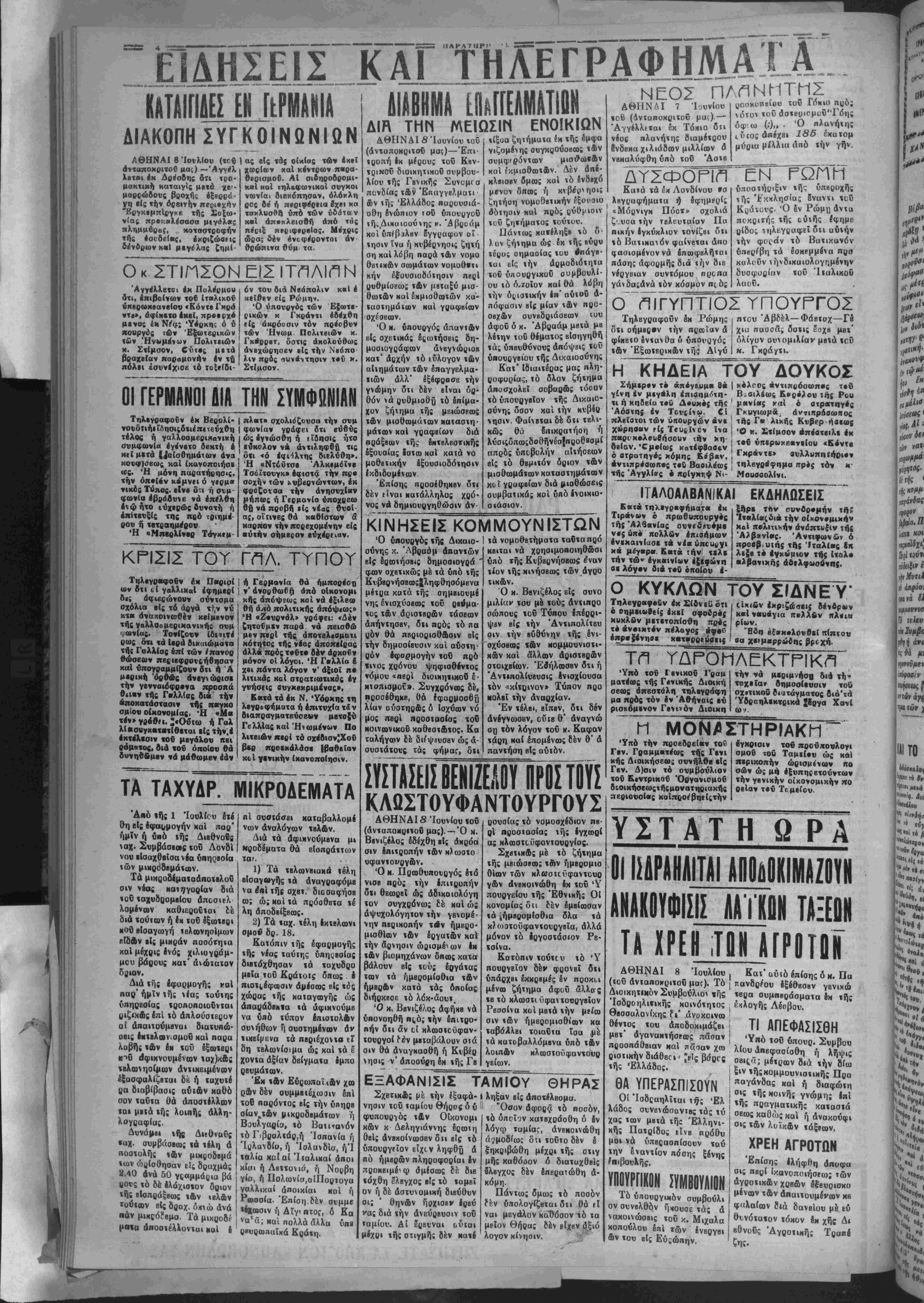 ό οημ<ι»0είς ί«εί σφοδρ«; κυκλδν μΐτετοπίοθη πρ«ς τ· έλ θίκιδν ^ ^____β καί νειυίγία'πολλβν ρίων. "Ηδη έξβτχολονθιί πίπτου αα χείμβρρώίης βρι χή. ΤΠ ΥΑΡΟΜΛΕΚΤΠΚΠ Υπό τοΰ Ιβνικον Γραμ ματέοος τή; Γβνικής Διοική σβως απεστάλη τηλβγράφη μα πρός τόν έν Αθήναις βΰ ρισκόμΐνον Γβνινόν Διοιχη την νά μεριμνήση διά τή" τοχείαν βημοσίβυσιν ιοΰ σχ·τικοδ θιατάγματος διά'τά Ύδραηλεκτβΐκά ϊϊογα Χα%1 Μ ΜΟΝ^ΣΤΗΡΙΑΚΜ Υπό την προβδρείαν τοΰ Γβν. Γραμματεύς τής Γβνι κης Διοικήσεως συνήλθβ είς Γβν. Δ)σιν τό ουμβούλιον τοΰ Εεντρικοΰ Όογανισμοϋ διοικήσκωςτήςμονατηοιακής περιουσίας καίπ&οι'βηΐίςτήν έγκρισιν τοδ προΰπονλογι σμοΰ τοϋ Ταμείον ώς καί περικοπήν ωρισμένων πό σών ώς μή ίξυπηεετούντων «ήν γβνικήν οικονομικήν Λθ Οβιαν τβΰ Τομβίου. ΥΣΤΑΤ Η Ω ΡΑ ΟΙ Ι1ΔΡΑΙΑΙΤΑΙ ΑίίΐιίΚΙΜΙΖΟΥΝ ΑΚΑΚβνΦΙΣΙΪ_ΑΑ_|_|Ι1Ν ΤΑΞΕΟΝ ΤΑ ΙΡΕΗ ΤΗΝ ΑΓΡΟΤΟΙ ΑΘΗΝΑΙ 8 Ιουλίου, (τοϋ άνταποΝριτοδ μαο). Τό Διοικητικόν Συμβούλιον «ής Ίσδροηλιπκής κοινό«η«ος Θβσσαλονίκης ^Γ άνοκοινω θέντος «ου άποδοκιμάζβι ι μβτ' άγανακτήσεας πάσαν | προσπάθβιαν καί ηαπαν χ™ ριστιχήνδιάθΒθΐ; Μς βσρος «ής Ελλάδος. , ΘΑ ΥΠΕΡΑΣΠΙΣΟΥΝ ! Οί Ίσδςαηλΐται τή; Έλ ι λάδος συνβνώσανΐβς «άς χύ χας των μβτά τής Έλληνι- κής Πατρίδος ιΐνβ πρόθυ μοί νά ύπβρασπίσουν ταύ «ην εναντίον πόοης ξένης ίπιβουλής. ΥΠΟΥΡΓΙΚΟΝ ΣΥΜΒΟΥΛΙΟΝ Τό υπουργικόν συμβούλι όν συνβλθόν ήϋουσε τάς ά νακοινώσβις τοΰ κ. Μιχαλα κοπούλου επί των ίνβργβι &ν τού βΐς Εύ;ώπην. Κατ'ϋύιόέ)τ.σηςΟΜ. Πά πανδρέου Ιξέθβσβν γενικώ «βρα ουμπβράσματα δκ τής έχλογής Λέοβου. ΤΙ ΑΠΕΦΑΣΙΣΘΗ 'Υηό «οδ υπουρ. Συμβου λ(ου Ληβφασίοθη ή λήψ,ς οβιςα; μέ«ρ-ν διά την δίω ζ»ν «ήςκομμουνιστικής Προ παγάνδας καί ή διαφώτη σ»5 «ής Ηθΐνής γνώμη; Ιπΐ «ής πραγμαϊΐχής κα«ασ«ά σβως καθώς καΐ ή άνακούφι σις «ών λυϊκόον «άς>ων.