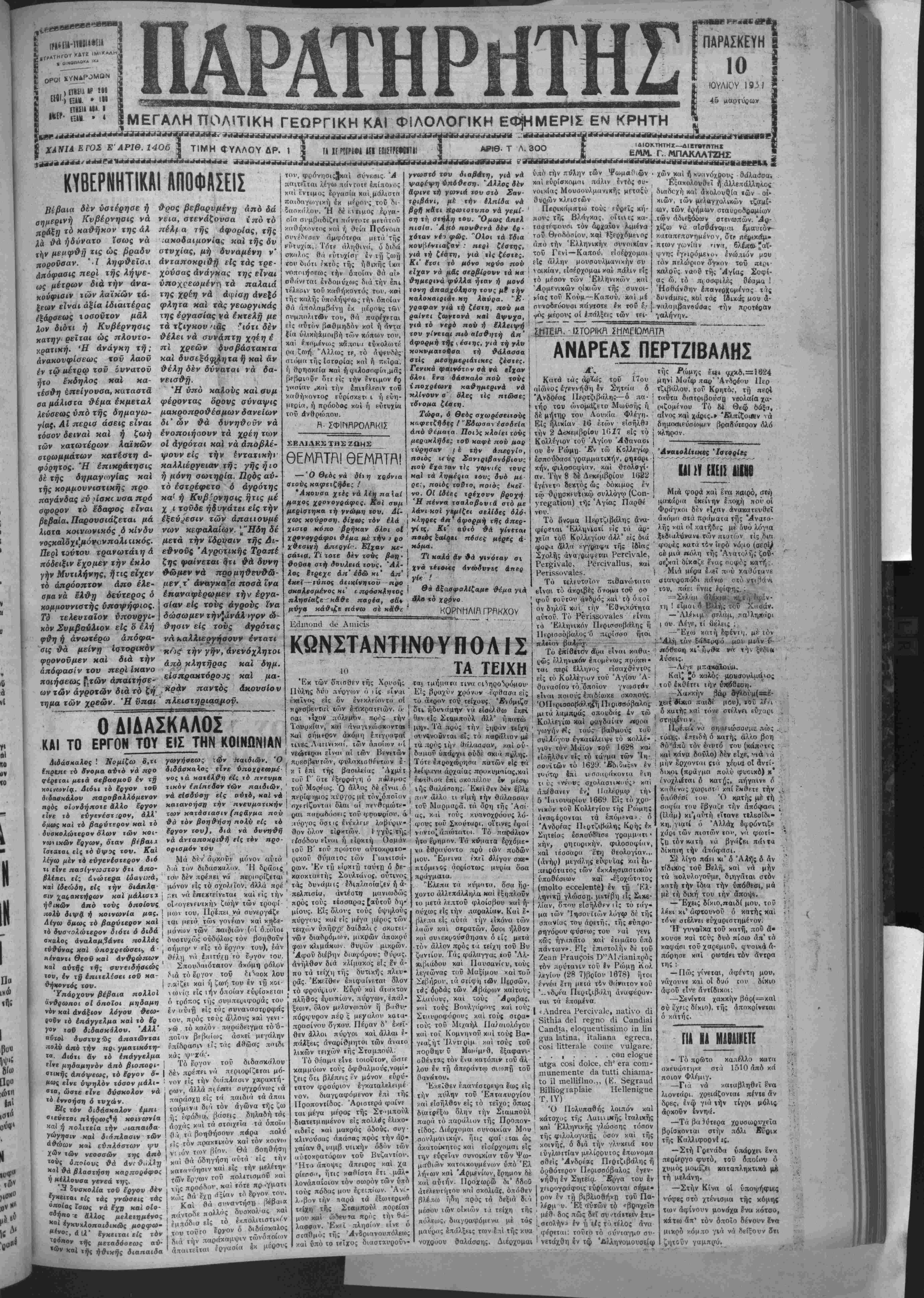 ΧΑΝΙΑ ΕΓΟΣ Ε'ΑΡΙΘ. 1406 ] ΤΙΜΗ <ΤΥΛΛΟΥ ΔΡ. 1 ΤΙ **3**Λ*****4Λ****ΛΖ*****ί+***ν Ι» [ΒΙΣ?ΡΙΙ«Ν1ΙΙ 1 ΑΡΙΘ- Τ Λ. 3ΟΟ ΜΜΜΗΙ ΠΑΡΑΣΚΕΥΗ 10 ΙΟΥΛΙΟΥ 19-^1 45 μαρτύρων »ΤΙΙΤΜΐ: ΕΜΜ. Γ. ΜΠΛΚΛΛΤΖΗΐ: να&»Η** ΚΥΒΕΡΝΗΤΙΚΑΙ ΑΠΟΦΑΣΕΙ! Βεβαία δέν ύατέρηαε ή θρος βεβαρυμένχ άπό δα οημερινή Κυβέρνησις ν ά νεια, ατενάζονσα ίπότό αραΐϊΐ τό καθήκον της αλ πέλ^ α της αφ λα Θά ηδύνατο ϊσως νά θ η ΐή με«φθ// «ις ώς βραδυ ποροΰσαν. '·Ι ληφ&εϊσΛ πέλ^ α της αφορ/ας, της ακοδαιμονίας καΐ της δι» σΤυχίας, μη δυναμένη ν' ανταποκριθή είς τάς τρε- χούσας ανάγκας της είναι ύποχοεωμένη τα παλαιά της χρέη νά άφ/'σ# άνεξό ως μέτρων διά την άνα- ηούφιοιν των λαϊχών τά· ξεων είναι άξία Ιδιαιτέρας φλητα και τάς γεωργιχάς τοσούτον μαλ της εργασίας νά έχτελί} με τα τζιγχου ηας "ιότι δέν θέλει νά αννάπττ) χοίη πί χρεών δνσβάσταπτα καί δυσεξόφβητα ή και άν Χον διότι ή Κυβέρνησις κάτην ρεΐται ώς πλουτο- κρατική. Ή άνάγκη τή; άνακονφίσεως τού λαοϋ ίν τω «έτρω τού όυνατού θέλη δέν δύναται ιά δα- ήτο εΉδηλος καϊ χά- νεισθή. τέσθη έπείγουσα, καταστά Ή υπό χαίούς καί συμ αα μάλιθτα θέμα έχμεταλ φέροντας δρους συναψις λεύσεως υπό τής δημαγω- μαχροπροϋ'έσμων δανείων ν/α$. Αί περισ άσεις είναι δι* ών θά δυνηθούν νά χόαον δειναι καί η ζωη ένοποιήσουν τα χρέη των λαϊκών των κατωτέρων οτρωμμάτων κατέστη ά- φόρητος. Ή έπιχράτησις δέ της δημαγωγίας καί της κομμουνιστικήν προ ααγάνδας εν »ίσκ^ νσα πρό αφορον τό έ'δαφος είναι οί αγρόται χαί νά άηοβλέ- ψουν είς την ϊντατιχήν καλλιέργειαν τη; γης ήιο ή μόνη αωτηρία. Πρός αυ- τό έοτρέφετο ό άγρότης χα> ή Κυβέρνησις ήτις μέ
