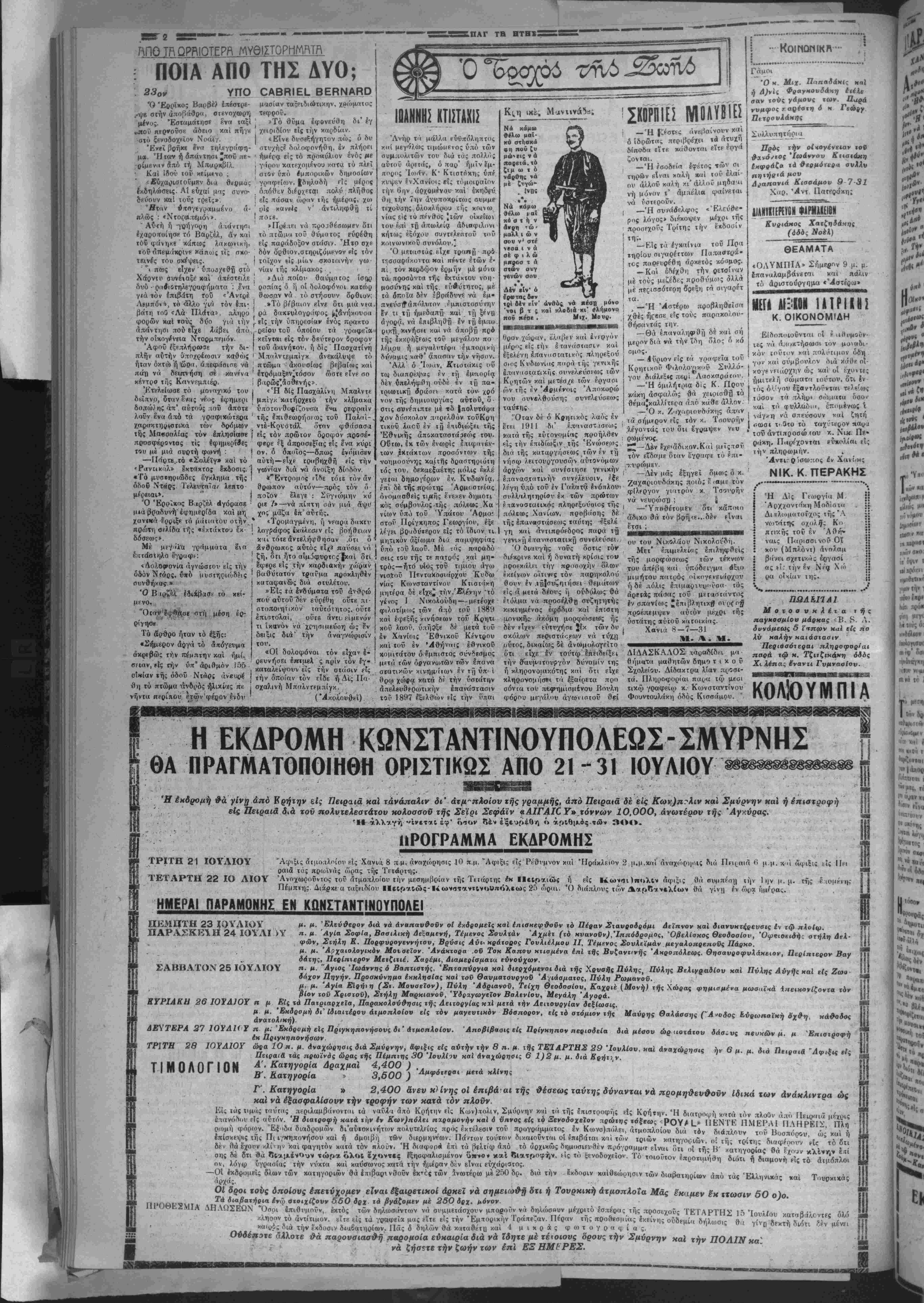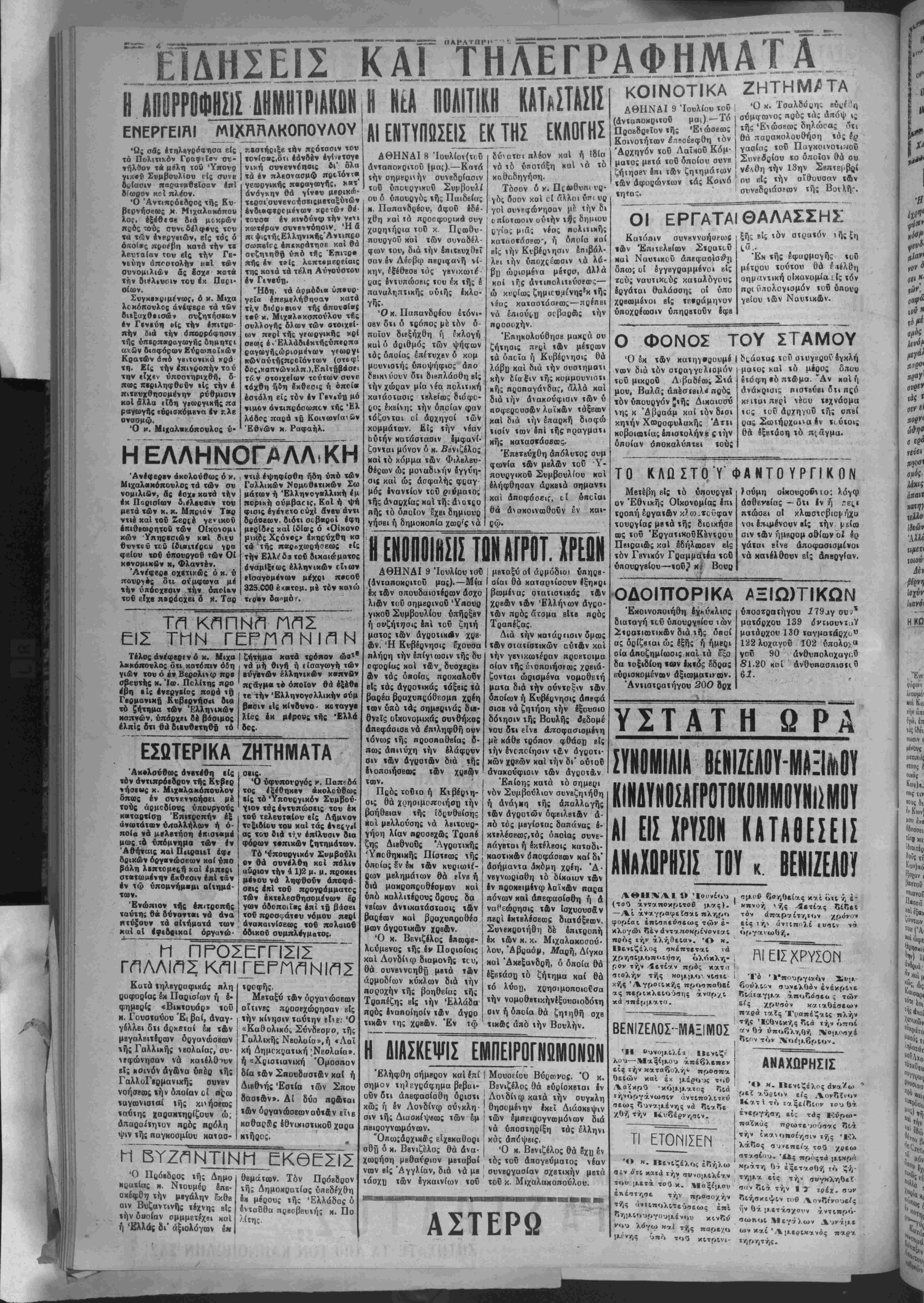 <*ς περικλειο ίσης άναρ/ΐ κά έ ομού βοηθείας «-/ι ό χπνοή ν ής 4ετίας δίδει τόν ά-αρ'/ίτητον χρόνον είς την αντΐπολί ευσϊν ν» οργανωθή. ΒΕΝΙΖΕΛΟΣ-ΜΑΞΙΜΟΣ ΠΙ ΕΙΣ Τό Ύπουργιχόν Συμ¬ βούλιον συνελθόν ενέκρινε δΐαιαγμα άποδόσεα ς των εί? χρυσόν κνΐαθέσεων π'/ρά ταίς Τραπέζαΐς πλήν τής 'Κθνικής διά ιήν ό«οί ν ν θά υποβληθή Νομέ διον τόν Νοέμβριον. Ή λου— Μαξίμου άπέβλεπ'εν είς τήν καταβολήν προσπα θειών καί έκ μέρους τι»ύ Λα'έκρύ 'κόμιε-αΐος Γ,ιά τήνοργάνωαιν άντΐπολΐτεύ σεως δυναμένης νά δΐνδε '/θή τήν Κυβέρνησιν. ΑΝΑΧΩΡΗΣΙΣ ΤΙ ΕΤΟΝΙΣΕΝ Ό κ. Βενιζέλος έδήλω β*ν ό'τΐ καΐά την συνομΐλίτ»ν τού μετά τοΰ κ. Μ τήν ποοσοχήν τής αντιπολιτεύσεως επί δημιουργουμένου κινδύ νού λόγω κ* ι τ^ς ηαρ*/ο υό Ό *. Βενιζέλος άναω ρεΐ αυριον είς Α,ονδΐνον Κντι τό ταξείδιον τού θά ένεργήβη είς τά5 Εύρω- παϊκάς «ρωτευούσνς διά τήν ικανοποίησιν »^ς 'κχ λάδος συνεπεία τού χβεο» στασίου. 'ί*- -ρος,ά μικρά κράτη Οί εξετασθή τό ζή- τημα *ίς -ήν συγκληθεί σαν διά την 1 ? τοΐχ, συ« διήσκεψιν τού Λονδτ'νουεί'ς ήν θά μετάσχουν άντιπρό- σωηοΐ λΙεγ7>ων Αυνά[ΐε