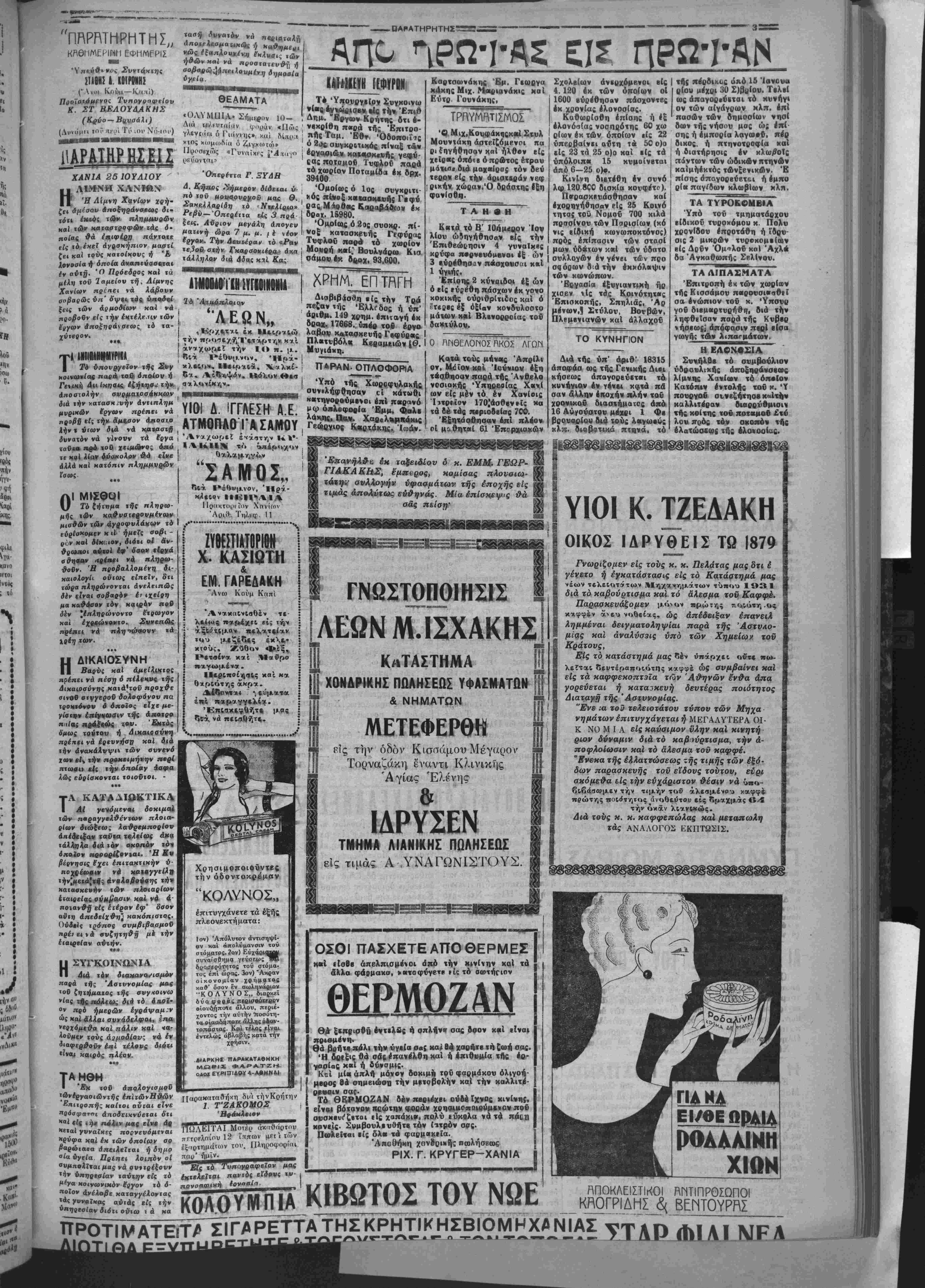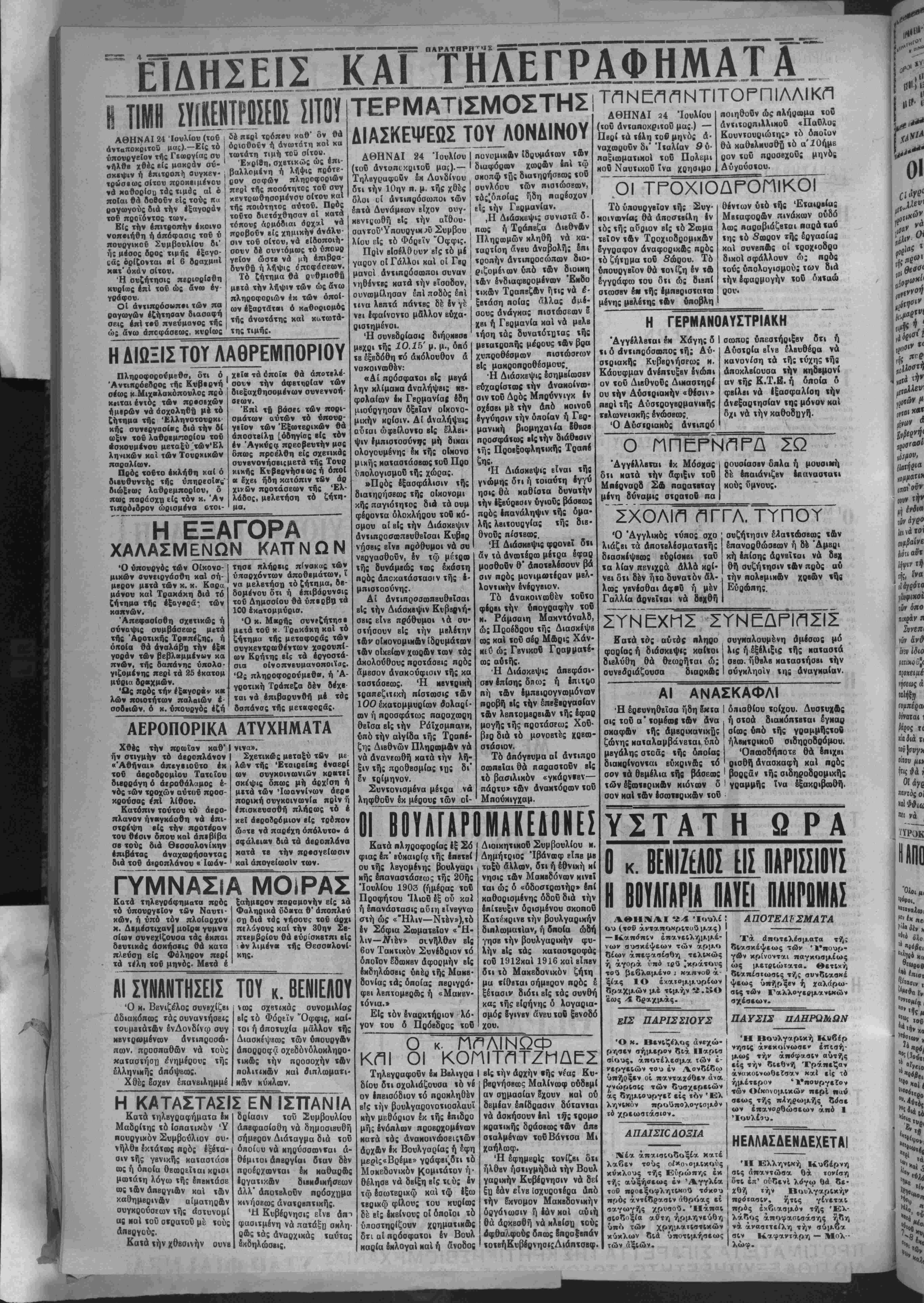 (<οδ Λνταποκριτοθ μας.) — Περί τα τέλη το0 μηνός Α· ναχωροδν δι* Ιταλίαν 9ύ· παξιωματικοΐ τοδ Πολεμι κοδ Ναυτικοδ ίνα χρηοιμο η ώς ηλήραμα τοδ άντιτορπιλλικοθ «Παδλος Κουντουριώτη;» τό δποΐυν θά καθβλΝυσθί) τό α'ΙΟήμε ρον «υδ προσεχούς μηνός Δύγούστου. ΟΙ ΤΡΟΧΙΟΑΡΟΠΙΚΟΙ Τό ύηουργβΐον τής Συγ· κοινωνίας θά Αποστοίλη έν τος τή; αυριον Β.ς τό Σοομα «βίον τ Αν ΤροχιοδρομΐκΑν δγγραφον άναφορικΑς πρός τό ζήτ^μα τοδ βώρου. Τό υπουργείον θά «οίζη έν «Α έγγράφω τού δτι ώς διβπί στωσβν έκ τής έμπβριστατω μένη; μβλέτης «Αν ΰποβλη θέντων ύΐό «τ,ς Μ,ς Με«αφορων πινάκων ούδό λως παραβιάζαται ααρά «αύ της τό 5ωοον τής ίογαοίαί καΐ συνβπΑς οί τροχιοδρο δικο· σφάλλουν ώ; πρός τούς ΰπολογισμού; των διά την εφαρμογήν «οδ οχταώ ρου. Η ΓΕΡΜΑΝΟΑΥΣΤΡΙΑΚΗ 'Δγγέλλβται έκ Χάγης δ «ι δ άντιπςόσωπος τή; Αυ¬ στρία κή; Κνββρνήσρως κ. Κάουφμαν Ανέπτυξεν δνώπι όν «οδ Διβθνοδς Δικαοχηρί ου την Δύστριακήν «θέσιν» πβρΐ τής Δΰστρογερμανικής τβλωνίΐαικής ενώσεως. Ό Αΰσΐριακός Λντιπρό σωπος ύπεατήριζβν δτι ή Αυστρία βΐνβ ελευθέρα νά κανονίση τα τής τύχης τής άποκλβίουσα την κηδβμονί αν «ής Κ.Τ.β. ή δποία δ φβίλβι νά Ιξασφαλίοη «ήν Ανεξαρτησίαν «ής μόνον καί δχι νά την χαθοσογη1. Ο ΠΠΕΡΝΠΓΆ ΣΩ Αγγέλλεται έκ Μόσχας δτι κατά την Αφιξιν τοδ Μπέρναρδ ΣΑ παρατβταγ μένη δύναμις στρατοδ πά ρουσίασεν δπλα ή μουσιΐβη δέ έπαιάνιζβν έιιαναστατι κου; ΰμνους. ΣΧΟΛΐη (ΊΓΓΛ. ΤΥΠΟΥ Ό Άγγλικός τύπος σχο ; λιάζει τα Αποτελέσματατής διασκέψεως ευρίσκει ταϋ «α λίαν πενιχρά Αλλά κρί- νει δτι δέν ήτο δυνατόν Αλ¬ λως γενέσθαι Λφ·0 ή μέν Γαλλία Αρνεϊται νά δεχθή συζήτησιν ελαττώσεως «Αν έπανορθώοεων ή δβ Άμβρι κή έπίσης Λρνβϊται νά δβχ θϊ συζήτησιν τ Αν πρός αύ την πολβμικΑν χρεών «τ)α Εΰοώπης. ΣΥΝΕΧΜΣ ΣΥΝΕΔΠίΊΣΙΣ ίατά «άς ούτος πληρο συγκαλουμένη Αμέσως μδ φορίας ή διάσκεψις καίτοι λις ή εξέλιξις τής καταστά διελύθη θά θεωρήται ώ; σβω. ηθβλβ καταστήσβι «ήν συνεδριάζουσα διαρκΑς ! σύγκλησίν της Αναγκαίαν. " ΑΙ ΑΝΑΣΚΑΦΛΙ •Η έρβυνηθίϊσα ήδη δκΐα Ι όηισθίου τοίχου. ΔυσιυχΑς σις τοδ α' νομέωβ «Αν Ανα ί ή στοα διακόπτβται έγκαρ σκαφΑν τής ΑμΒρικανικ^ς ζώνης καταλαμβάνεται υπό μεγάλης στοα; τής οποίας διακρίνονται εύκρινδς «ό οίας υπό «ής γραμμήςτοδ ήλβκτρικοΰ σιδηροδρόμου. Όπωσδήποτε θά έπιχβι _...,.„. .. ρισθϊ, Λνασκαφή καί πρός σον «ά θβμέλια «ής βάσεως' βορςάν «ή; σιδηροδρομικώς των έξωτβρικΑν κιόνων δ ' γραμμάς Ινα εξακριβωθή, σον καί «Αν έσωνιρικΑν «οδ ΥΣΤΑΤΗ Ω ΡΑ Ο κ. ΒΕΜΙΖίΑΡΣ ΕΙΣ ΠΑΡΙΣΣΙΟΪΣ Ι ΒΟΥΛΓΑΡΙΑ ΠΑΥΕΙΠΑΗΓΒΜΑΙ ΑΘΗΝΑΙ 24 Ίουλί ου (τού άνταποκριτυύμας) — Καπόπιν έπανεΐλημμέ- νων συακέψεων των αρμο δίων απεφασίσθη τελικώς ή άγορά νπό τρύ :κράτους τού βεβλαμένο ι καπνοΰ ά ξίας ΙΟ έκατομμυρίων δραχμών μέ τιμήν 2.Ϊ5Ο εως 4 δραχμάς. ΑΠΟΤΕΛί' ΣΜΑΤΑ ΕΙΣ ΠΑΡΙΣΣΙΟΥΣ Ό κ. Βενιζέλος ανεχώ¬ ρησεν σήμερον διά Ιΐαρισ βίους, άποτέλεσμα των έ- νεργεΐών τού έν Λονδίδω υπήρξεν οί πανταχόθεν άν» γνώρΐσις των δυσχερειών άς δημιουργεί είς τόν 'Έλ ληνικόν προυπολογισμόν τό χρεωατάσιον. ΑΠΑΙΣΚΔΟΞΙΑ Νέα άπαισΐοδοξία Ματέ λαβεν τούς οίκ0·,ομικούς κύκλους τής Έύρώπης έκ τής αυξήσεως έν Αγγλία τού πβοεξοφλητΐκού τόκου πρός αντίδρασιν «θρόας εί σαγωγής χρυσοΰ. Ήαπαι βΐοδοξία αυτή ήρμηνεύθη υπό των χρηματΐστΐκών χύκλων διά υποτΐμήσεως των αξιών. Τα άποτελέσματα τής διασκέψεως των Ύπουρ- γΛν κρίνονται παγκοαμίως ώς μετριώτατα. Θετΐκή δΐαπΐατωσΐς τής συνδΐασκέ ψεως υπήρξεν ή χαλάρω¬ σις των Γαλλογεβμανικών σχέσεων. ΠΑΥΣΙΣ ΠΛΗΡ
