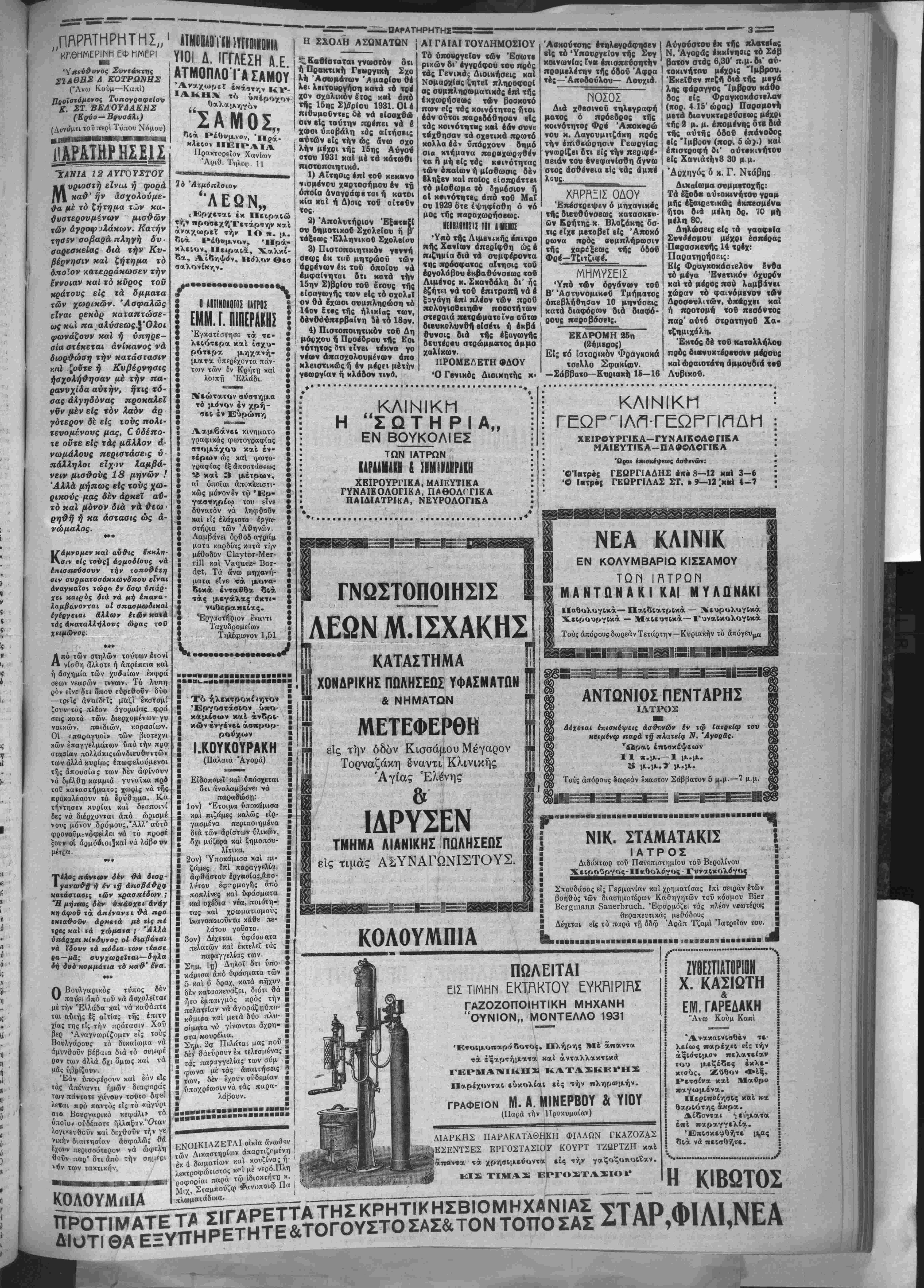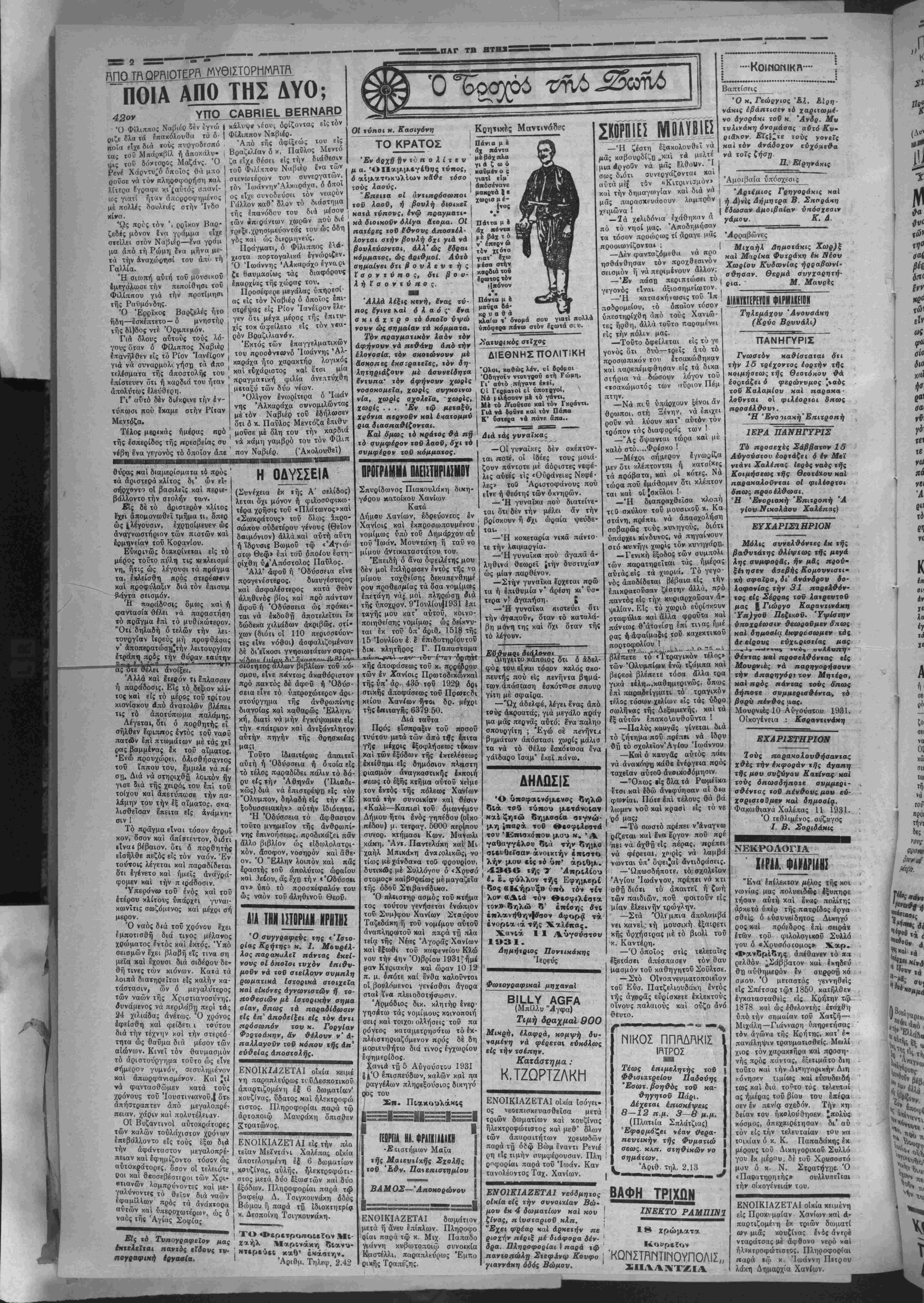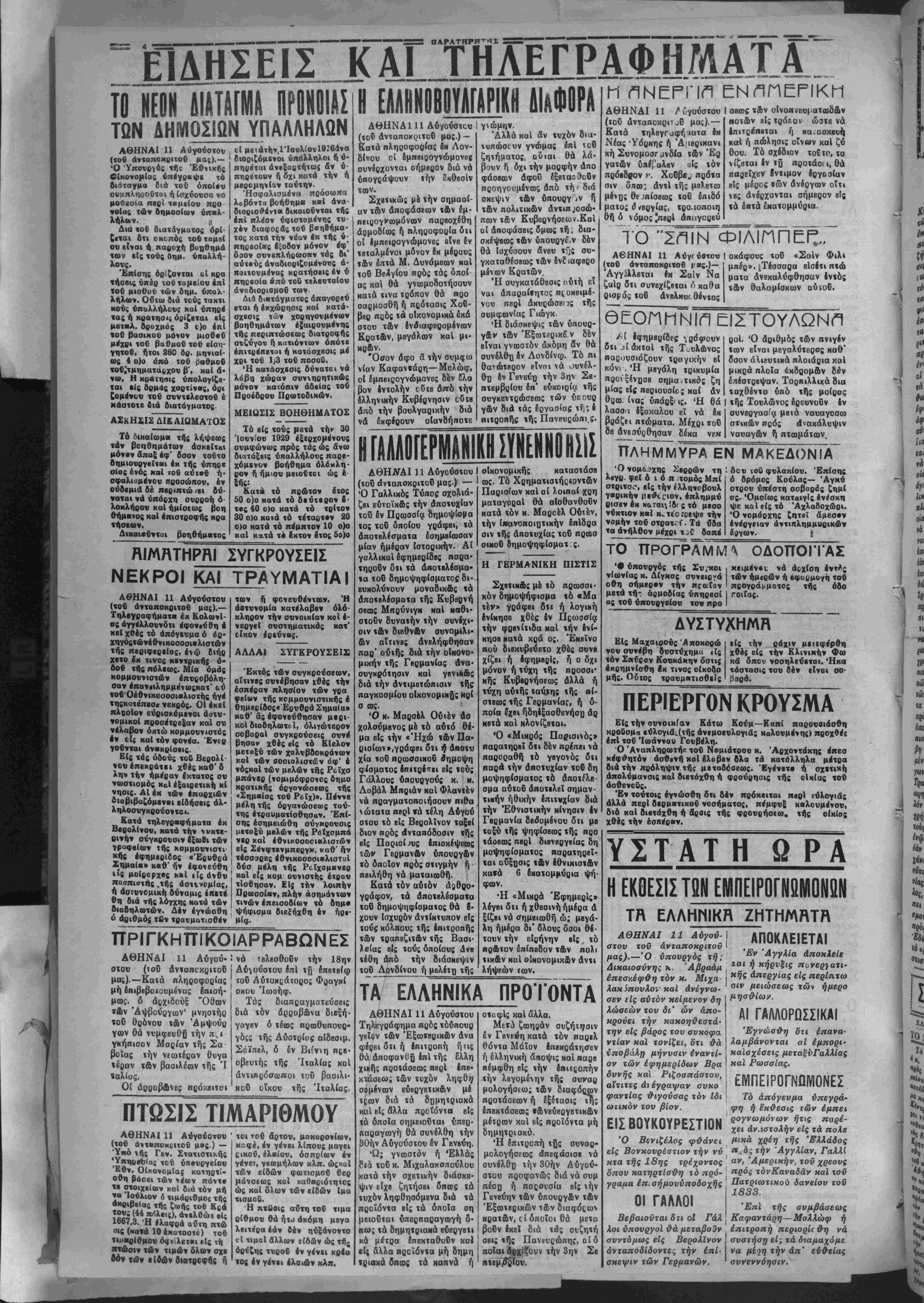ρισβν έκ χαται'δ< ς τό μεσο νύκτιον καί ΚντεΌΐοΒψβ την νομην τοΰ στρατ.ί. Τα ύδα τα άνήλθον μέχοι τ^ν δαπέ δόν τού φυλακίου. Έπίσης ό δρόμος Κούλας— 'Αγκΰ στρου υπέστη σοβαράς ζημί σς. "Ομοίως καταΐγίς ένέσκη ψε καί «(ς τό 'Αχλαδοχώρι. Ό νομάρχης ζητεί άμεσον ενέργειαν άντιπλημμυρικών εογων. ♦ ΤΟ ΠΡΟΓΡΑΜΜ^ ΟΔΟΠΟΙΊΑΣ ·· ύπουργός τής Συ,κοι νίωνίας κ. Δίγκσς σννβιργά οθη σήμερον την πΓαΙαν μβτά τή", αρμοδίας ύηηρεσί άς τοΰ νπουργβίου τον προ νά άοχίση έντΑς των ημερών ή βφαρμογή τοΰ πβογράμματος τής όβο Γθΐΐας. ΔΥΣΤΥΧΗΜΗ Είς Μαχαιοονς Αποκορώ νόν σννέβη βνστΰχημα ιίς τόν Σπΰρον Κουκάχην δστις έκρημνίσθη έκ τινος οΐκοδο μής. Ούτος τραυματισθιΐς βίς την ρώχιν μετΐφέρθη χθές είς την Κλινικήν Φω κά δπου νοσηλεύβται. Ήκα τάστασις τον δέν είναι σο¬ βαρά. ΠΕΡΙΕΡΓΟΝ ΚΡΟΥΣΜΑ Είς την συνοιχίαν Κάτω Κούμ—Καπί παρονοιάσθη κροδσμα εύλογιδ;(τής άνεμοβνλογιά; καλονμένης) προχθές επί τοΰ Ιωάννου Γονβέλη. Ο Άναπληρωτήε τοΰ Νομιάτοου κ. Αρχοντάκης έπεσ κέφθητόν άσθενή καί έλοββν δλα τα κατάλληλα μέτρα διά τίιν πρόληψιν τής μεταδόσεως. Έγένβτ· ή σχΐτικη άπολυμανσις καί διβτόχθη ή φρούρησις τής οικίας τοΰ ασθενούς. Έν τούτοις εγνώσθη δτι δέν πρόκβιται πβρί εύλογιδς άλλά περί δερματικοΰ νοσήματος, πέμφυξ κειλονμένον· διό «αί διετάχθη ή άροις τής φρονρήσεω. τής οίκΐσς χθές την εσπέραν. ΥΣΤΑΤ Η Η ΕΚ0ΕΣ1ΣΤΩΝ ΕΜΠΕ1ΡΡΓΝΏΜ0ΝΩΝ ΤΗ ΕΛΛΗΝΙΚΗ ΖΗΤΗΜΗΤγΙ ΑΘΗΝΑΙ 11 Αύγού· ότου τοΰ άνταποχριτοϋ μας).—Ό ΰπουργός τή; . , Διχαιοούνης η. Άβραάμ , Λα/ ηΛ^ρν}ις επεσκέφθη τόν κ. Μιχα λαχ ίπουλον καί ανέγνω¬ σεν εις αυτόν κείμενον δή λώαεών τού δι' ών άπο- κρούει την κακοηθεστά- την είς βάρος τού συκοφα ντίαν καί τονίζει, δτι θά υποβάλη μήνυσιν εναντί¬ ον των εφημερίδων Βρα δυνής «αί ΡιξΌσπάστου, αΓτιτες αι έγραψαν αυχο φαντίας ϋΊγούσας τόν ίδι | ωτικόν τού βίον. ΕΙΣ ΒΟΥΚΟΥΡΕΣΤΙΟΝ Ό Βενιζέλος φ&άνει είς Βονχουρέατιον την νύ κτα τής 18ης τρέχοντος δπου κατηρτίσθη τ ό πρό- γραμα έπ< σήμουϋποδοχής ΑΠΟΚΛΕΙΕΤΑΙ Έν Αγγλία άποκλείε _ ι ΟΙ ΓΑΑΛΟΙ Βεβαιούται δτι οί Γάλ λοι ύπουργοι θά μεταβοΰν συντόμως είς Βερολίνον άνταποδίδοντες την έπί- οχεψιν των Γερμανών. άπεργίας είς περίητω σιν μειώσεως των ήμερο μησθίων. ΑΙ ΓΑΛΛΟΡΩΣΣΙΚΑΙ Εγνώσθη ότι έπανα- λαμβάνονται αί έμπορι· καισχέαεις μεταξνΓαλλίας καί Ρωσσίας. ΕΜΠΕΙΡΟΓΝΟΜΟΝΕΣ Τό άπόγευμα υπεγρά¬ φη ή έκθεσις των έμπει ρογνωμόνων ήτις παρέ- χει αναστολήν είς τα πολε μικά χρέη τής Ελλάδος π^όςτήν Αγγλίαν, Γαλλ{ αν, Αμερικήν, τοϋ χρεους πρός τόνΚαναδαν καϊ τοΰ Πατριωτικόν δανείου τοϋ 1833. Επί τής συμβάσεως Καφαντάρη—Μολλώφ ή έπιτροπή περιορισθή νά συστήση εί; τα διαμαχόμε να μίοη την άπ' εύθείας συνεννόησιν.