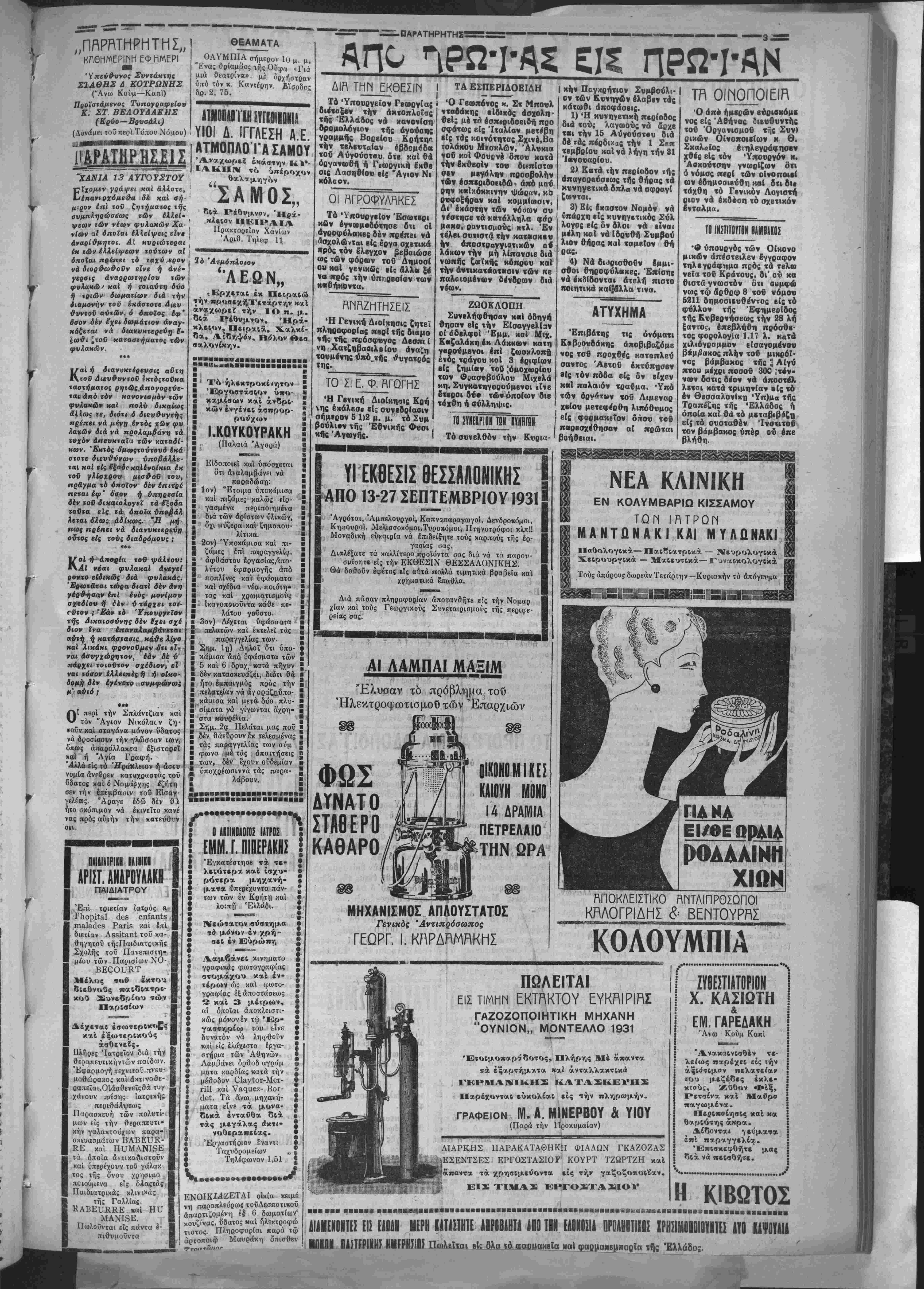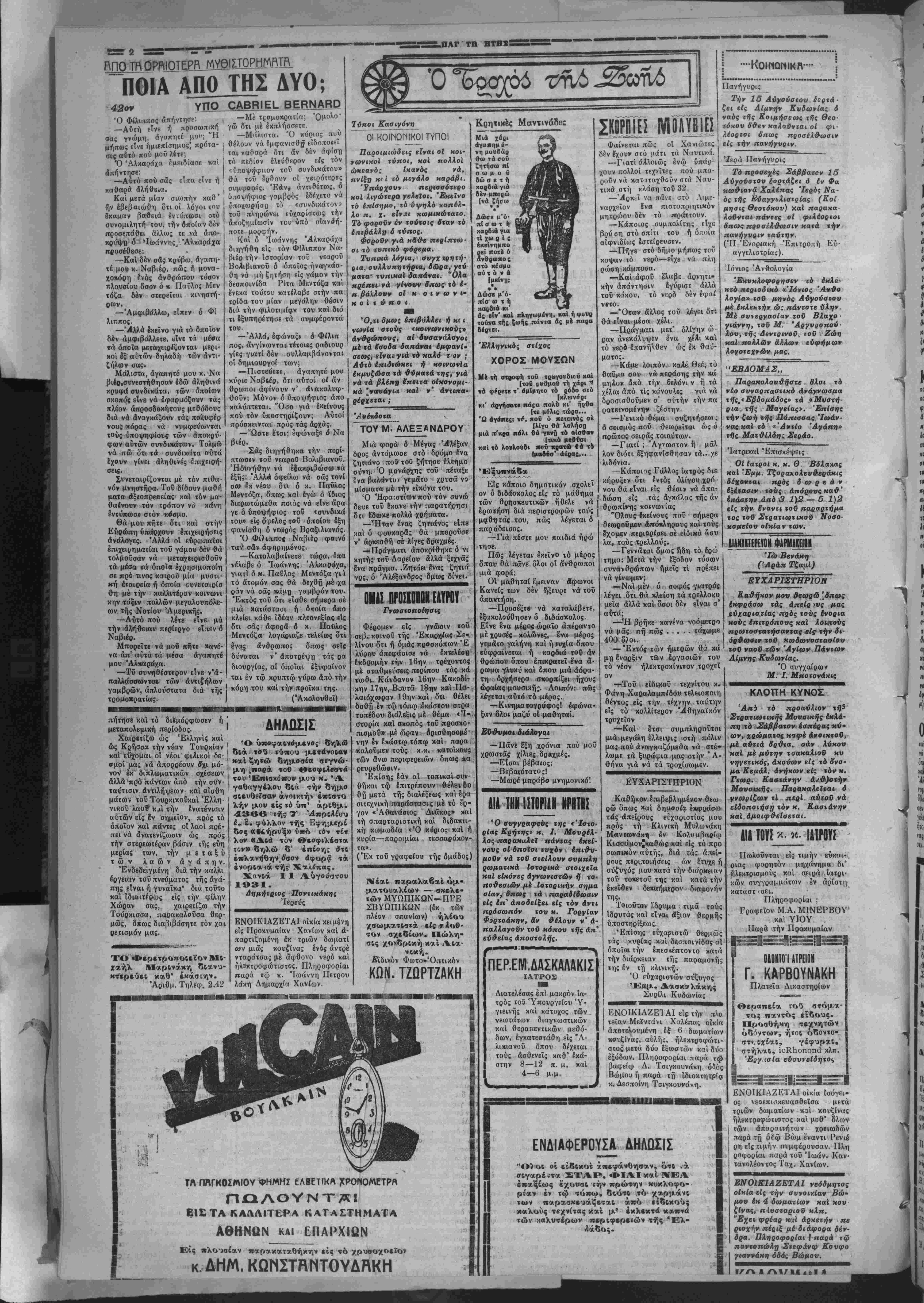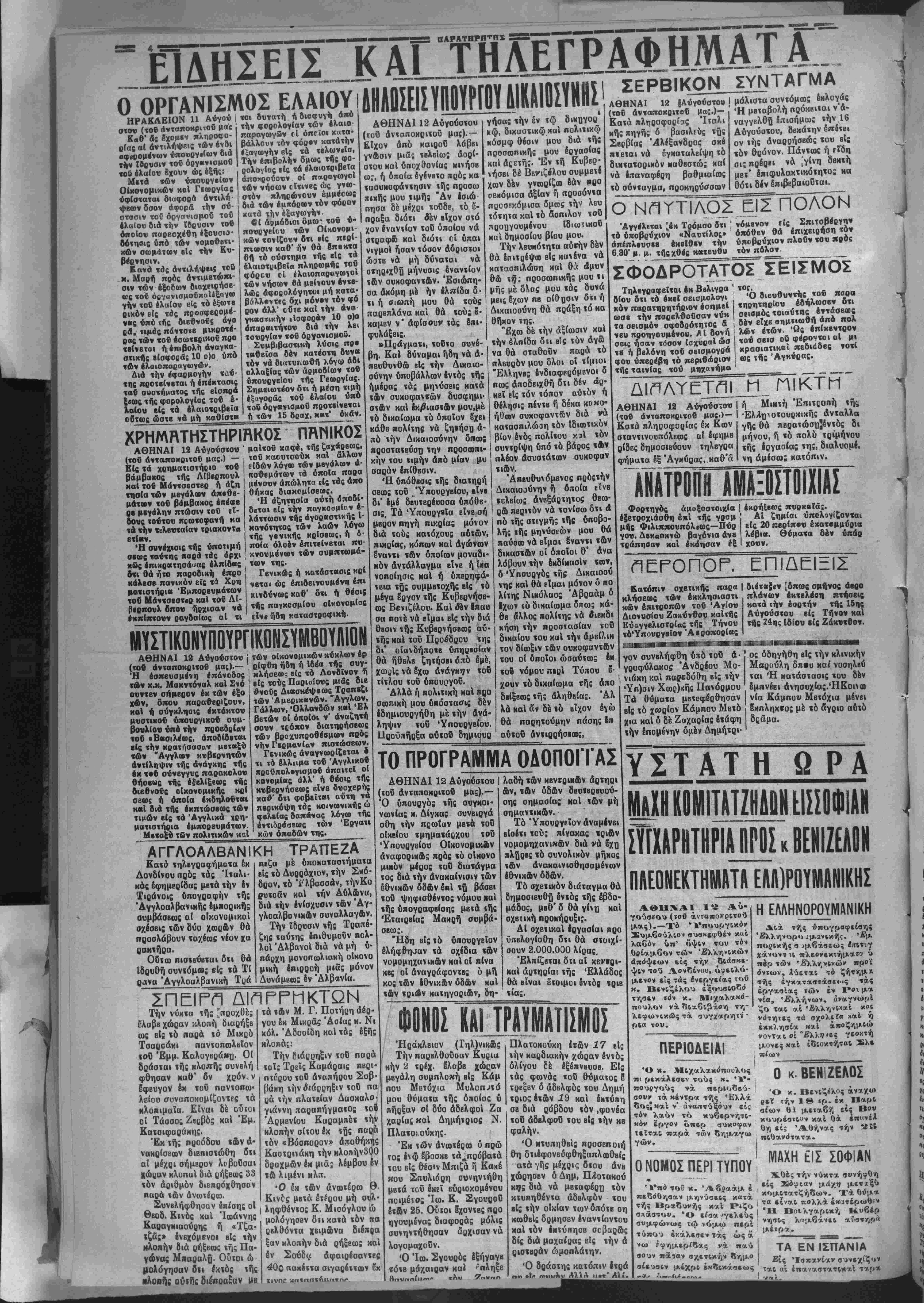 Ύπ)σιν Χωρ)<ϊίς Πανόρμον Τα θύματα μετεφέρθησαν είς «ό χωρίον Κάμπον Μβτό χια χαί δ δέ Ζαχαρίας ετάφη «ήν επομένην ό μέν Δημήχρι· ΙΙΙΒΙΙΙΙΙΙΙΙΙΐηΐΙΙΙΐαΐΙΙίΙΙΒΙΙΙΗΙΙΙΙΜΙΙΗΙΙΙΙ ος οδηγηθή είς «ήν κλινικήν Μαρούλη δπ·υ καί νοσηλβύ ται Ή κατάστασις «ου δβν έμηνέβι ανησυχίας.ΉΚοηω ν (α Κάμπον Μετόχια μένει ΒΉπληκνος μέ «ό δγριο αΰτό δςαμα. ΥΣΤΑΤ Η Ω ΡΑ Η&ΧΗ Κ0ΜΙΤΑ1ΖΗΑΟΝ βΦί ΣΥΓΙΑΡΙΙΤΙΙΡΙΑ^ΙΙΣ - ΒΕΝΙΖΕΛΟΝ ΠΑΕΟΗΕΚΤΗΜλΤλ ΕΙΜΡΟΥΜΑΝΙΚΗΣ ΑΘΗΝΑΙ 1% γούστου (τού άνταπονρΐτού μας).—Τό Υπουργικόν Συμβούλιον βυακ£φθέν καί λαβόν ύπ' όψιν τού τόν θρίαμβον τώ* Έλληνικών άπόψεων είς την διάσκε¬ ψιν τού Λσνδίνου, όφεΐλό- μενον είς τάς ενεργείας τοΰ κ. Βενιζέλου έξο^αιθδά τηαεν τόν κ. Μιχαλακό¬ πουλον νά δΐαοΊβάση τη- λεφωνικώς τα συγχαρητί - ρΐα τού. ΠΕΡΙΟΔΕΙΑΙ Ό κ. Μιχαλακόπουλος π« ^εκάλεσεν τούς κ. *ν- πουβγούς νά περιοδεύ- αουν τα κέντρα τής Έλλά δος, «αί ν' άναπτύξόυν είς τόν λαόν τό κυβερνητι¬ κόν έργον όπερ ουκοφαν ΐείται παρά των δημαγω γών. Ο ΝΟΜΟΣ ΠΕΡΙΤΥΠΟΥ Υπό τοΰ κ. Άβοααμ έ «εδόθησαν μηνύσεις κατά τής Βραδυνής *% ρ4ζο αηάατου. *Ο εισαγγελεύς συμφώνως τώ νομώ περΐ τύπου εκάλεσεν τας ώς ά νω εφημερίδας να παύ σουν πάσαν σχετικήν βημο μέχρι έκϋικάσεως Η ΕΑΑΗΝΟΡΟΥΜΑΝΙΚΗ Δια τής ύπογραφείβης Έλληνορο ^μανικής. '-μ πορΐκής ο .ιμβάσεως έπΐτιγ χάνοντ τι πλεονεκτήματν υ πέρ των Έλληνικών προ'ί άντων, λύεται τό ζήτημ* τής εγκαταστάσεως τας εργασίας των έν Ρο μα νία, '_Κλήνων, άναγνωρΐ ζθ Ταΐ αί '£λληνΐκαί κοι νότητες τα σχολειό καί ή έκκληαία καί άποζημΐώ νονται οί Έλλη^ες γεοκτή μονες καί ιδιοκτήται Σλε πίων ΒΕΝΙΖΕΛΟΣ Ό κ. Βενιζέλος άναχω βεΐ την 18 τρ. έκ Ηαρΐ σίων θτ μεταβή είς Βσυ κουρέατιον καί θά επιινέλ Θη είς Αθήνας την 2» ηΐθανότατα. ΜΑΧΊΗ ΕΙΣ ΣΟΦΙΑΝ Χθες την νύκτα συνήφθη είς Σοφίαν μάχη μετλξύ κομιτατζηδων. Τα θύμα τα είναι κολλά εκατέρωθεν Ή Βοιλγαρική Κυβέρ νησίς λαμβάνεΐ αύστηρά μέτρα. ΤΑ ΕΝ ■Είς Ισπανίαν βυνεχίζον αί επαναστατικαί ταρ» ι