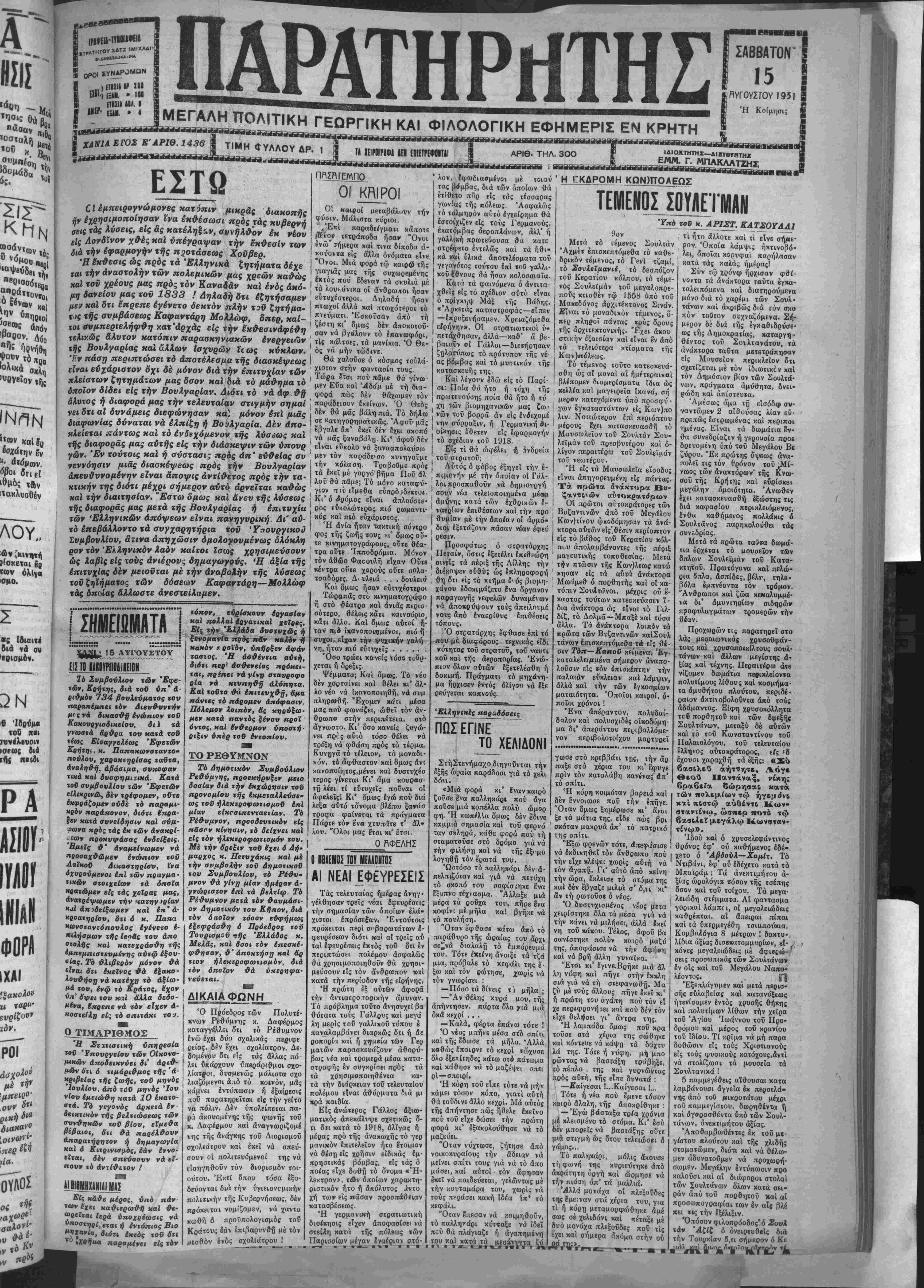 ΜΕΓΑΛΗ ΠΟΛΙΤΙΚΗ ΓΕΩΡΠΚΗ ΚΑΙ ΦΙΛΟΛΟΓΙΚΗ ΕΦΗΜΕΡΙΣ ΕΝ ΚΡΗΤΗ