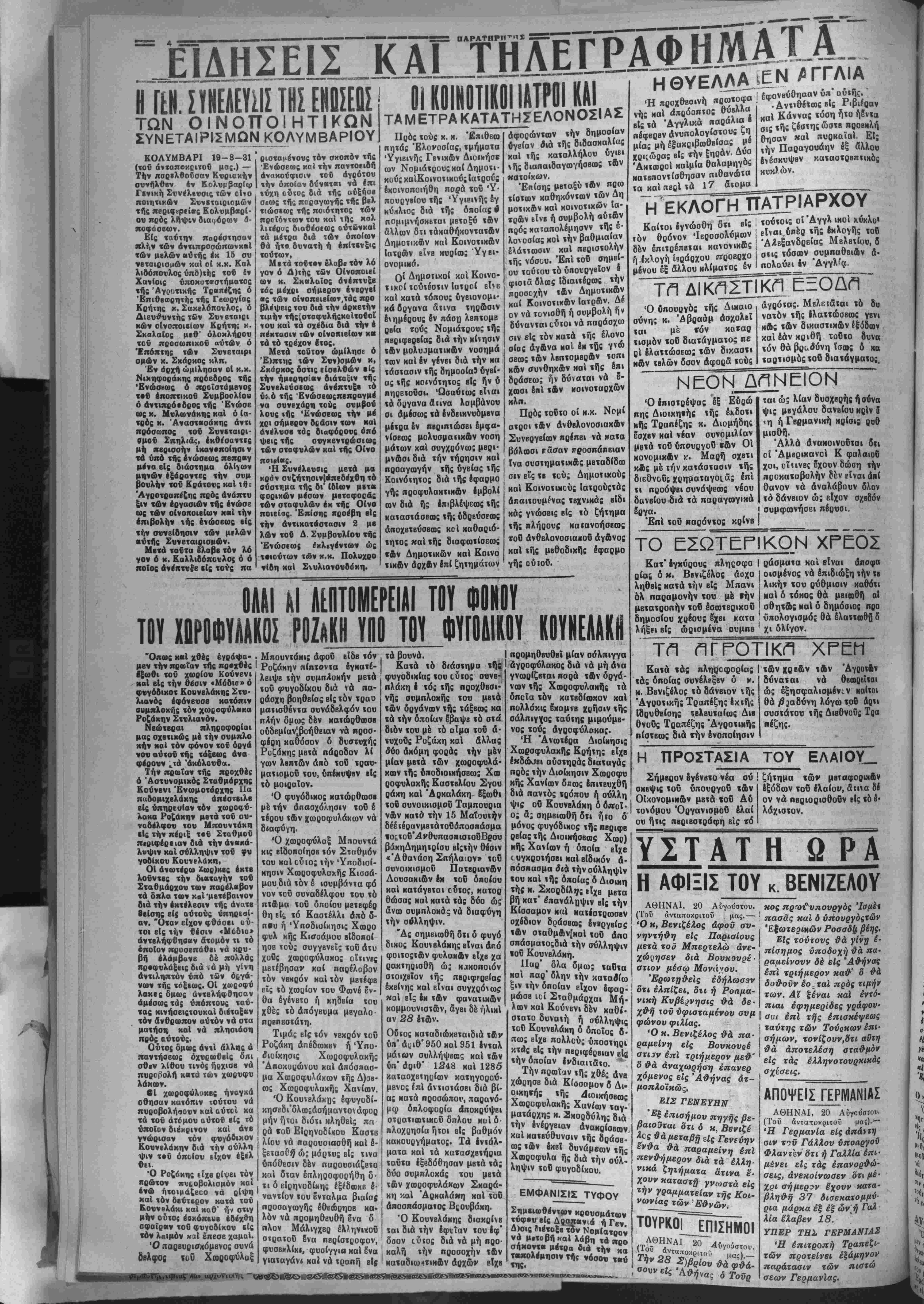 τη δ1κ(5στϊκ<1--Ο_(Ί Ό ΰπονργός τής Δικαιο σύνης κ. 'Δβραάμ άσχολίϊ «αι μέ «όν καταρ τισμόν «οδ διατάγματος ηε ρΐ βλαττώσεω; των δικαστι κων τβλών δσον άφορα τούς αγρότας. Μβλείδται τό δυ νατόν τής Ιλαττώσβως γβν ι κως των οικαστιχων έξόδοον καί δάν κριθή τοθτο δυνα τόν θά βραδύνη ΐσοος δ χά ταρτισμδςτοθ διατάγματος, ΝΕΟΝ ΔΆΝΕΙΟΝ Ό επιστρέψας εξ πης Διοικηβήί τής έκδοτι κης Τραπέζης κ. Διομήδης έσχεν καί νέαν ουνομιλίαν μβτά τοθ υπουργόν1 »ων Οί κονομικ&ν γ. Μαρή σχβτι κ&ς μβ την κατάστασιν «ής διεθνοδς χρη|ίαταγοι.ας δπΐ τι προόψΒΐ συνάψβως νέον δανείον διά τα παραγοογικά δργα. Επί «ου παρόντος κρ·νβ ται ώ; λ(αν δνσχβρής ήούνα ψις μβγάλου δανείου χρίν 8 <η ή Γβομανική ποίσις ουθ μισθϊ). Άλλά άνοΝΟΐνοΟται δΐι οί Άμβριχανοί Κ φαλαιοδ χοι, οΤτινβς δχουν δώση την πς;οκατοβολήν δεν είναι απί θανον νά άναλάβουν δλον τό δάνειον ώ; είχον σχβδόν συμφοονήσει πέρυσι. ΤΟ ΕΣΩΤΕΡΙΚΟΝ ΧΡΕΟΣ Κατ' έγκύρονς πληςοφο Ι ρίας δ η. Ββνιζέλος άοχο ληθβίς Ματά «ήν είς Μπανι όλ παραμονήν «ου μβ ιήν μετατροπήν «οδ έσοοτΒρικοδ δημοσίον χρέονς §χει κατα λήξβι βΐς ωρισμένα ουμπε ράσματα καί είναι άποφα οισμένος νά επιδιώξη την «β λικητ «όν ρύθμισιν καθότι καί δ τΟΜος θά μβιωθή αί σθητως καί δ δημόσιος προ ϋπολογισμόί θά ελαττωθή δ χι ολίγον. τη πγροτικπ χρεμ Κατά «άς πληροφορίας Ι των χρε&ν των Άγαοτ&ν «άς οποίας σννέλϊξβν δ κ. η. Ββνιζέλος «ό δάνειον τής Άγροτικής Τραπέζης έκτής Ιδρυθείσης ΤΒλβυταίοος Διβ θνονς Τραπέζης Αγροτικάς πίστεοος διά νήν δνοποίησιν Η ΠΡΟΣΤΑΣΙΑ ΤΟΥ ΕΛΑΙΟΥ_ ζήτημα των μβταφοριχ&ν ίξόδων τοθ ελαίου, ά*«ινα δέ όν νά ΠΒριορισθοδν είς «6 δ· λάχιστον. χρ δύναται νά θεωςεΐιαι ώ; έξησφαλισμένιν καίτοι θά βραδύνη λόγω τοθ Αρτι συστάτου τής Διβθνονς Τ πέζης. Σήμερον έγένβτο νέα ού σχβψις τοϋ νπουργον των Οικονομικήν μβτά «οθ Δν τονόμου ΌργανισμοΟ δλαί όν ήτις πβριβστράφη είς τδ ΥΣΤΑΤ Η Ω ΡΑ Η ΑΦΙΞΙΣ ΤΟΥ κ. ΒΕΝΙΖΕΛΟΥ ΑΘΗΝΑΙ. 20 Αΰγούστου. (Τοϋ άνταποκριτου μας.— Ό κ, Βενιζέλος άφοϋ συ¬ νηντήθη είς Παρισίους μετά τού Μπερτελώ ανε¬ χώρησεν διά βουκουρέ¬ στιον μέσω ΛΓονά;/ου. Ερωτηθείς έδήλα>03ν