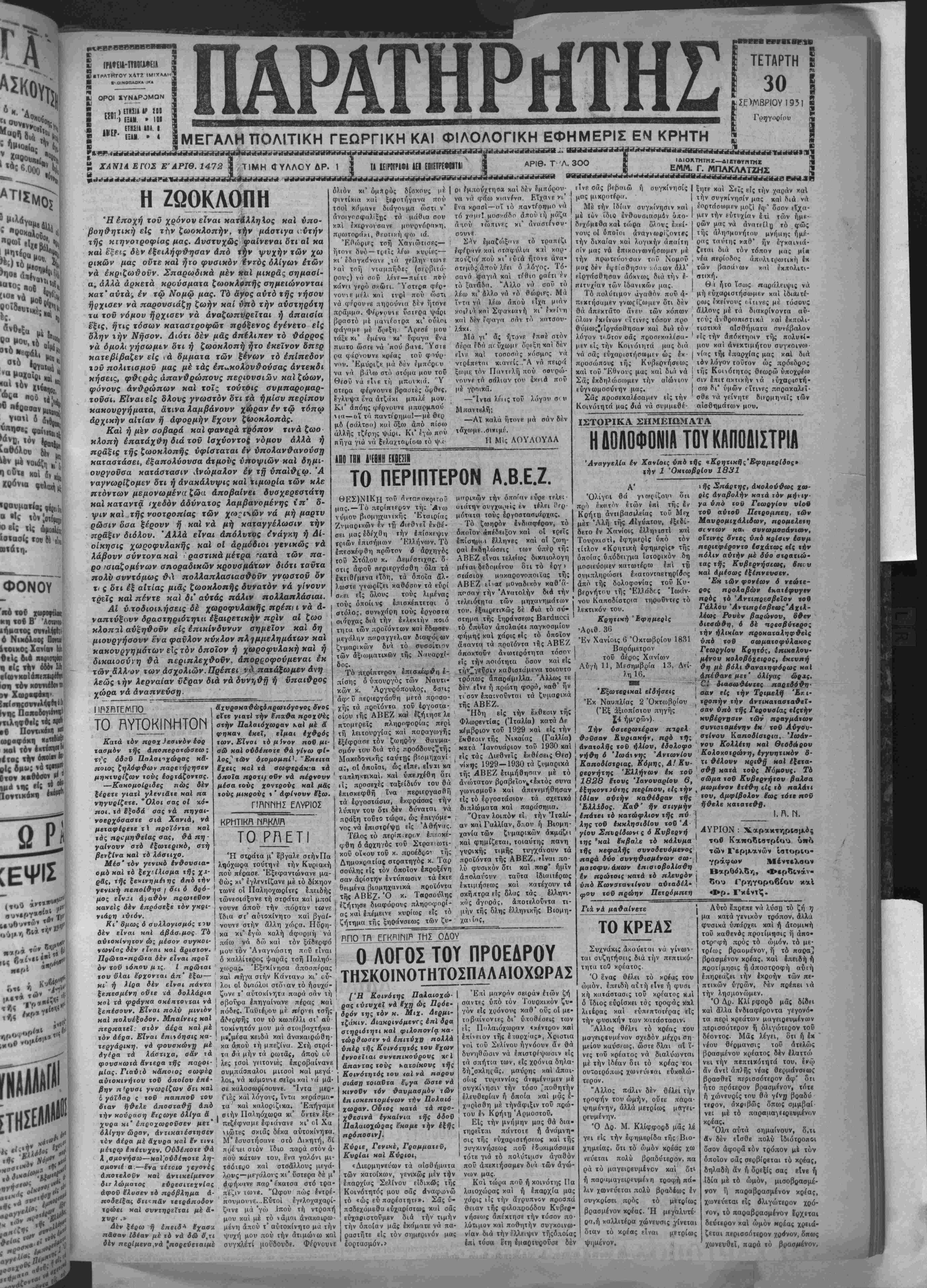 πολν συντόμως θ< πολΛαπλασιασθοΰν γνωστόν όν τ· ς ότι εξ αίτίας μιάς ζωοκλοπής δυνατόν νά γίνουν τρείς καί πέντε καϊ δι' αύτάς πάλιν πολλαπλάσιαι. Αί ύ.τοδιοΐλήσεις δέ χωροφυλακής πρέπη νά ά- ναπτύξονν δραστηριόζηια εξαιρετικήν πρϊν αί ζωο κΧοπιΙ αύξη&οϋν είς επικίνδυνον σημείον καί δή μιουργήσονν ενα φανλον κύκλον πλημμελημάτων και κακονργημάτων εις τόν οποίον ή χωροφνλακή και ή δικαιοσύνη Θά περιπλεχθοΰν, άπορροφούμεναι έκ τώνβλλ'ον των άσχολιών.Πρέπει νά παιάξωμεν ά·η λεως ι ην λερναίαν νίραν διά νά δυνηθή η υΉαιθρσς χώρα νά ά ν απνευστί. άχυρσκαθώςδπρωιόγονος ό'νος είτε γιατί την έπαθα προχίϊες στήν Παλαιόχωοαν χαί μέ ά φηκαν έκεϊ, εϊμαι έχ&ρός των. Είναι τό μίνον πού μι- αω καί ουδέποτε θά γίνω φί- λσς^' των διομομπίΚ "Επειτα έχεις καί τα σωσοεβάκ.-α τα δηοΐα ποοτι/ οΰν νά πέρνουν μέσα τούς χοντροϋς καί μάς τούς μιχοονς « ' άφίνουν έ|ω. ΕΛΥΡΙΟΣ δλιόν κι' όμΛρός δίσκους |ιρ φιντίκια κιιί ξεοοτήγανα <τον τσοί κιίμανε διιίγοτ μα ώστι ν* άνοιγοσφαλίξ'ης τα μάθια σου καί Ικερνουσανε μονρνόραχη, πρωτοοάκι, ίε-οτιχή φω ιά. ΈΪΜΟριες τοή Χανιώτισες— ήτσνε δνό—τ^εΐς Χίω χυρίες— χι'έδαγκίνανρ ,τά χείλην τωνρ >·αί τσή νταμπήδες (σερβιτό-