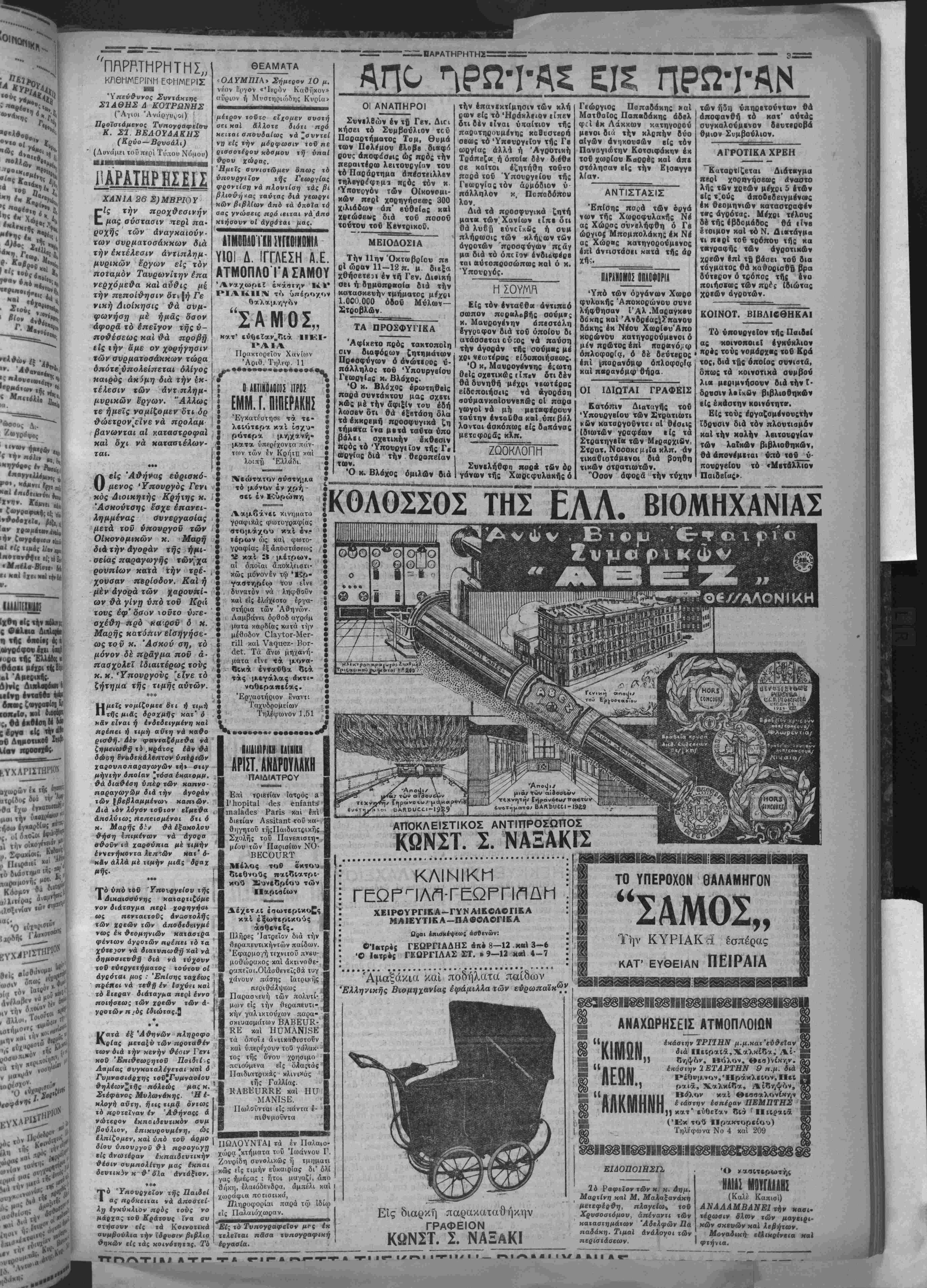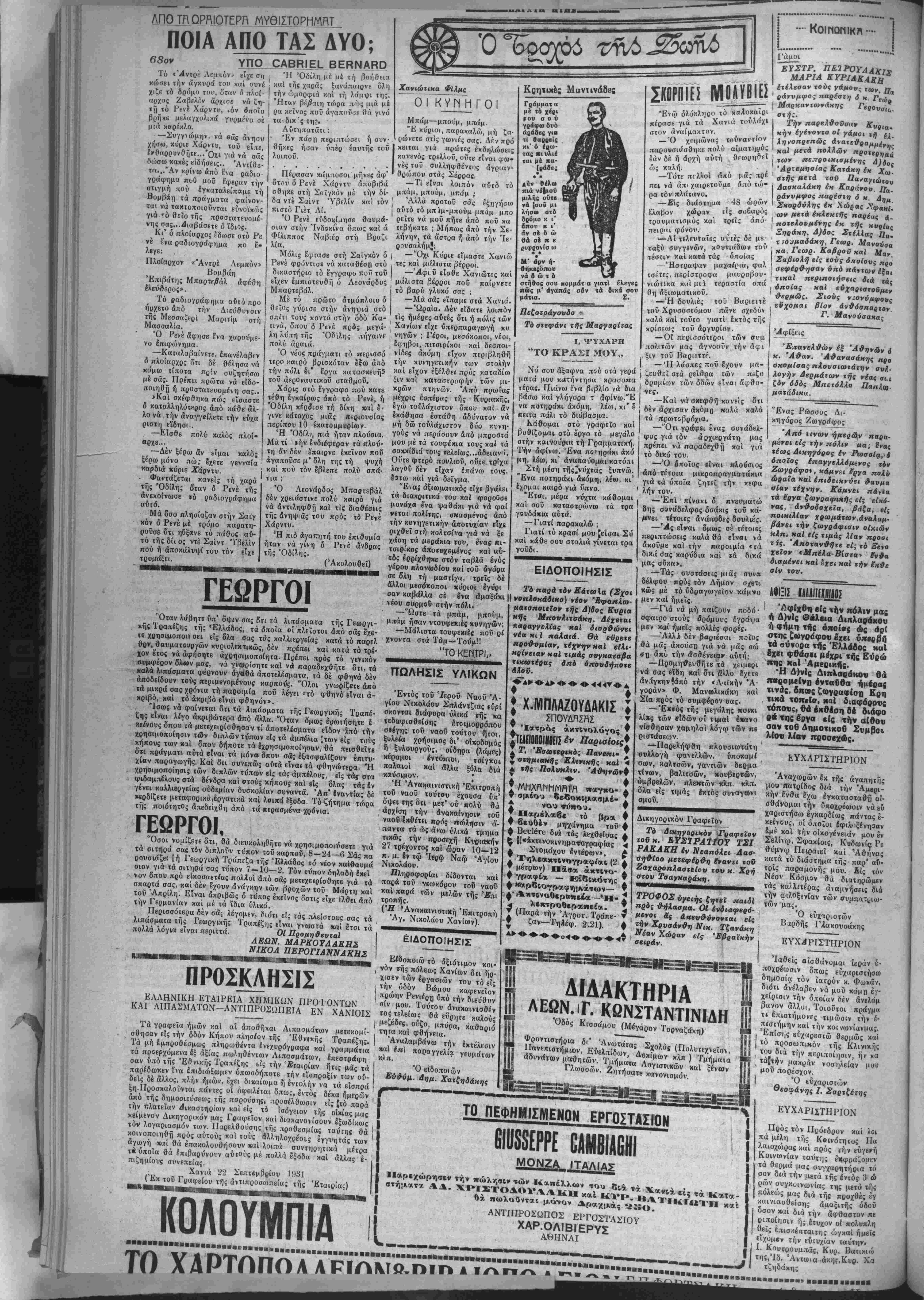 _Η έμαζ«')ξ<ινρ τό τραηεζι έφίρκνρ καί σταφύλιηι κ ίί χαρ- πονζιπ' πού χι" εύτά ήτονε άνα- οτρμός απού ?.ερι ό λόγος. Τό- σανά 'φαγιά κηί τίθιο ραέτι έν τό ξανθδπ. "Αλλο νά σοΰ τό λέω χι* δλλο νά τΛ θώριρς. Μά ίντα νά λέω απού ίΐχα μίαν κοι?ΐ'< κπί Σφακιανή κι' έκείνη κπί δ?ν εφαγα σιΐν το κιΐτσου- Μά γι' άς ήτονρ ίηαέ στόν πέρη ?δπ πουχωμε δοεξη κπ) δέν εΐνρ «αί τοσοσάς κόσμος νά ντρέπετηι κιαντίς ."Α νά πειοά ξοιμε τόν Παντελή πού σουρώ- νσυνρ τή σάλιαν τον έκπά ττοΰ —"Ιντα λέιις τοϋ λόγον σ· υ Μκαντκλή; —Αΐ καλά ?)τορ μά σάν δέν τδχωμρ.,σικιμΓ. II ΜΙς ΑΟΥΛΟΥΛΑ ΑΠΟ ΤΗΝ .'ΕΒΗΙΙ ΤΟ ΠΕΡΙΠΤΕΡΟΝ Α.Β.Ε.Ζ. ΤΟ ΗΥΤΟΚΙΙΗϋΤΟΜ Κατά τόν προχθεσινόν έοο ταομδν τής άπσπεοατώσεαι; τ»"ς όδού Πολσι-'χώβας η&- ποιος ζηλόφθων τταρετήρησεν μηκτυοίζων «ούς έοοτάζοντσς. —Κακομοίριδες «ώς δέν ξέοετε γιατί γΧενιάιε καί πά ε. Όλοι σας οί κό- τα ϋξοδά σας νά πηγαι- νσερχάσαστε σία Χανιά, νά μβταφέοετετΐ προϊονΐα καί τος πρι.μ?ΐθείας σας, θά πη- γαίνουν στό έξωχερικό, στή βενζίνα καί τό λάσιιχσ. Μέσ'τόν γενιπό ένθσυσια- ομδχαΐ τό ξεχ-ίλισμα ιής χα- ρβς, τής ξεχινημέιης άπό την γβνική πεποίθησ / δα ό δοό- μος είν^ι ά; αϊ?όν πρωιεύον «ανείς δέν έπρόσεξε τόν γκρι- νι&αν ινιόν. Κι' δμως δ αυλλογιομός τού δέν είναι καί άβάσ.μος Τό | αυτοκίνητον ώς μέσον ουγχοι- | νωνίας δέν ιϊναι παΐ Άριστον. Ι Ποώτα-ηρώια δέν είναι προϊ όν τοϋ τόηον μ ΐς. ί ποώΐαι τού ϋΚαι έ'οχονται άη' έ'ξω — ηι' ή Ηοα δέν είναι πάνζα ξεπεομένη οϋιε χά δολλάρια κσί τα φράγκα σχέητο·ται νά ζεπέσονν. Είναι πολν μινιον καί πολνέξοδον. Μπαίνεις καί περπατεϊ. στόν άερα «αί μέ τόν άέρ,α. Είναι έπιιόησις κα- τεργάρικη, νά φουσπών^ μέ Λγέρα τα λάοτιχα, σάν τα φονθχωτά άντερα τής ηαροι· μΐας. Γιαύΐό κάπσΐο; αωφεβ αύιοΗΐνήτου τού όηοΐον έηέ- β ην ττ-ρυσι γνωβΐζων όη καί ό γάϊΛαρ ς ζοϋ ηαηηοϋ ΧΟΧ) όΊαν ή&ελε άηοατα&ϊ) άπό την πούραση Βιςωγε ολίγα ά χυοα ηι' έηροχωοοΰσεν μετ* όλΐγην ώραν, άντικατέστηαεν τόν άέοα μέ άχνοα «αί έν τινι μέτςω έηέτνχεν. Ουδέποτε θά λ ,σμονήσοο—ΗαΙ,ούδέποιε λη- σμονιέ α —ένα τέτοιο ]ενονίς άποτελοΰν καΐ αντικείμενον διχ λώματος ΐύβεοιτεχνΐας άφοϋ έλυσεν τό πρόβλημα ά- ποδζΐξας όΊιζπ&ν τετοάποδον τοώει καί σνντηοεΓται μέ ά- χυρ>.»