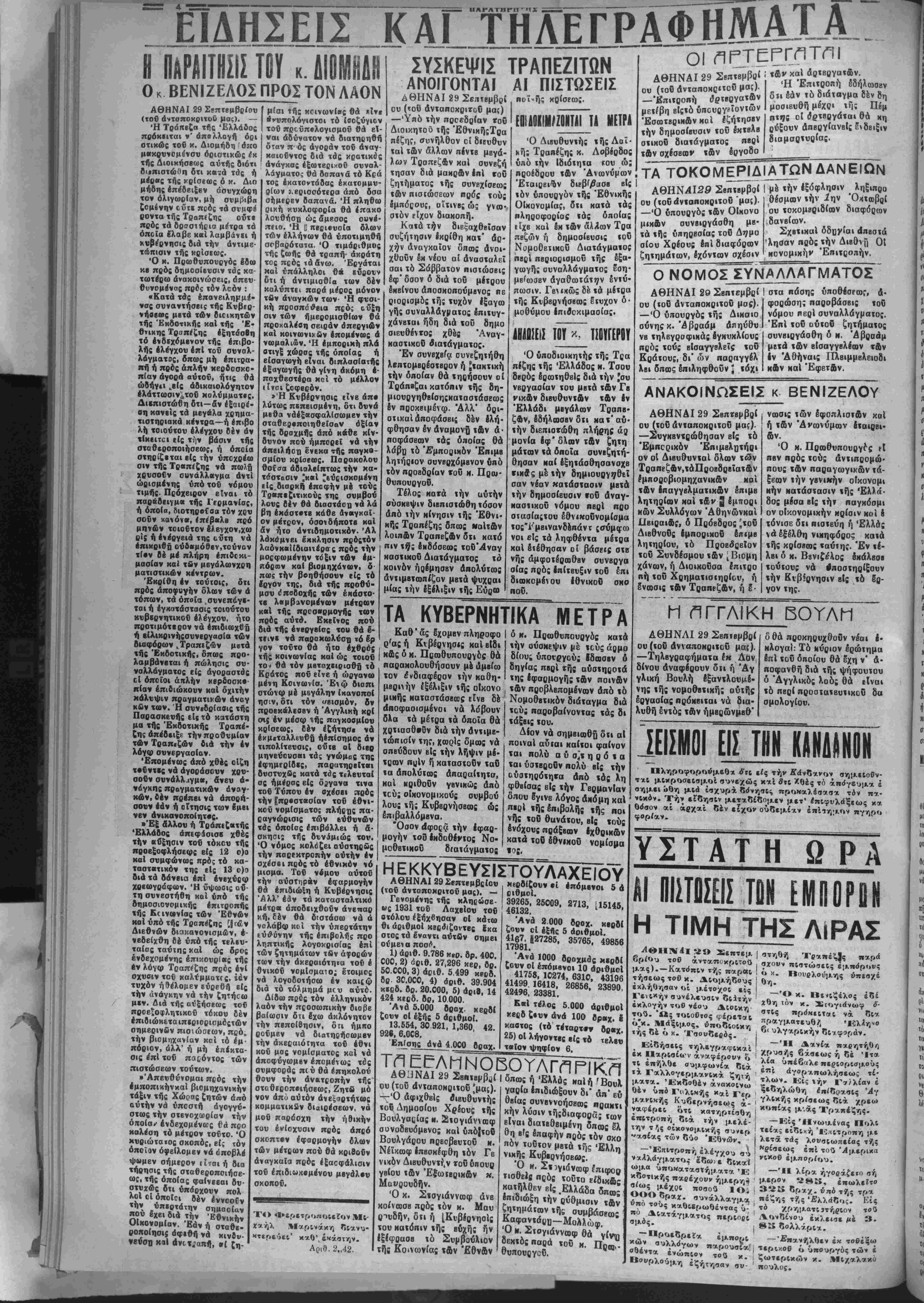 εκ Ι1αρΐαί<τν άνκφέηονν ό τι επήλθε συμφωνέα διά »ά Γαλλογερμανΐκά ζητή ματα. 'Έκδοθέν άνακοινω Θέν υπό Γολΐκής κα^ γ·ε(ί μανι«ής Κυδερνήαεως ά- ναφέρεΐ ότι κατηρτίσθη εβΐτροπή διά την μελέ¬ την τ ^ς οίχσνομΐχής βχ»»ερ "ααίας των Πύο Έθνι3ν, —'Έπΐτρσπή έλέγχου βυ ναΛλάγματο» ϋΤίοοι ε δΐκαΐί ωμα ύποκαταατήμ ατα έ κοοχΐκής —αρέχονν ήμερη^ ' «ϊίως μέχρι -οβΟυ 10. . ΟΟΟδραχ. βυνάλλαγμα υπο τους καθΐβρωθέντας ύ- πό Δΐα.τάγ|ΐ.ιατος πεοιοοι βμ»ς. έμπο^ι βτηθή Τραπέζΐς παρά σχουν πιβτώσεις εμπόρους ό κ. Βουρλούμης ύπεσχέ Θη. — Ό κ. Βενιζέλος έ6ί χθη τόν κ. Στογιάνωφ ό'- ατΐς ηρόκειται νά δι* — 'ΙΙ Δανία παρητήθ/, χρυαής δάαεως ή δέ Ίτα λέα υπέβαλε περιορισμούς επί άγο^Απωλήσεως τί· τλων. κ£ς ήν Γ»;λίαν έ ξεδηλώθη έπ/δραβις Αγ γλΐκής κρίσεως διά χρεω κοηίας μ·.άς Τίι-/.ϊιέζης. — Είς 'Ηνωι».ένας ΠολΙ τείας είδΐ«ή Ίίπιτροπη με λετά τάς λοναιωπείας τής κρίσεως επί τού Άμερικα νικοθ έί ρρία «ών συλλόγων σθ ενώπιον τού κ —'ΙΙ λίρα ήγοράζετο σή μερον 28Κ, έπωλε?τσ 3*ί» δραχ. ύηό τής τρα πέζης τής Ελλάδος. Είς τ0 χρηματιστήριον τοΰ Λονδίνου έκλεισε μέ 3. βϊ» δολλάρΐα. —"Επανήλθεν έ« τούεξω τερικού ό ύπουργός των έ ζωτερΐχών κ. Μλο πουλος.