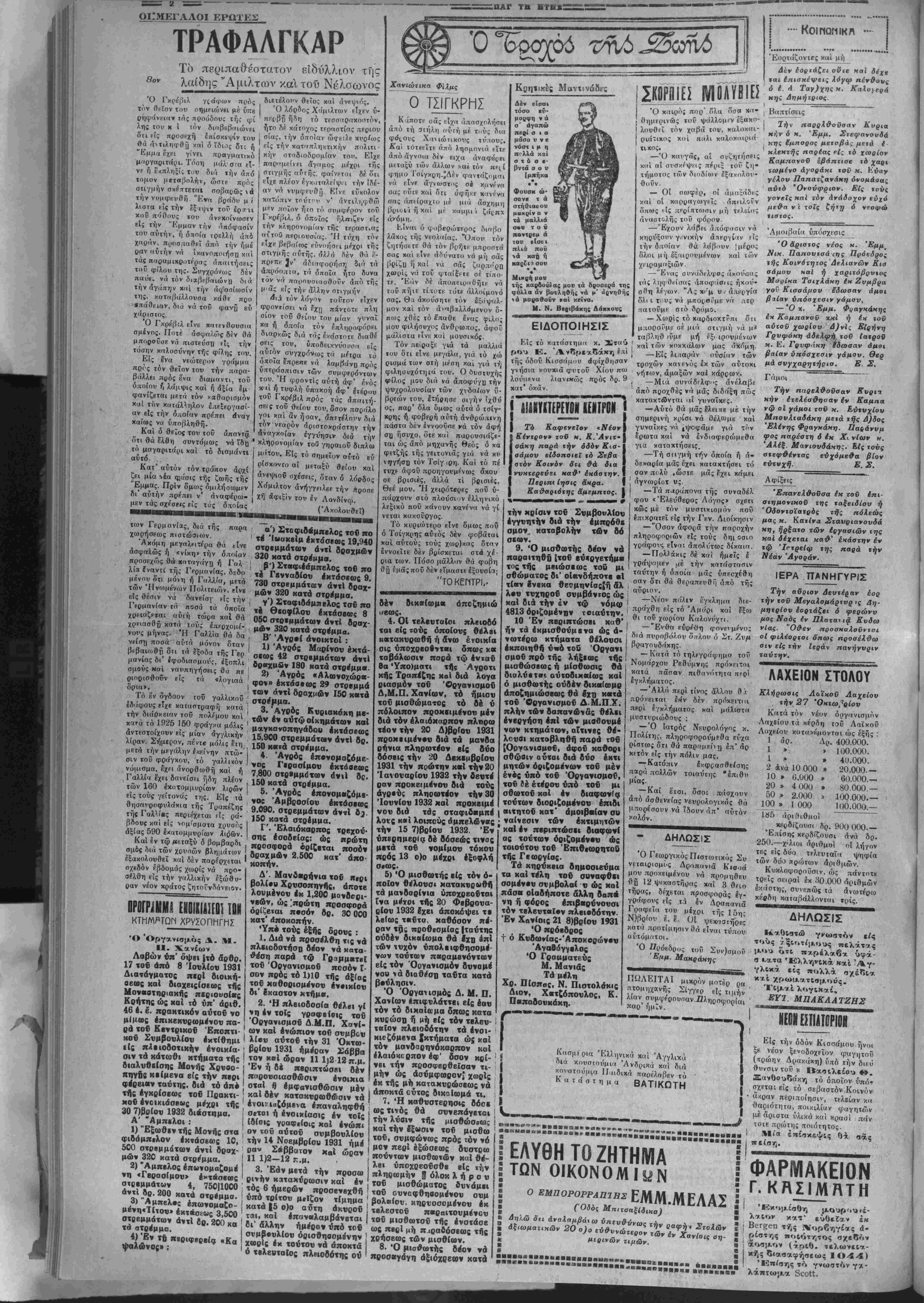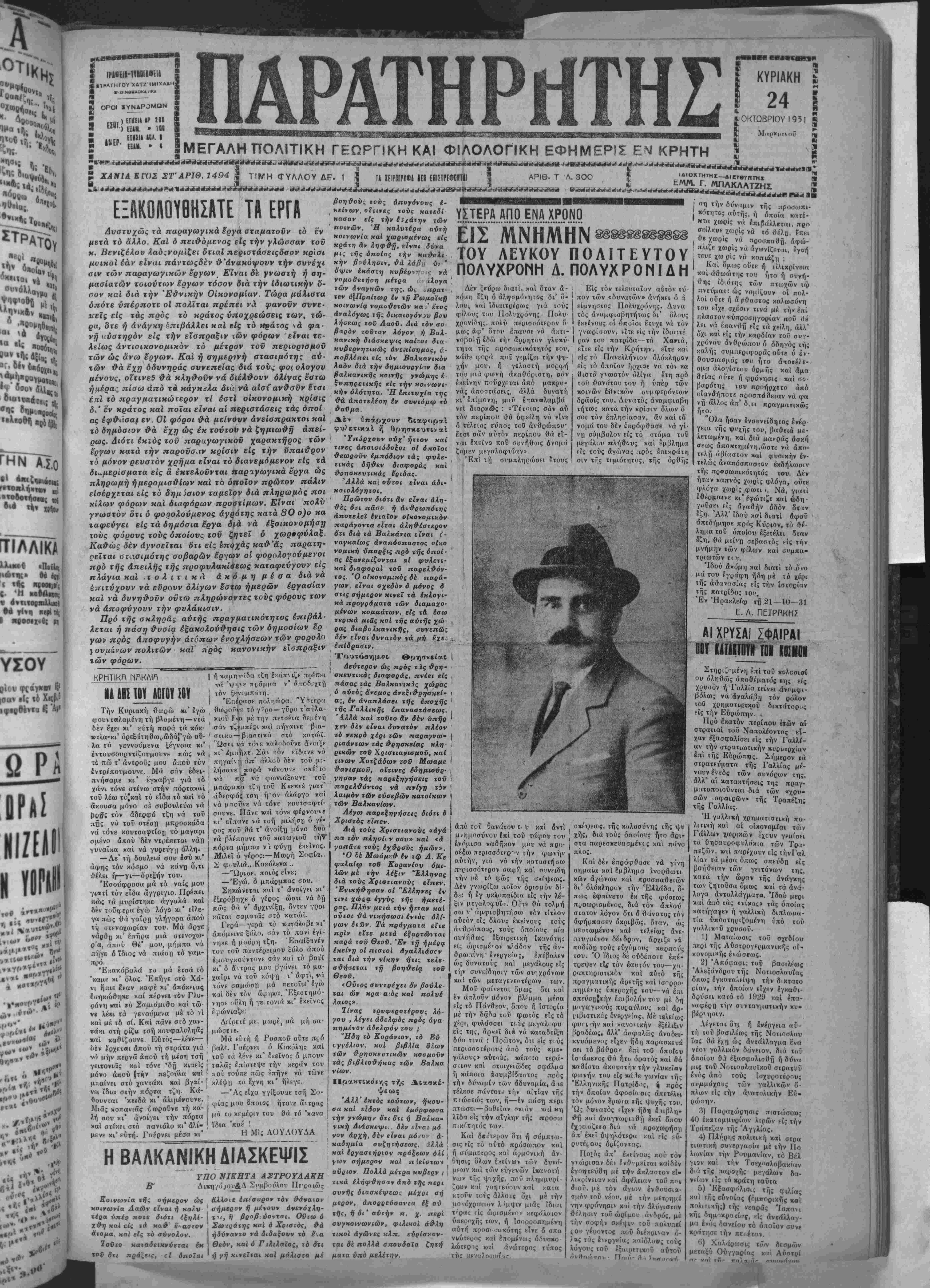 κυβερνητικάς άνεπίσημος, <.- ποβλέηει είς ίόν Βαλκανικόν λαόν διά την δημιονργίιιν δια βαλκανιχής χοινής γνώμης έ ζνπηρετιχής είς την κοινωνι¬ κήν όλότητα. Ή έπιτνχία της θά αποτελέση έν ανντόμφ τό θαύμα. Δέν υπάρχον·» διαφοραί φυ/ετικ*ί ή θρησκευτΐν αί Ύηάρχονν ούχ' ήττον καί τίνες άπαισι^όοξοι οί οποίαι θεωροΰν έμπόδιον τα; φυλε- τιχάς δήθεν διαφοράς καί θρησκευτικάς βριδας. Άλλά χαι ούτοι είναι άδι- καιολόγήτοι. Πρώτον διότι &ν είναι άλη- θές ότι π&σο ή ανθρωπότης αποτελεί ενιαίον οικονομικόν παράγοντα εΐται αληθέστερον ό'τι διά τα Βαλκάνια είναι ί- ναγκαίως άναπύσπαοτος οΐχο νομιχή ύπαρξις πρό τής δποί· άς έξανεμίζονται αί φνλετι· καί διαφοραί τού παρελϋ·όν- τος. Ό οΐκονομιχύς δέ παρά· γων, είναι αχεδόν ό μόνος δ οτις σήμερον κινεΐ τα έκλογι· κά προγράματα των διαμαχο· μέν ών κομμάτων, είς τα έσω τερικά μιάς χαΐ τής αυτής χώ¬ ρας διαβολκανικής, συνεπώς δέν είναι δυνατόν νά μή έ'χε. ΑΠΟΕΝΑΧΡΟΝΟ ΤΟΥ ΛΕΥΚΟΥ ΠΟΛΙΤΕΥΤΟΥ ΠΟΛΥΛΡΟΜΗ Δ. ΠΟΛΥΧ Ρ Ο ΝΙΔ Η Λέν ξεύρω διατίι χ«ί δταν ά- ι χόμη ί'ζη δ άλησμόνητος δι' δ- λ*»υς χαί Ιδιαιτρέρως γιά τού; φίλους του ΙΙολιιχρόνης Πολυ χρονίδης, πολύ περισσότερον ό- μως άφ' ότου έπαυσε νά «κτι- Ι νοβολήέδώ τί)» άροητον γλυκύ- Ι τητα τής 3ΐροσο)πιχότητός τού, κάθε φορι'ί ποΰ γ<-μίζε.ι την ψυ- ! /ήν μου, ή γελαστή μοςιφή τού μια φωνή άκαθόριστη, σάν εκείνην πού'οχεται άπό μαχρυ- νάς άποστάσεις, άλλά δυνατή κι" έπίμονη, μοϋ Ιταναλαμβιί νεΐ διαρκώς : «Τέτοιος σάν αύ χον πε,ρίπου θά οφείλη νά είνε ο Ιελειος τύπος τοθ άνθρώπου' ετσΐ σάν αυτόν περίπου θά γΪ- ναι έκεΐνο ποΰ συνήθως όνομά ζσμεν μεγαλοφυΐαν». "Επί ττ| συμπληρώση έτους Είς τόν τελευταίον αυτόν ιύ ΐιον των «δυνατών» άνήκει ύ 3 είμνησΐος Πολυχρόνης. Δυνα τος αναμφισβητήτως δι' όλους Ιχείνους οί όποΐοι έτυχε νά τόν γνωρίσουν, είτε είς την ίδιαιτέ ραν του πατρίδα τα Χανιά, είτε είς την Κρήτην, είτε και ρίς τό Πανελλήνιον ολόκληρον είς τό οποίον ήρχισε νά τό» κα θιστσ γνωστόν ολίγα έ'τη πρό τού θανάτου του ή υπέρ των κοινών έθνΐκών σνμφερόντων δράσις τού. Δυνατός άναμφισβη ΐήτως κατά την κρίσιν δλ,ων ό σοι τόν έπλησίασαν, άν χαί τό νομά του δέν Ιπρόφθασε νά γί- ν ι) σύμβολον είς τό στόμα τού μεγάλου πλήθους χαί έμβλημα είς τούς αγώνας πρός επικρατή σιν τής τιμιότητος, τής όρθής ΚΡΗΤΙΚΗ ΝΔΔΗ2Τ0Π0ΓΩΠ0Υ Την Κυριαχή θωρώ κι' έγώ φουνταλαμένη τή βλαμένη—ντά δέν έ'χει κι' ε,ύτή παρά τα κόκ- καλια-χι' όρεξάττιθω^ώδάί'γώ ου- λα τα γεννούμενα ξέγνοια κι' εντουσουρντίζουμουνι πώς νά τό πώ τ' άντροϋς μου απού τόν «ντρέπονμουνε. Μά σάν εδει- πνήσαμε κι' εγκαβγε γιά ιό | ή καμην «δα τζη έκάπν ιζε πρεπε'ΐ νά 'ψι^νε η(άμμη ν* άποδεχτί] τόν ξενομπιίΐη. Επέρασε ποληο)ρα. "Υητρρα θωροϋ^ε τόγ'ρο—γΰρ<ι τ'αύλα- κιοϋ ?(γι μέ την πετσέια δεμένη σάν τζίιΐπέρι κΐιί πήγαινε βια- στικα— βιαπΐικά στό κοτώί. 'Ωσΐι νο τονε κ(»λοιδοί'νε ά»οιξρ * Γ έμπήχε. Σάν τόν ρ'ίδανε νά πηγαίνη «π' άλλαϋ δέν τού μι- λήσανΕ ' ππρά κάνου>ε σχέ'ιο